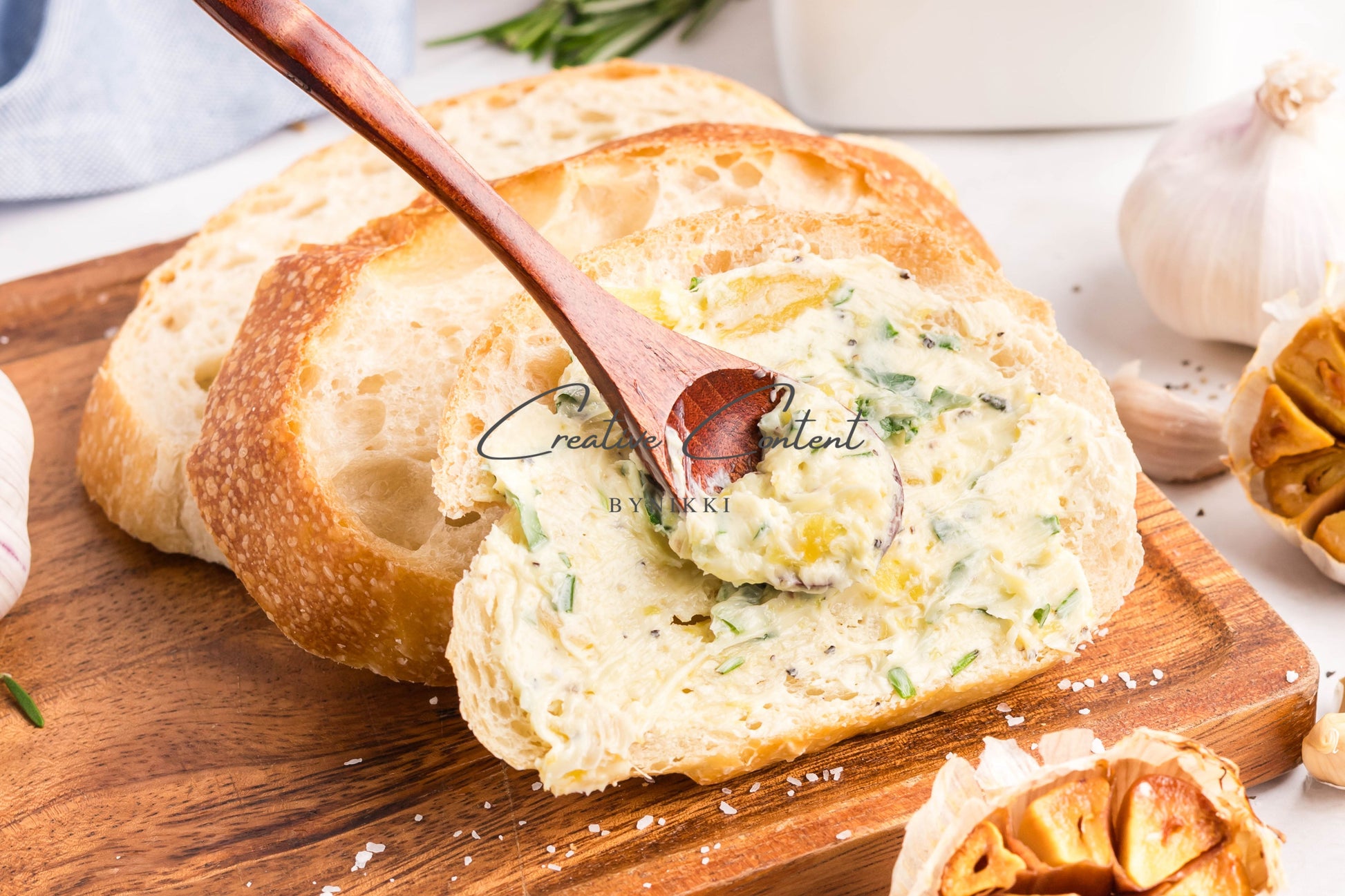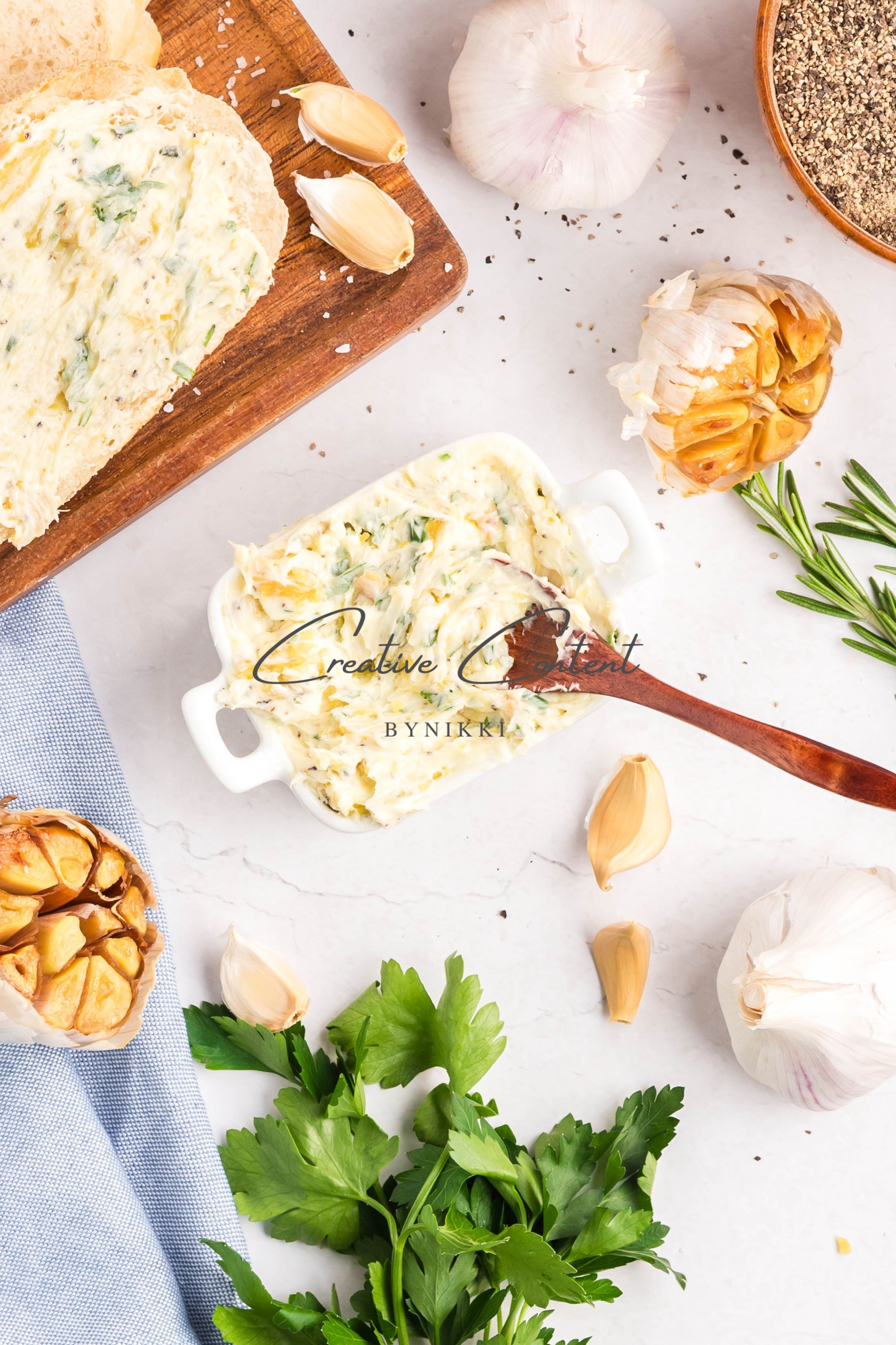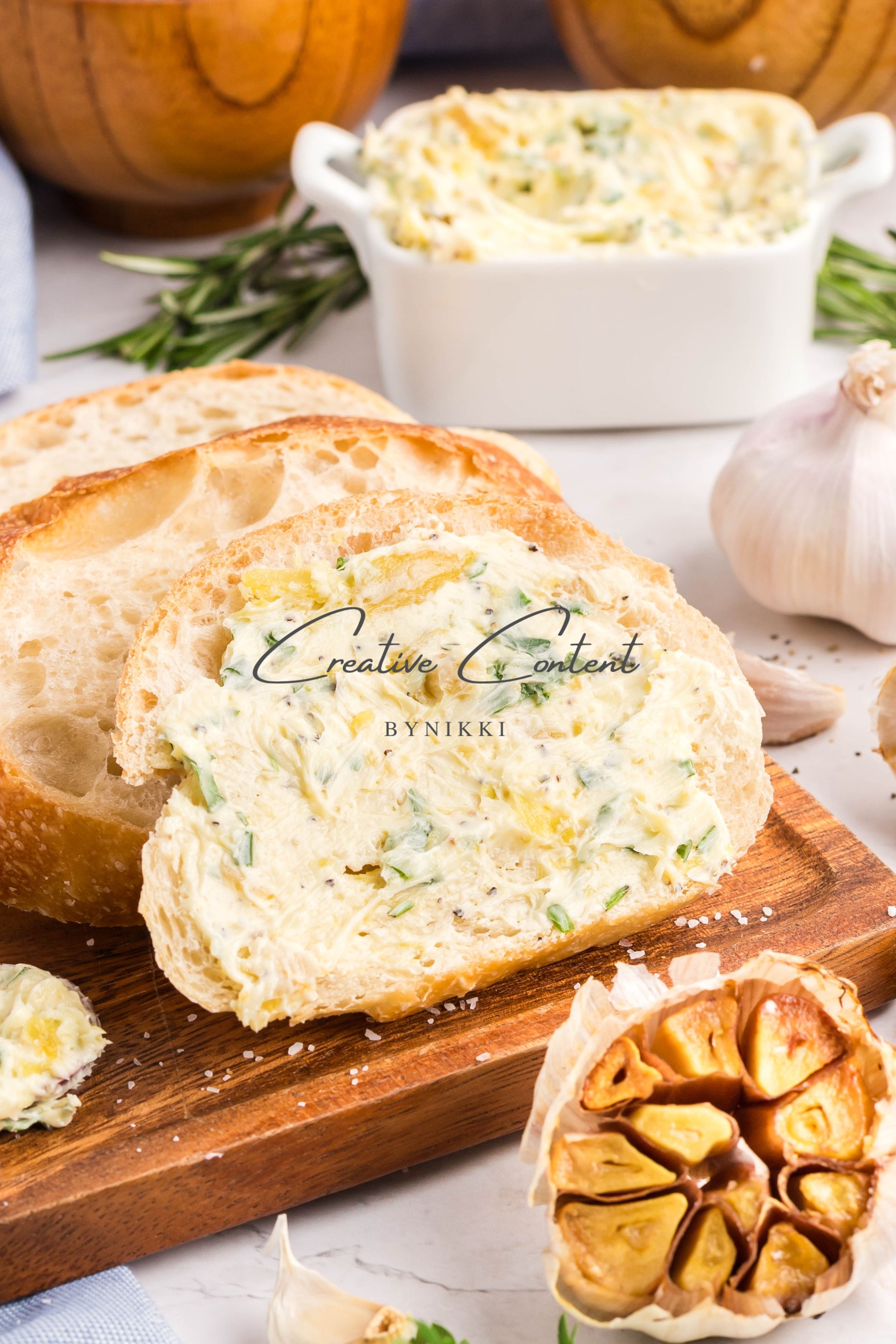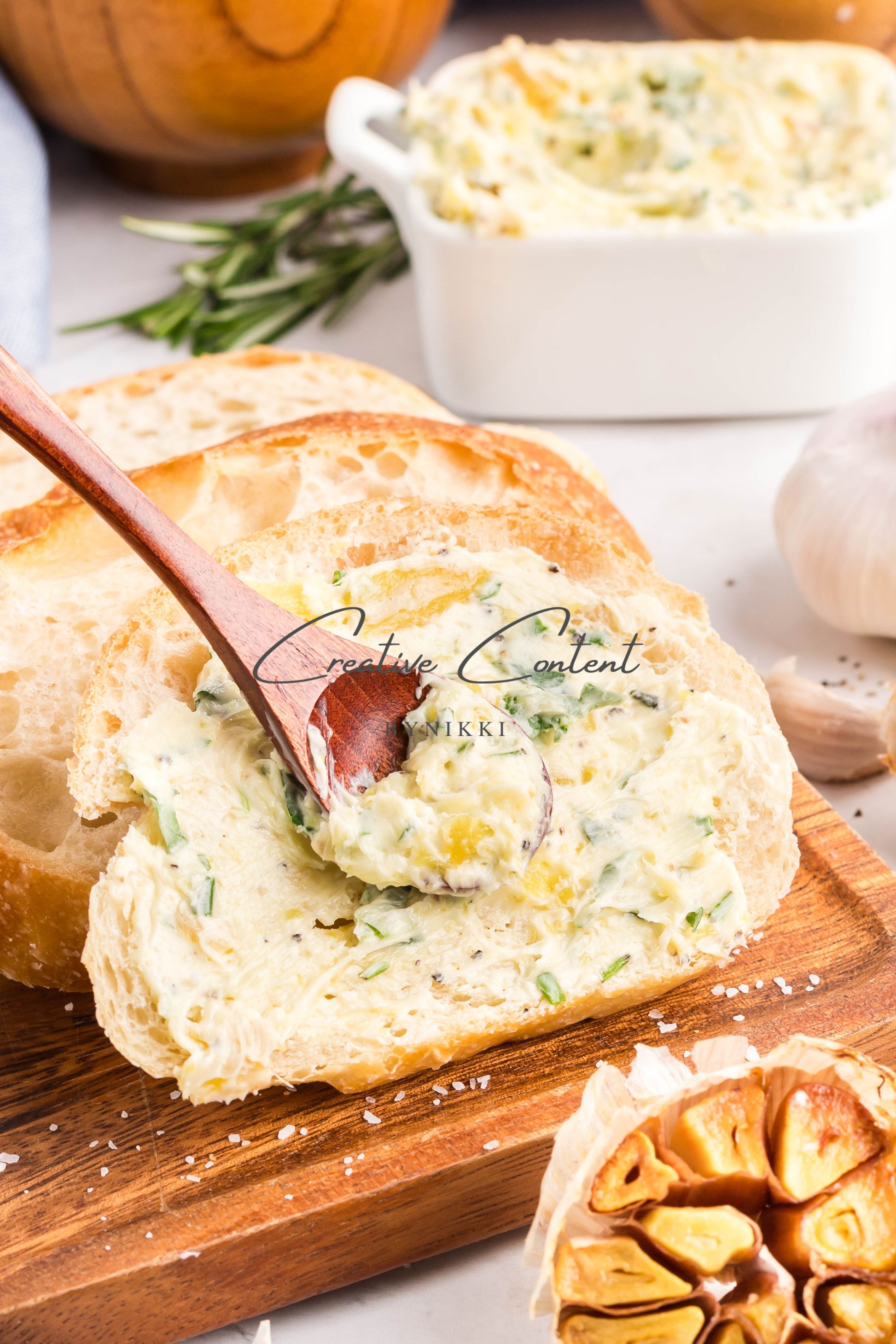 - Ingredients: garlic, avocado oil, kosher salt, butter, rosemary, chives, parsley, black pepper