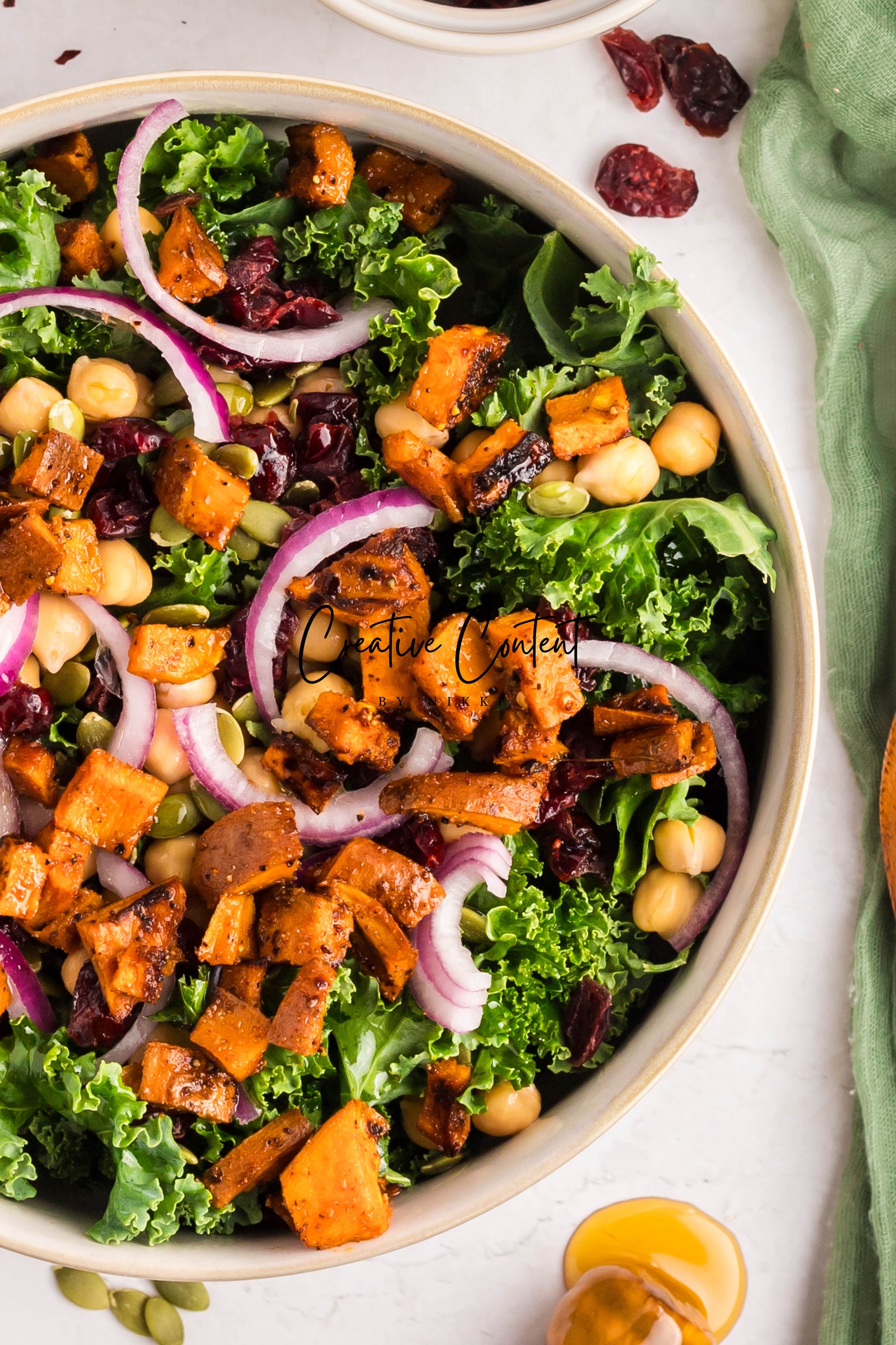 - Featured Ingredients: sweet potatoes, avocado oil, paprika, garlic powder, red pepper flakes, kosher salt, black pepper, baby kale, chickpeas, dried cranberries, red onion, pumpkin seeds, honey, rose vinegar, and Dijon mustard
