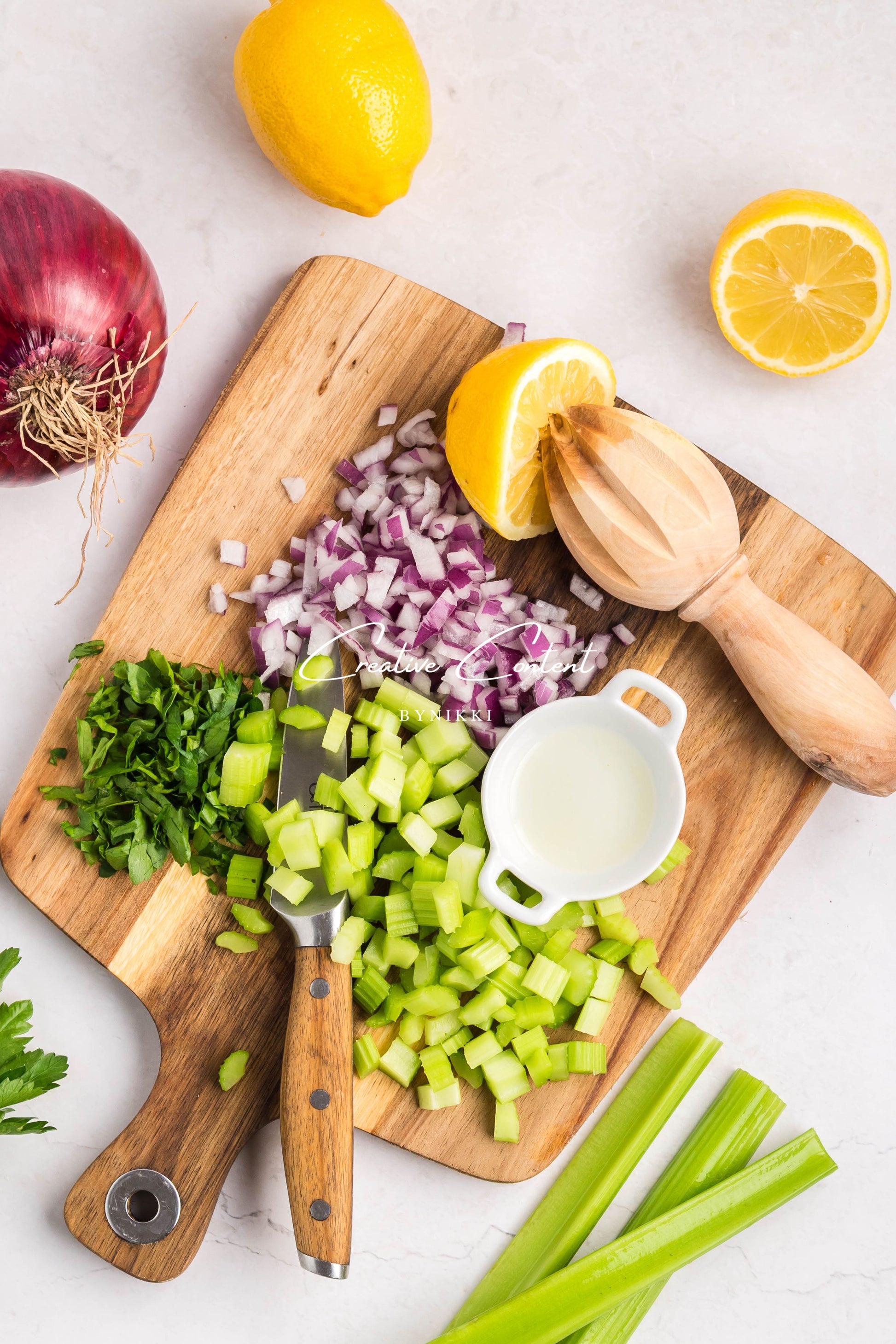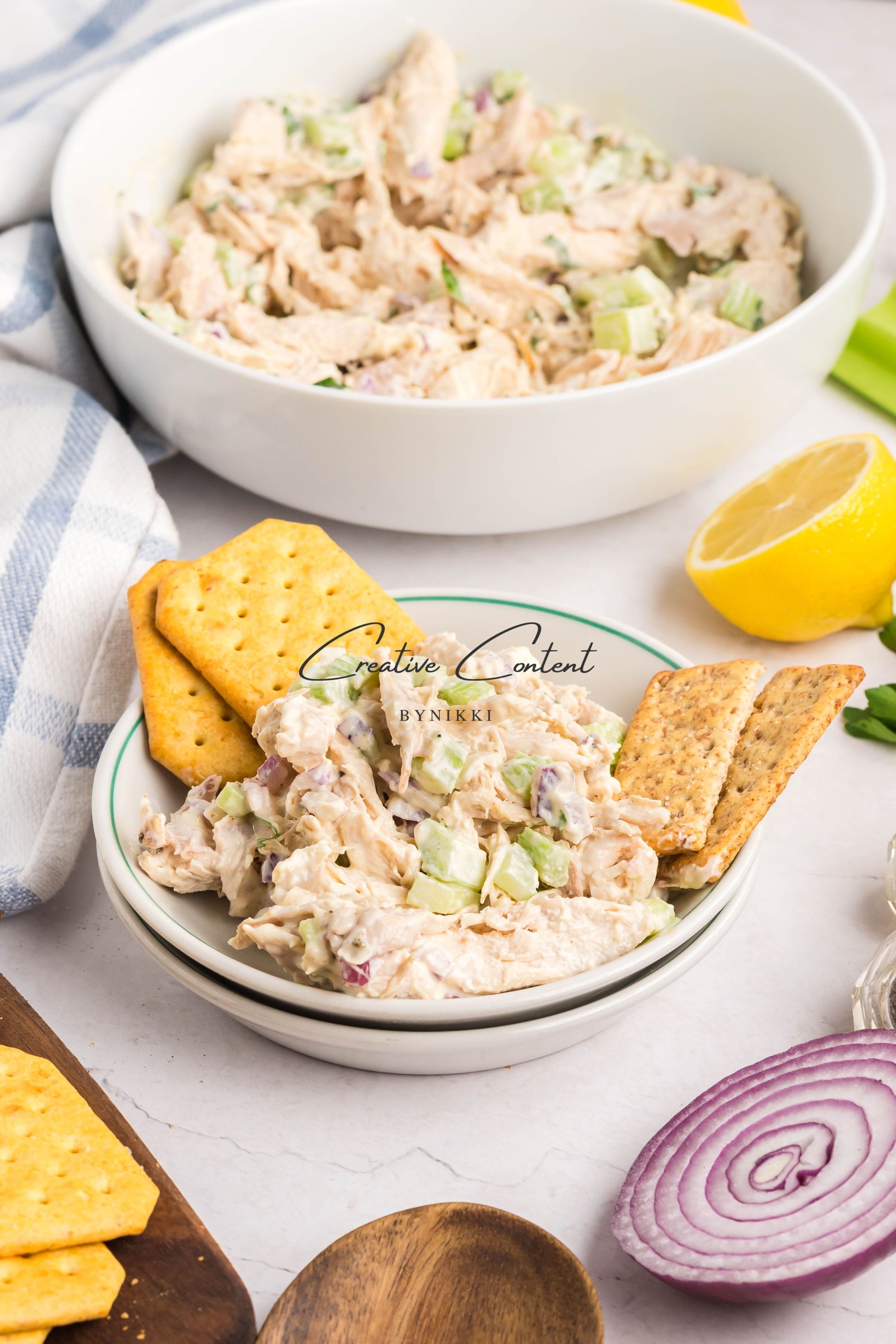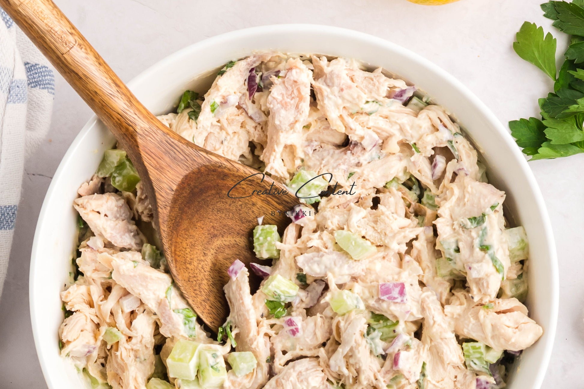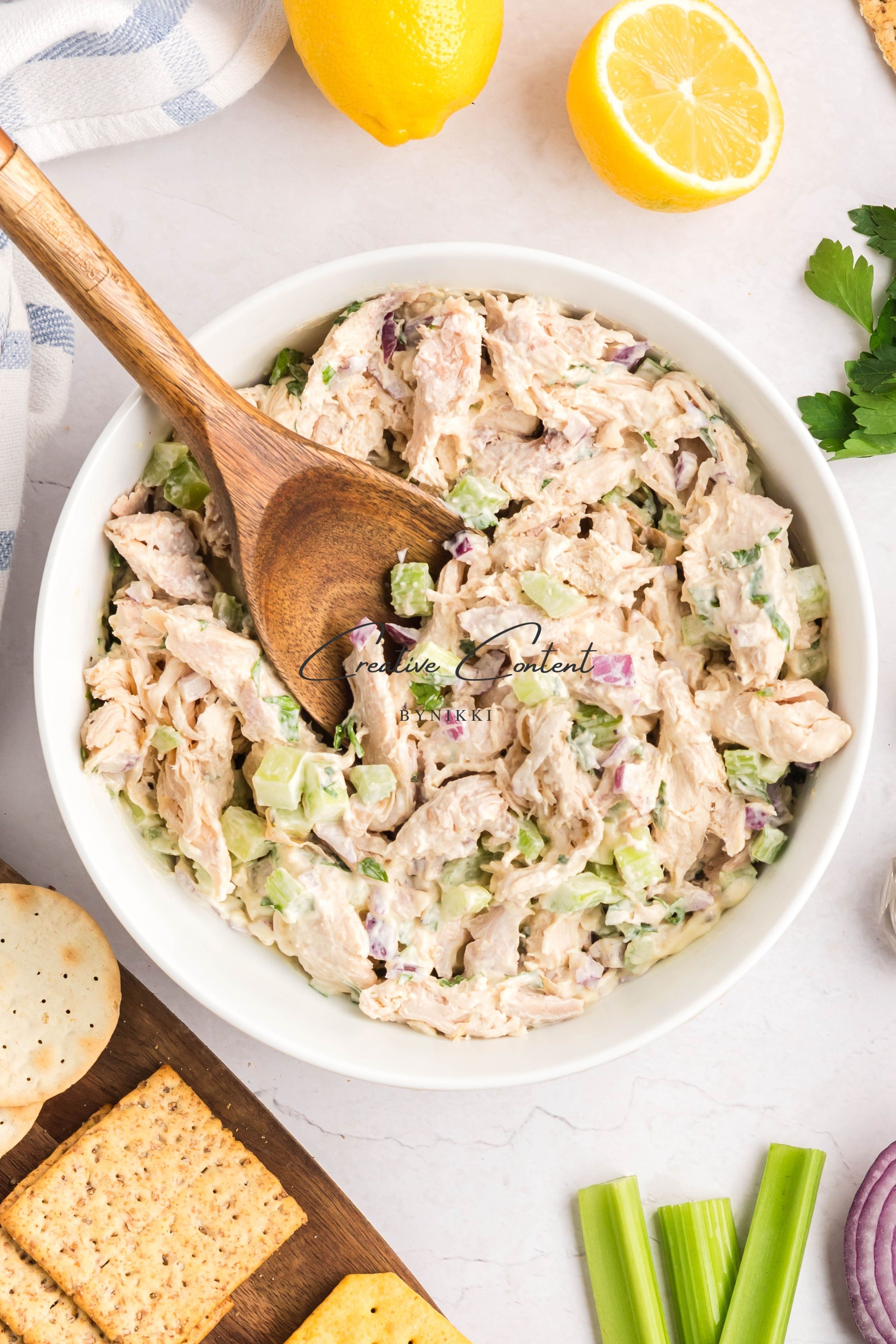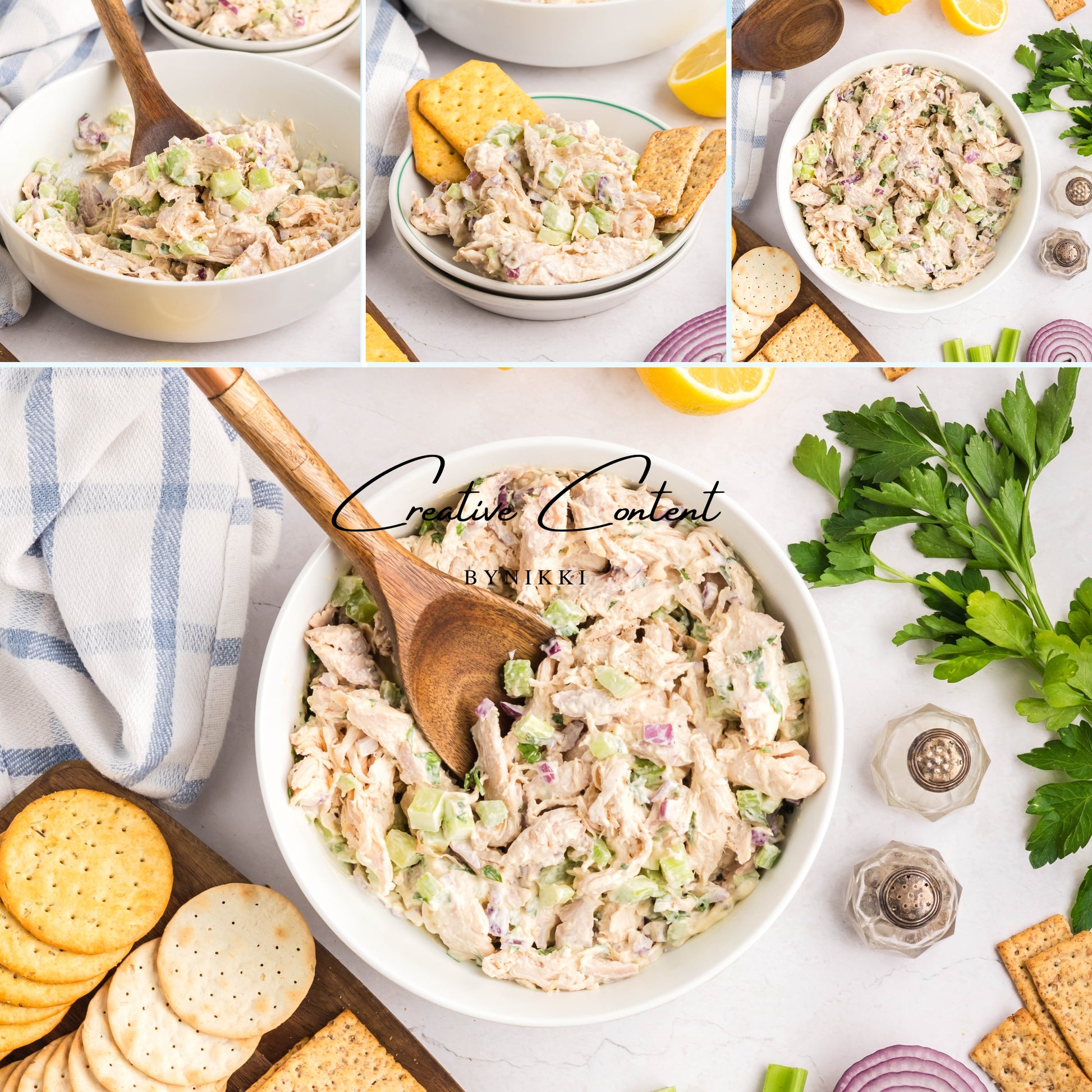 - Ingredients: rotisserie chicken, celery, red onion, mayonnaise, lemon juice, Dijon mustard, coarse kosher salt, black pepper, poultry seasoning, onion powder, garlic powder, and parsley