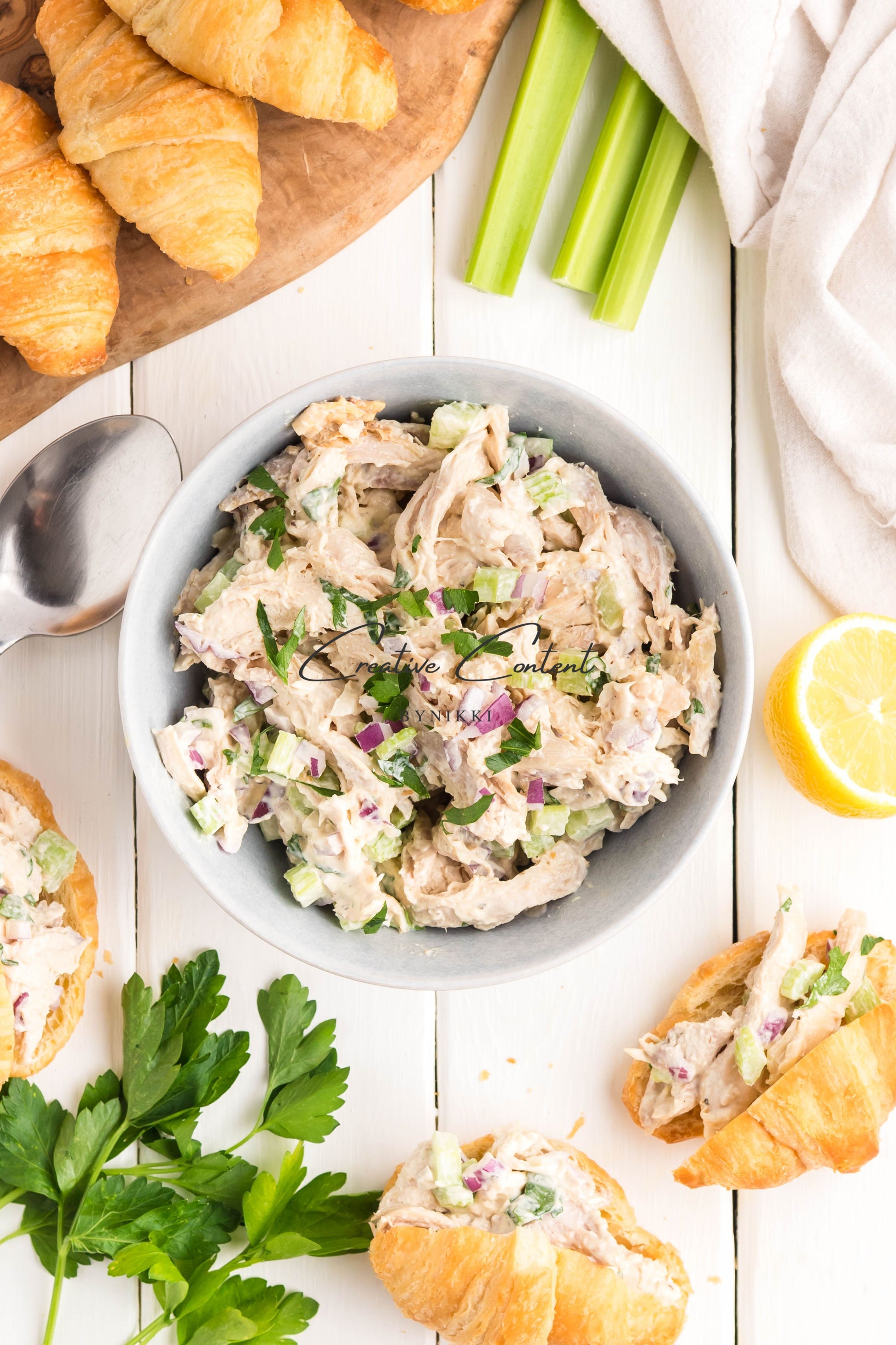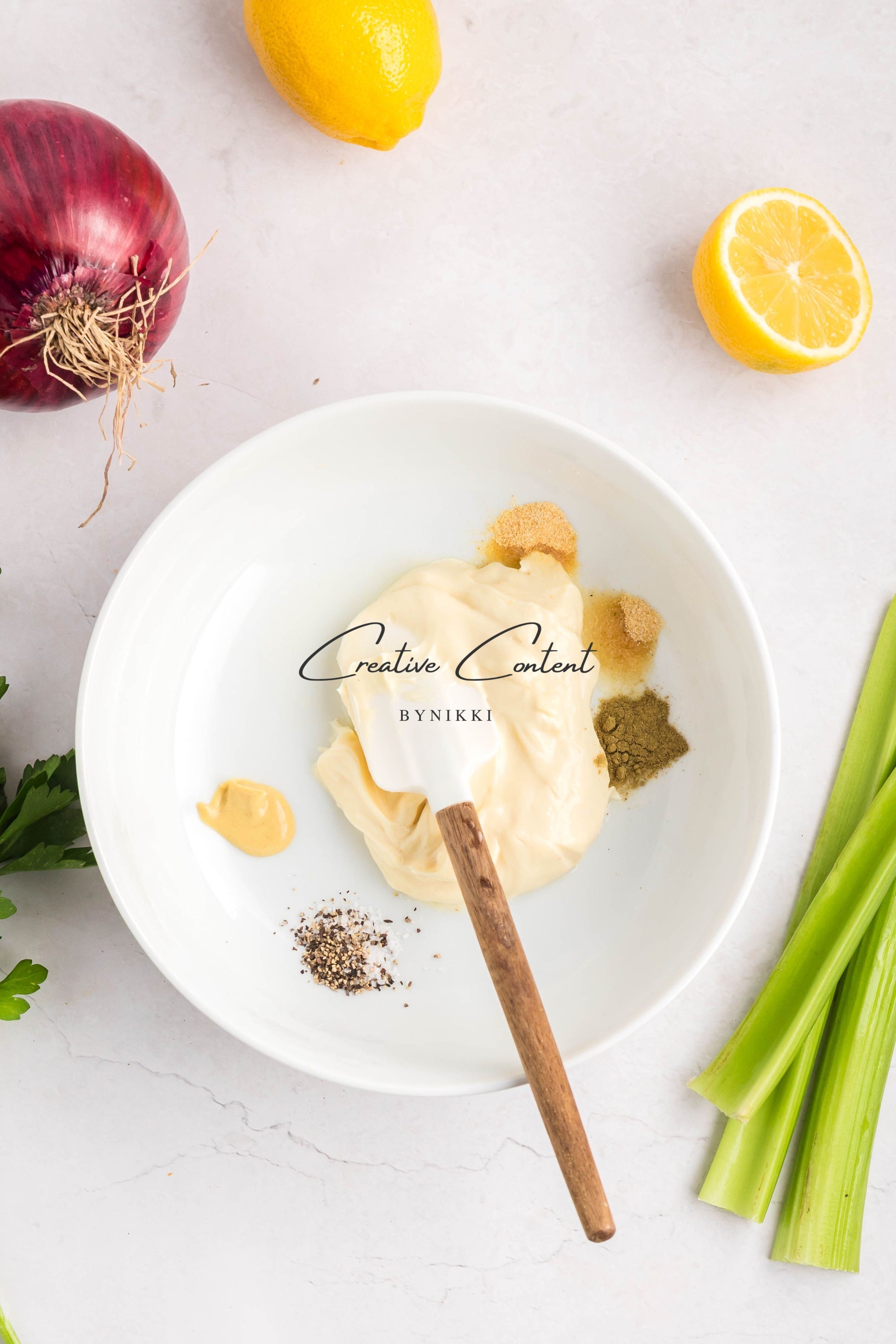 - Ingredients: rotisserie chicken, celery, red onion, mayonnaise, lemon juice, Dijon mustard, coarse kosher salt, black pepper, poultry seasoning, onion powder, garlic powder, and parsley