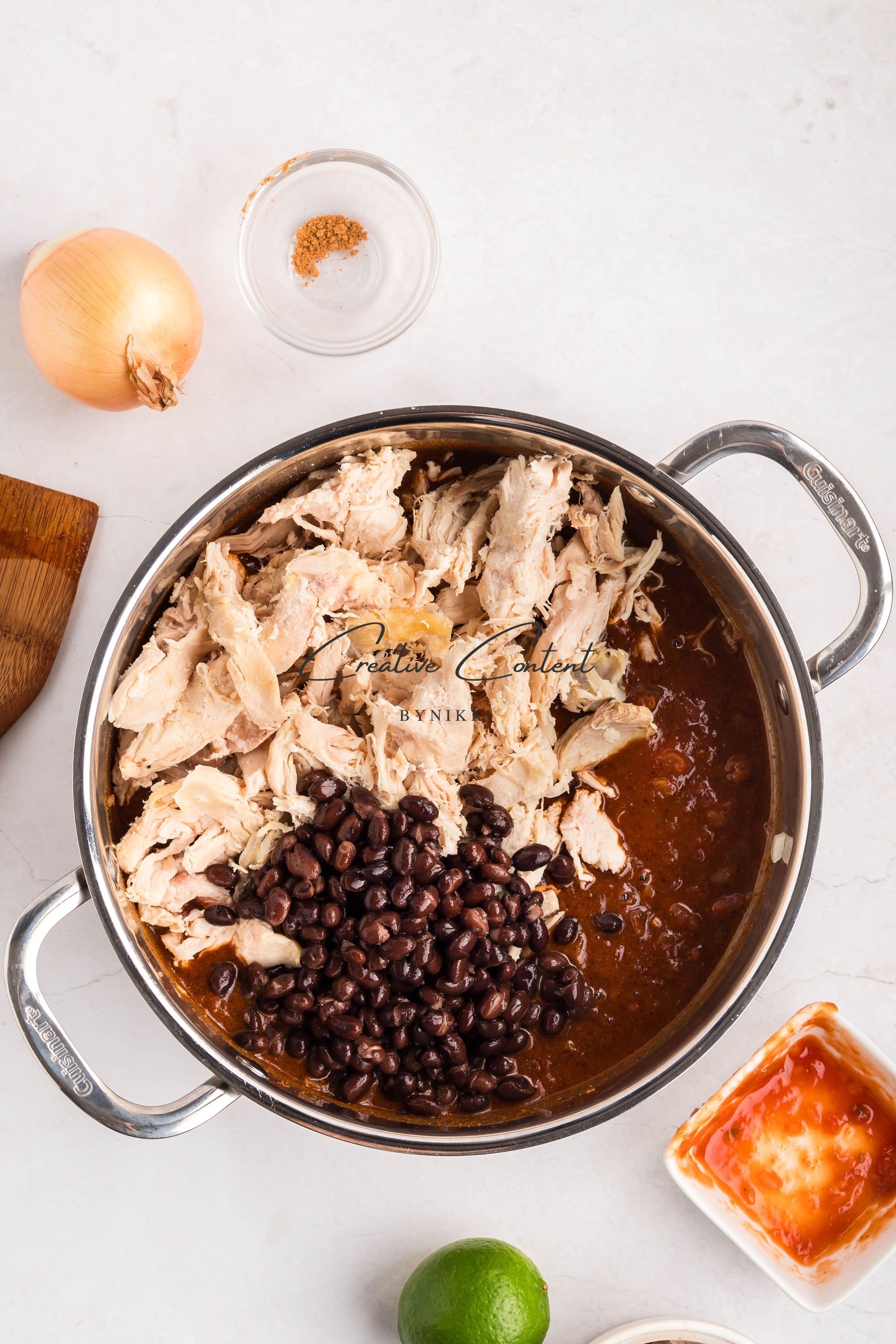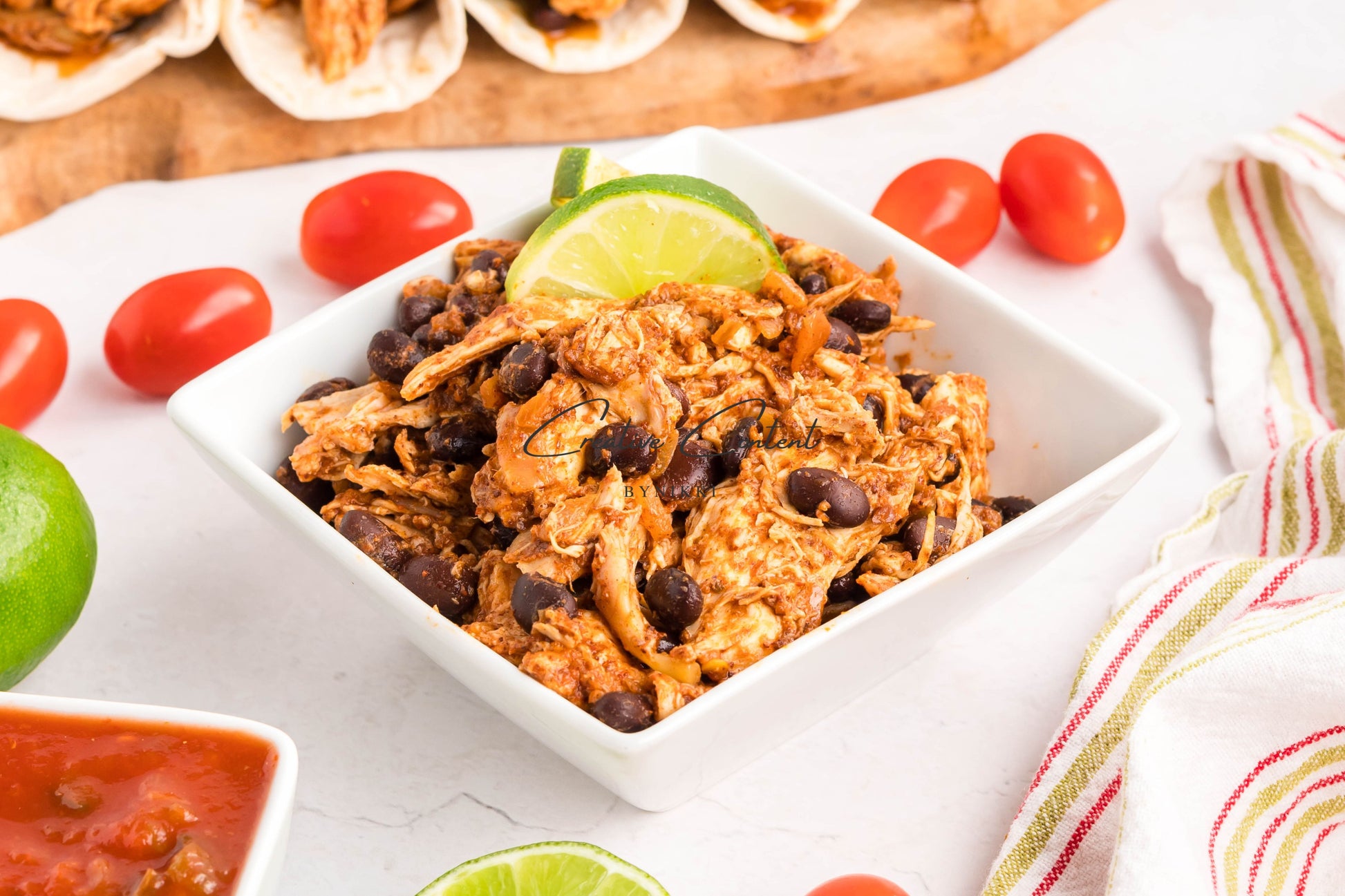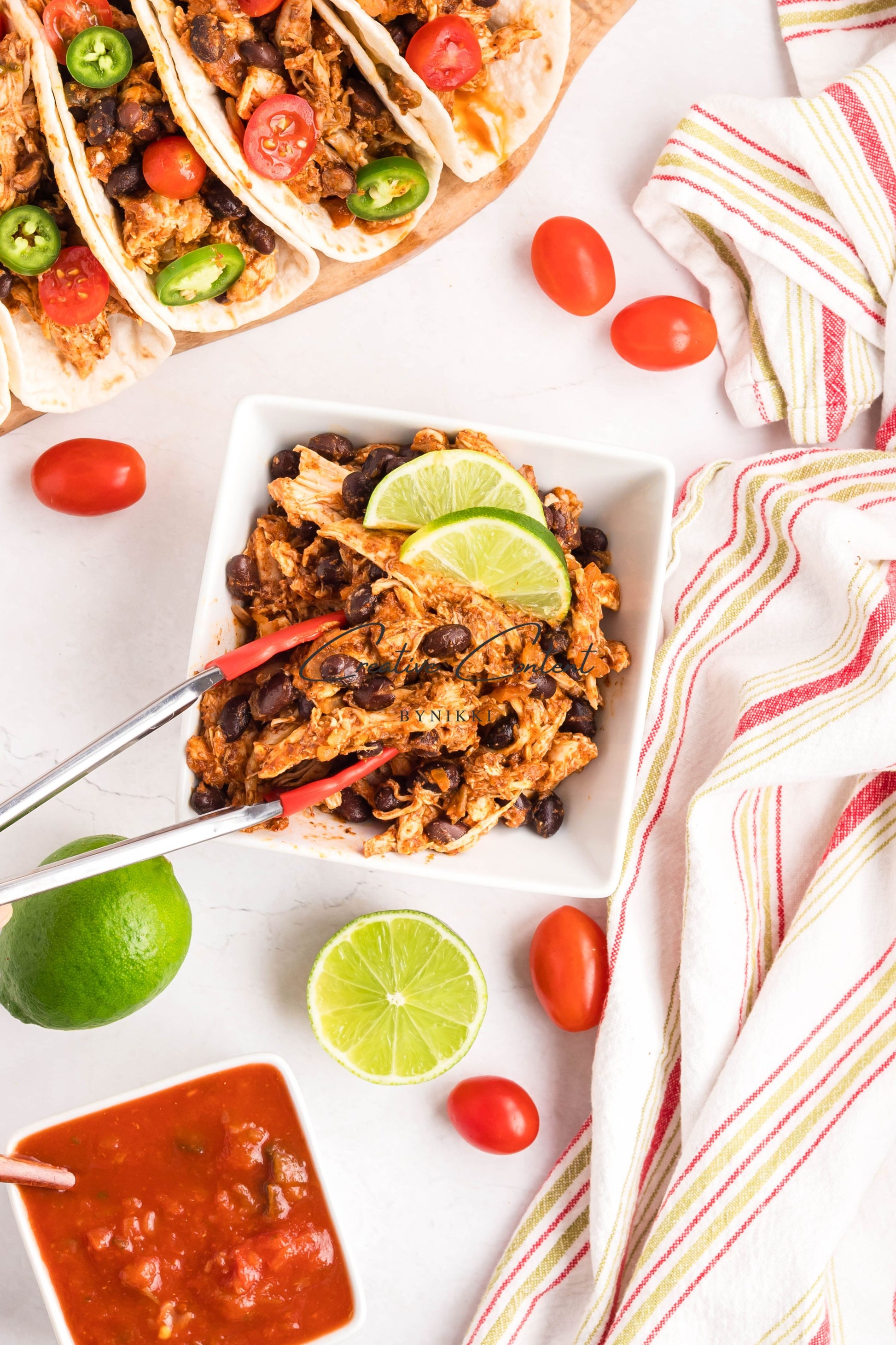 - Ingredients: onion, garlic cloves, chicken broth, salsa, taco seasoning, rotisserie chicken, black beans, lime, taco shells