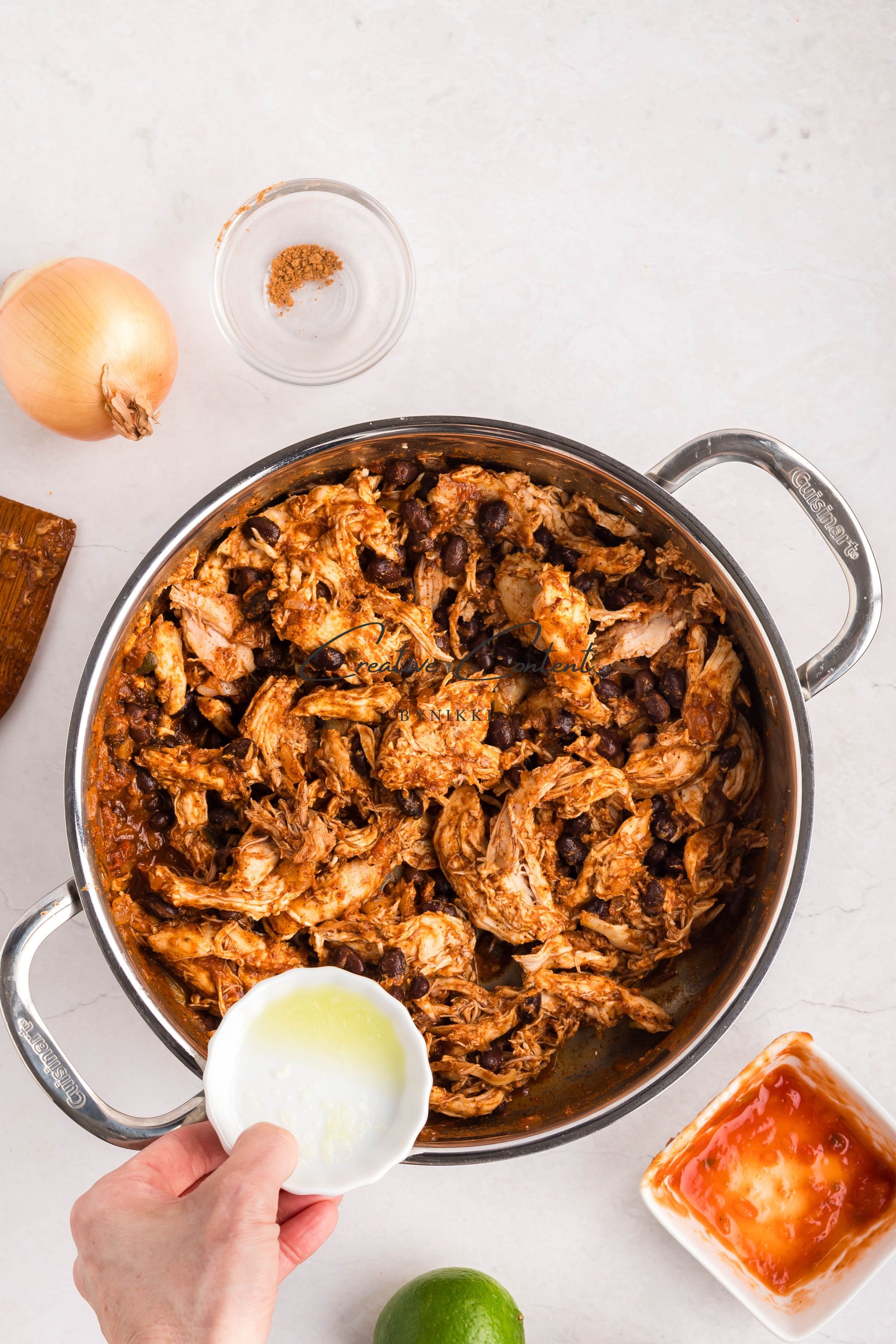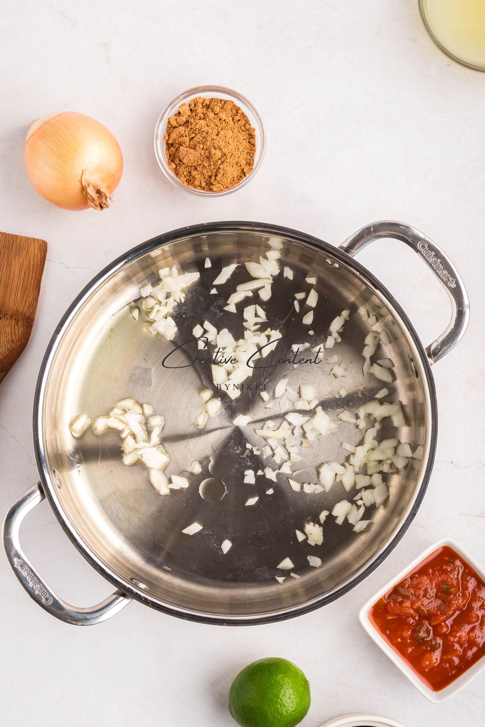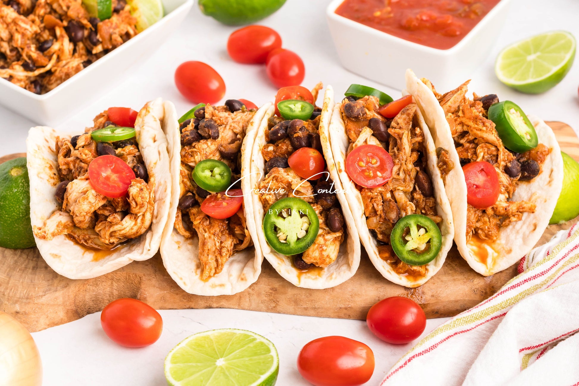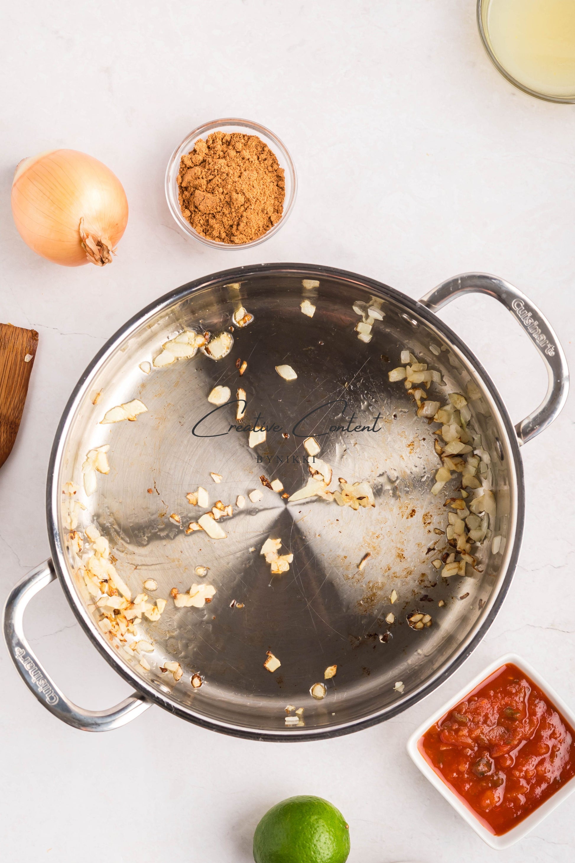 - Ingredients: onion, garlic cloves, chicken broth, salsa, taco seasoning, rotisserie chicken, black beans, lime, taco shells