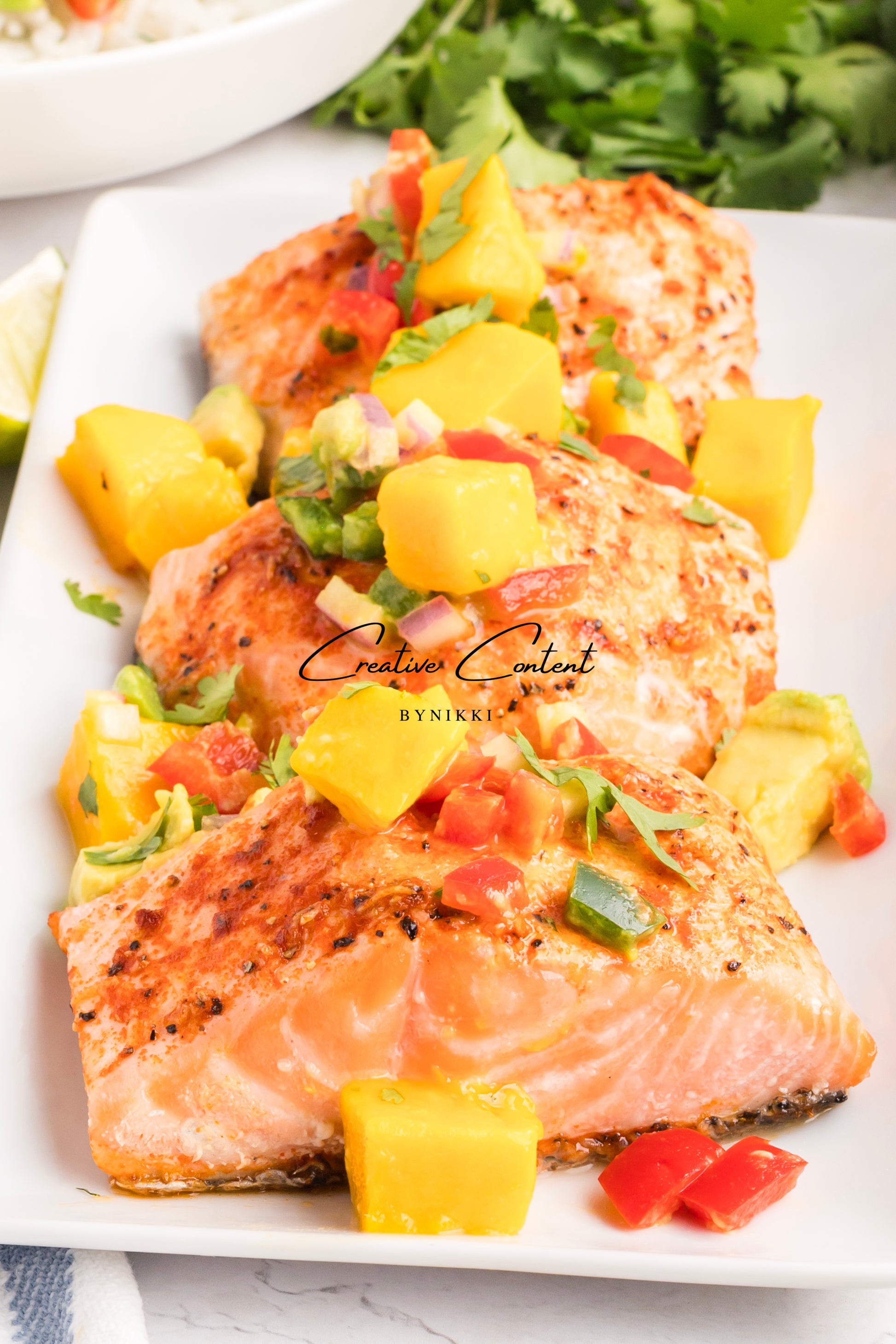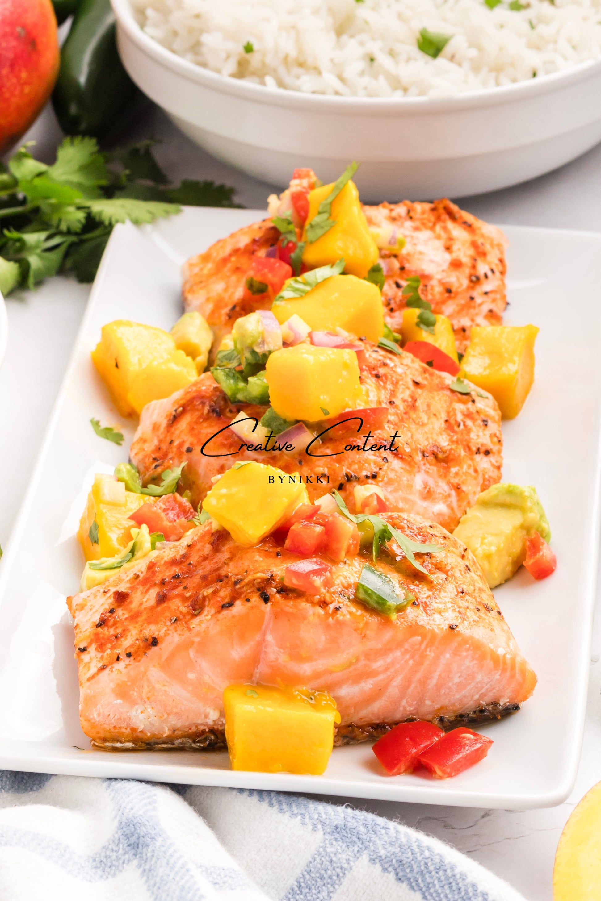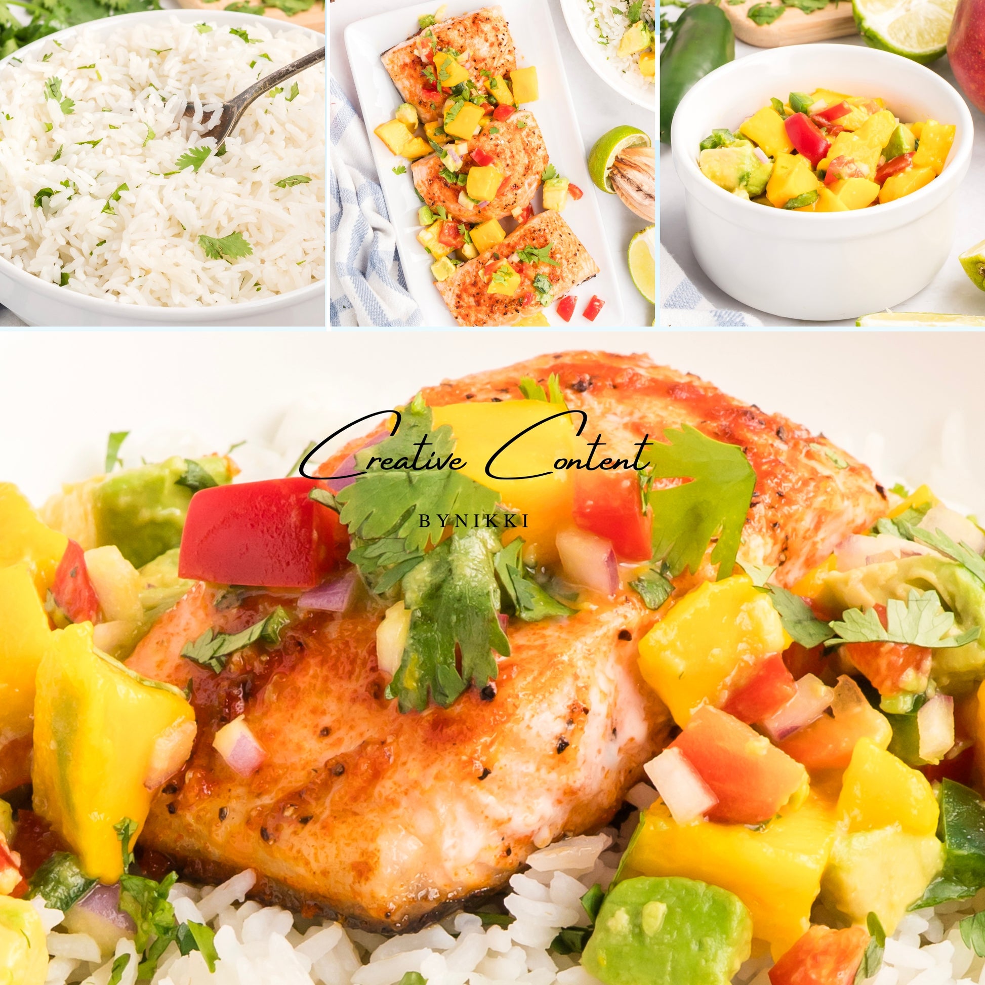 33 hero shots -includes photos of the salmon with mango on top with the rice, mango separately, and rice separately.Â