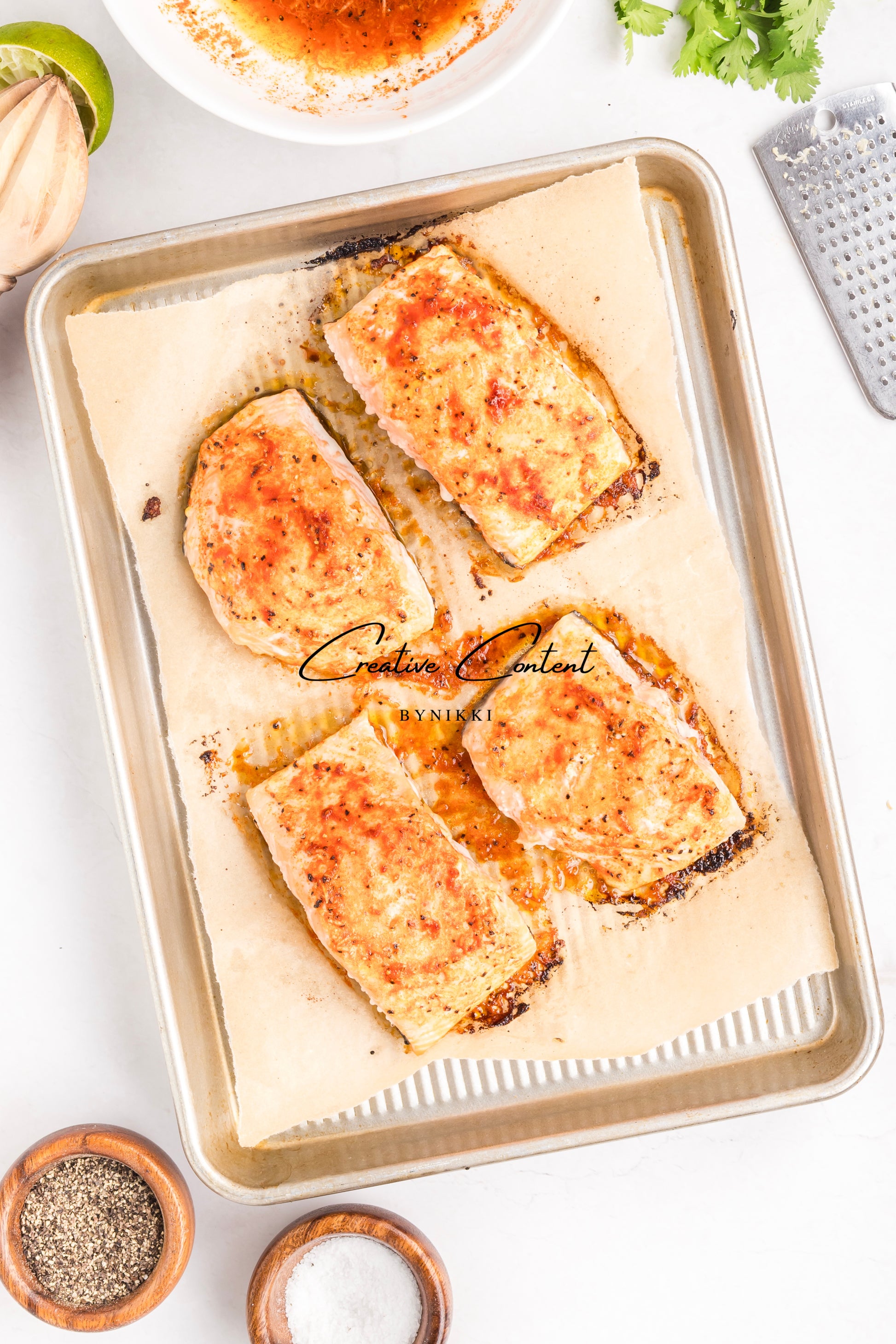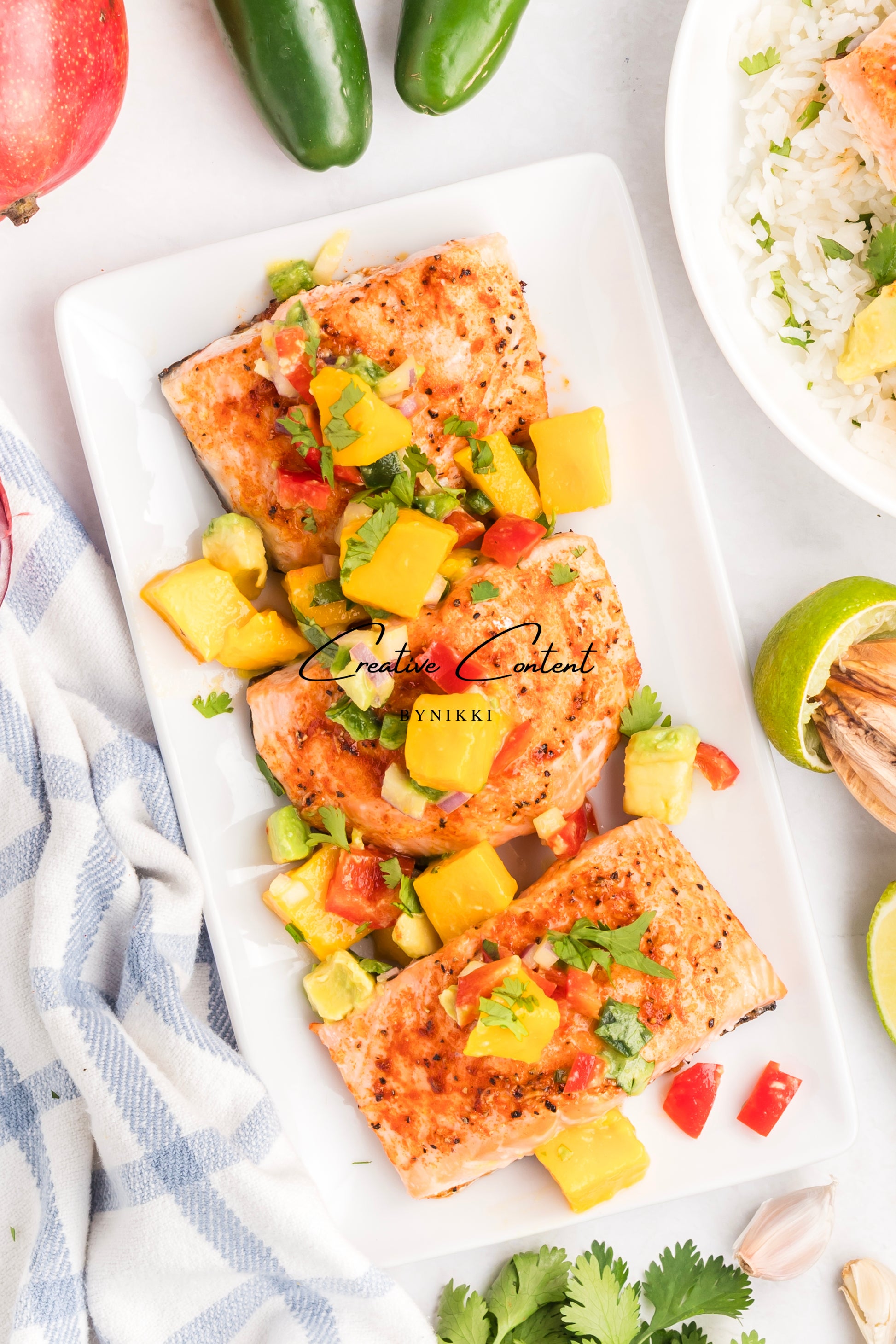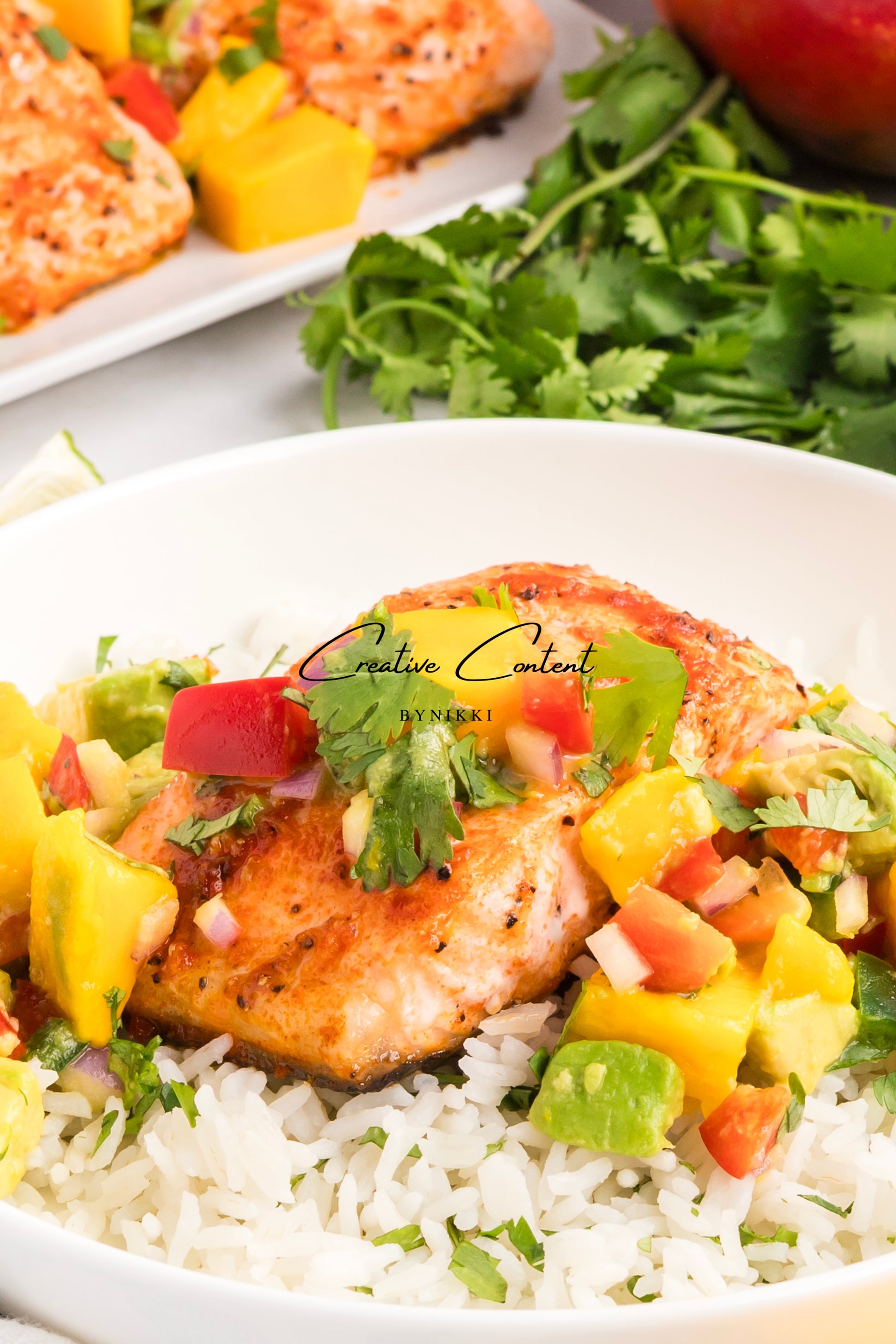 33 hero shots -includes photos of the salmon with mango on top with the rice, mango separately, and rice separately.Â