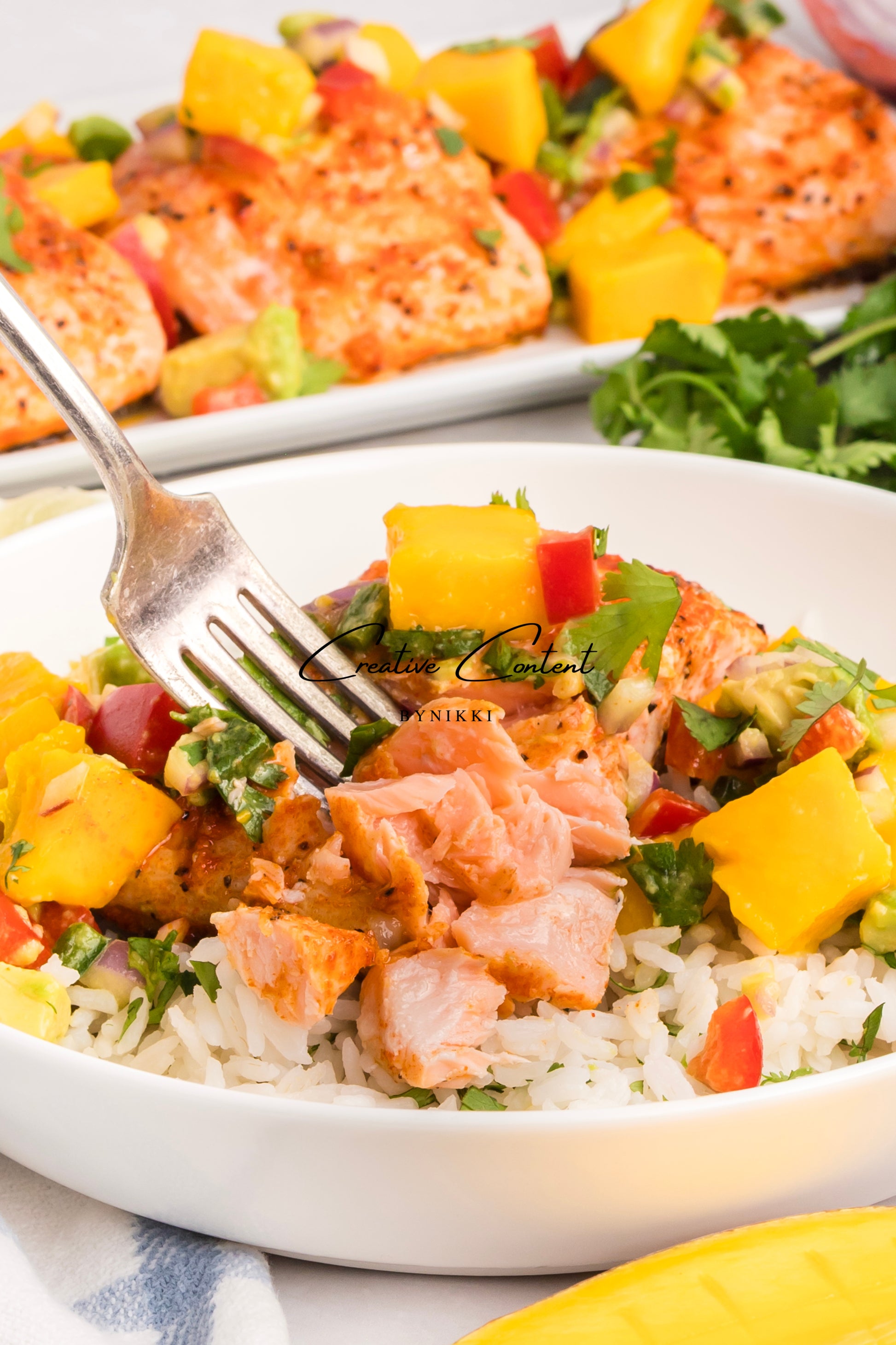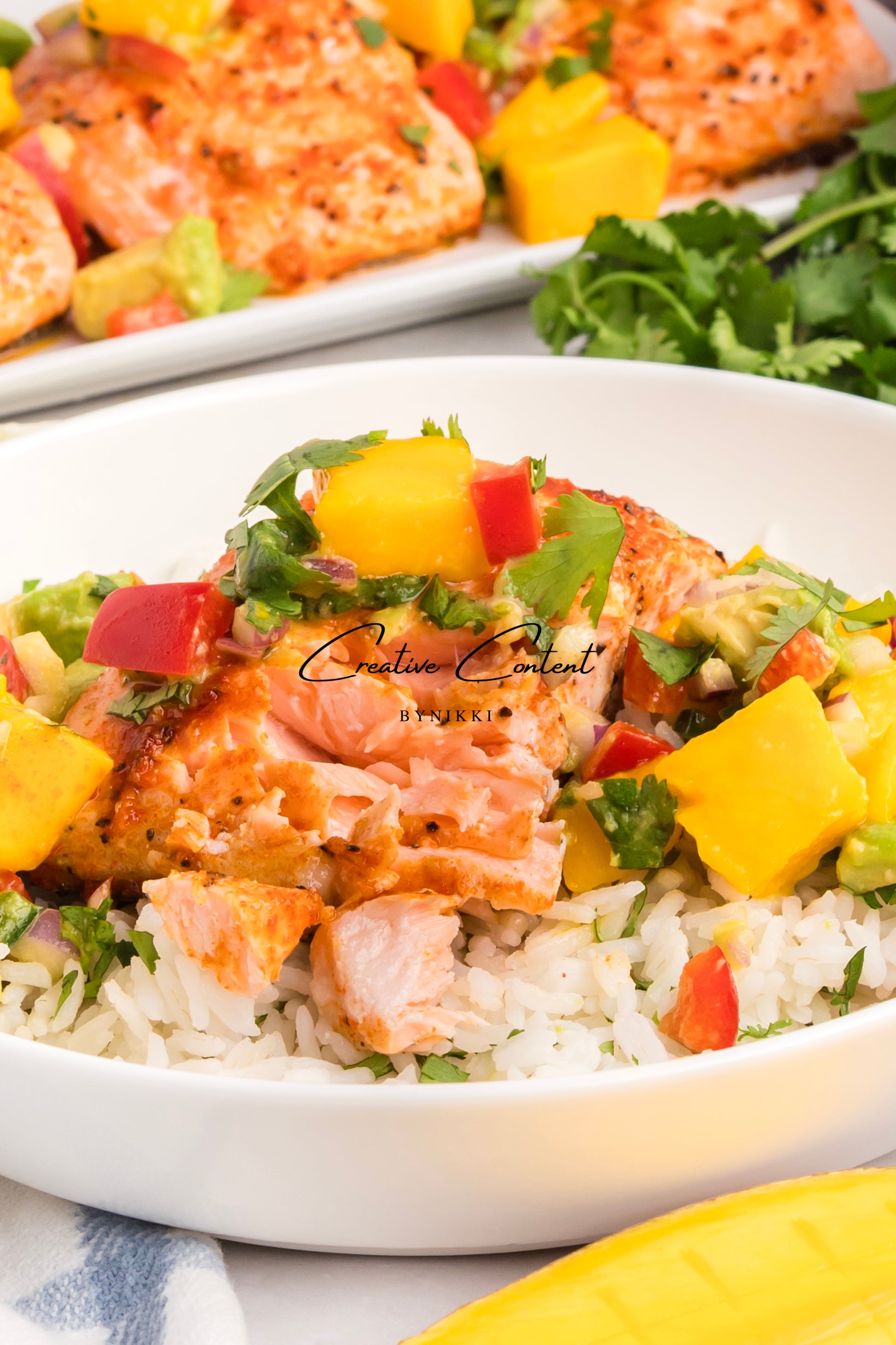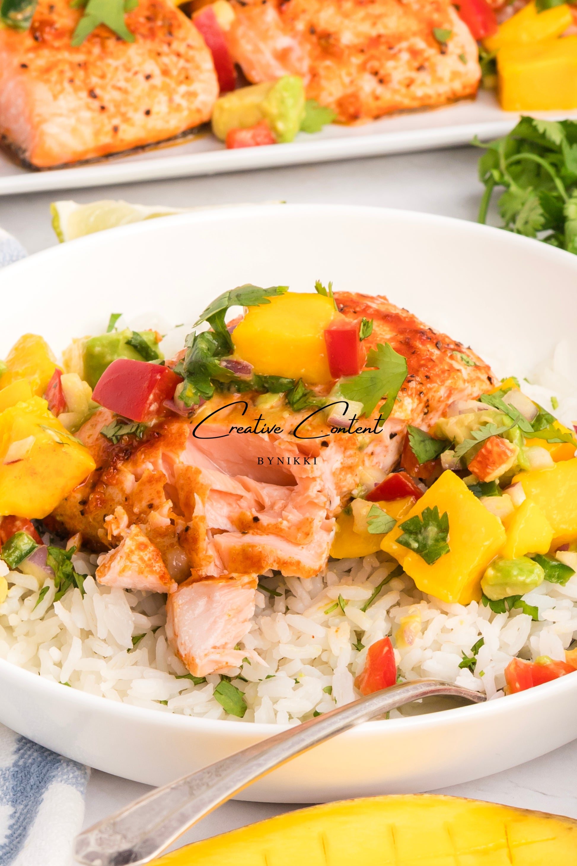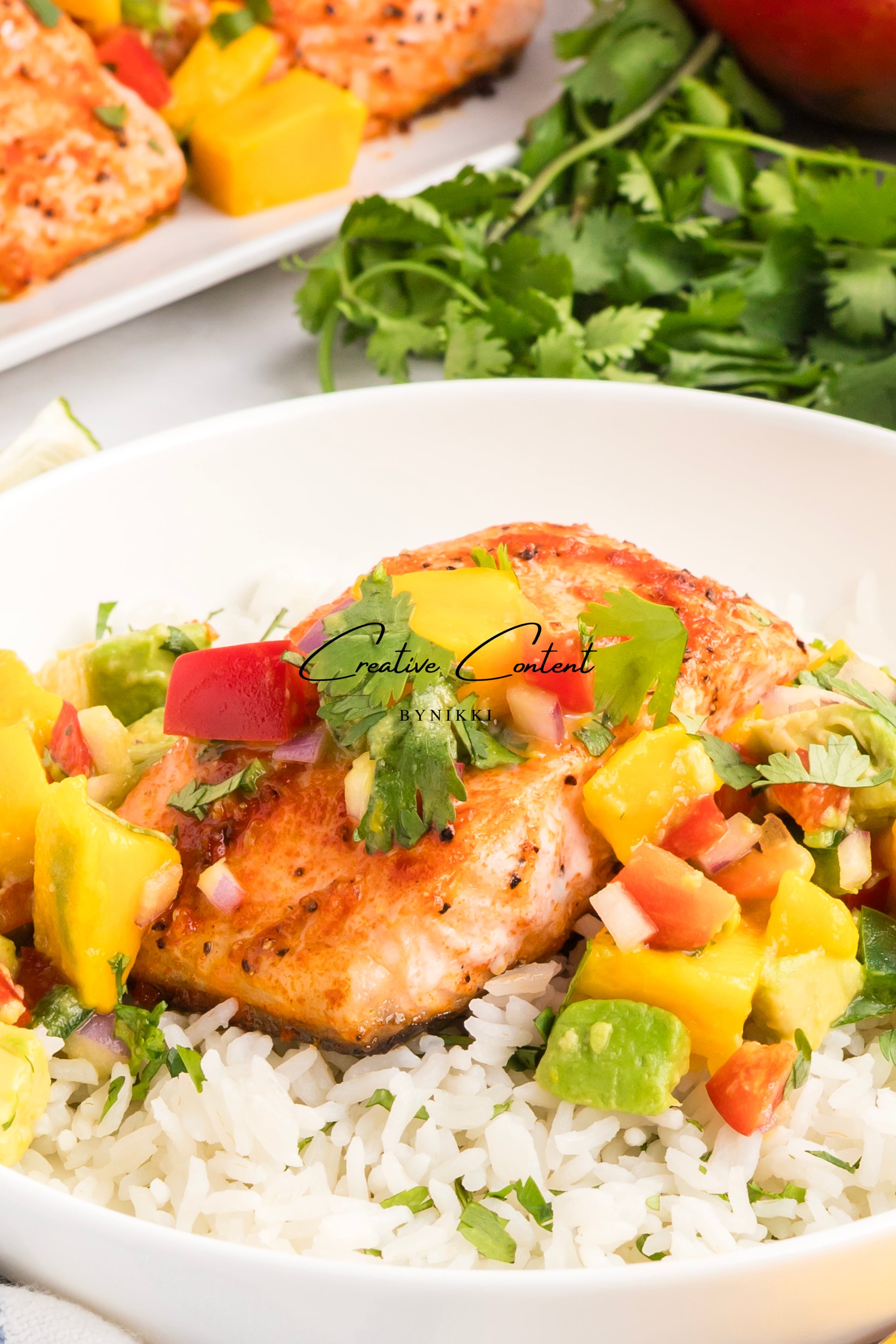 Salmon salsa mango and coconut rice is one of my favorite meals. The mango salsa is fresh and clean, with diced mango, avocado, red bell pepper, and cilantro, and a vinaigrette of fresh lime juice. This is accompanied by coconut rice and baked salmon.