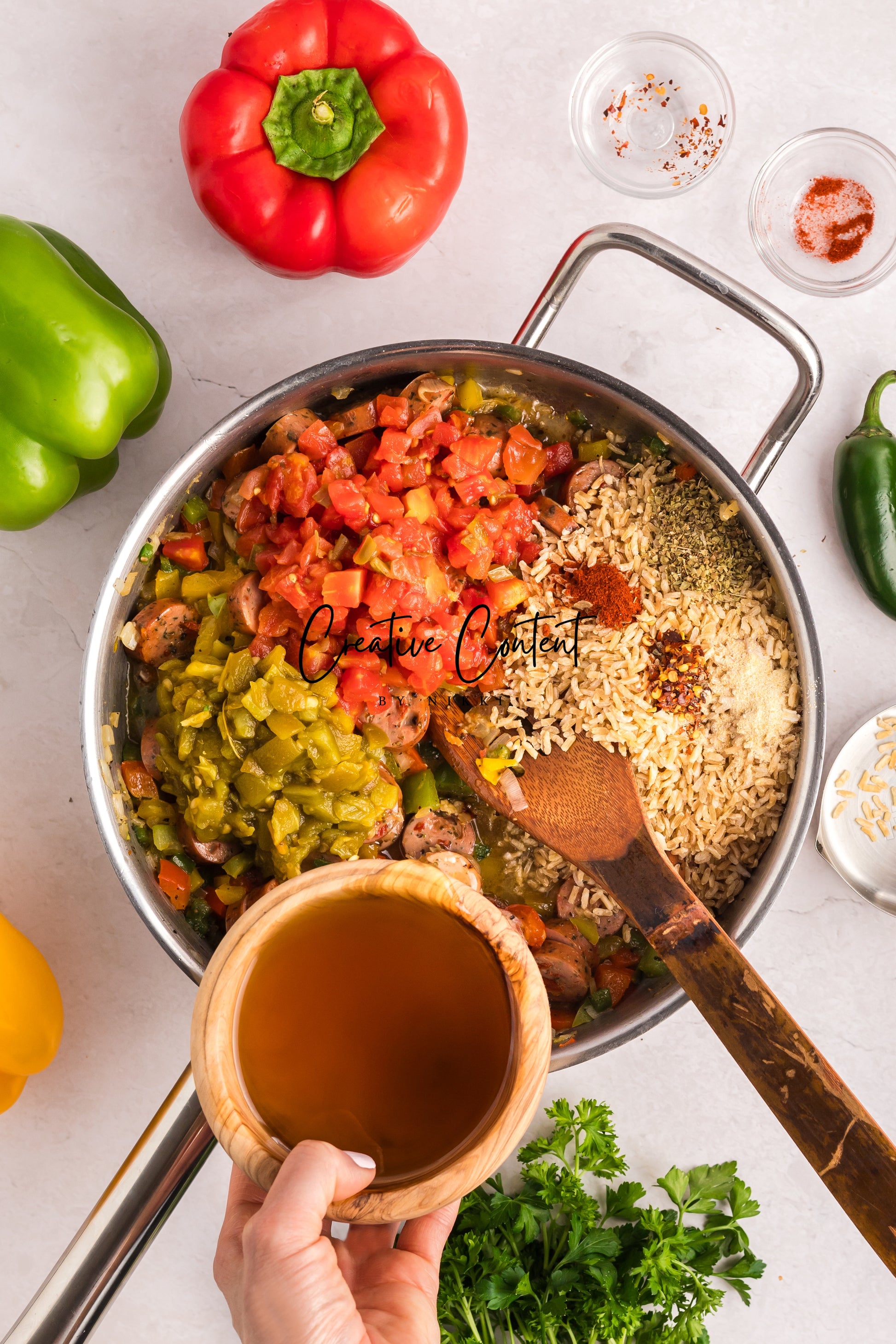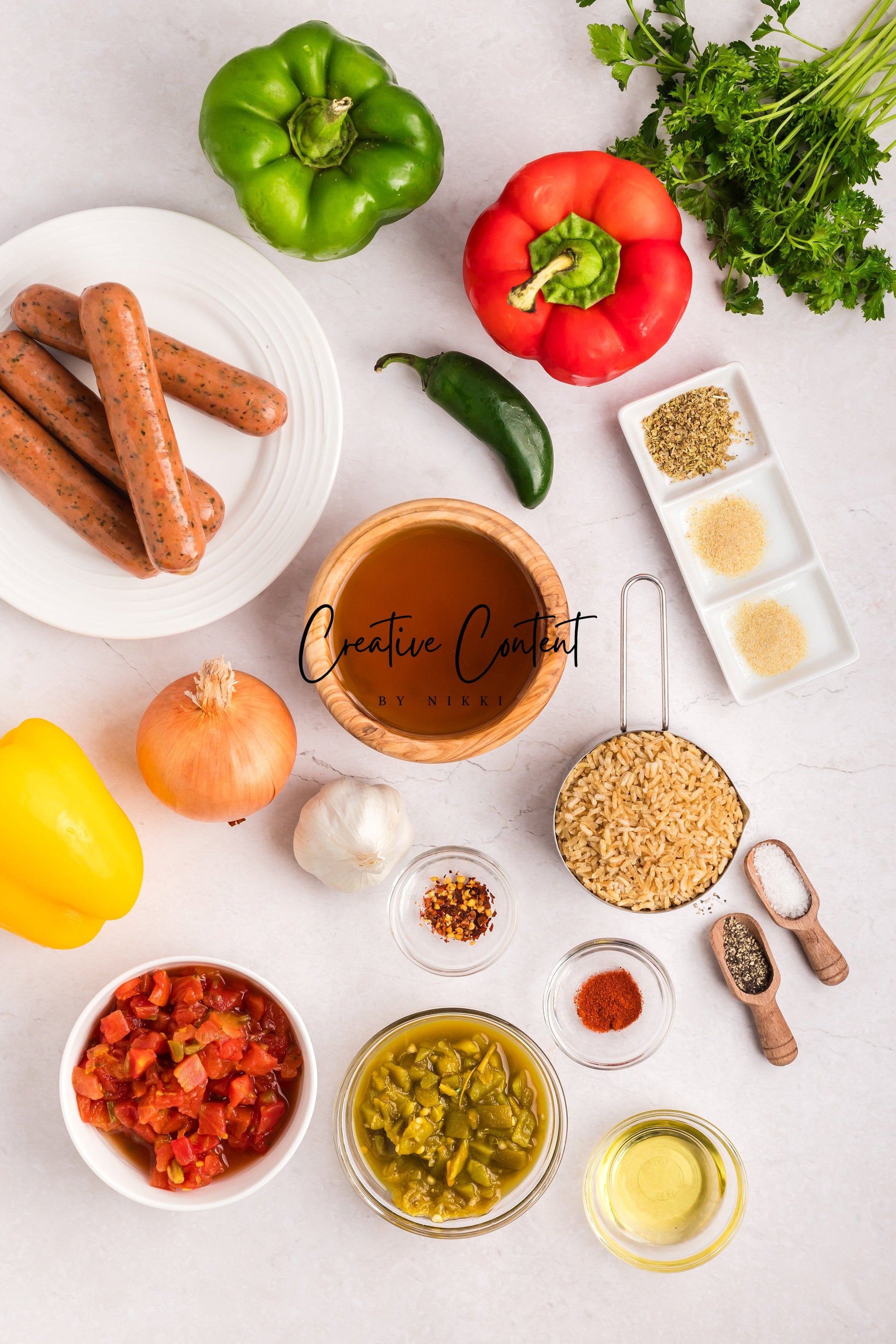 - Featured Ingredients; avocado oil, yellow onion, bell peppers, jalapeno pepper, chicken sausage, garlic cloves, low sodium petite diced tomatoes with green chilies, low sodium chicken broth, instant brown rice, green chiles, seasonings, and parsley.
