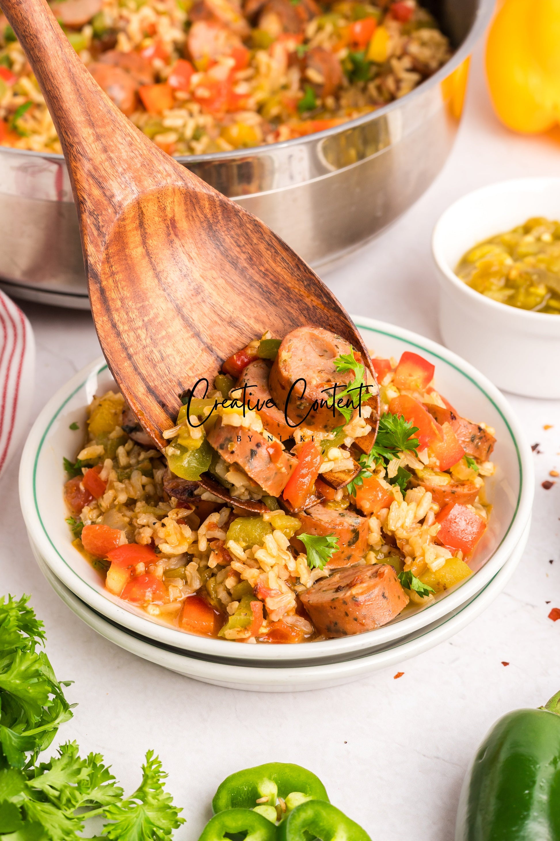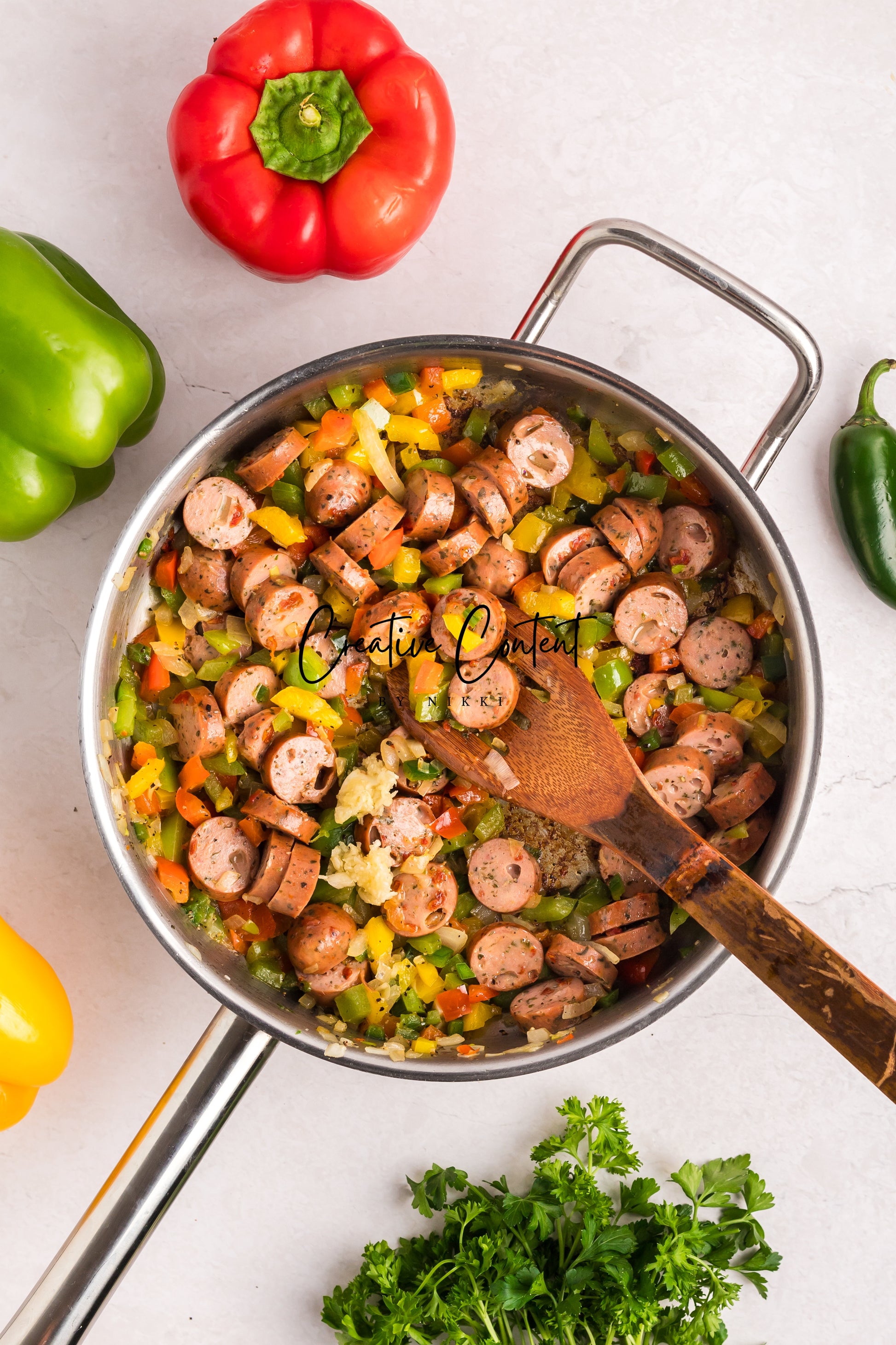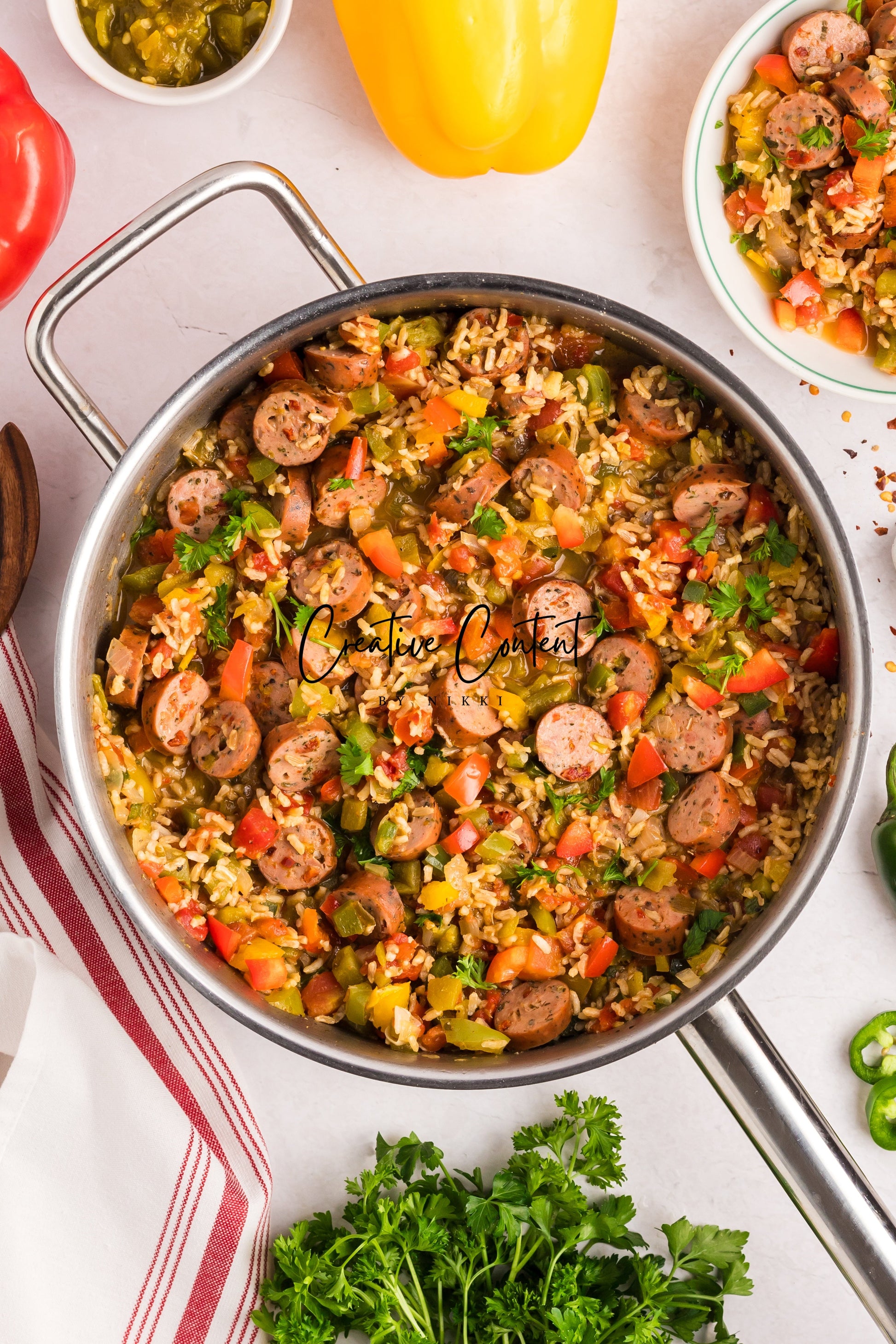 This sausage and rice casserole is full of flavor with bell peppers, seasoned chicken sausage, minced garlic, and fresh parsley. This is a quick dinner in under 25 minutes the whole family will love. This is the perfect dinner when having friends or family over. If you love spice and loads of flavor you will love this casserole.