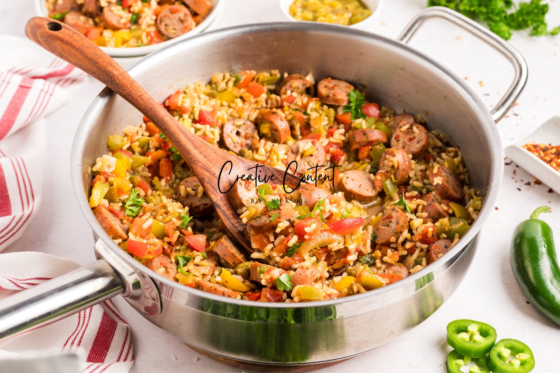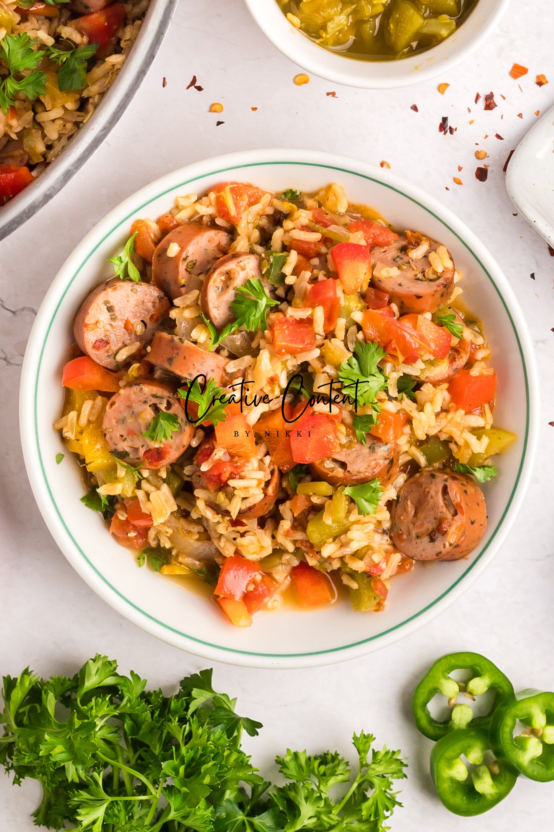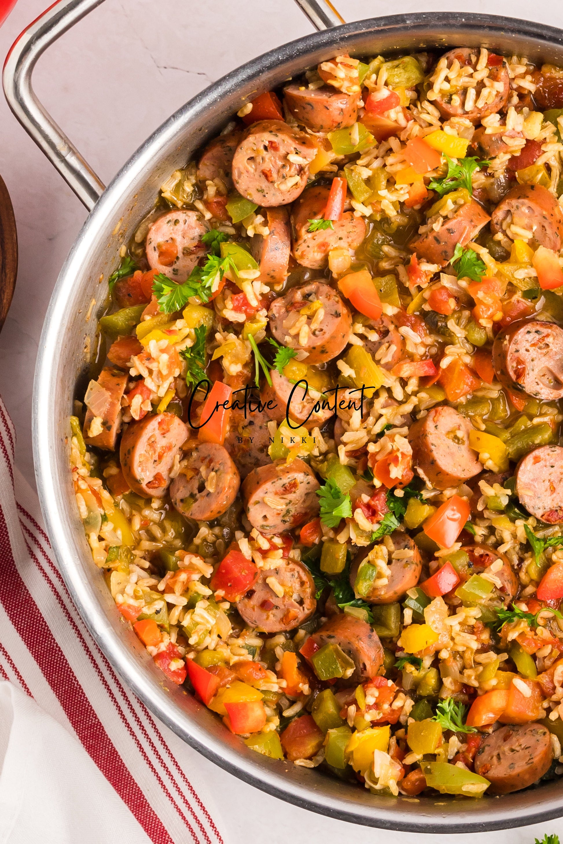 This sausage and rice casserole is full of flavor with bell peppers, seasoned chicken sausage, minced garlic, and fresh parsley. This is a quick dinner in under 25 minutes the whole family will love. This is the perfect dinner when having friends or family over. If you love spice and loads of flavor you will love this casserole.