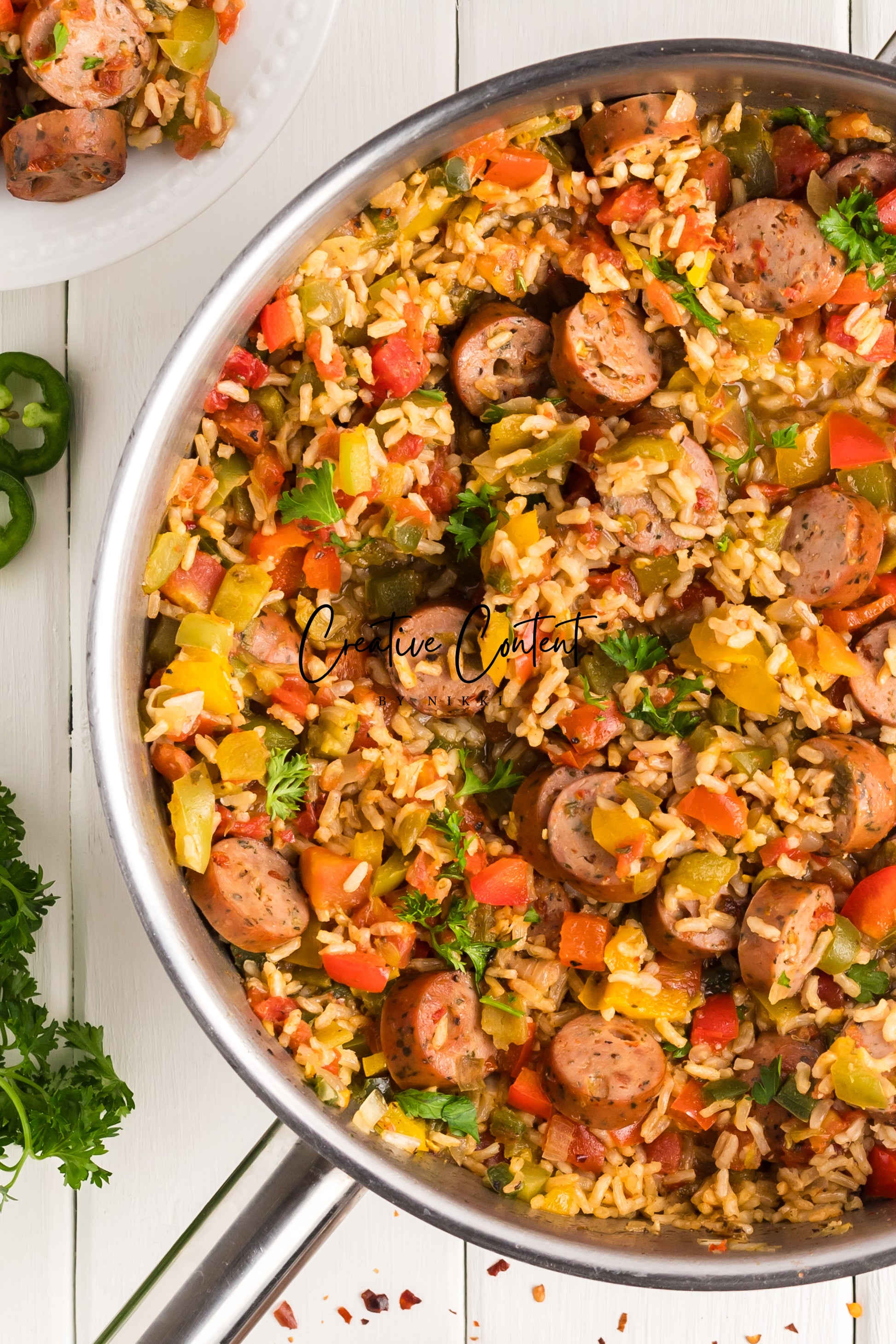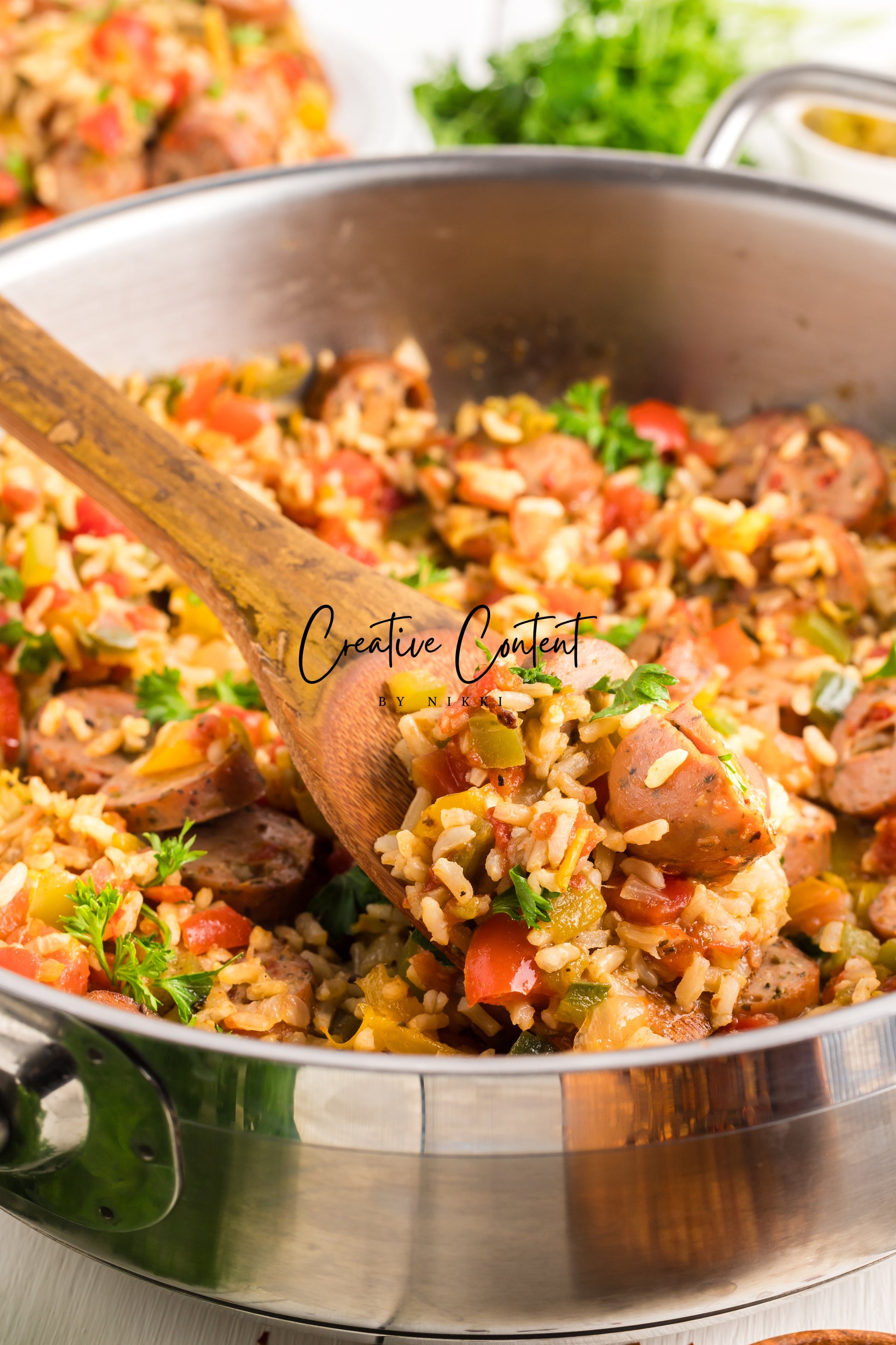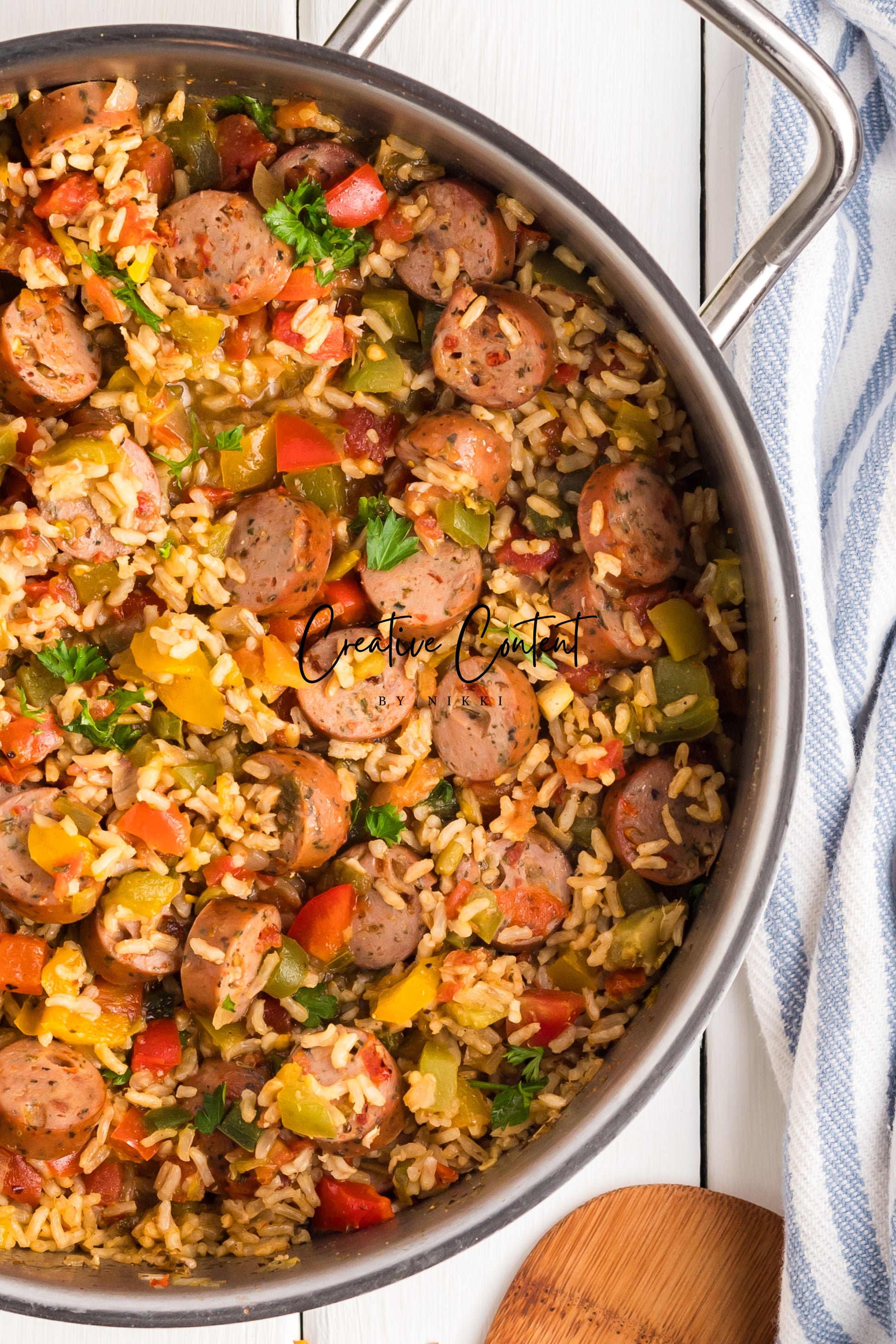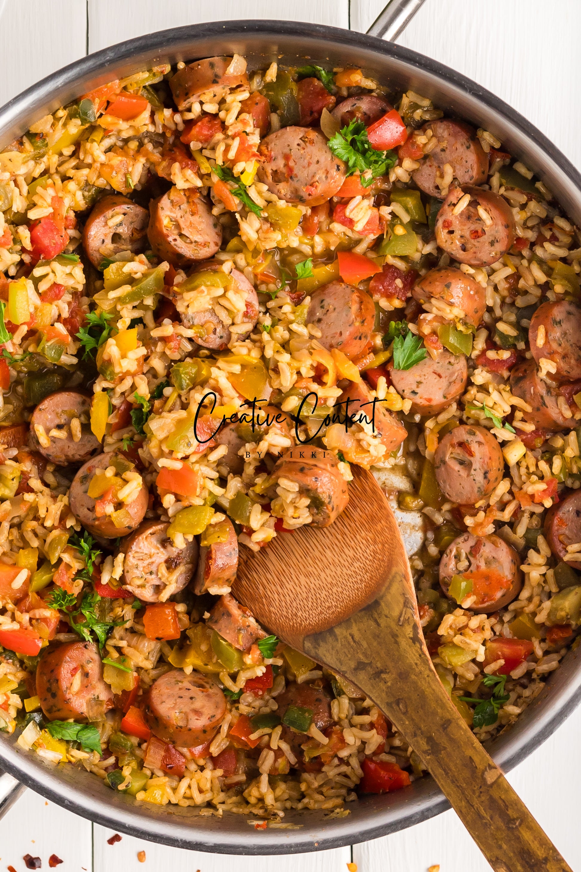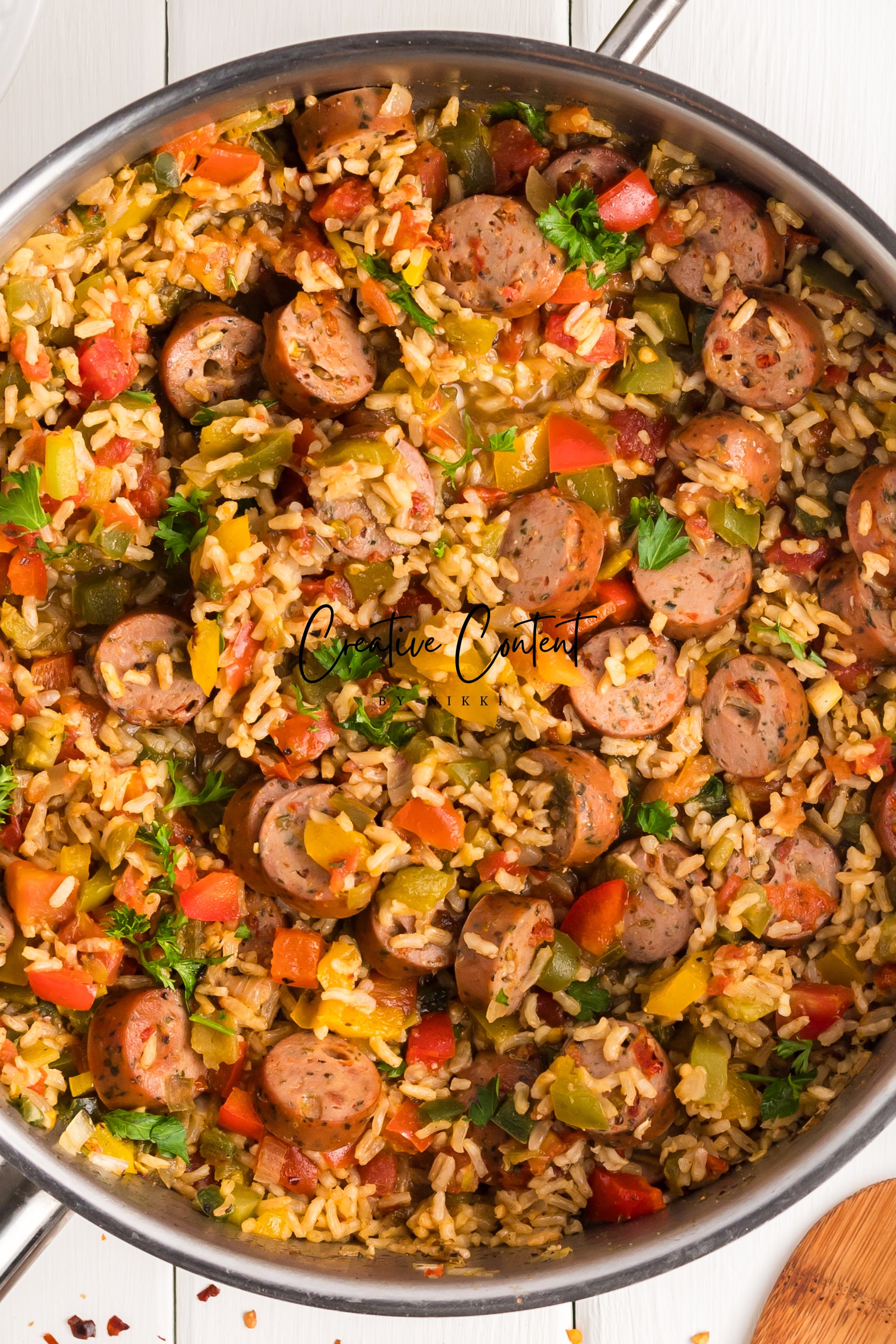 This sausage and rice casserole is full of flavor with bell peppers, seasoned chicken sausage, minced garlic, and fresh parsley. This is a quick dinner in under 25 minutes the whole family will love. This is the perfect dinner when having friends or family over. If you love spice and loads of flavor you will love this casserole.