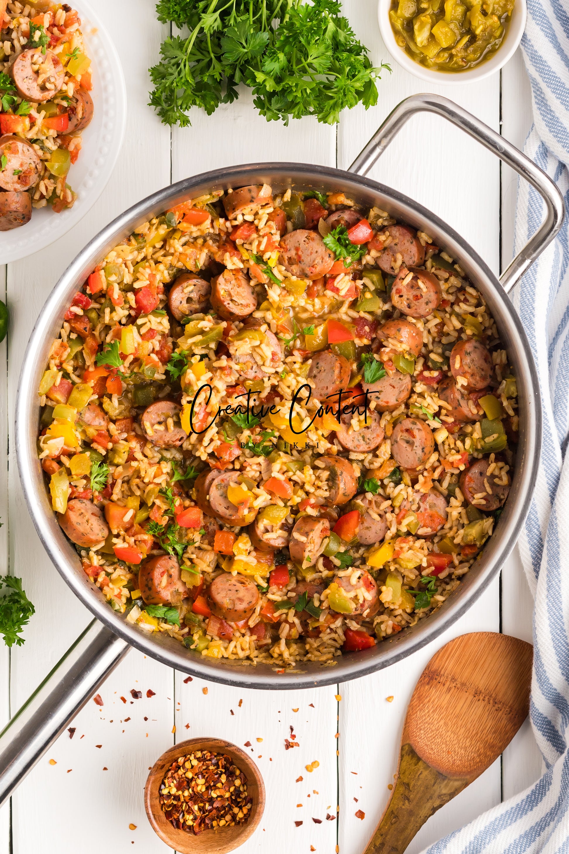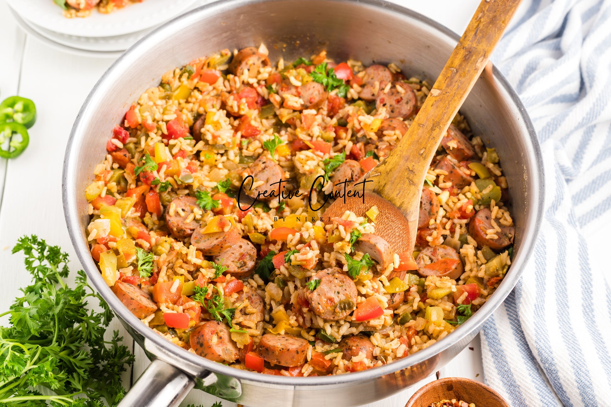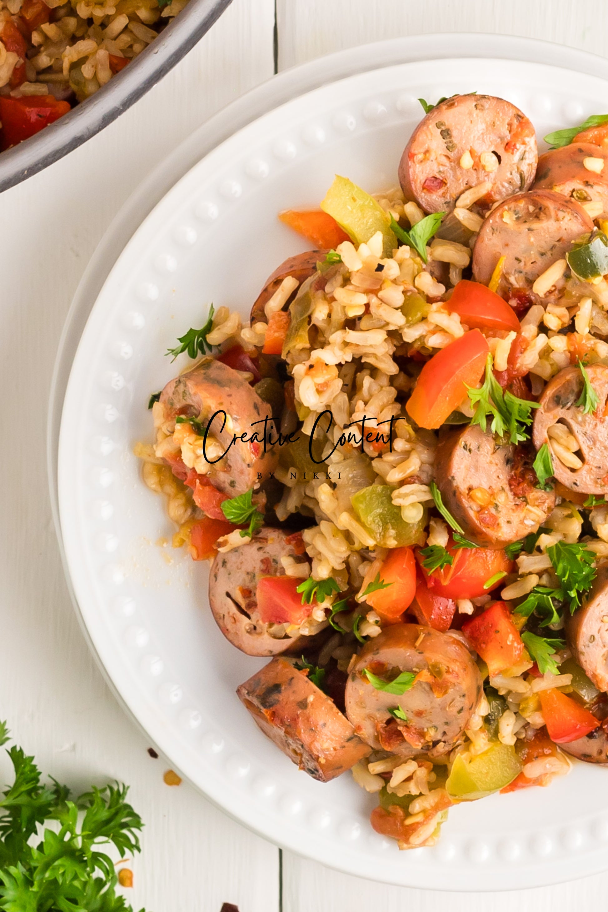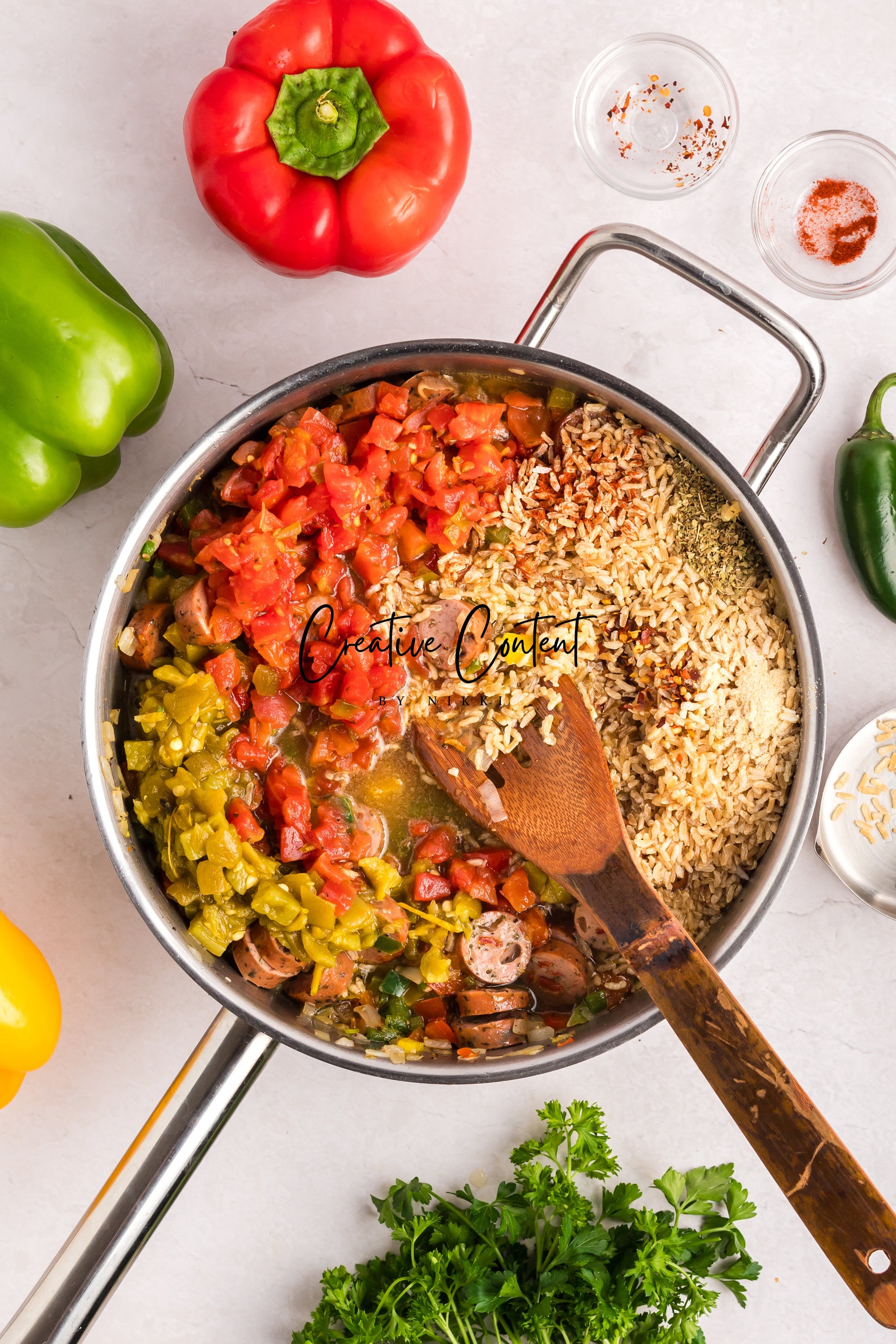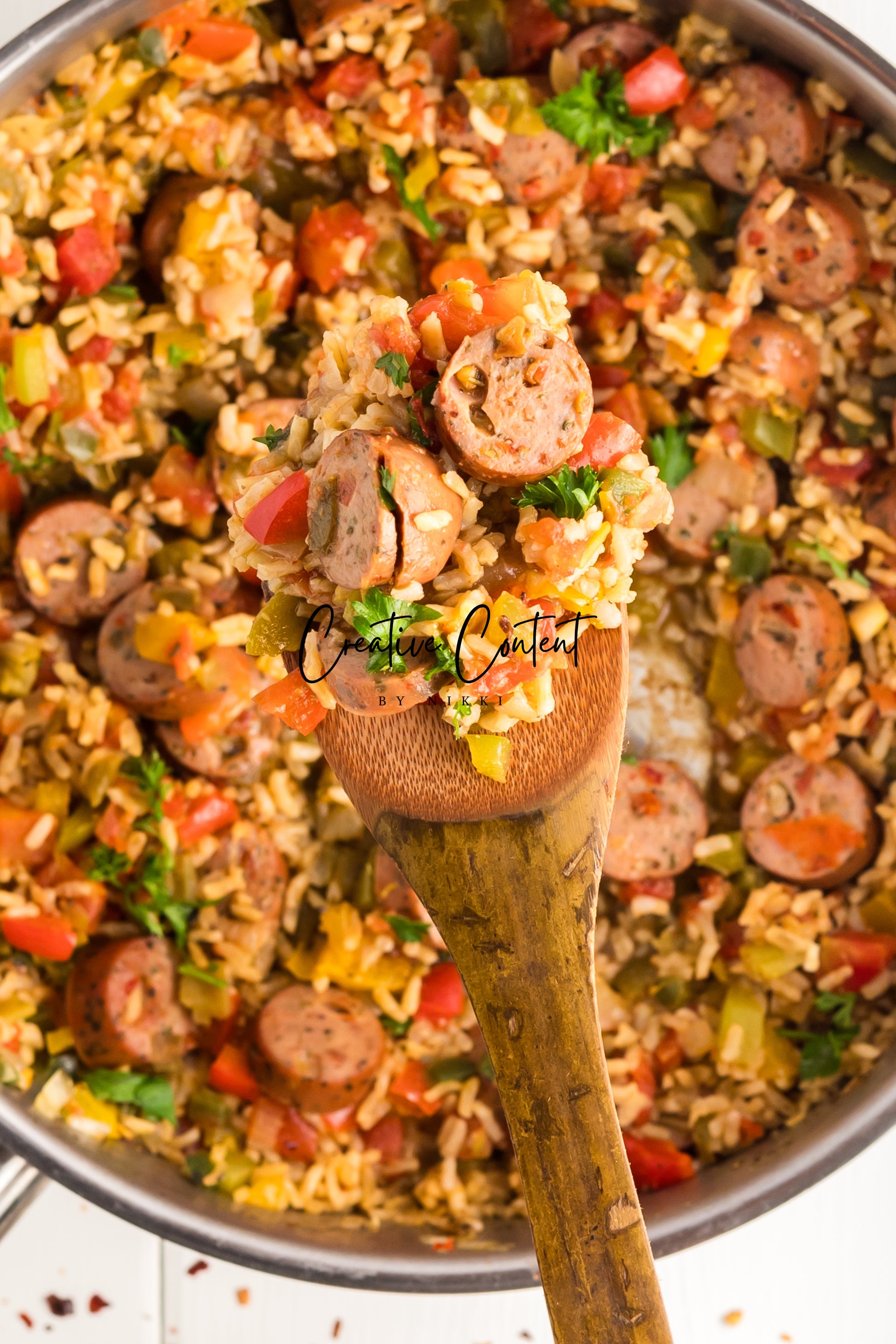This sausage and rice casserole is full of flavor with bell peppers, seasoned chicken sausage, minced garlic, and fresh parsley. This is a quick dinner in under 25 minutes the whole family will love. This is the perfect dinner when having friends or family over. If you love spice and loads of flavor you will love this casserole.