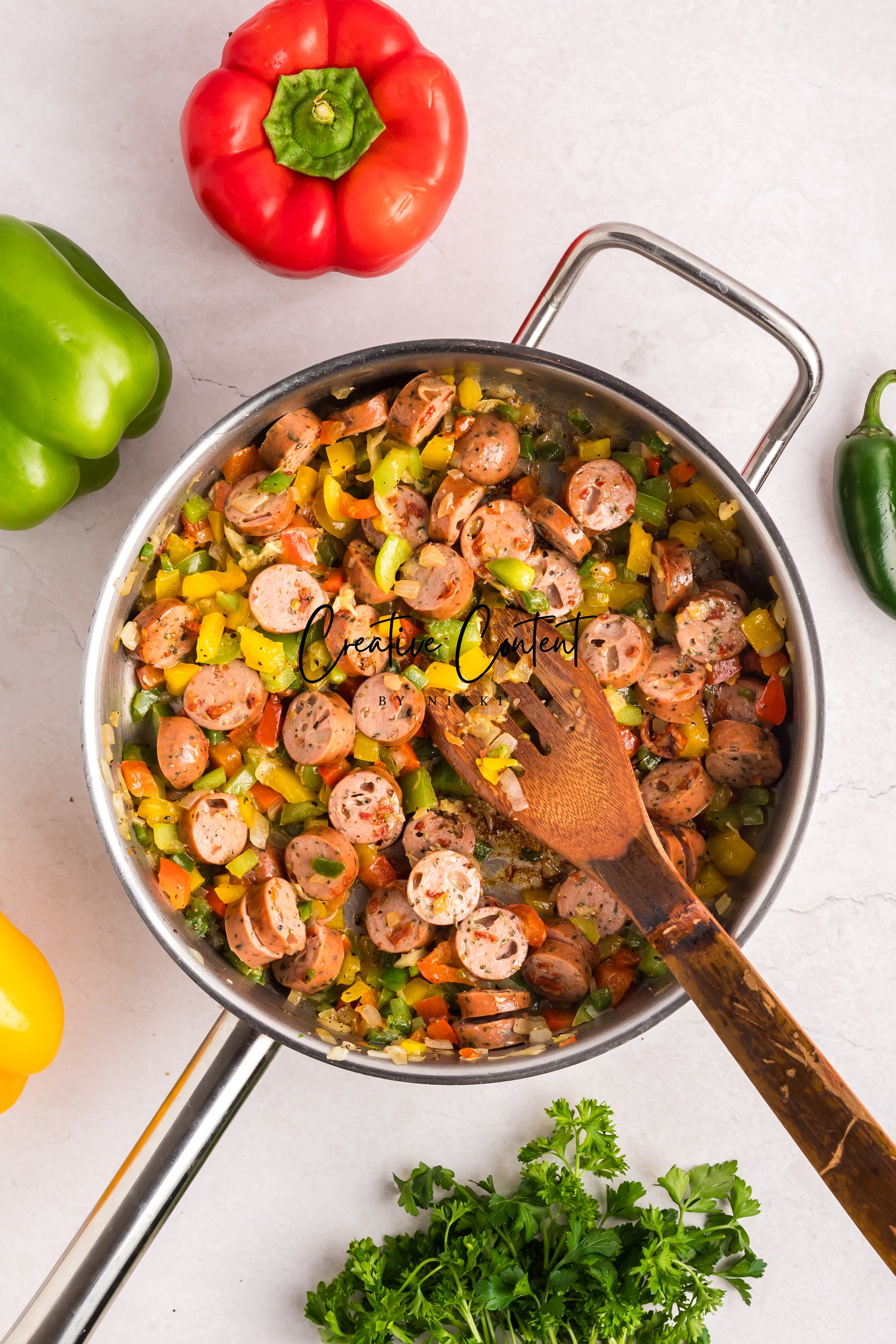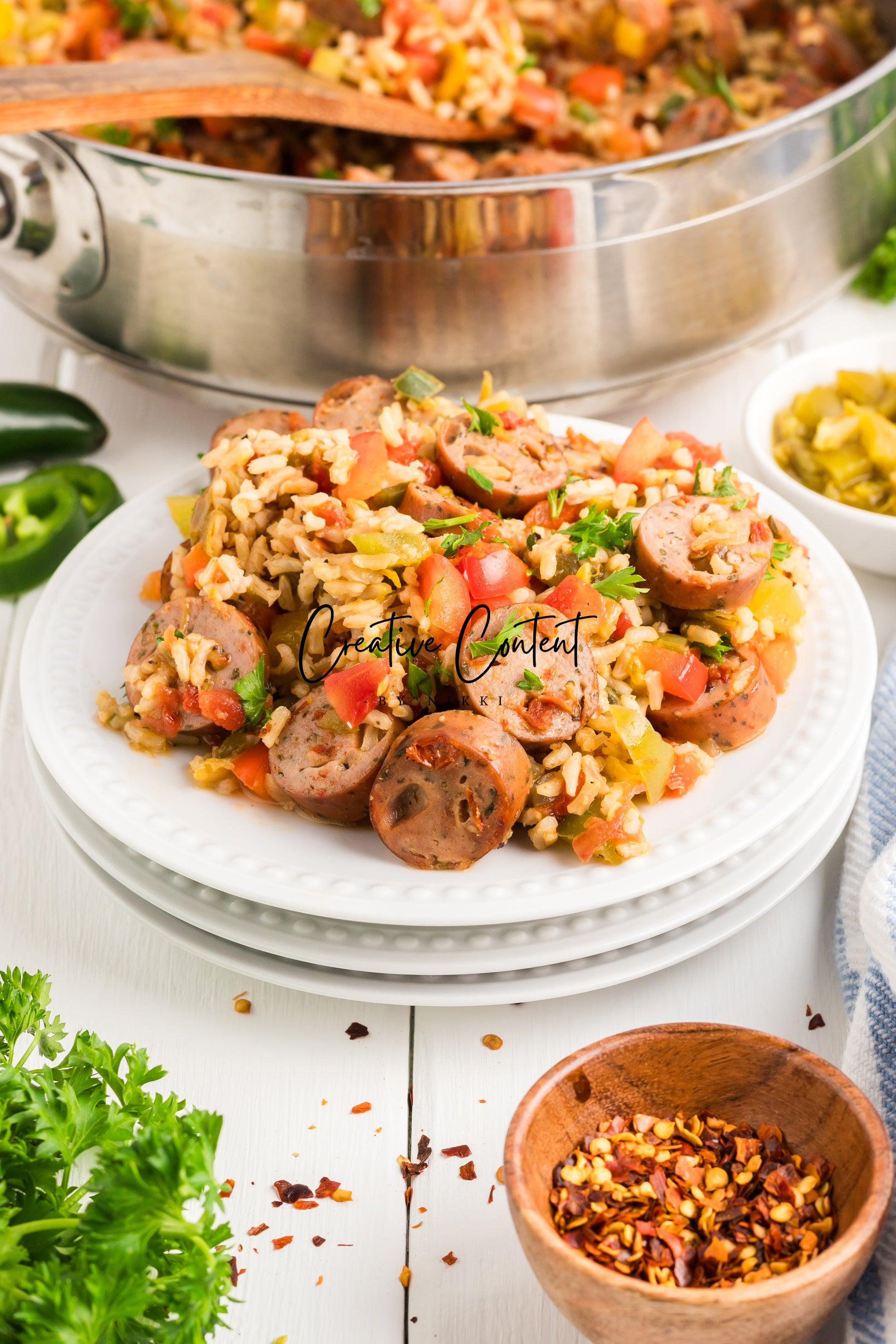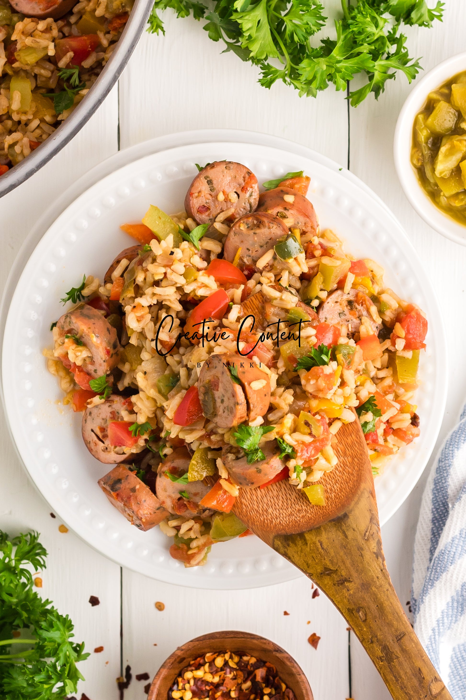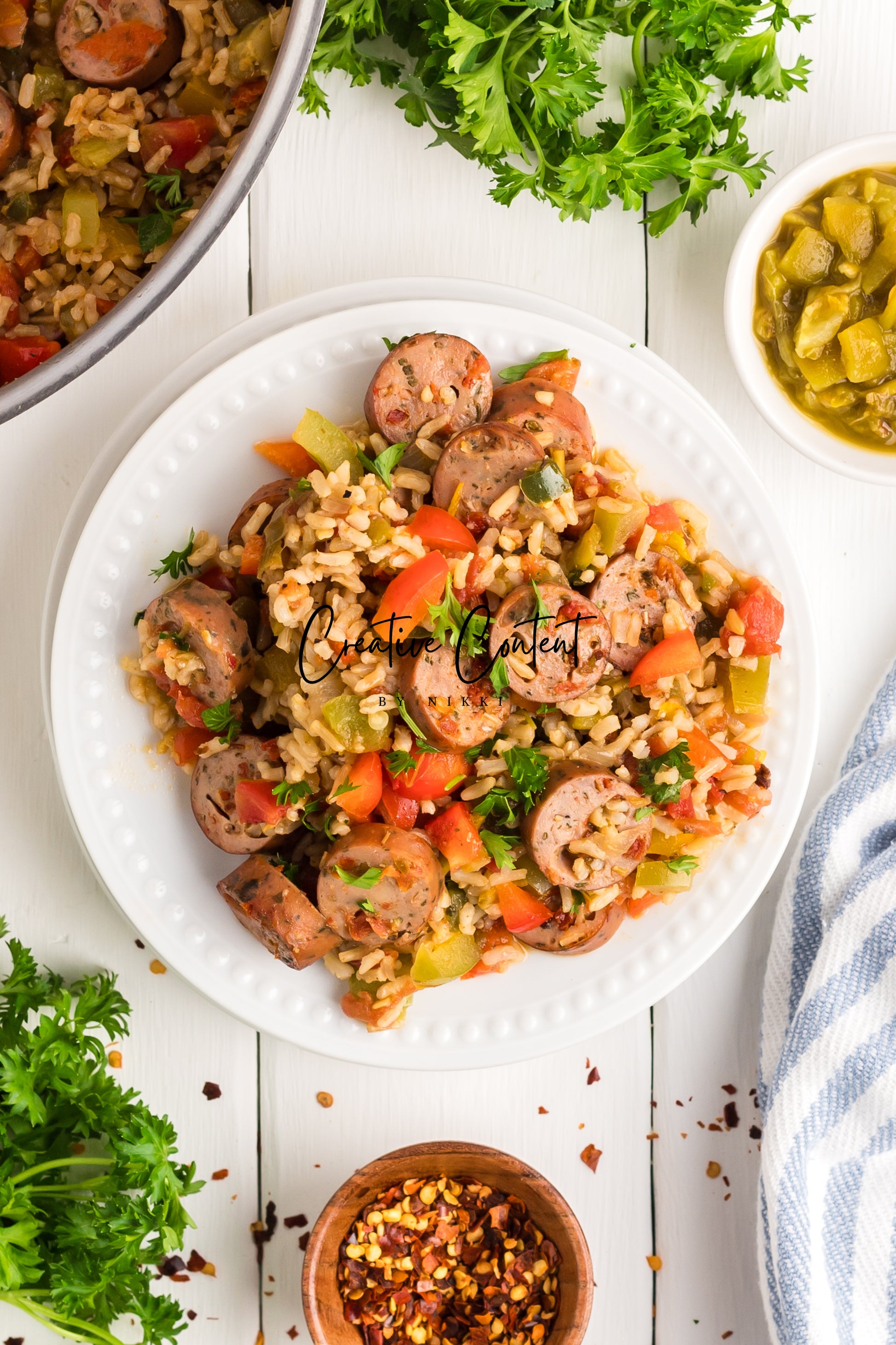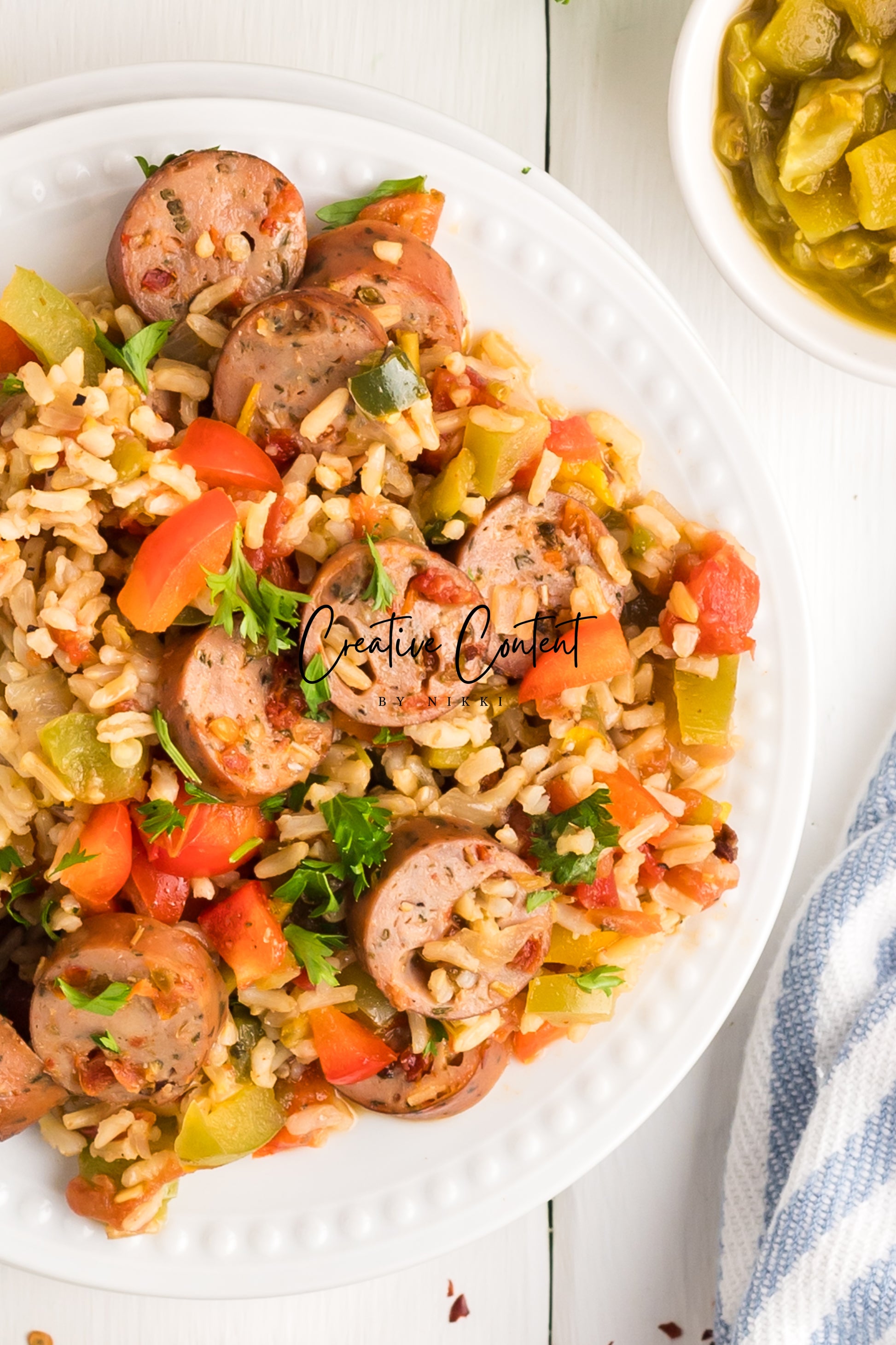 This sausage and rice casserole is full of flavor with bell peppers, seasoned chicken sausage, minced garlic, and fresh parsley. This is a quick dinner in under 25 minutes the whole family will love. This is the perfect dinner when having friends or family over. If you love spice and loads of flavor you will love this casserole.