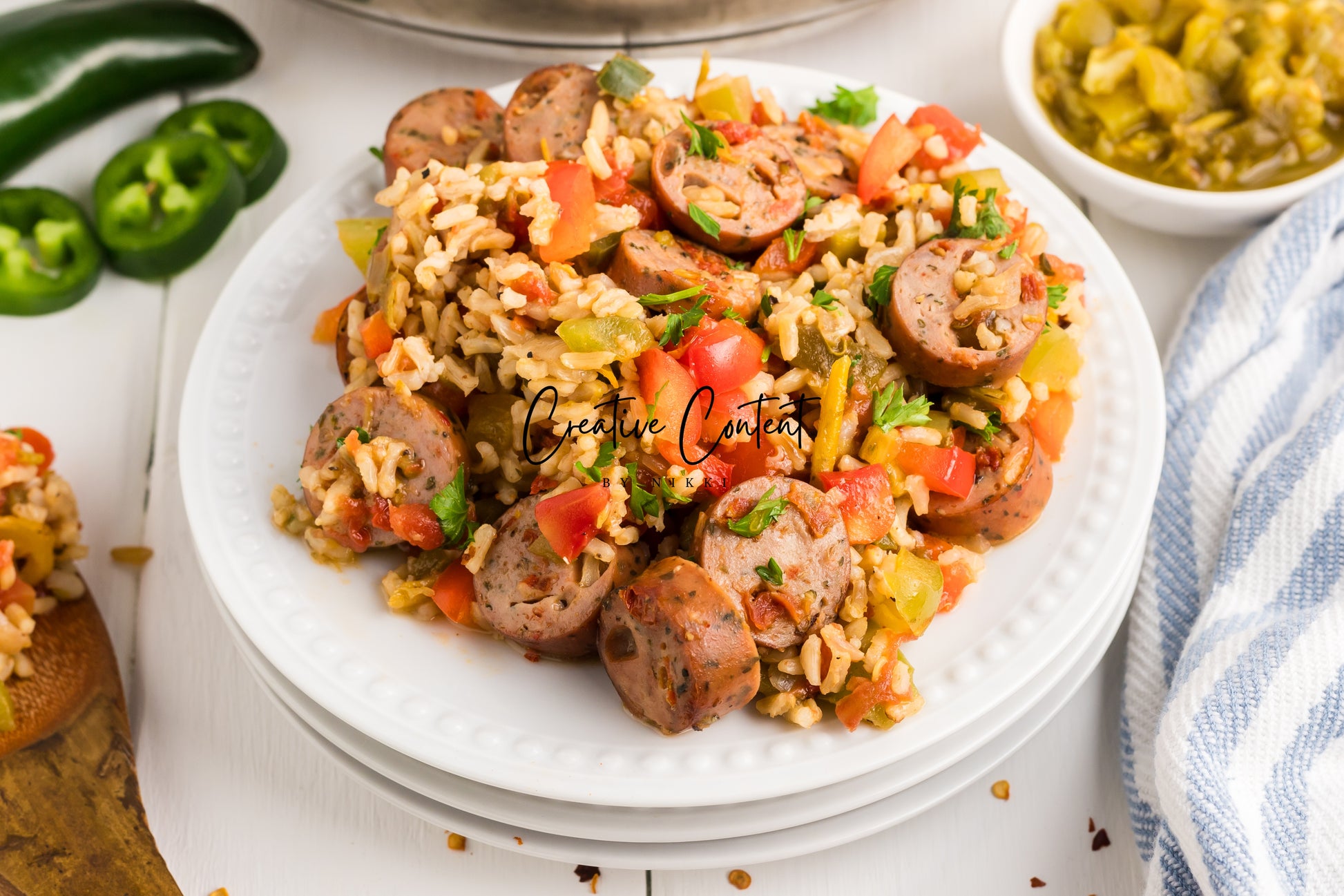 - Featured Ingredients; avocado oil, yellow onion, bell peppers, jalapeno pepper, chicken sausage, garlic cloves, low sodium petite diced tomatoes with green chilies, low sodium chicken broth, instant brown rice, green chiles, seasonings, and parsley.