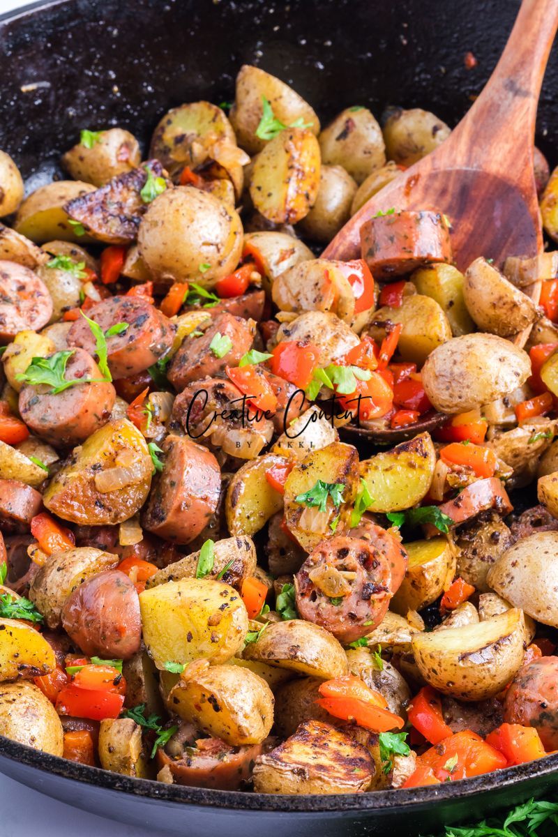 - Ingredients needed; Olive oil, precooked sausage of your choice, potatoes, red bell peppers, onion, chicken stock, lemon juice, Italian seasoning, coarse kosher salt, black pepper, garlic powder, and fresh parsley.