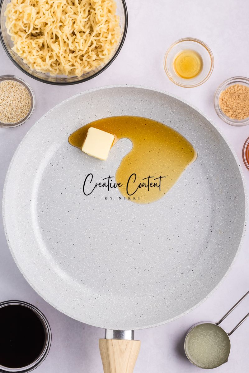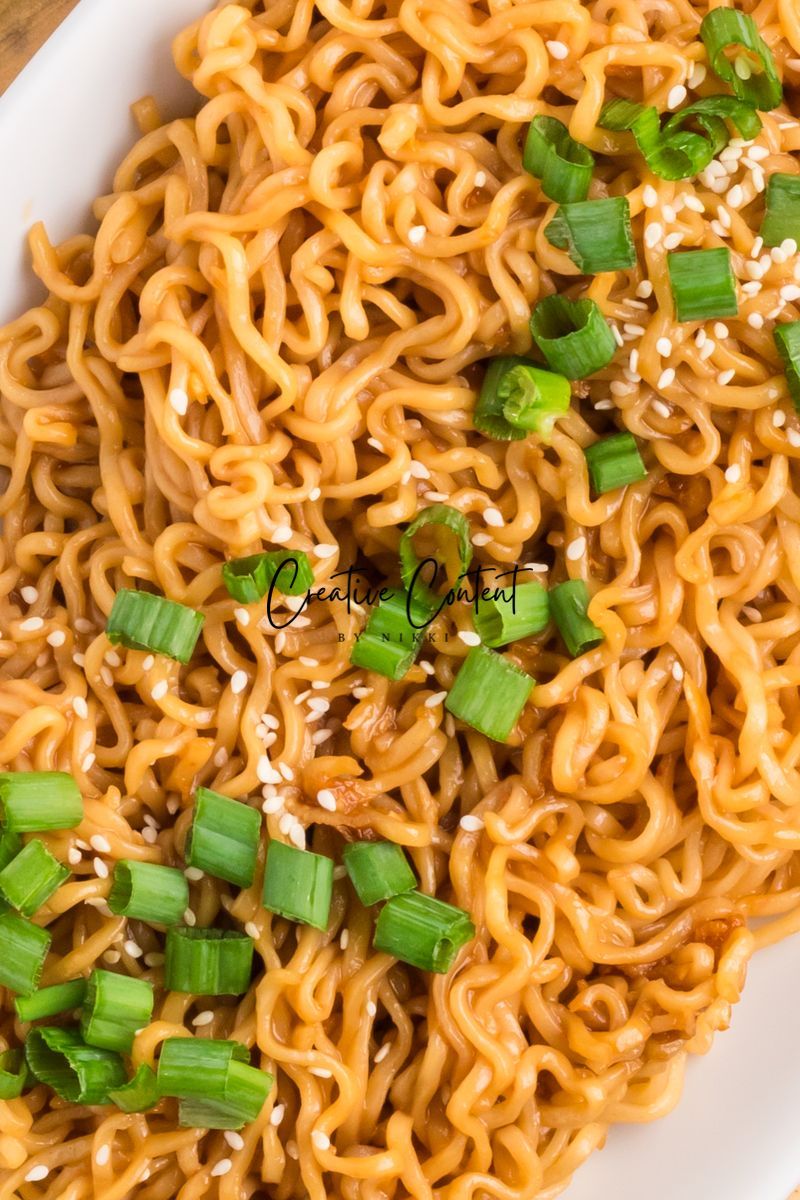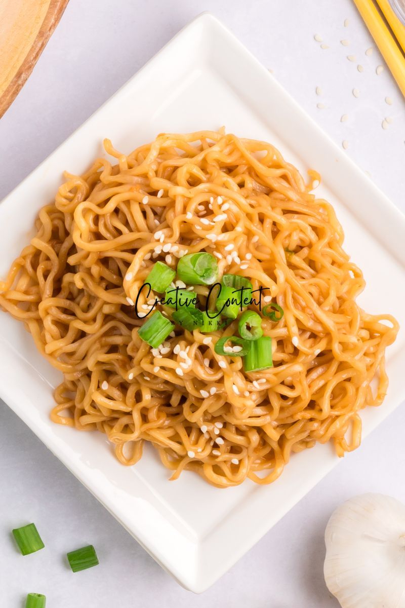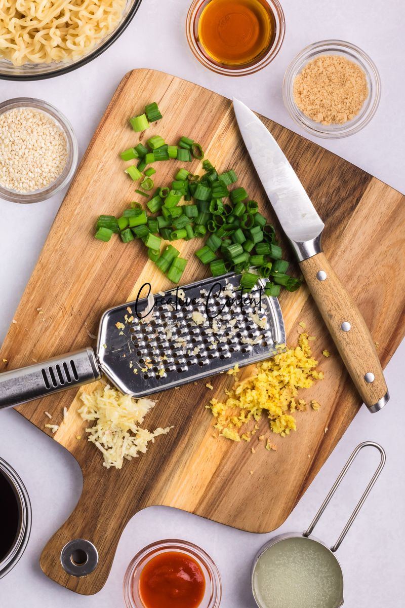 - Ingredients needed; ramen noodles, water, unsalted butter, sesame oil, garlic cloves, low sodium soy sauce, light brown sugar, sriracha, ginger, green onion, and sesame seeds.