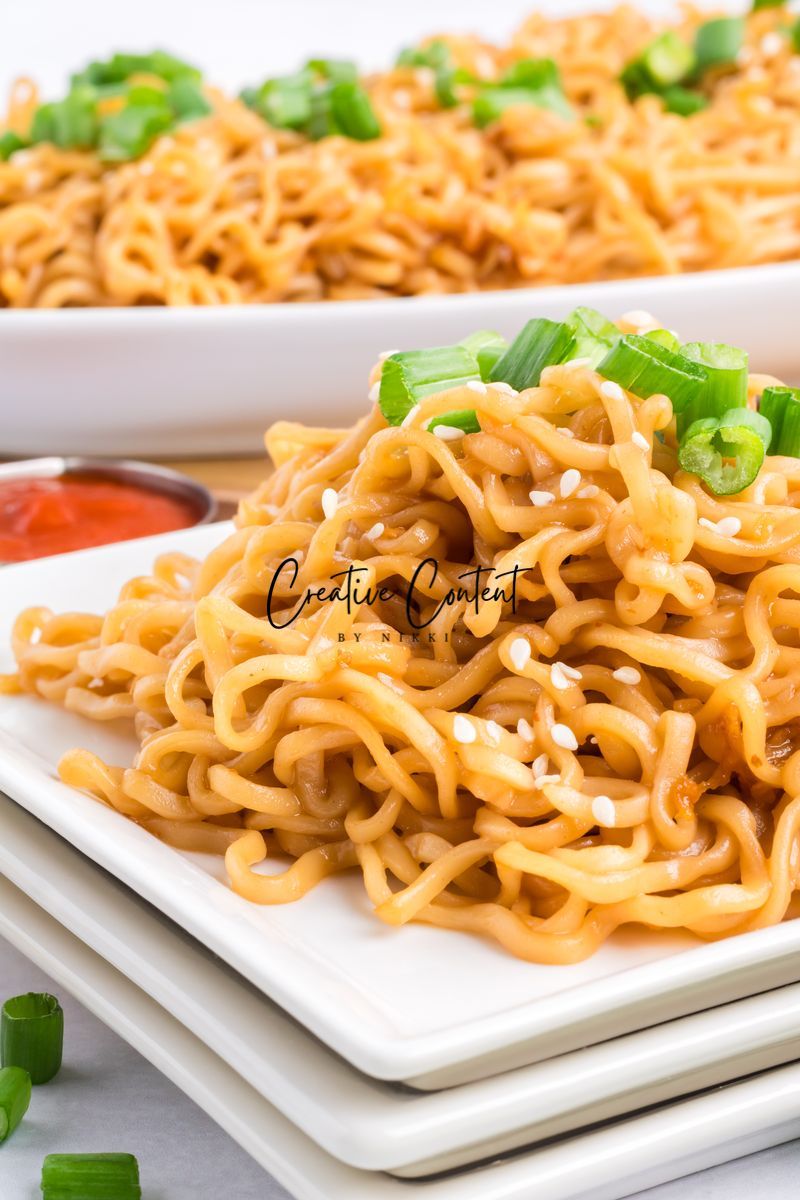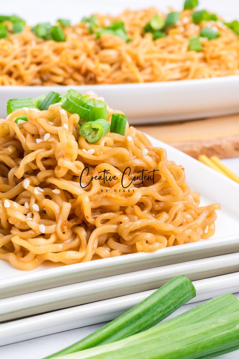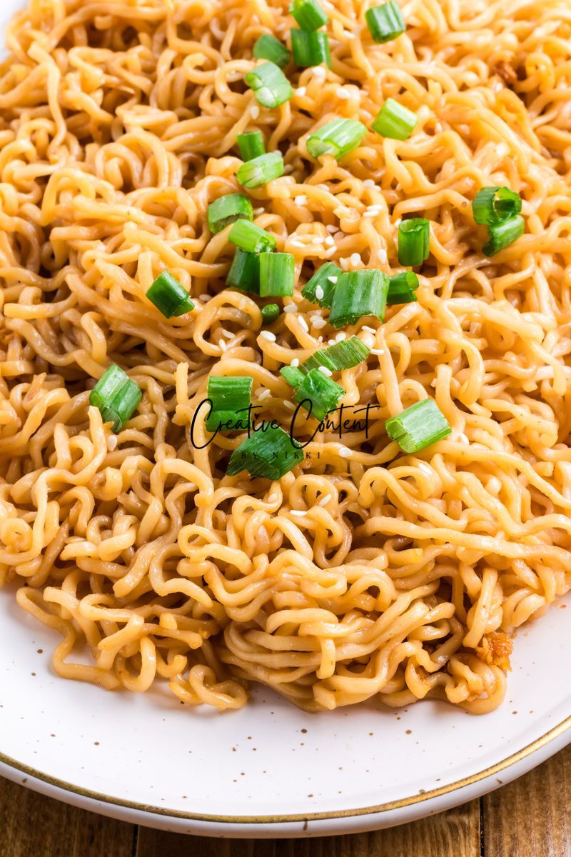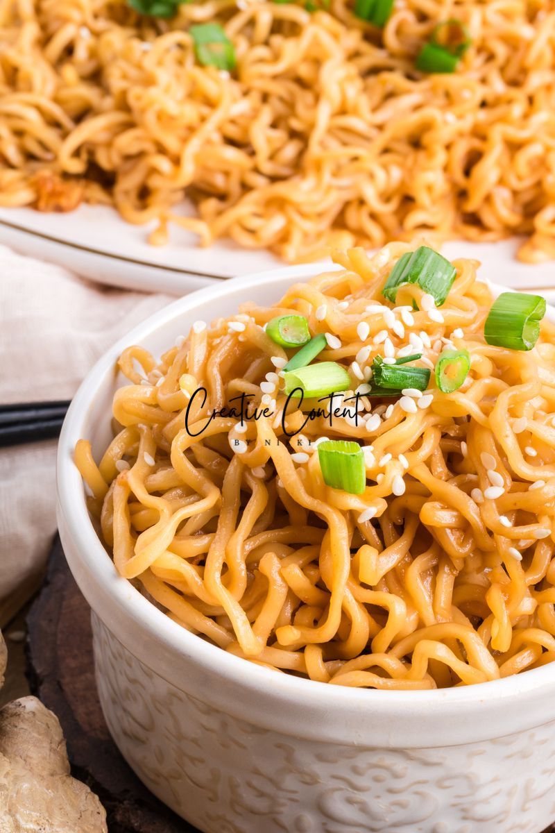 - Ingredients needed; ramen noodles, water, unsalted butter, sesame oil, garlic cloves, low sodium soy sauce, light brown sugar, sriracha, ginger, green onion, and sesame seeds.