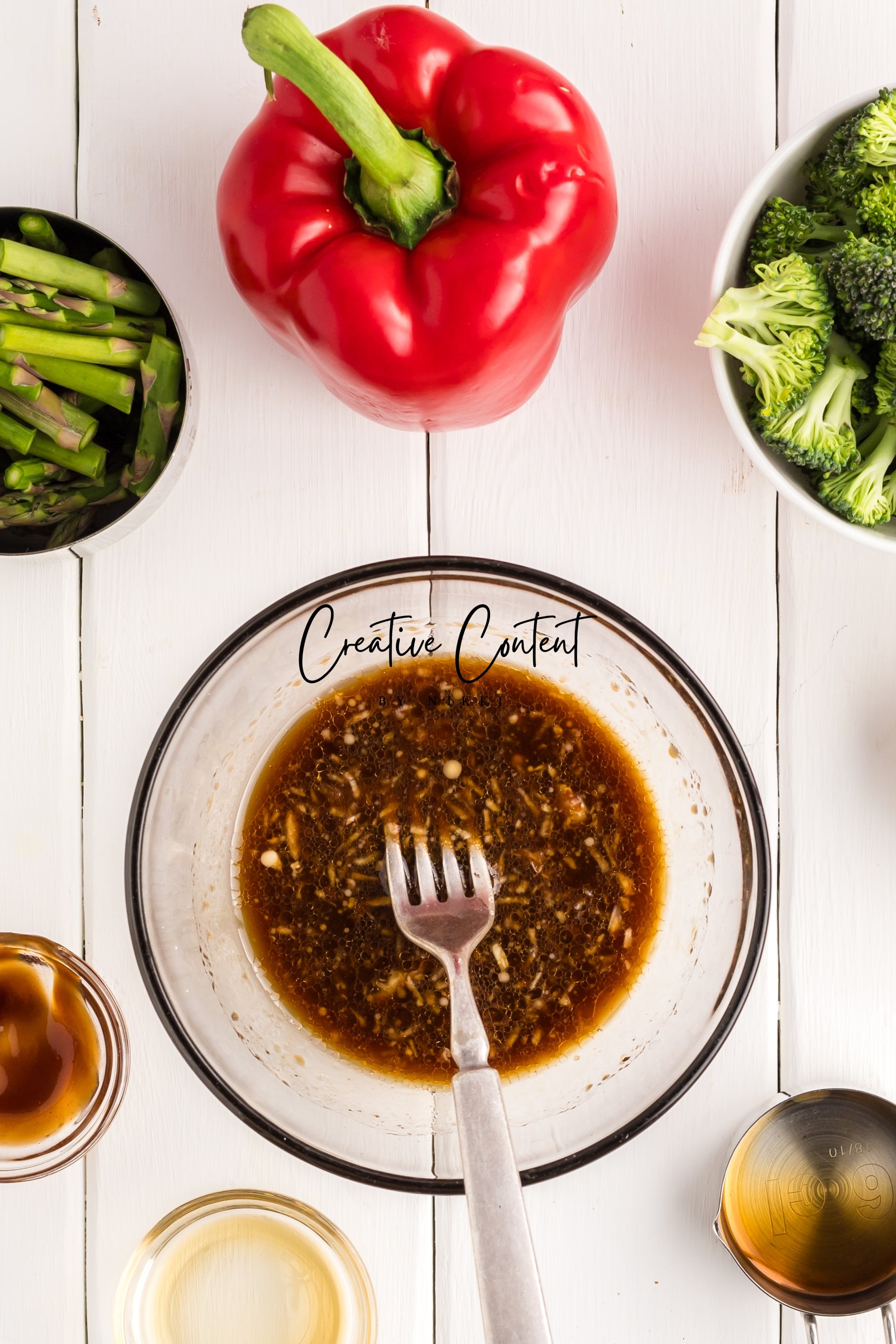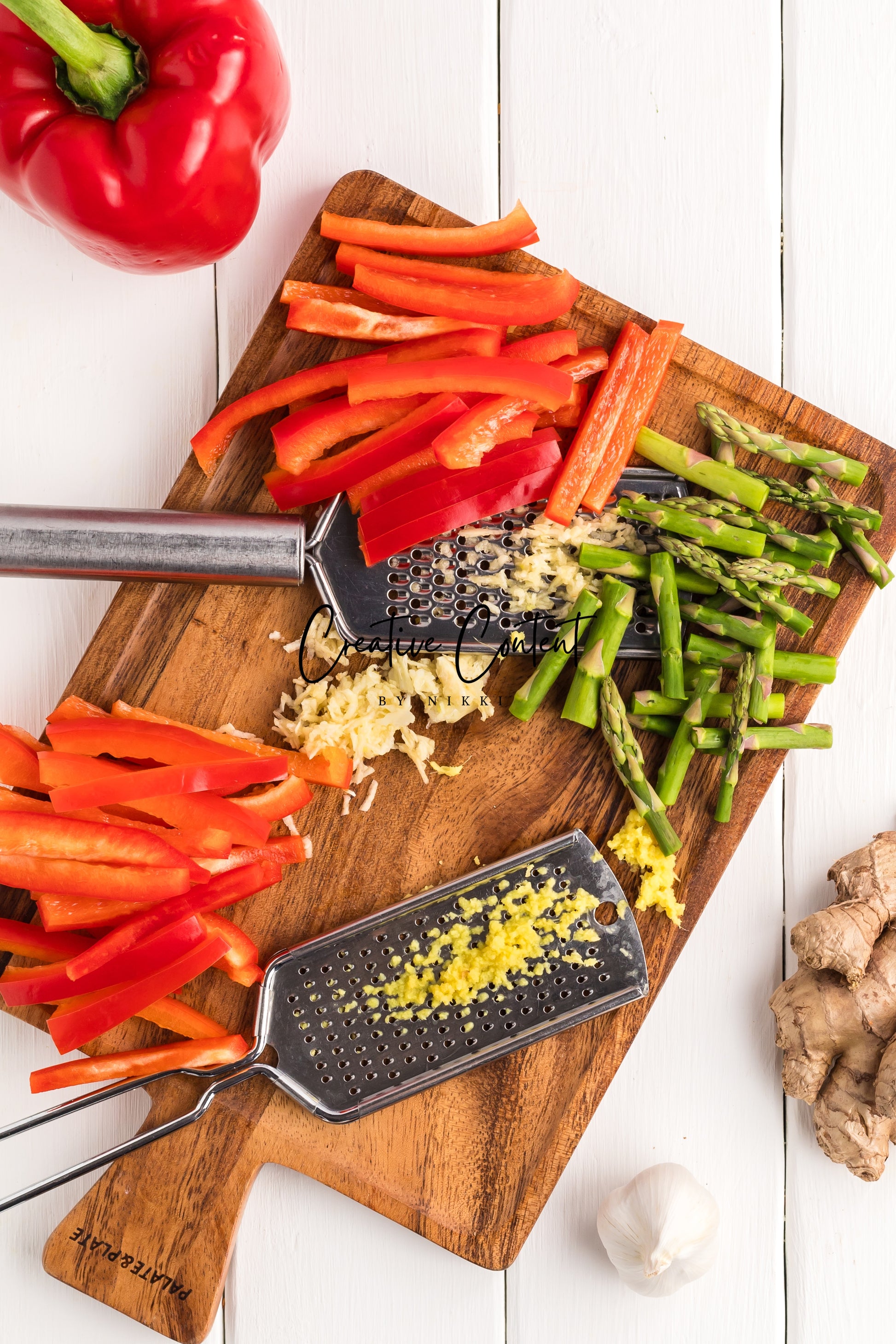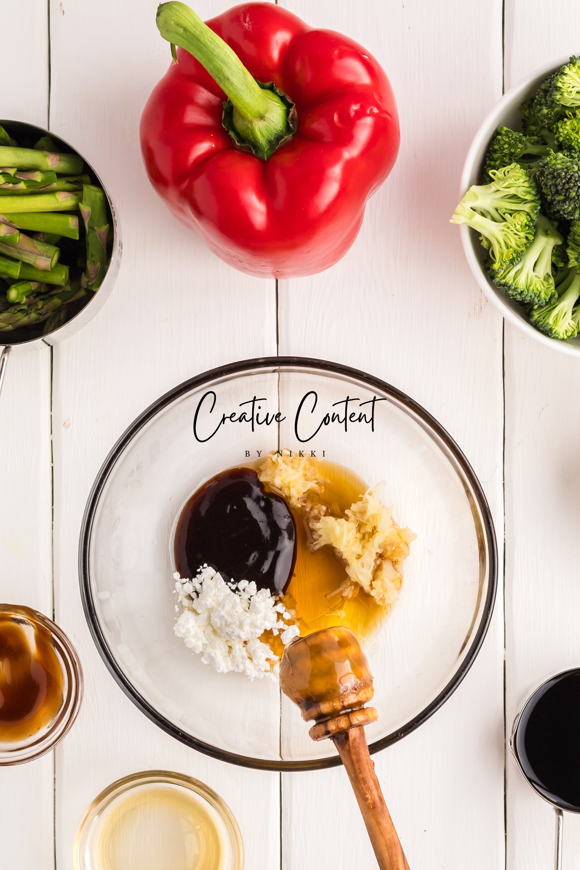- Featured Ingredients; low sodium soy sauce, garlic cloves, honey, ginger, toasted sesame oil, hoisin sauce, cornstarch avocado oil, bell pepper, asparagus, broccoli, peas, raw shrimp, rice, and sesame seeds.
