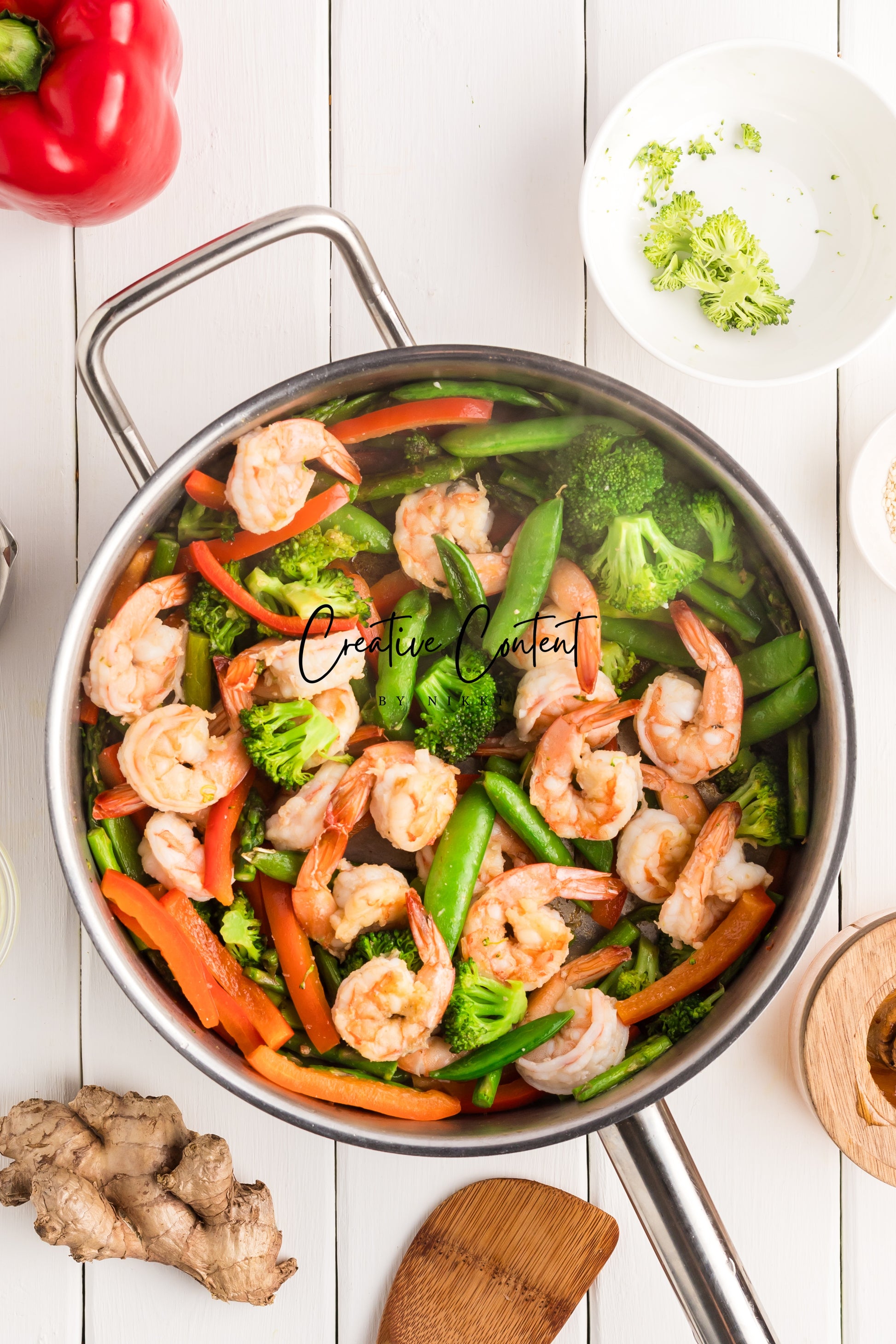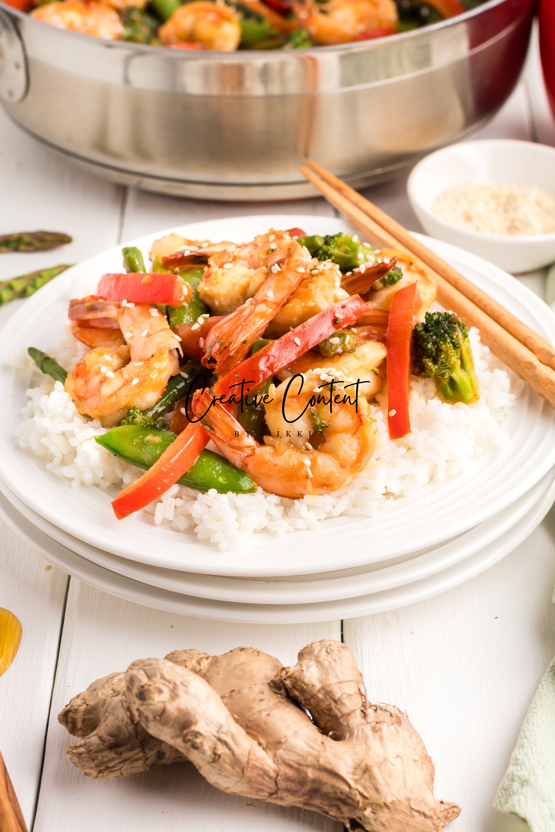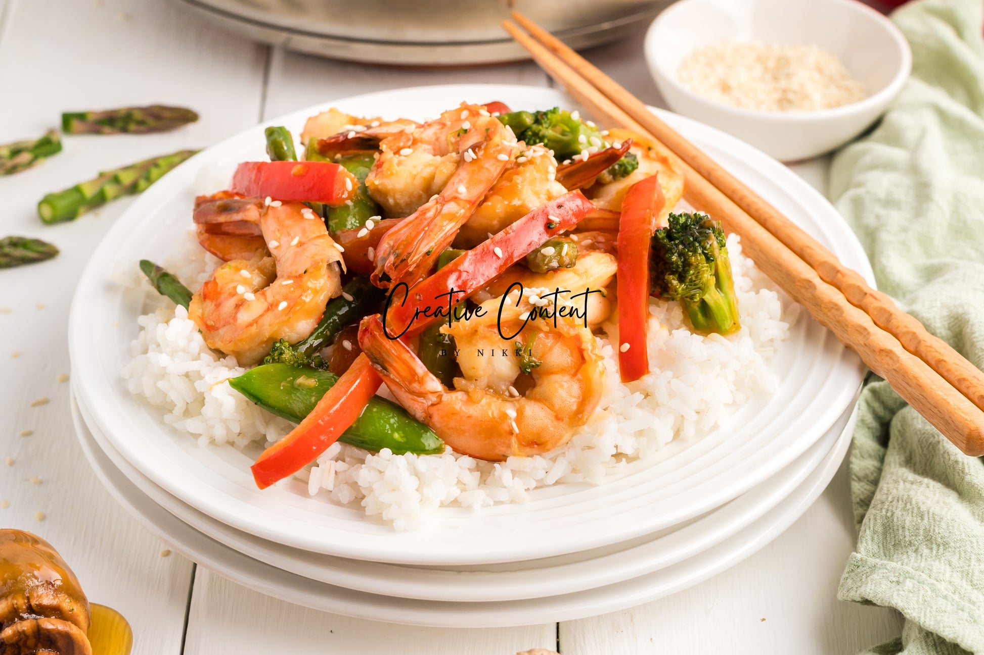 This shrimp stir fry is full of flavor with the sauce that consists of soy sauce, fresh garlic, sweet honey, and hoisin sauce. The broccoli, sugar snap peas, bell pepper, and asparagus make this a delicious dinner the whole family will love.