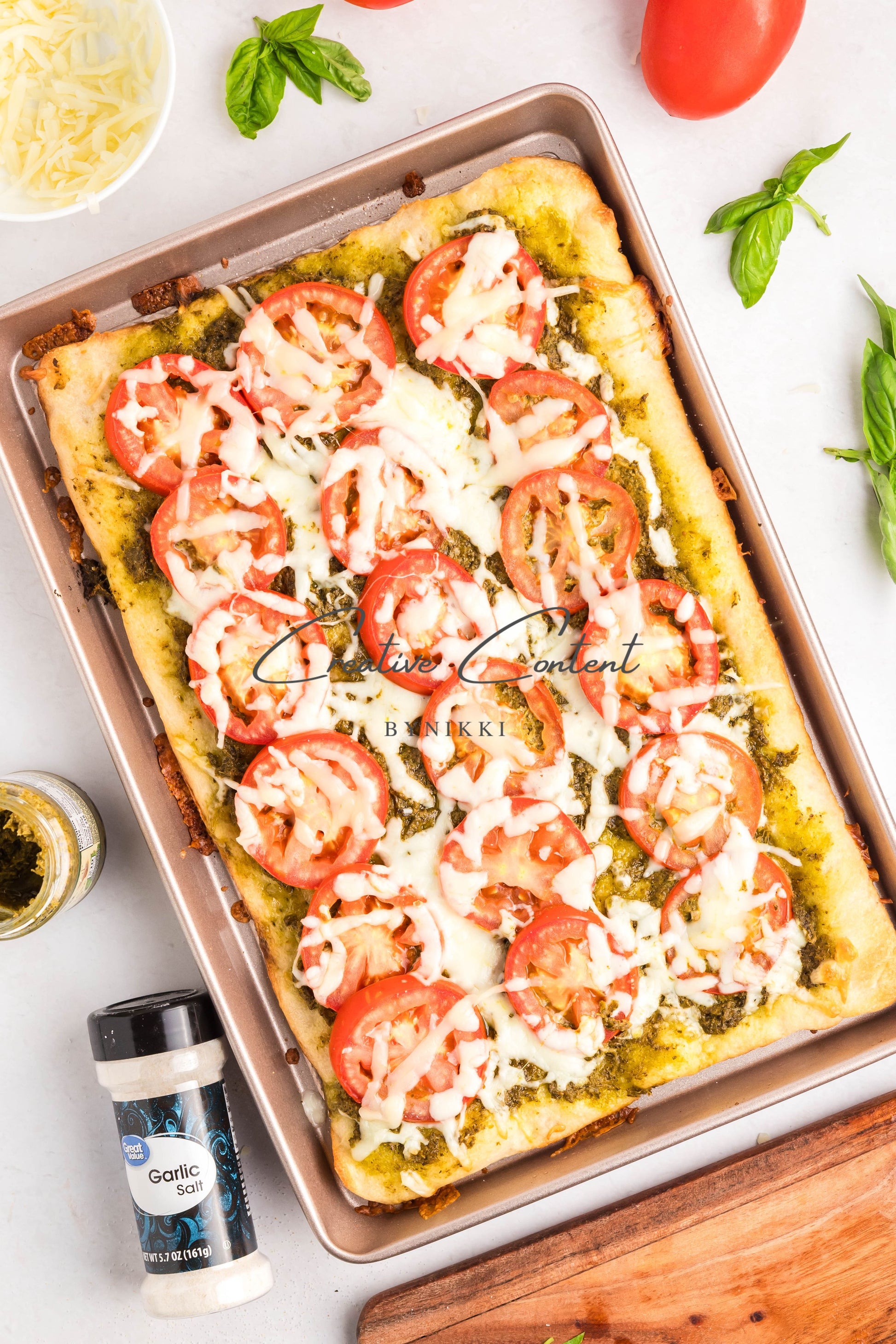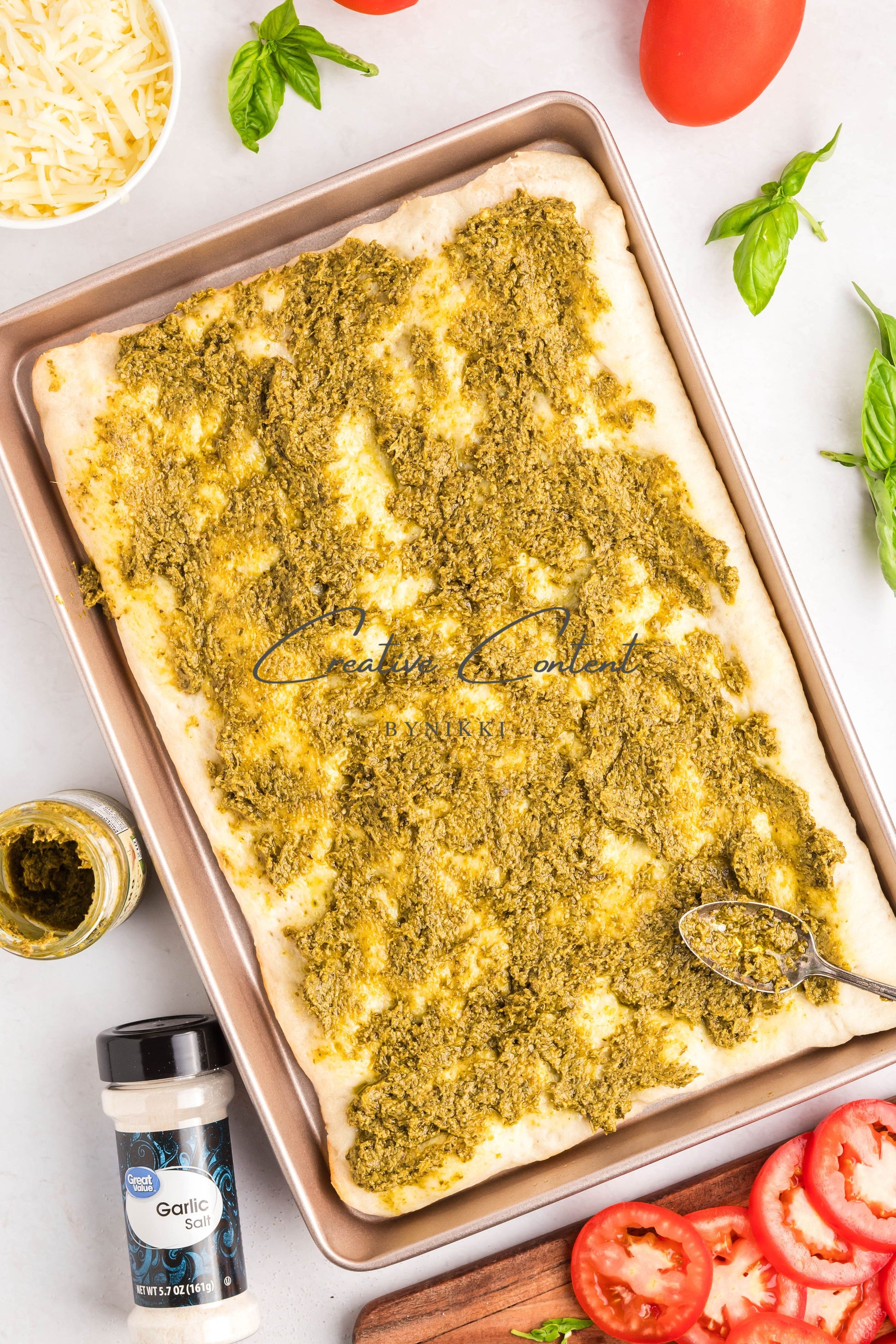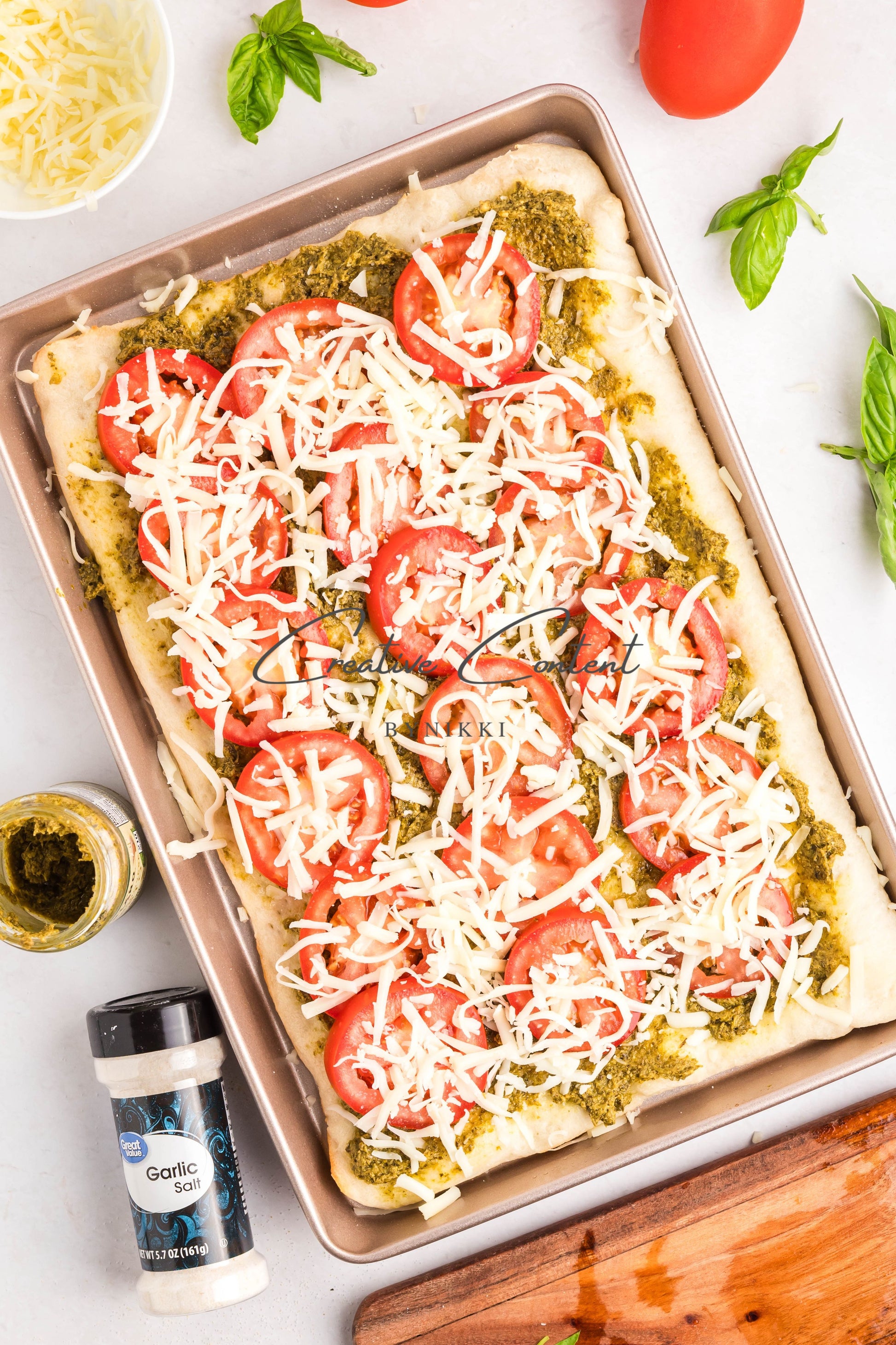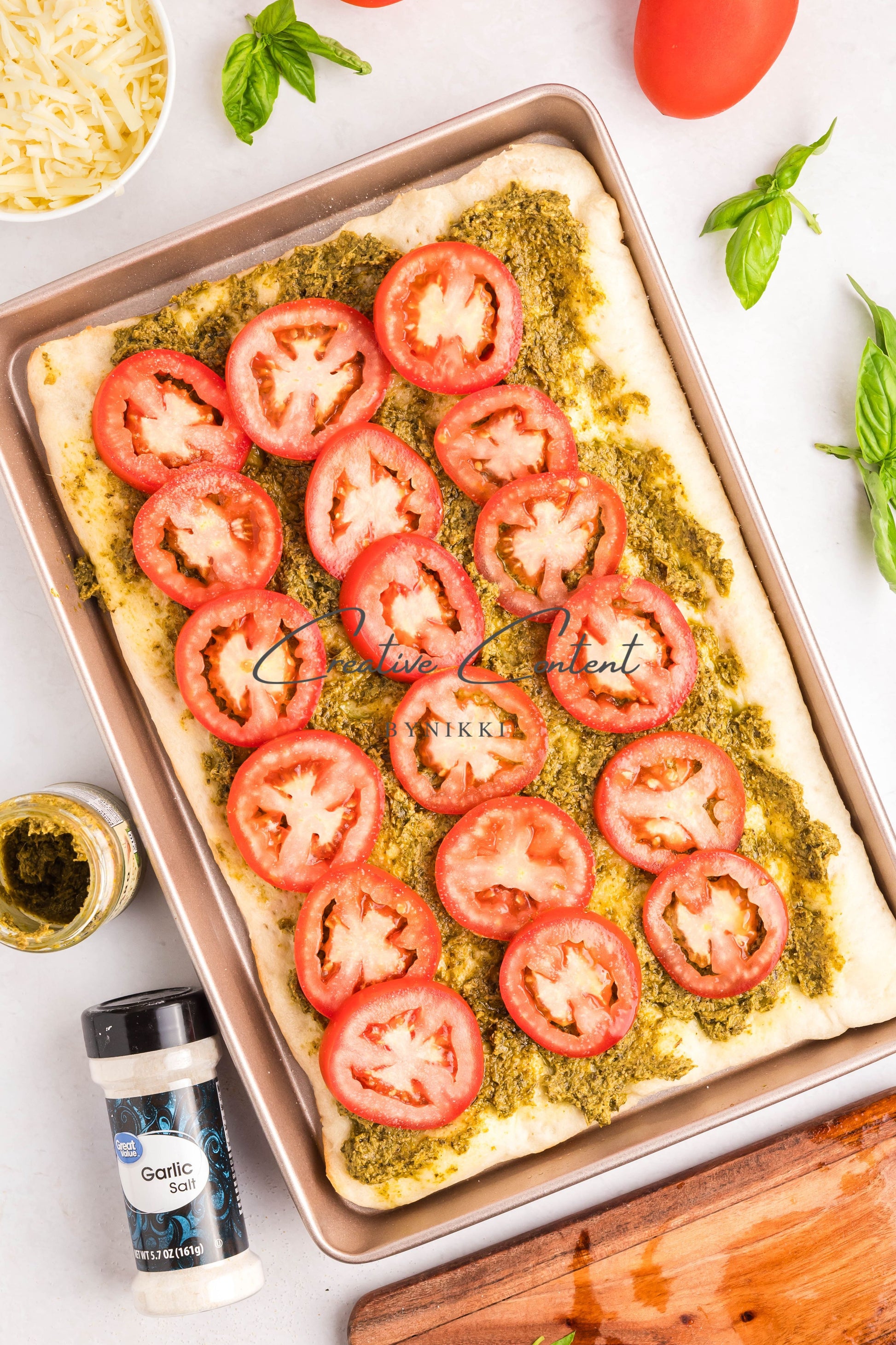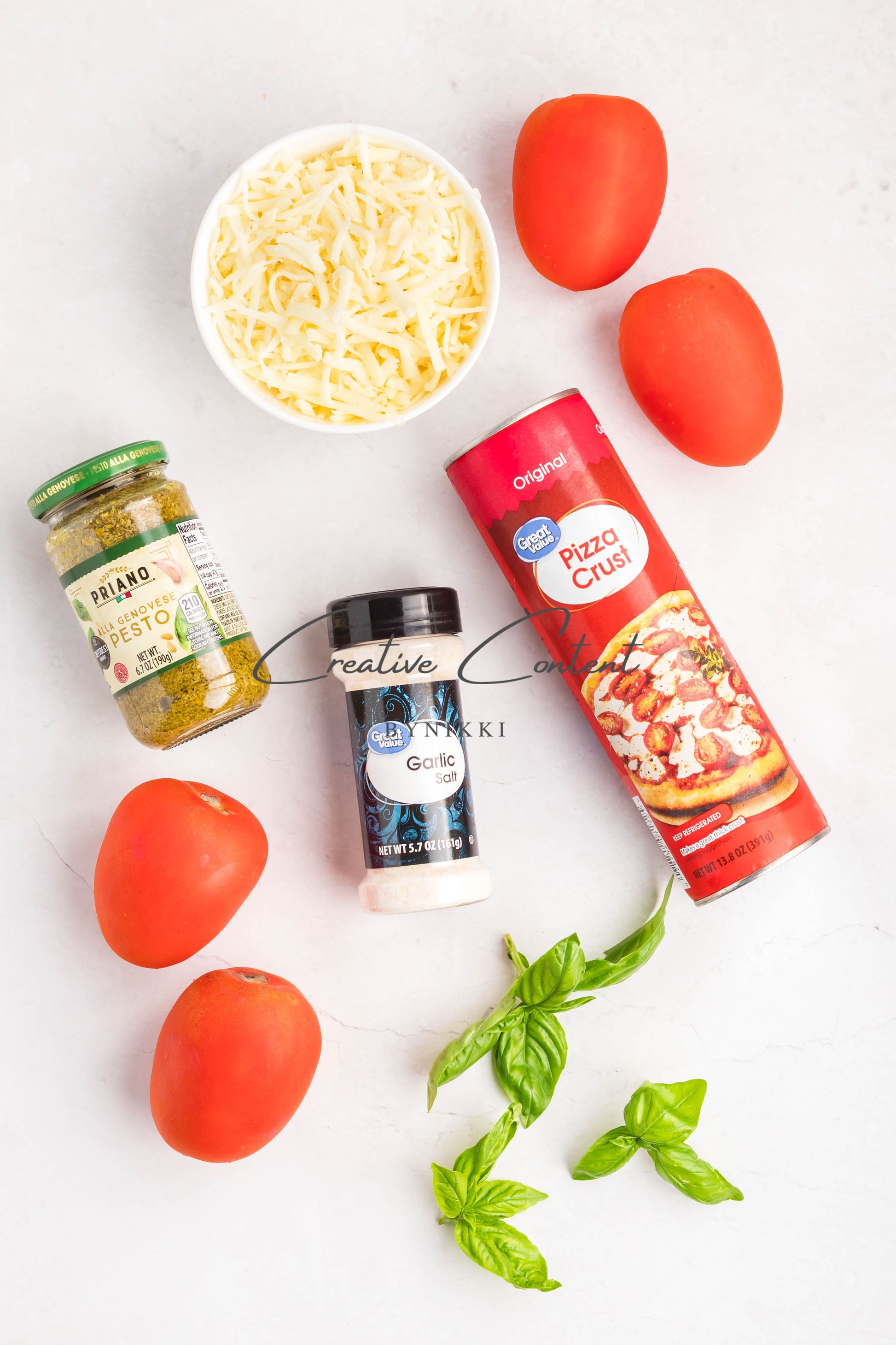 - Ingredients: refrigerated pizza crust, pesto, tomatoes, shredded mozzarella, garlic salt, basil
