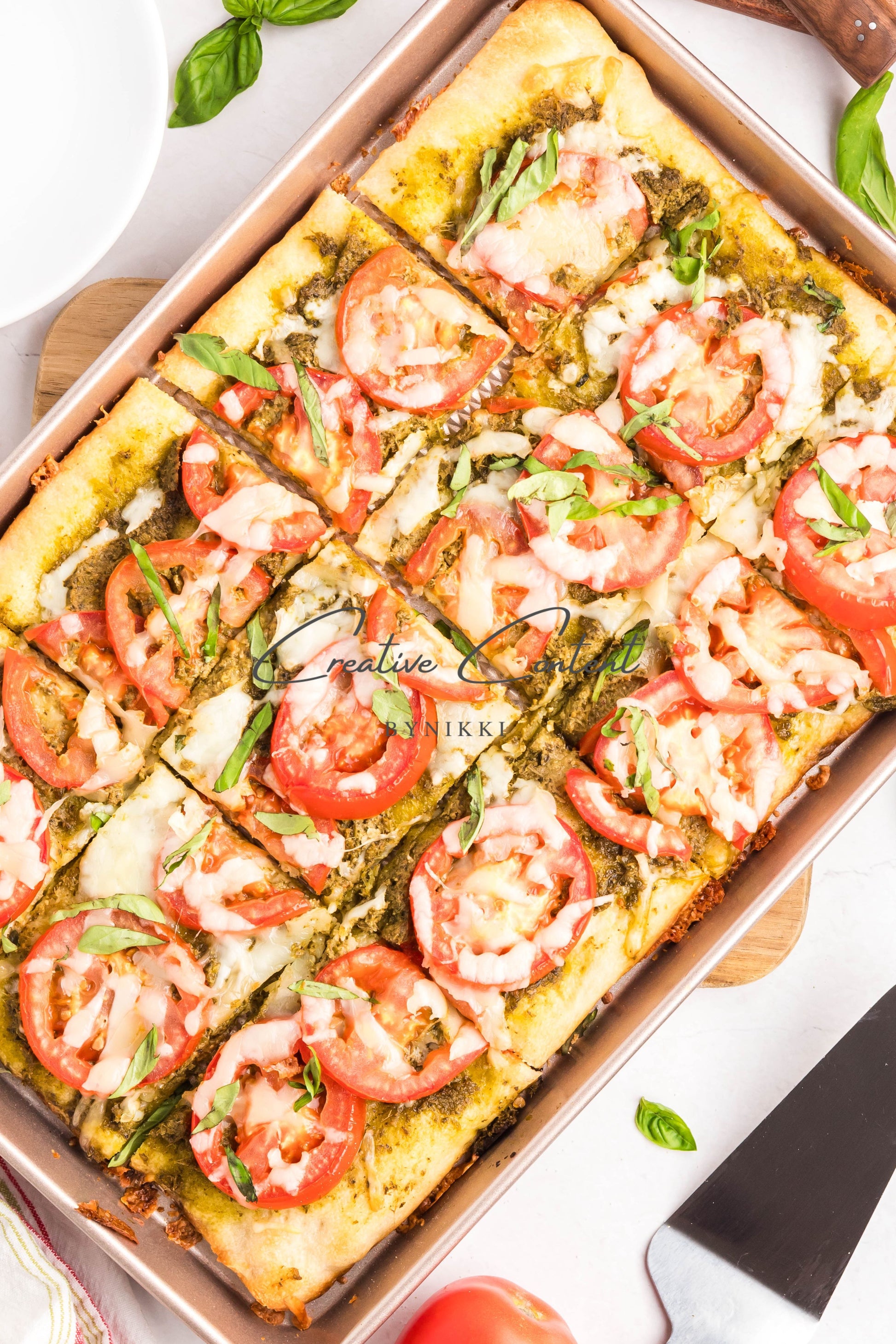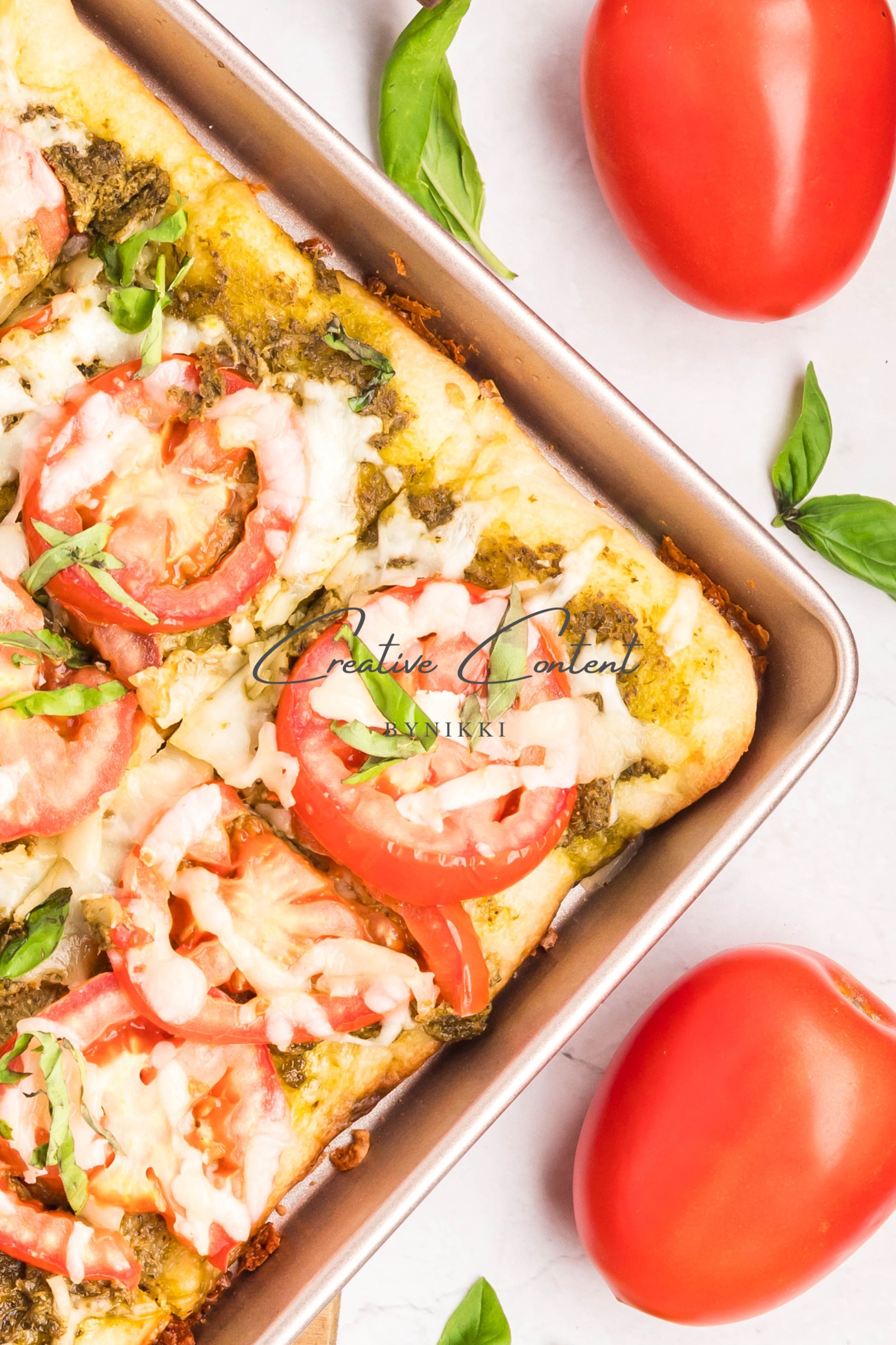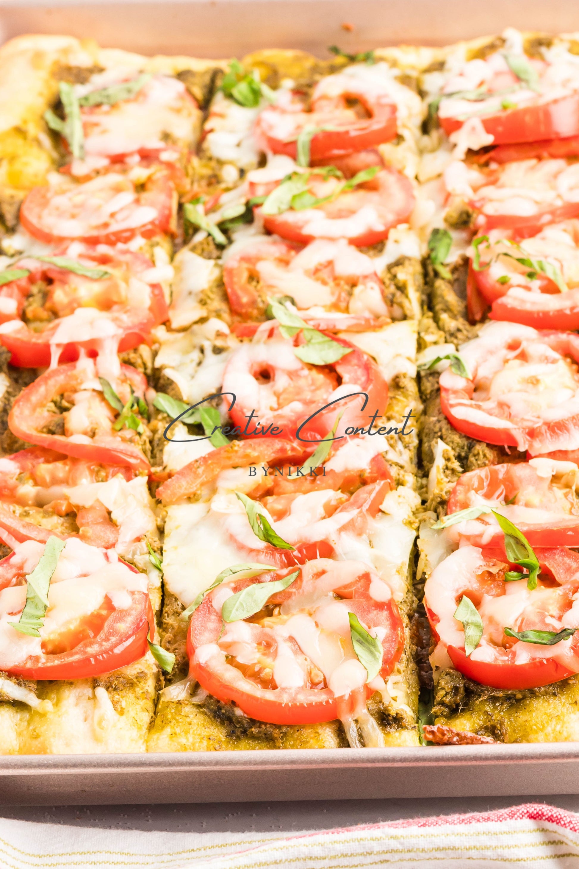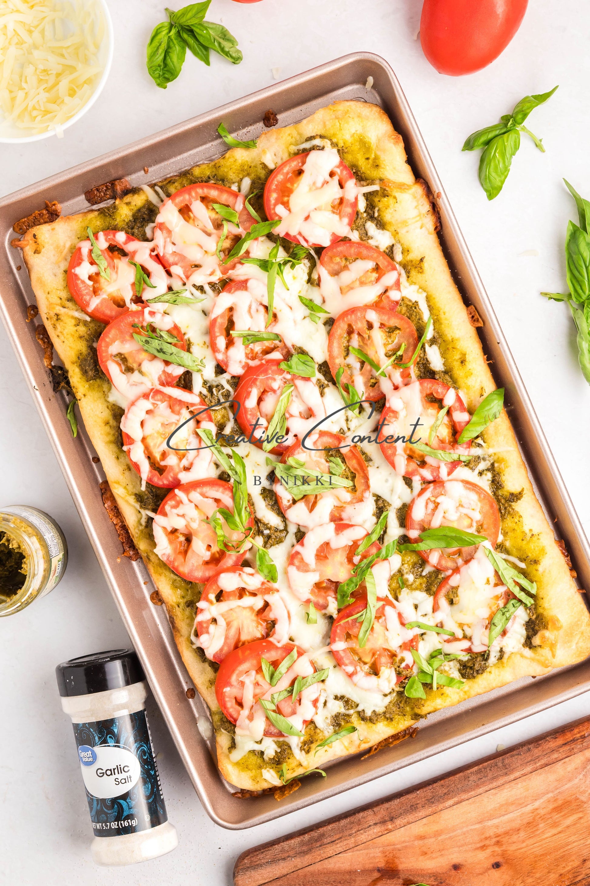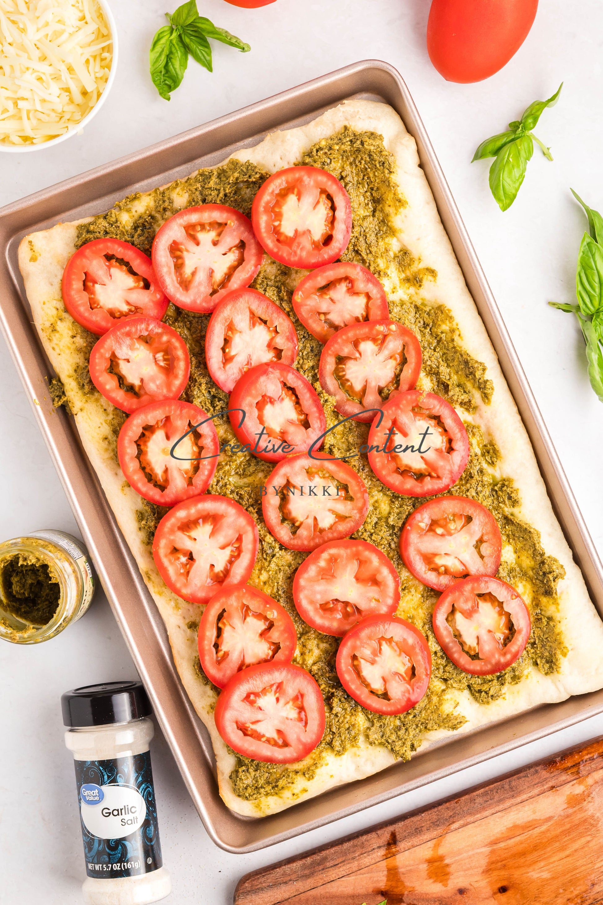 - Ingredients: refrigerated pizza crust, pesto, tomatoes, shredded mozzarella, garlic salt, basil