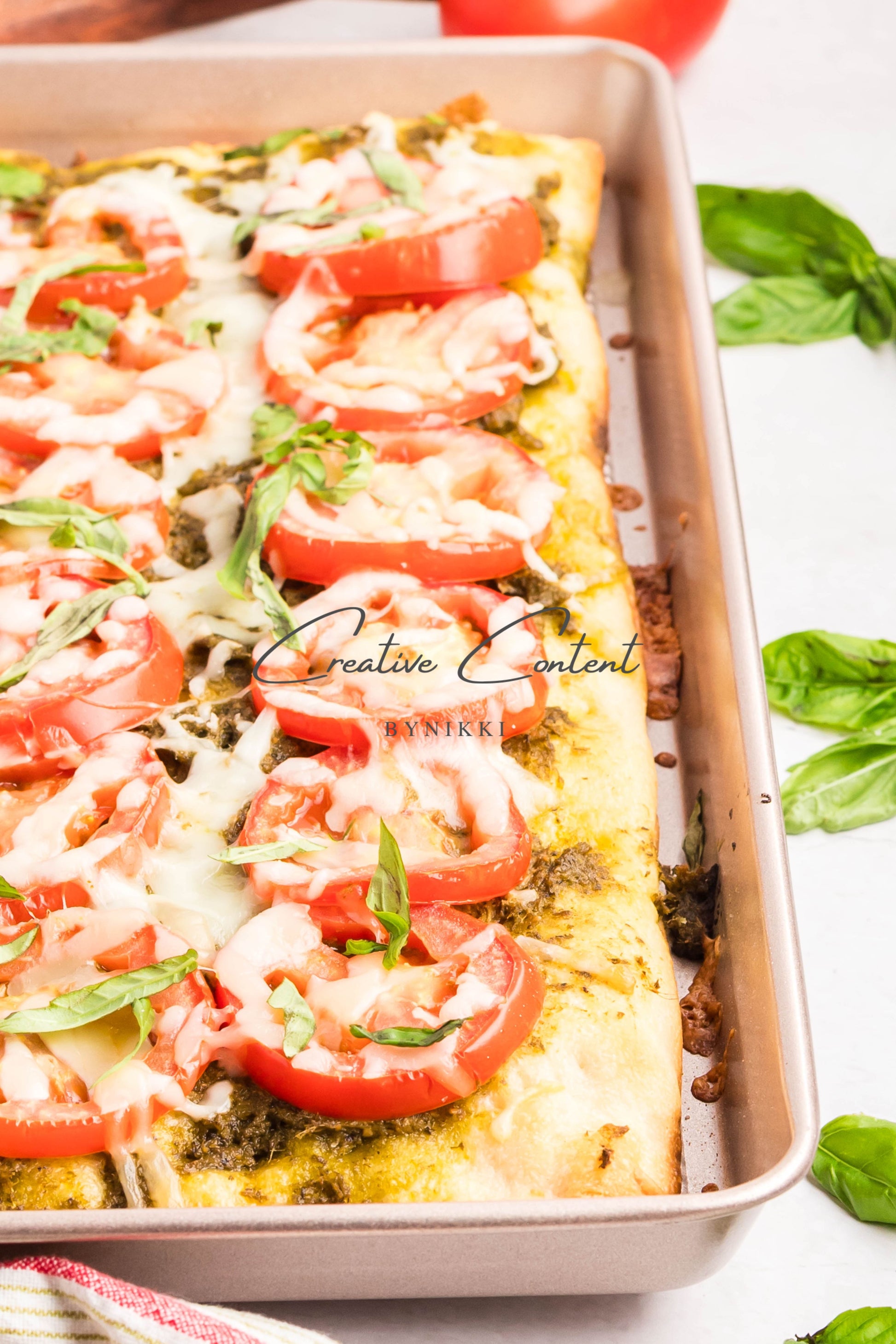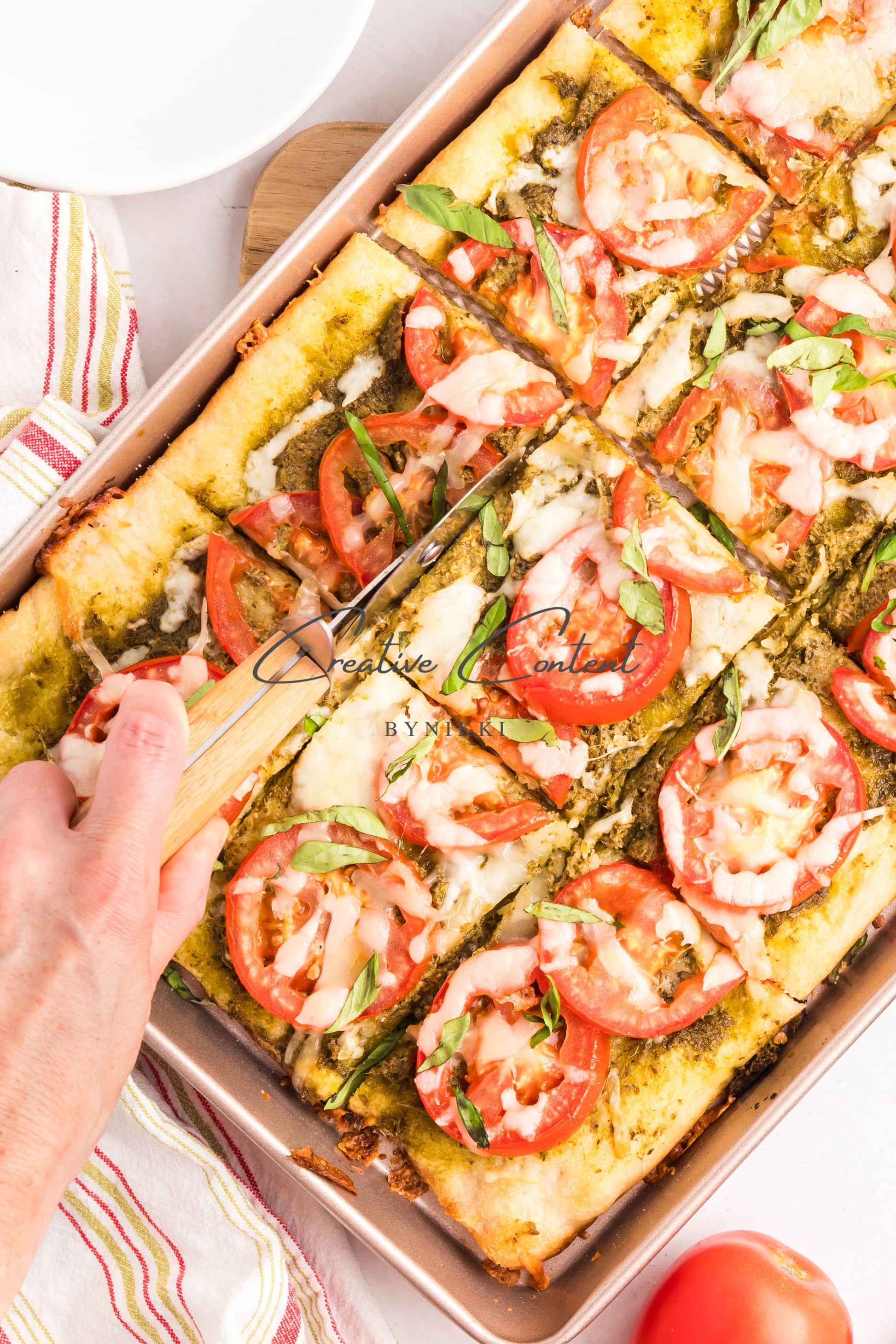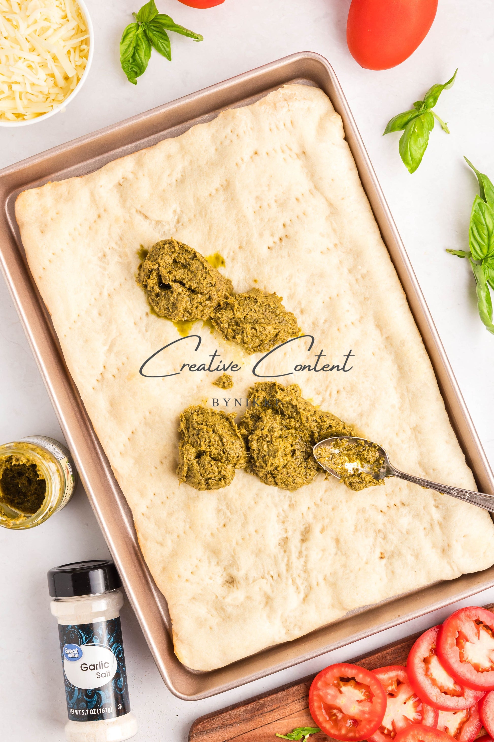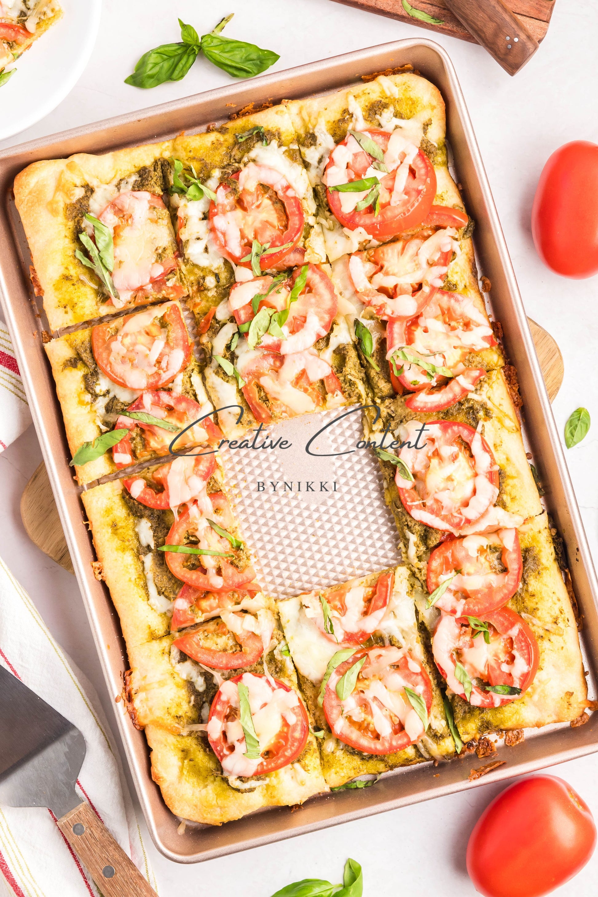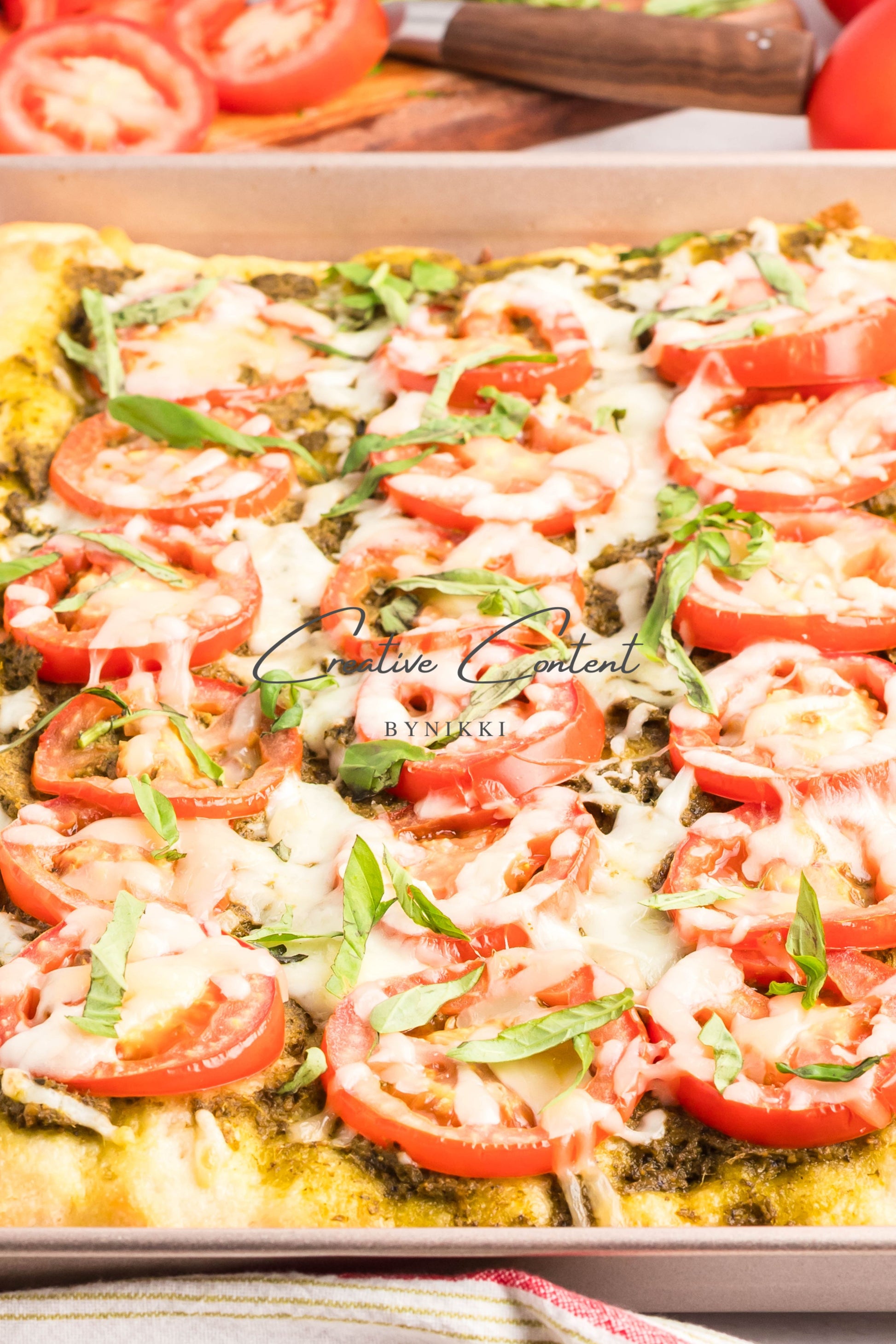 - Ingredients: refrigerated pizza crust, pesto, tomatoes, shredded mozzarella, garlic salt, basil