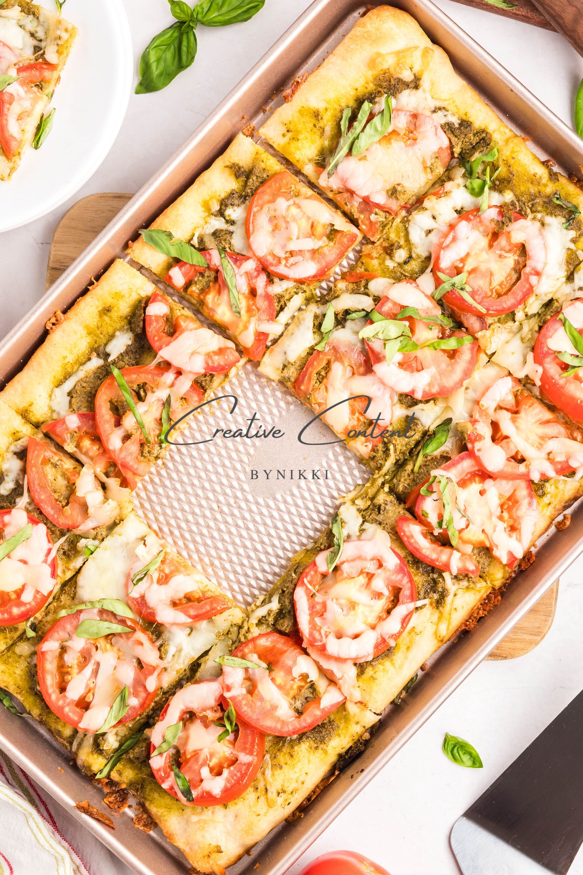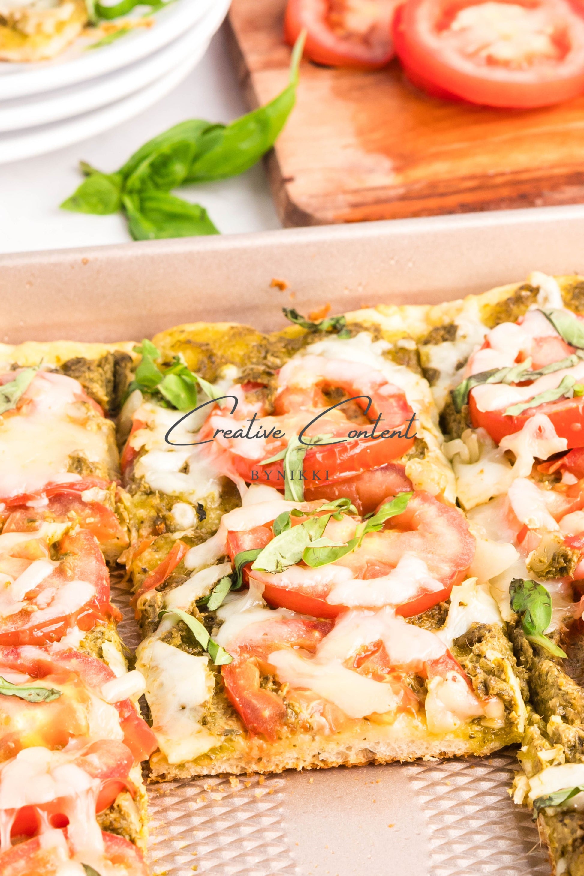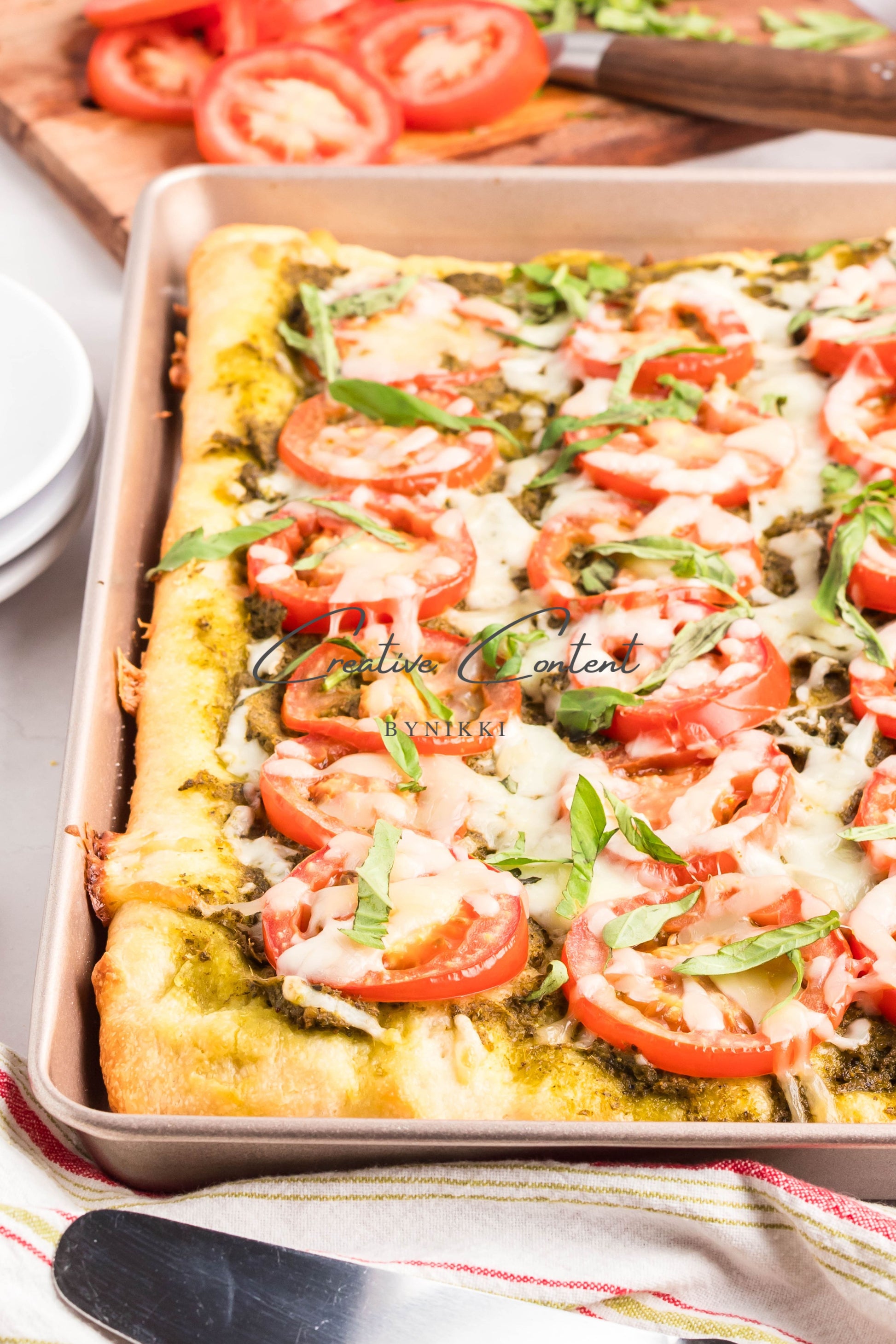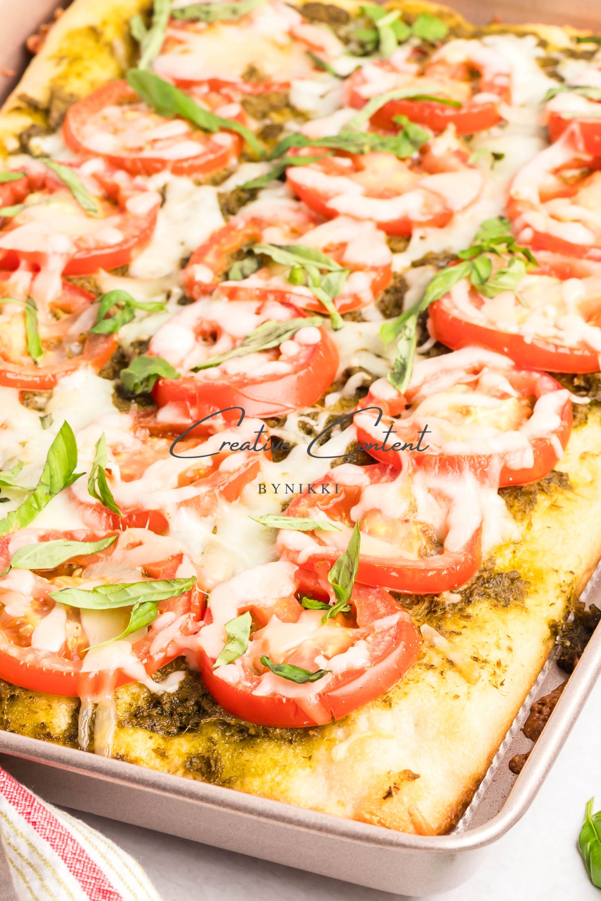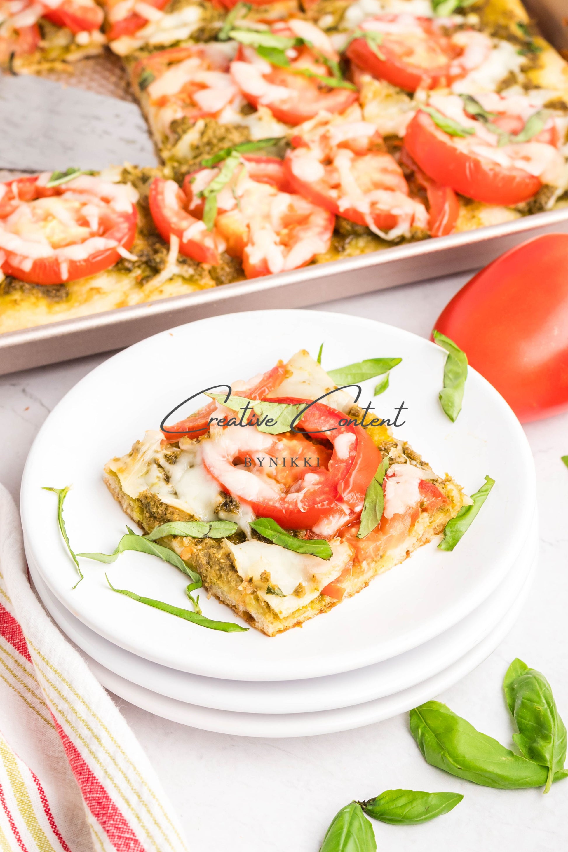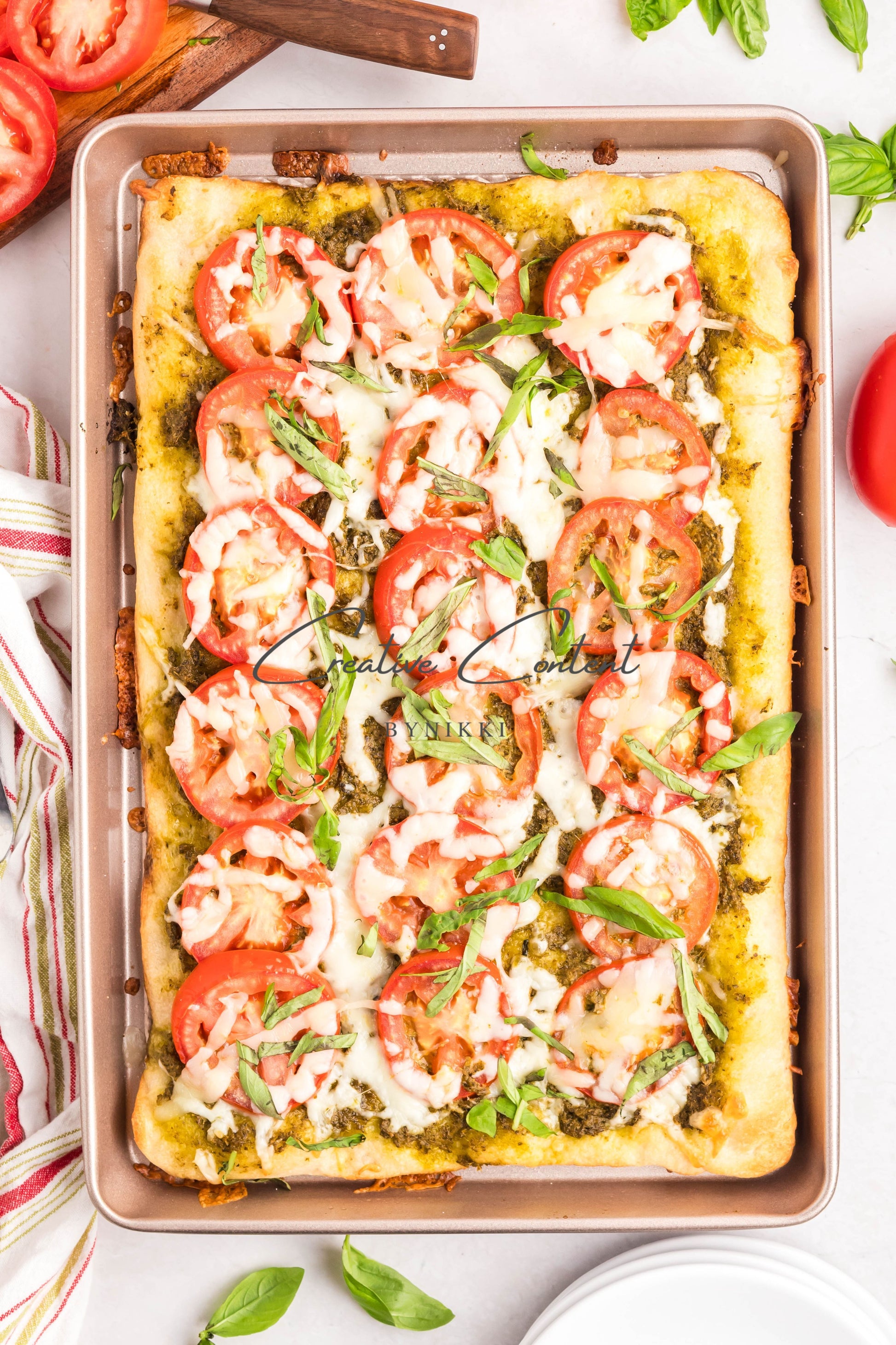 - Ingredients: refrigerated pizza crust, pesto, tomatoes, shredded mozzarella, garlic salt, basil