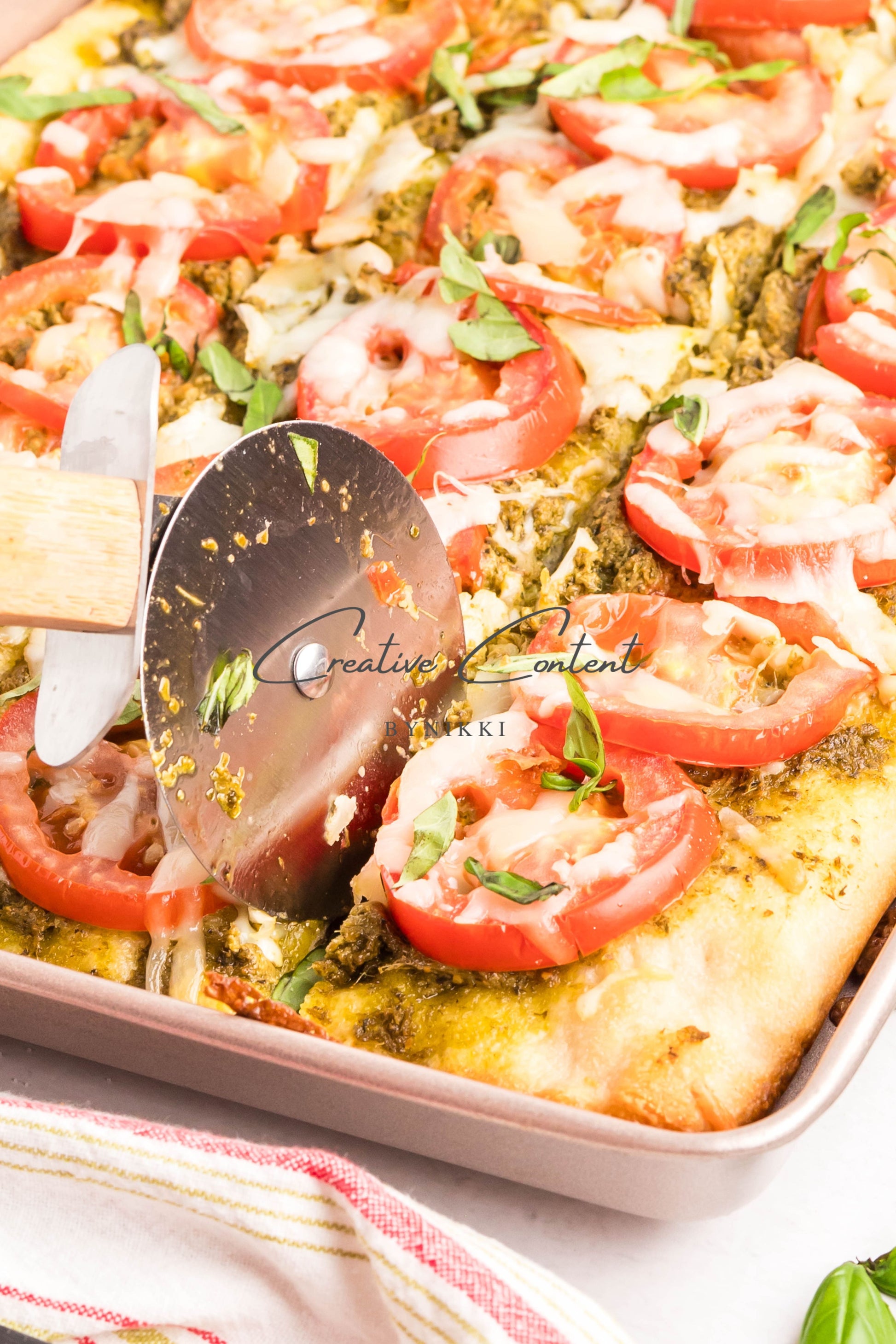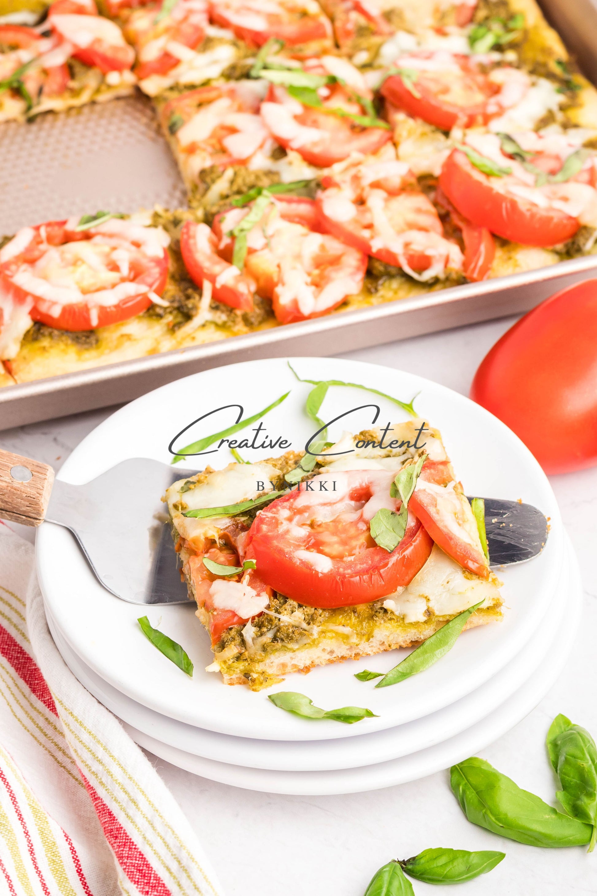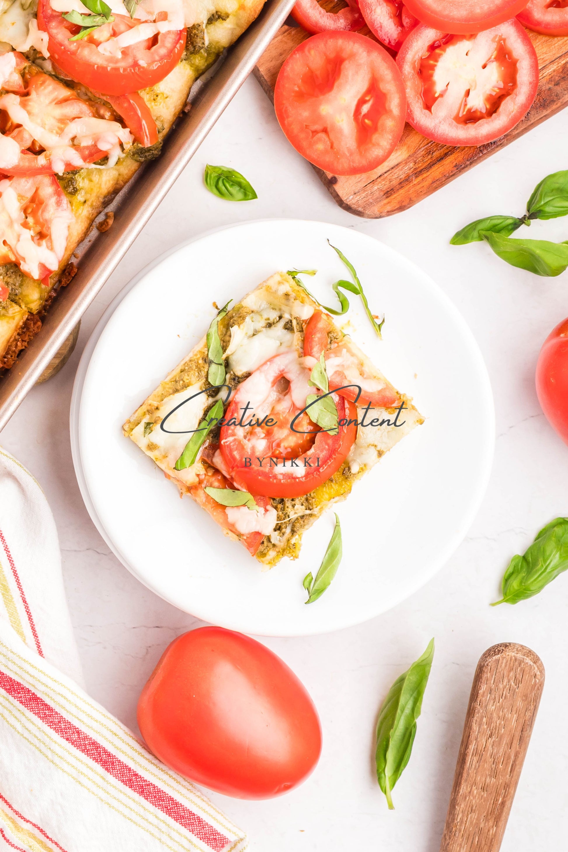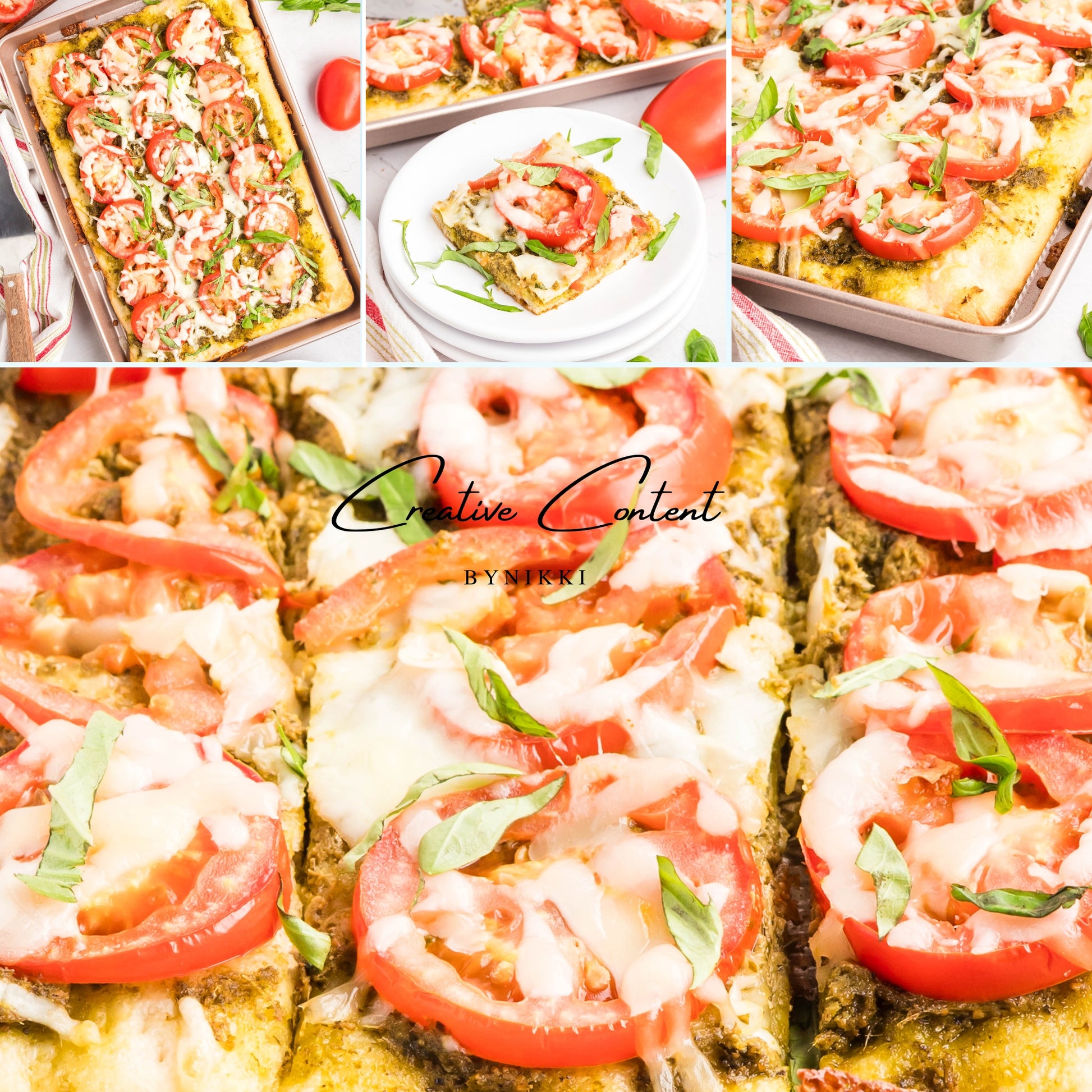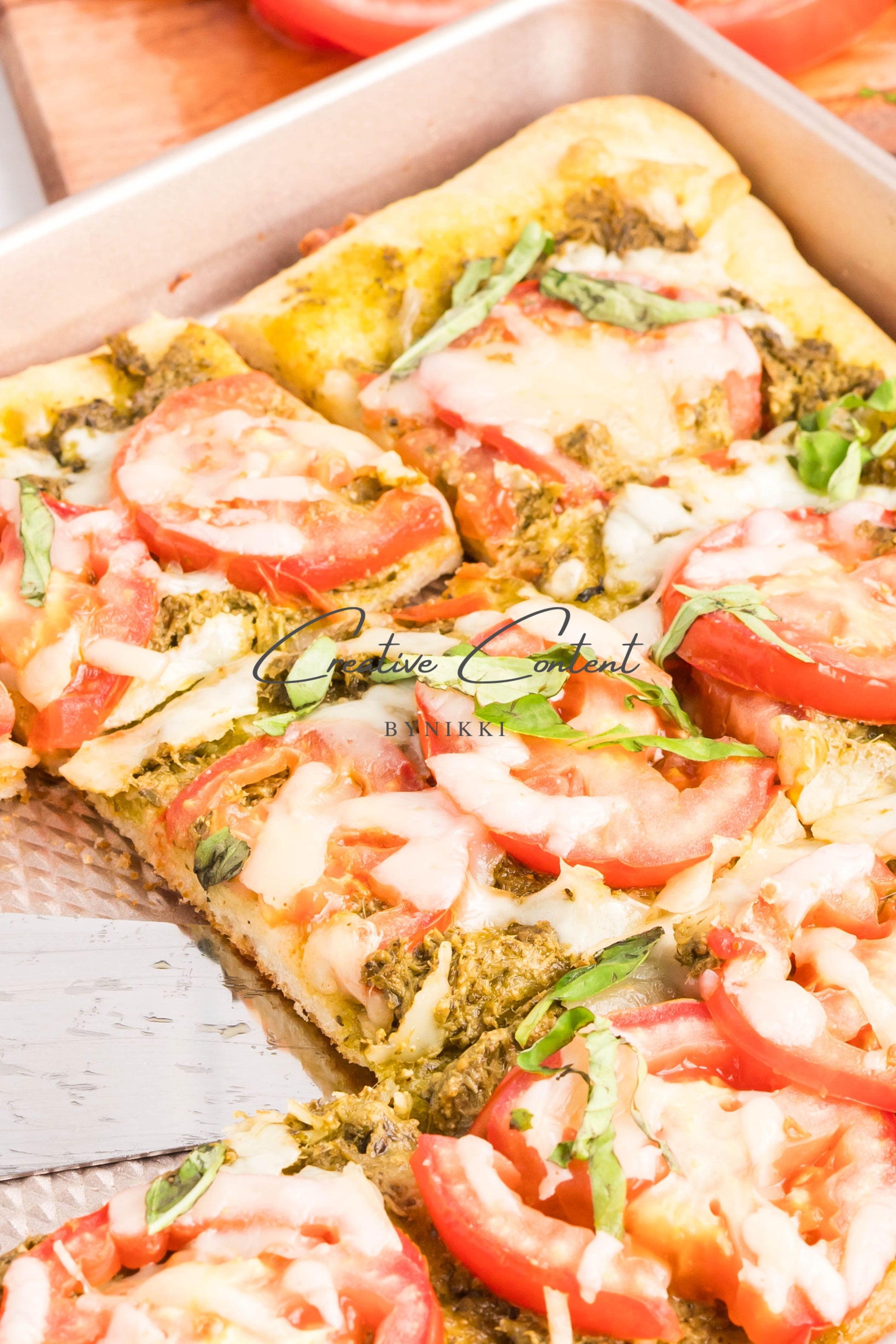 - Ingredients: refrigerated pizza crust, pesto, tomatoes, shredded mozzarella, garlic salt, basil