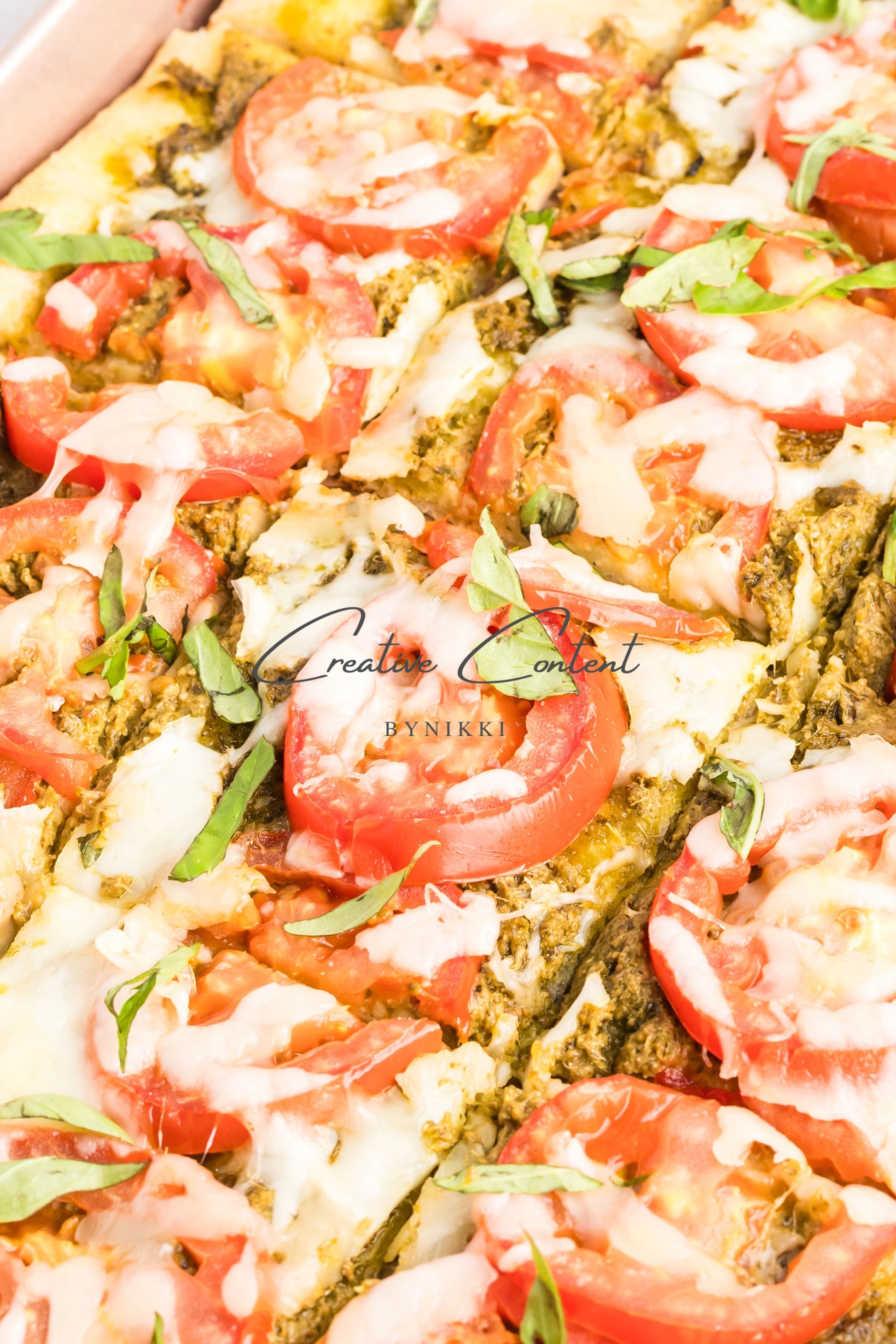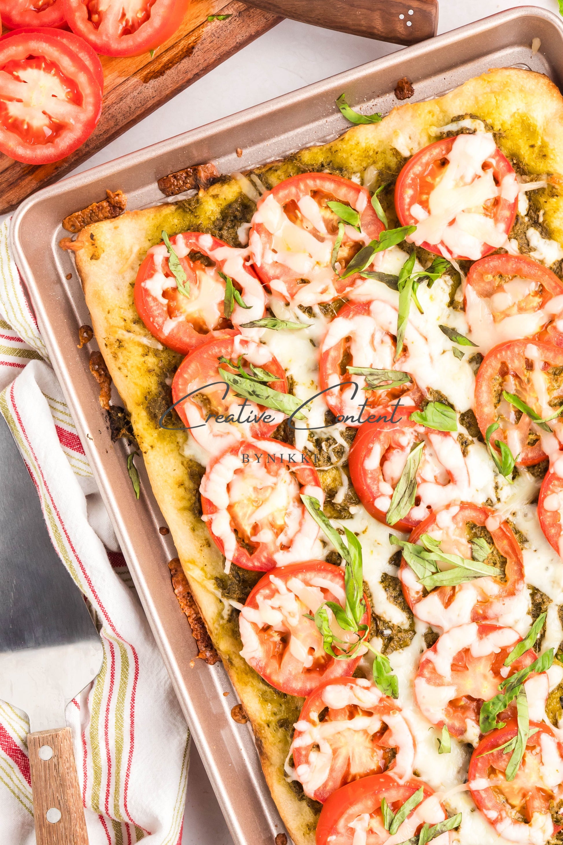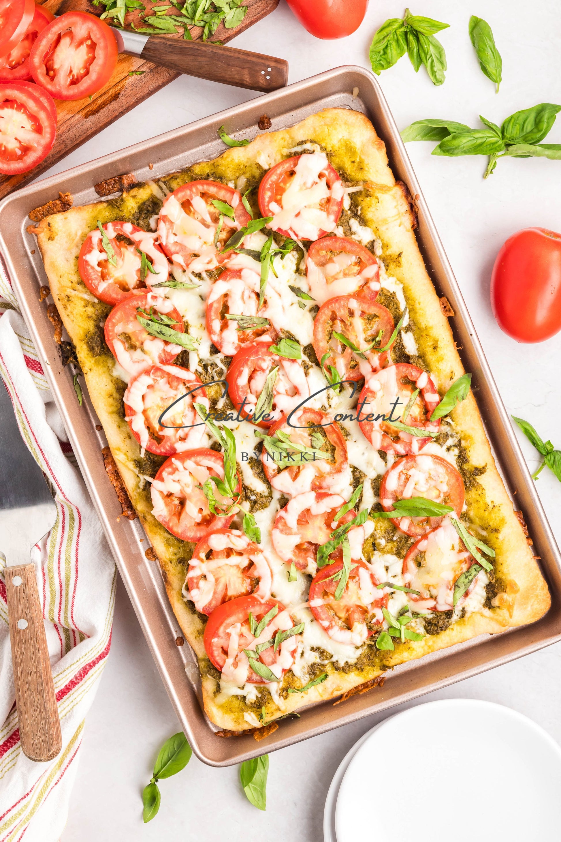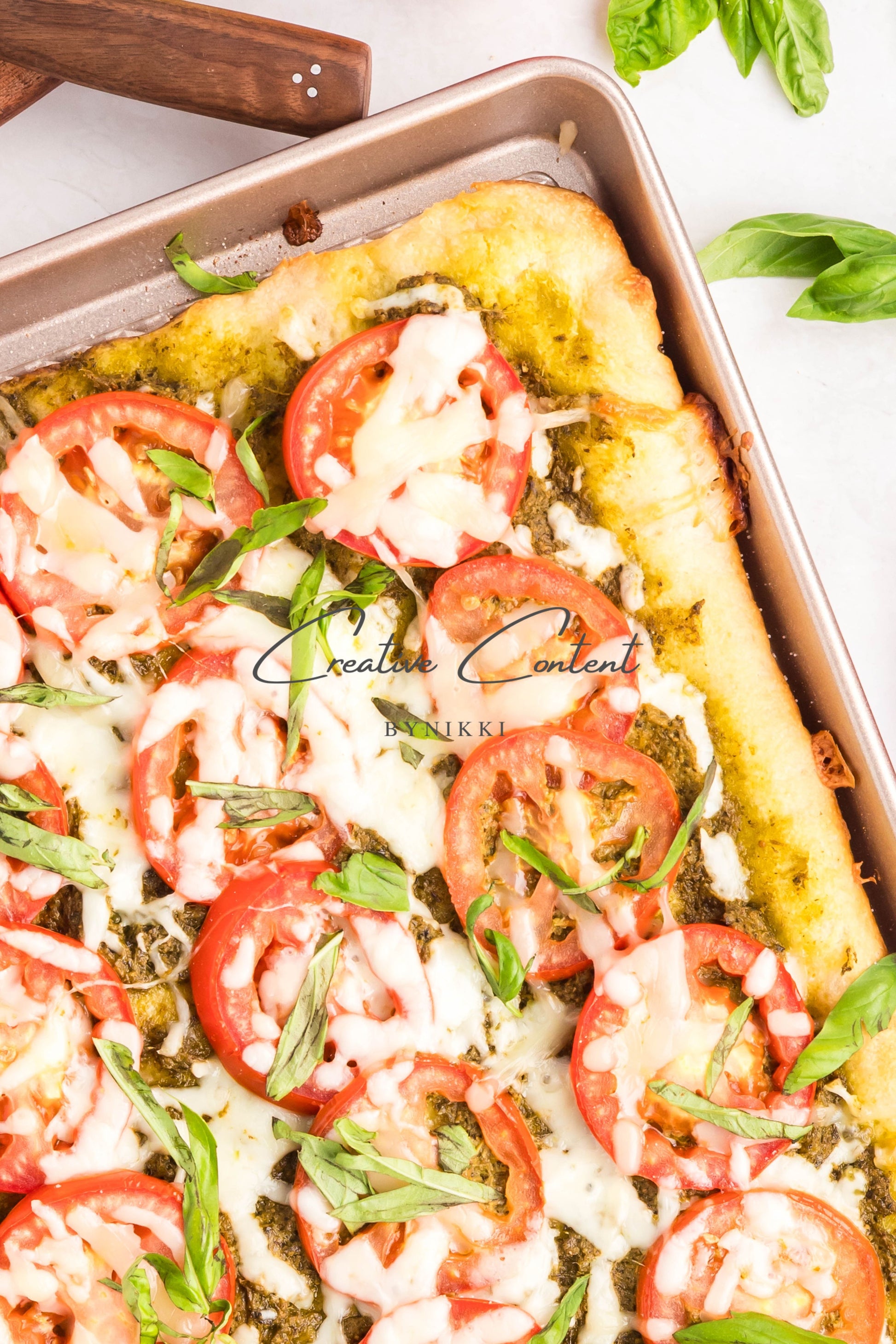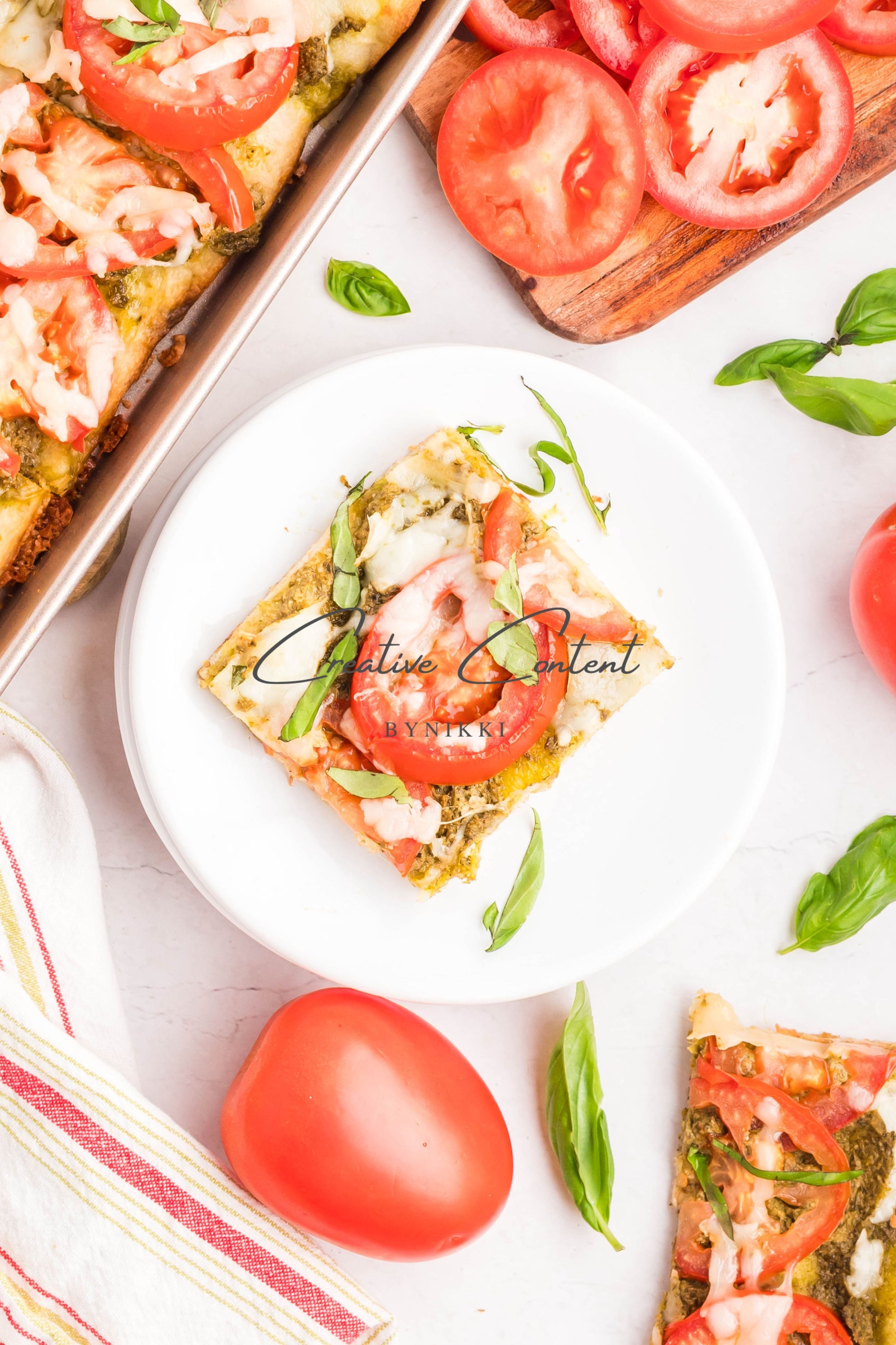 - Ingredients: refrigerated pizza crust, pesto, tomatoes, shredded mozzarella, garlic salt, basil