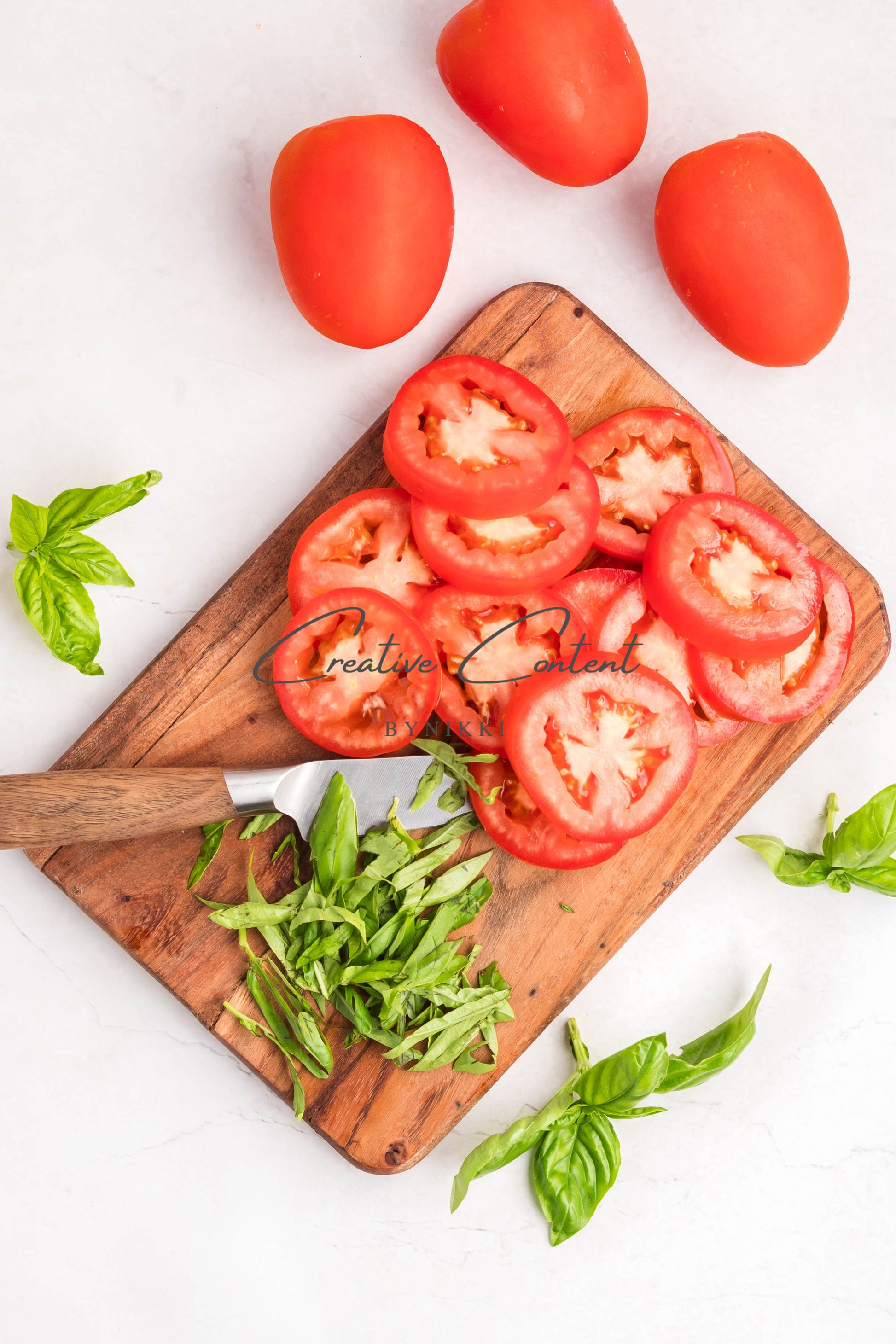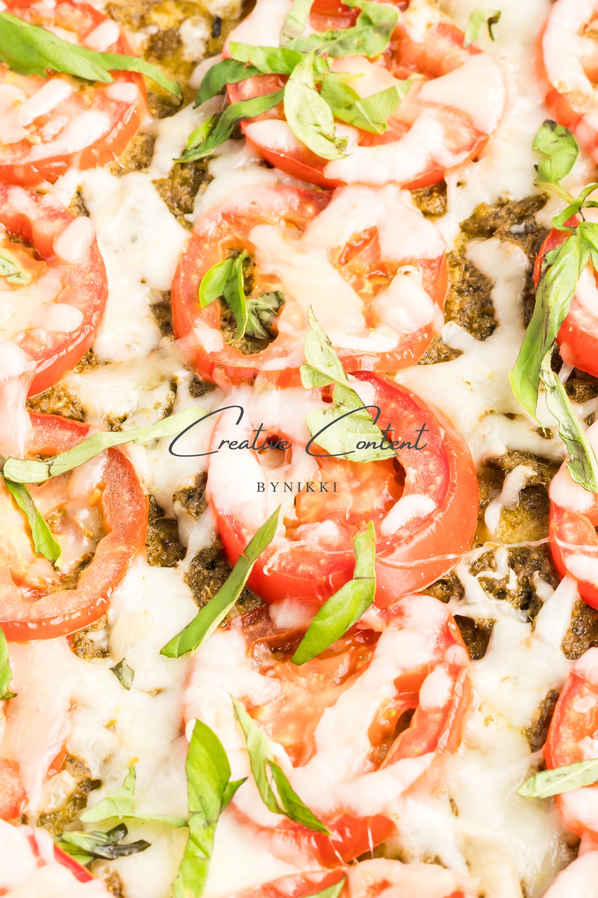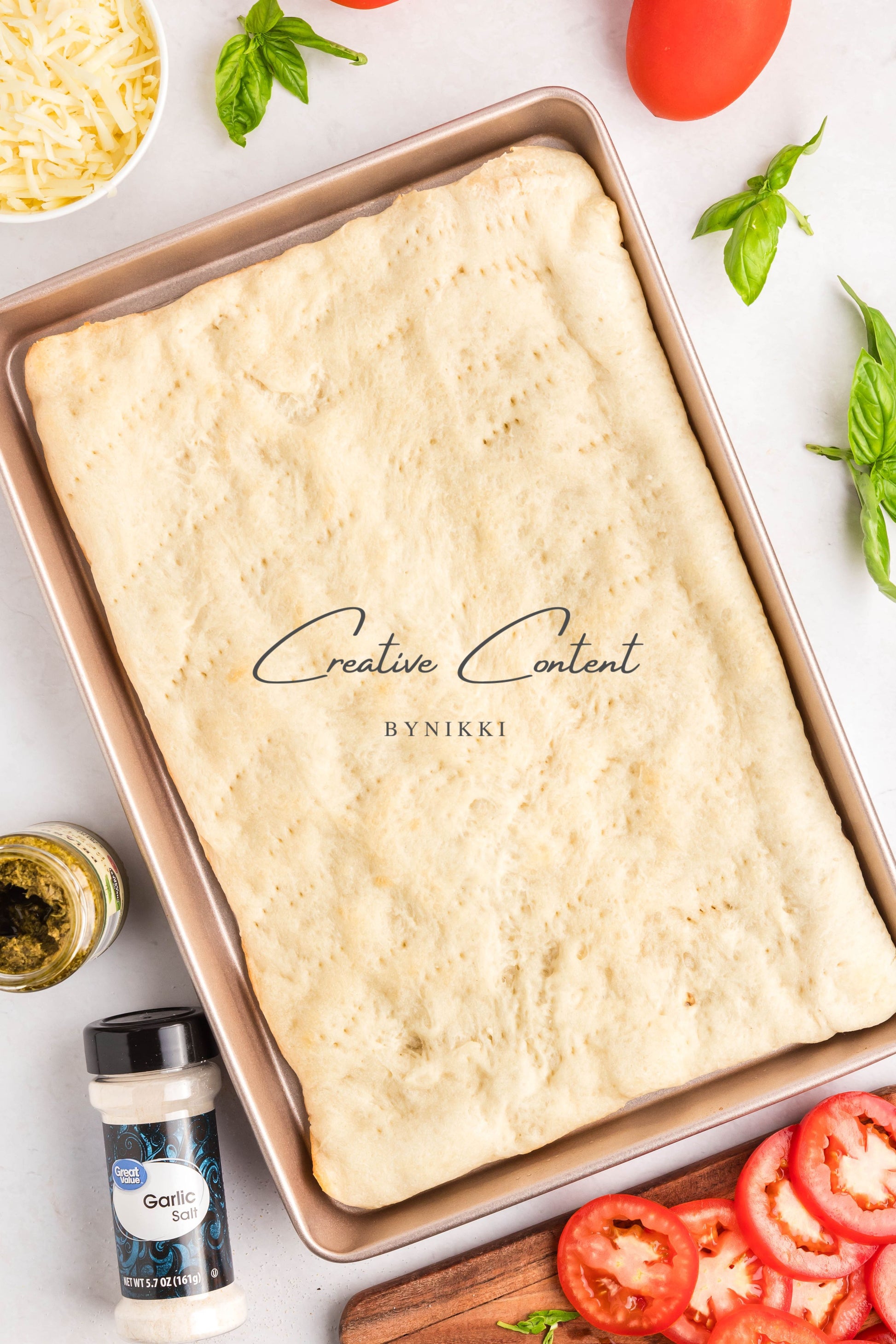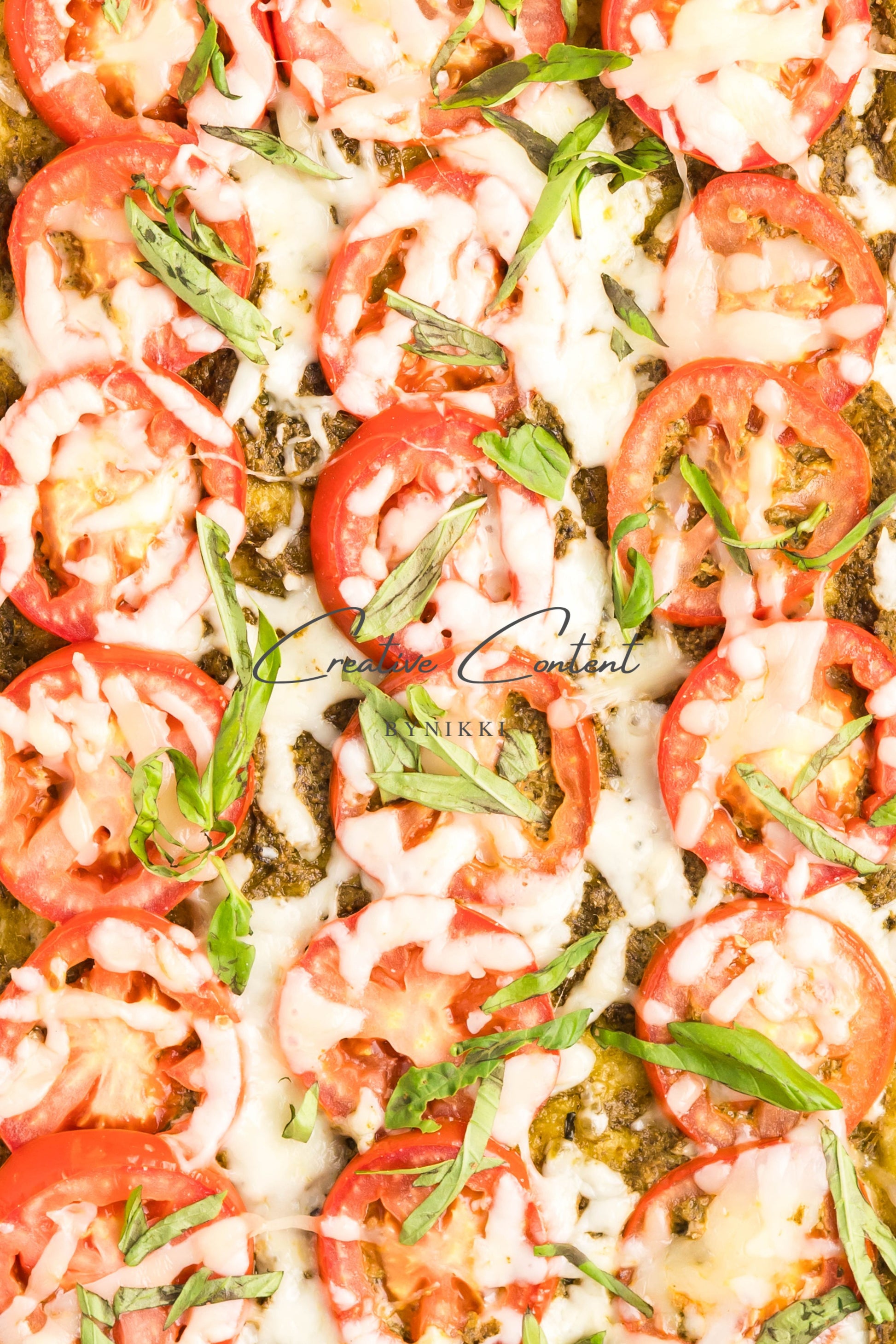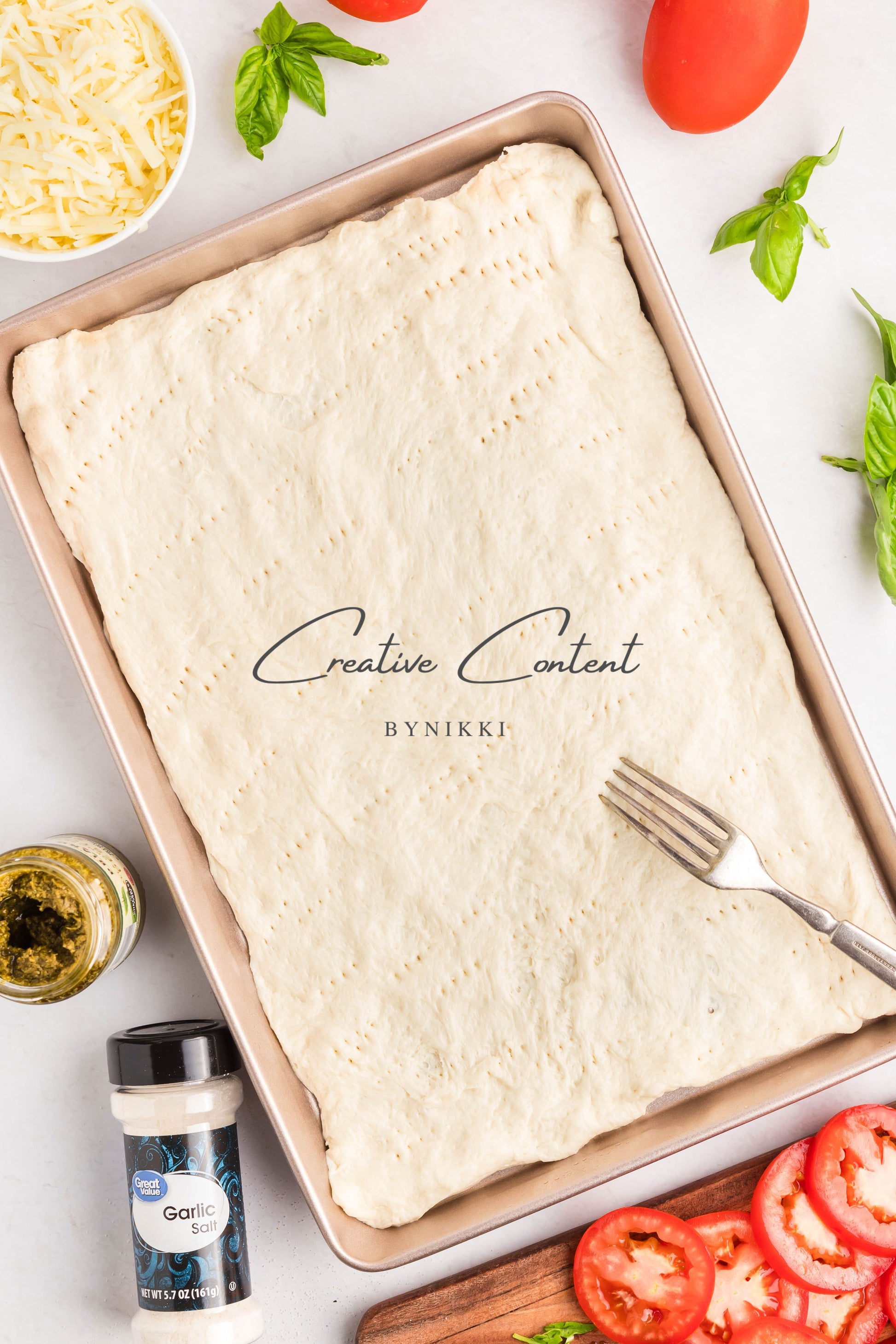 - Ingredients: refrigerated pizza crust, pesto, tomatoes, shredded mozzarella, garlic salt, basil