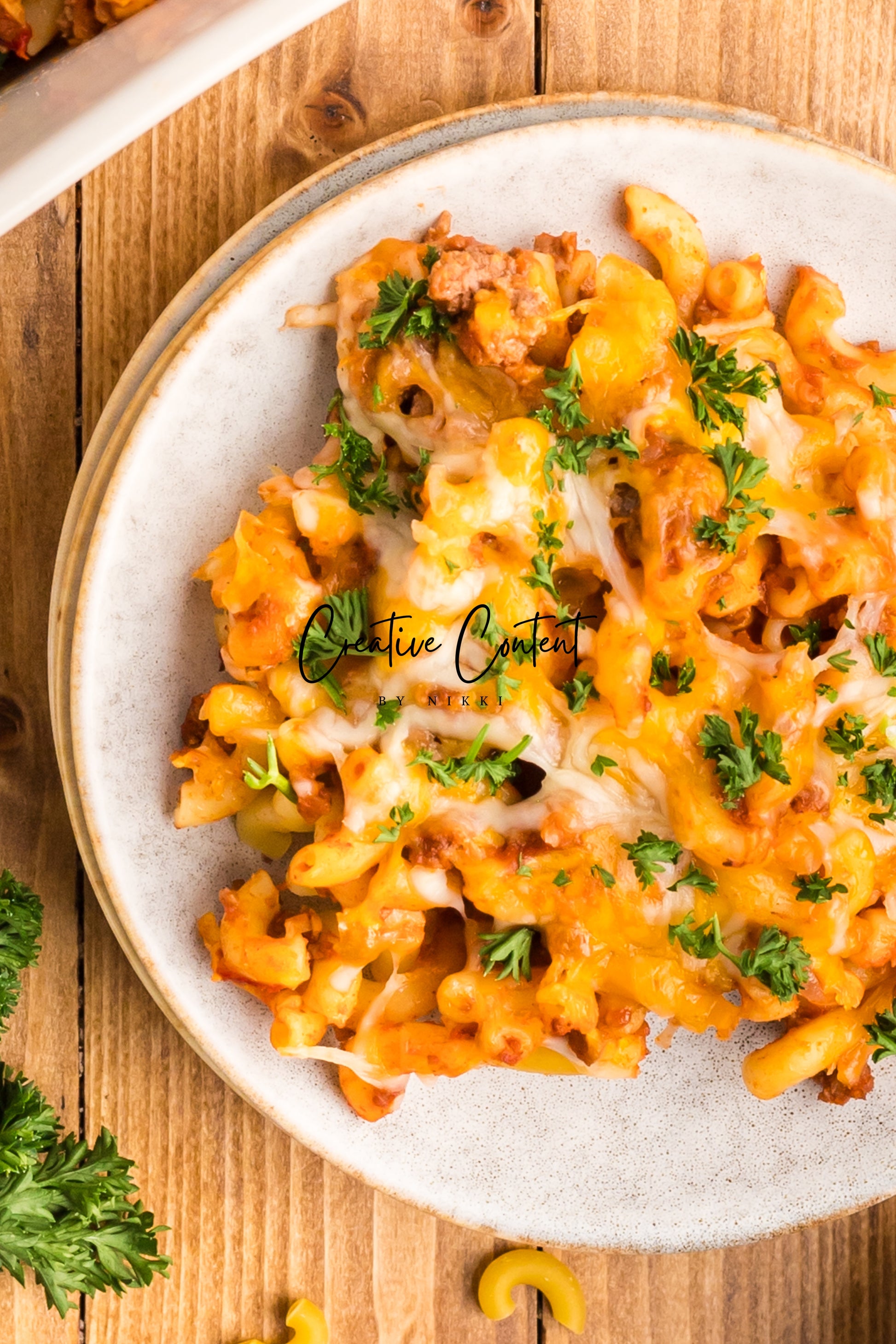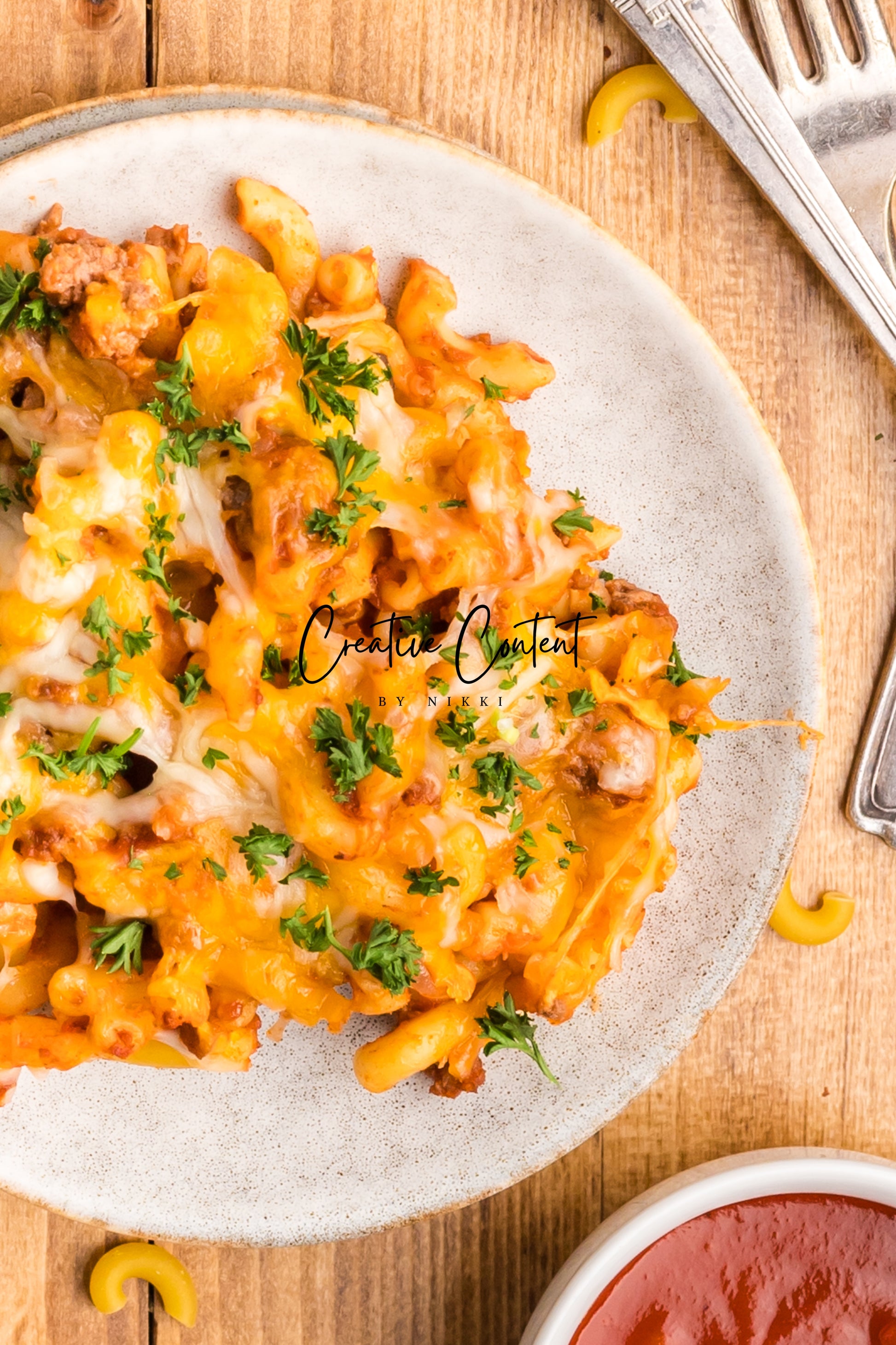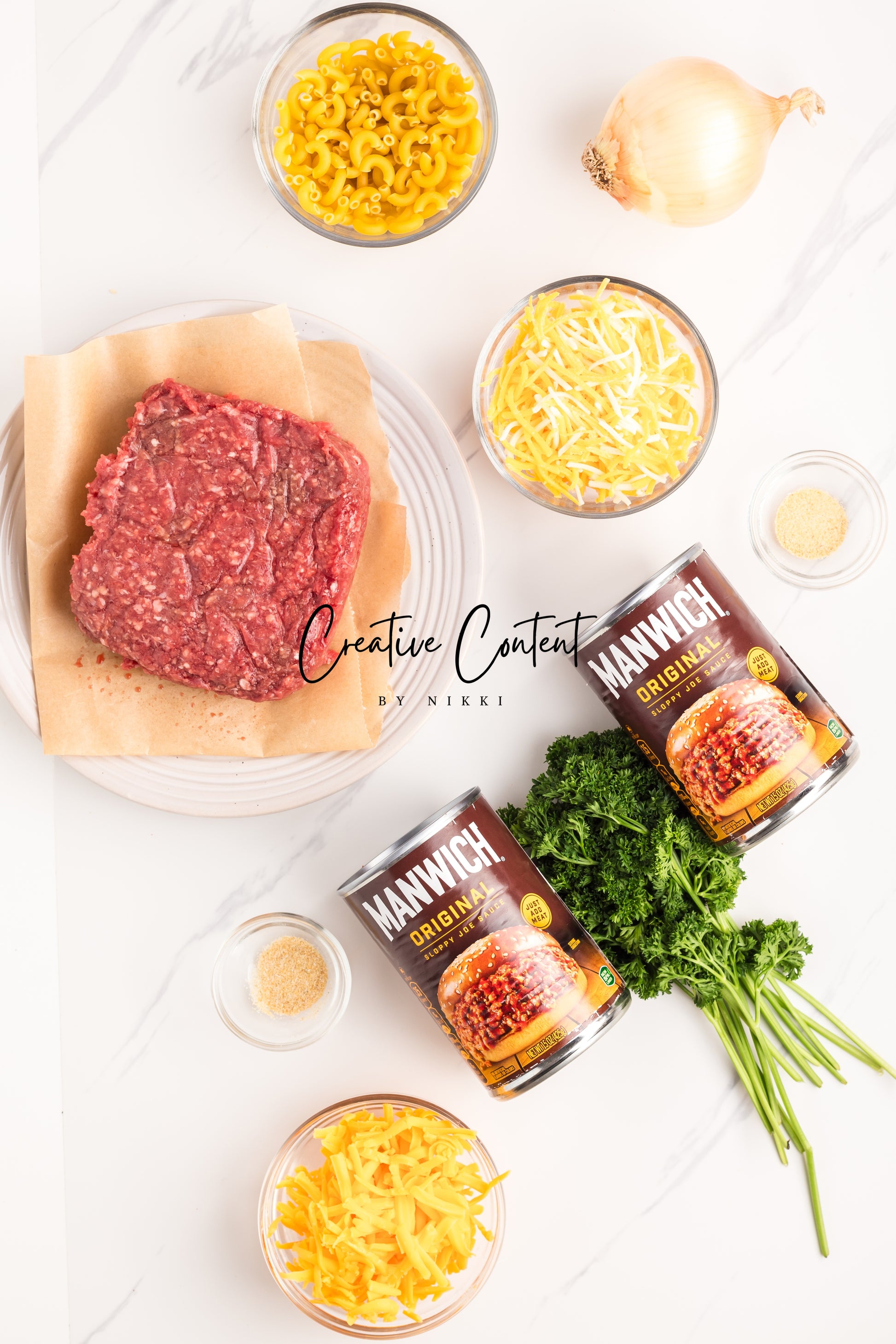- Featured Ingredients; ground beef, yellow onion, garlic cloves, Manwich, pasta, cheese, and parsley.