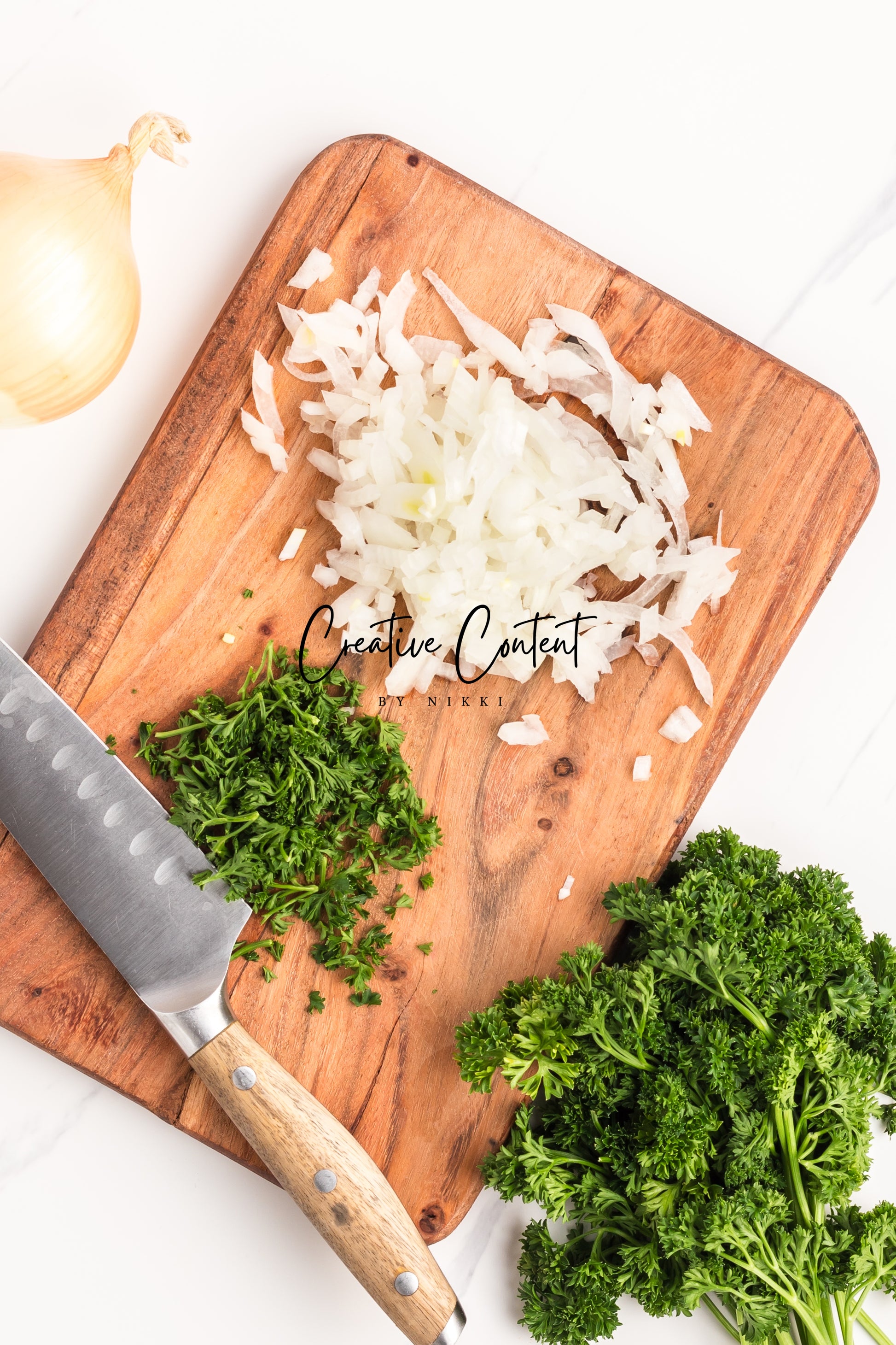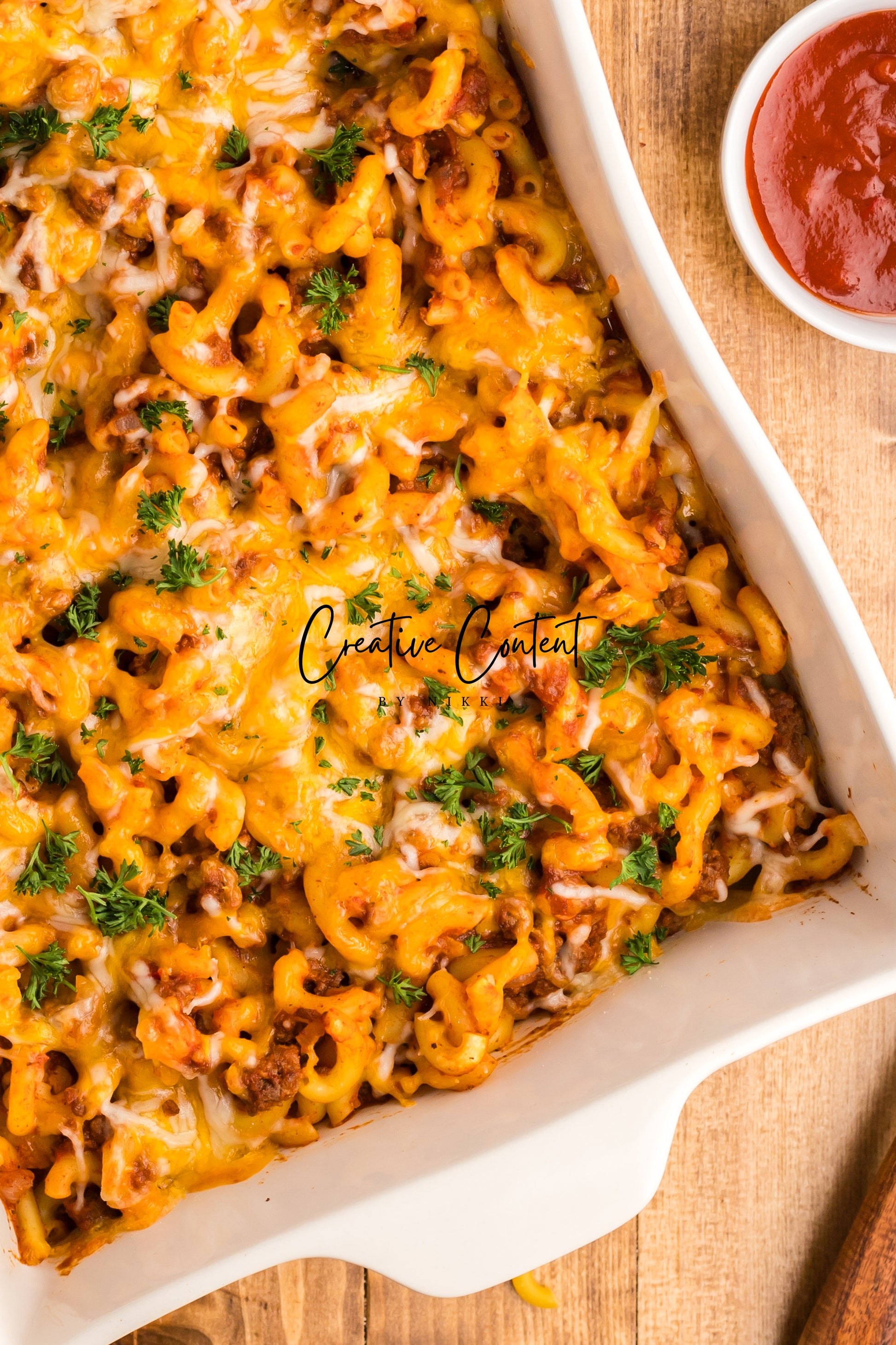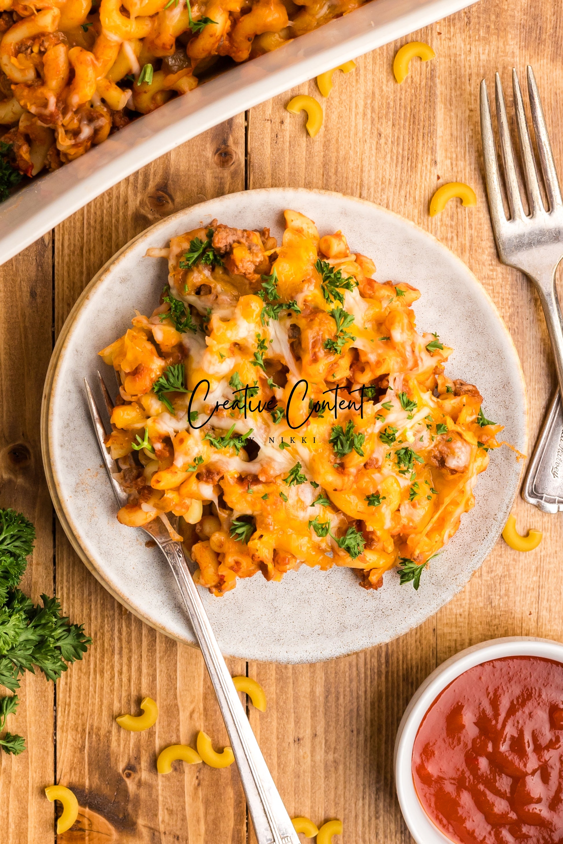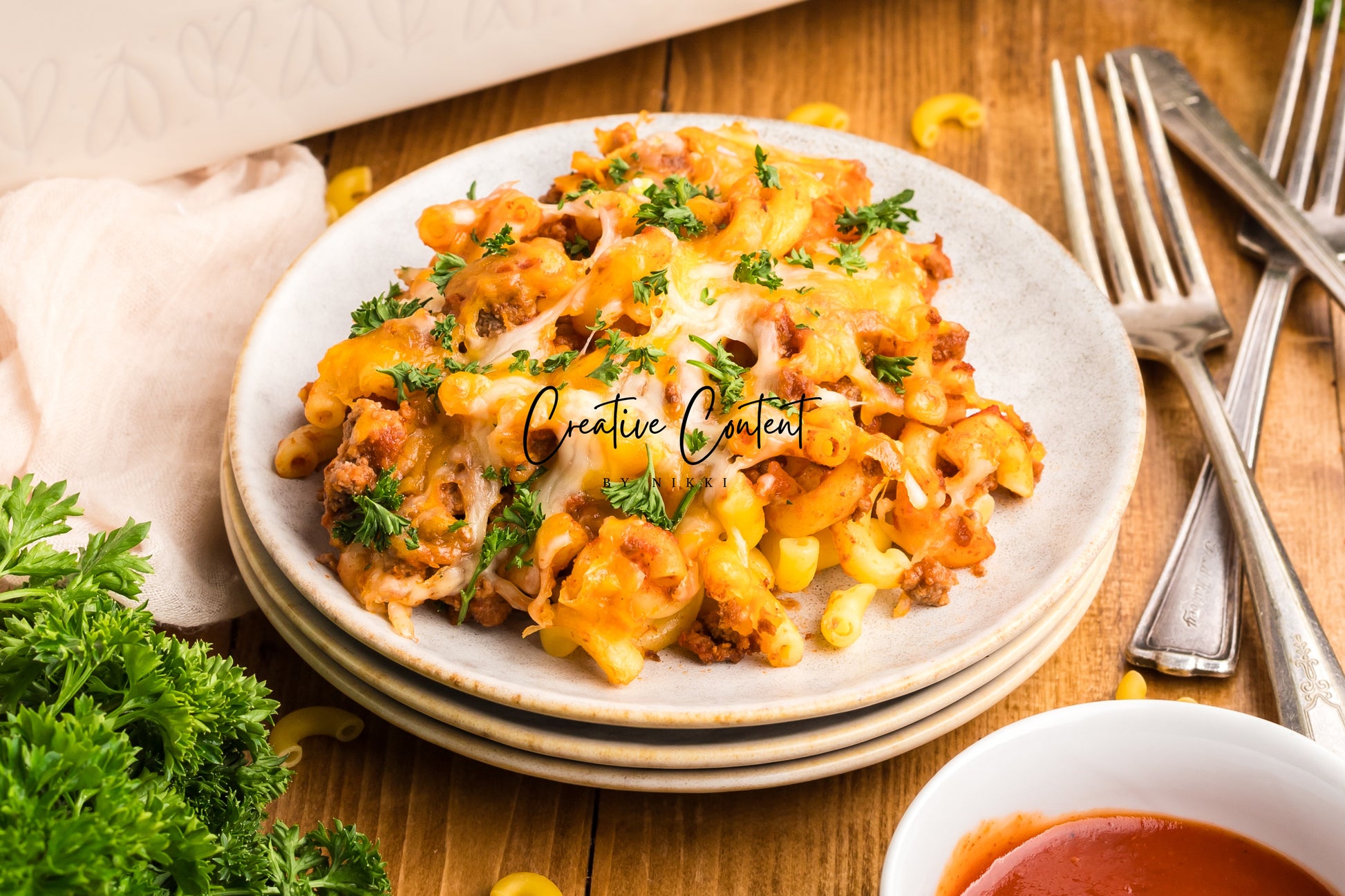 - Featured Ingredients; ground beef, yellow onion, garlic cloves, Manwich, pasta, cheese, and parsley.