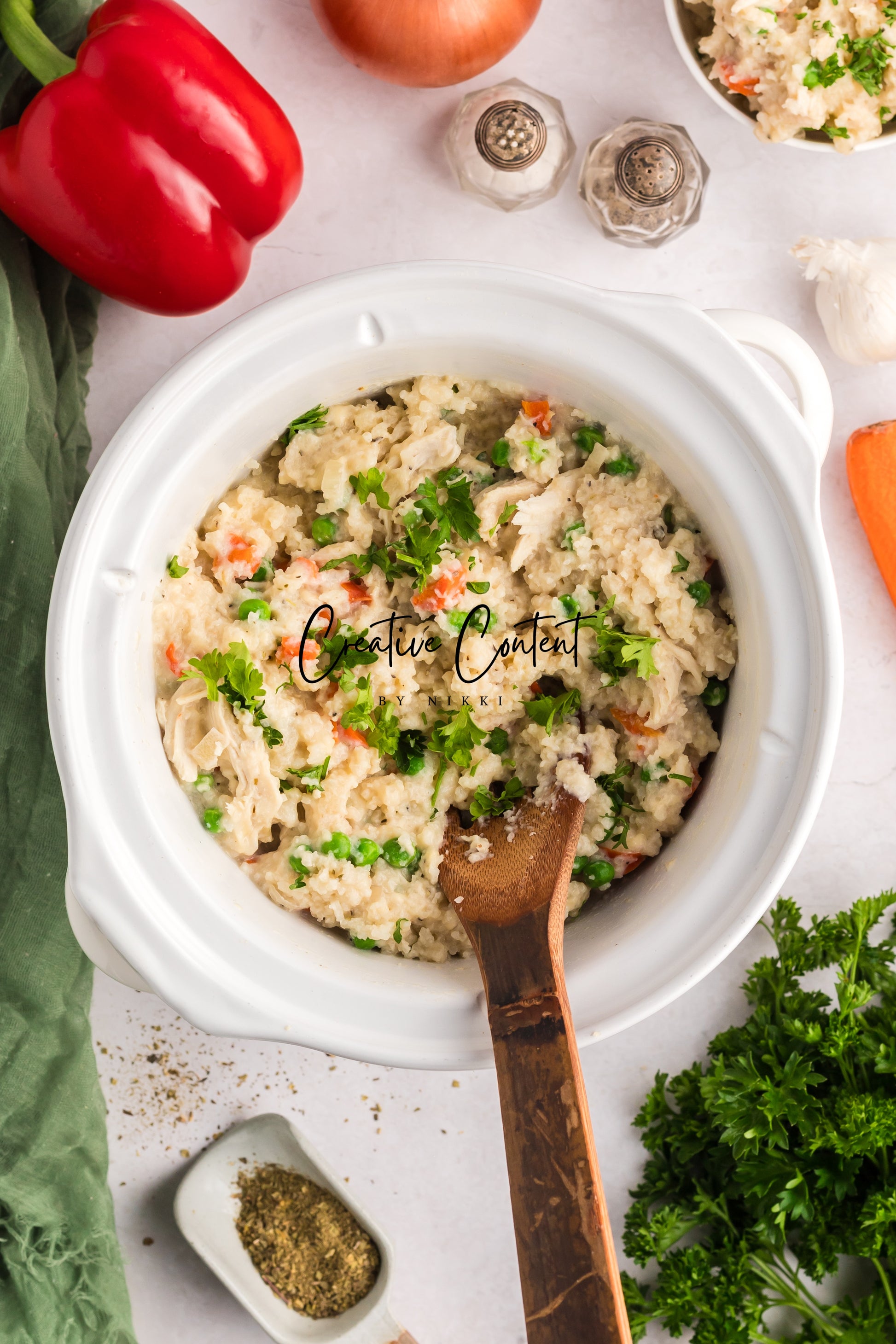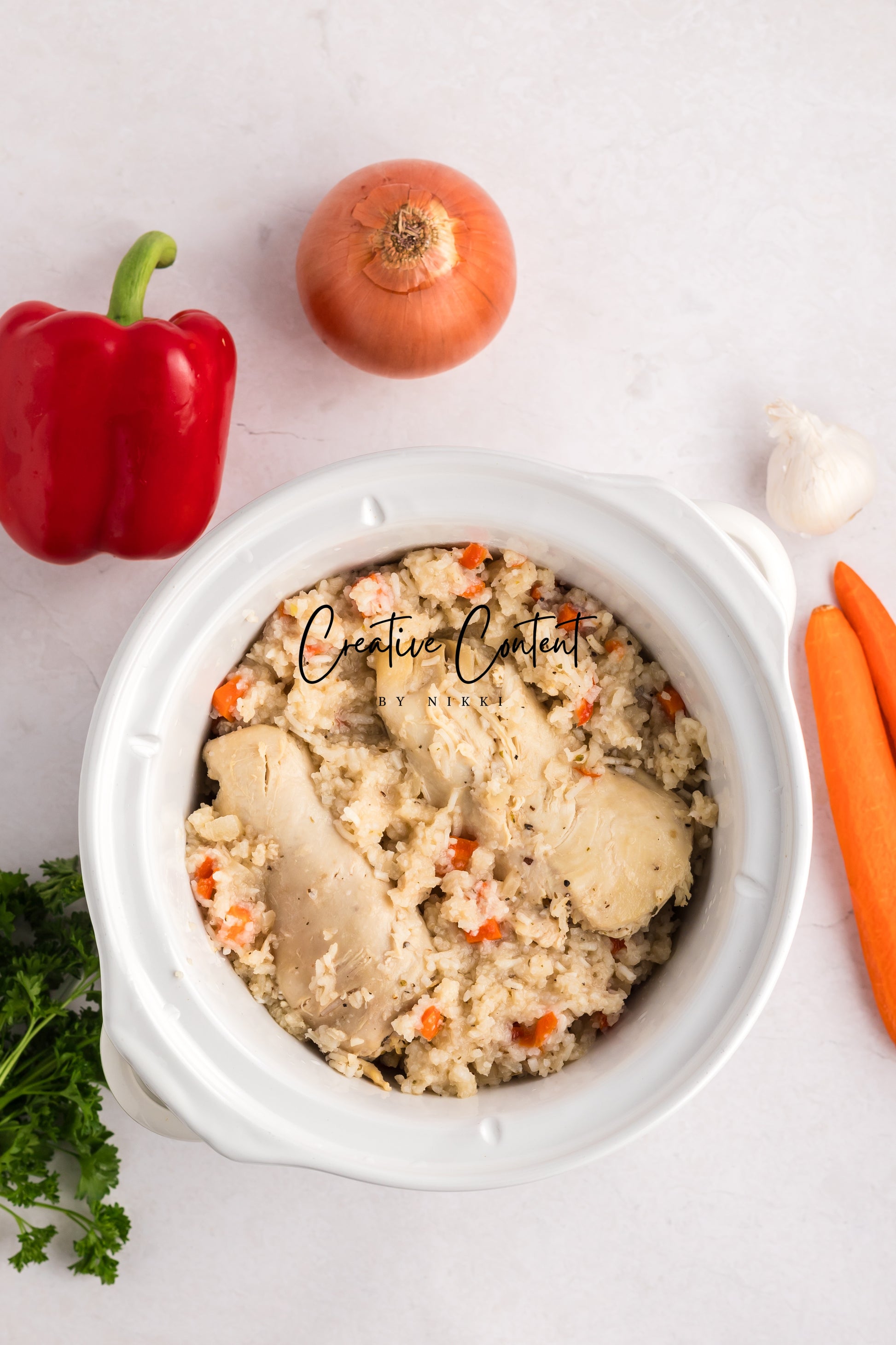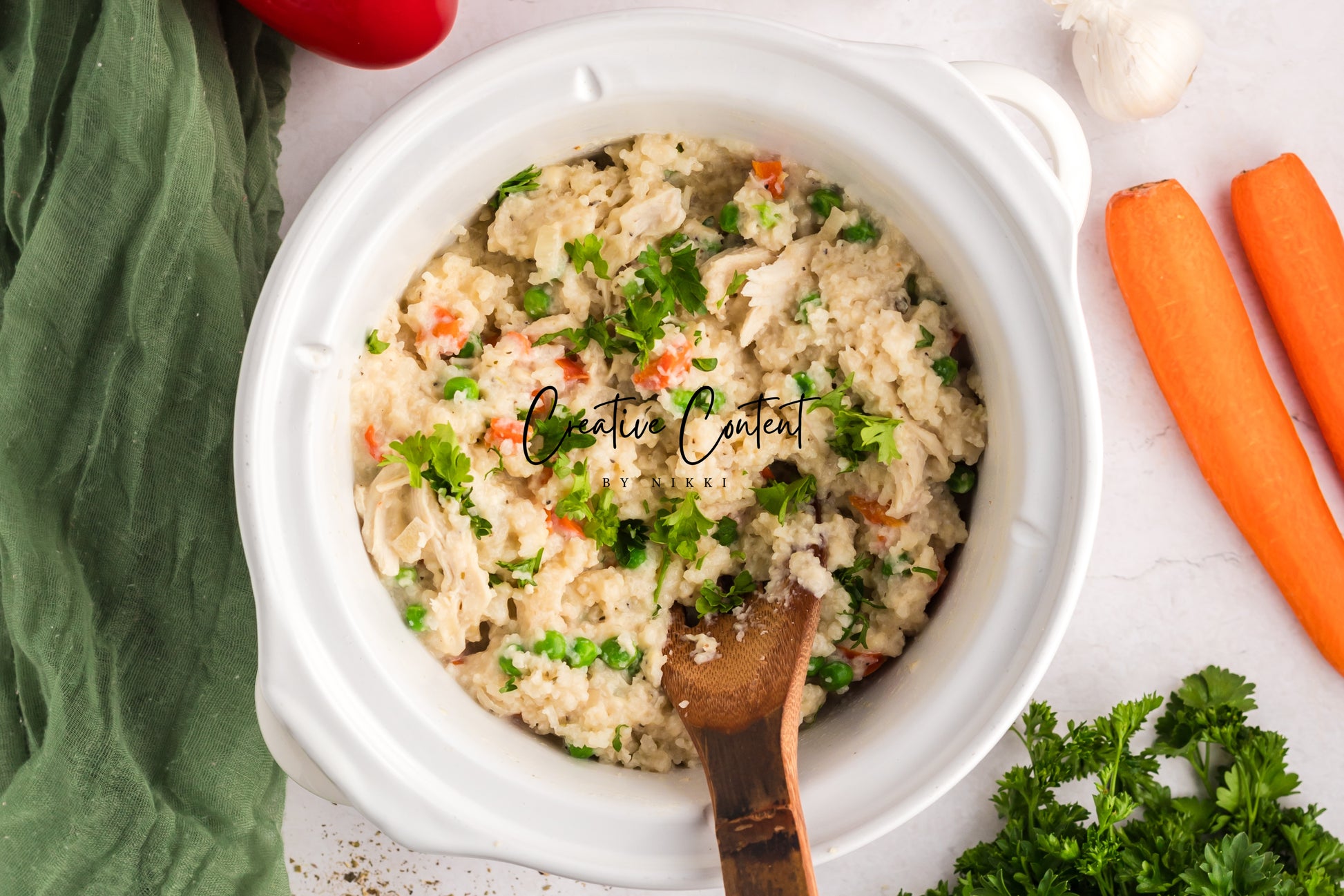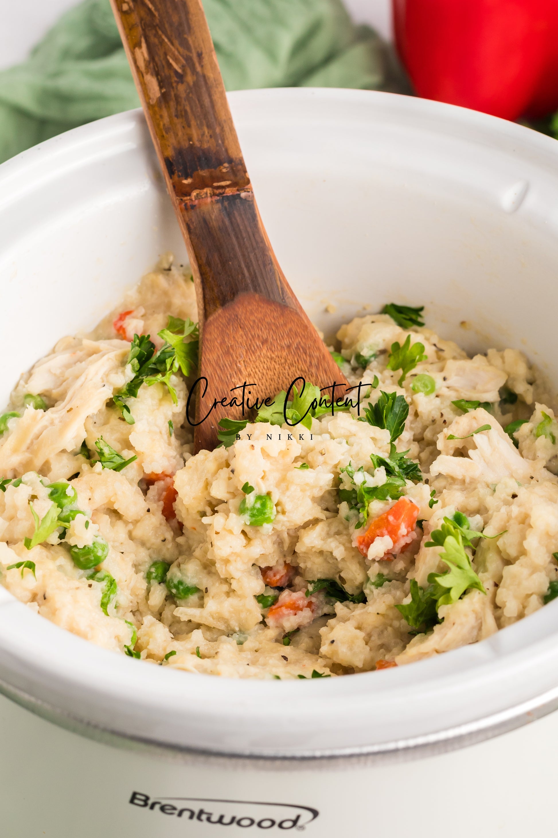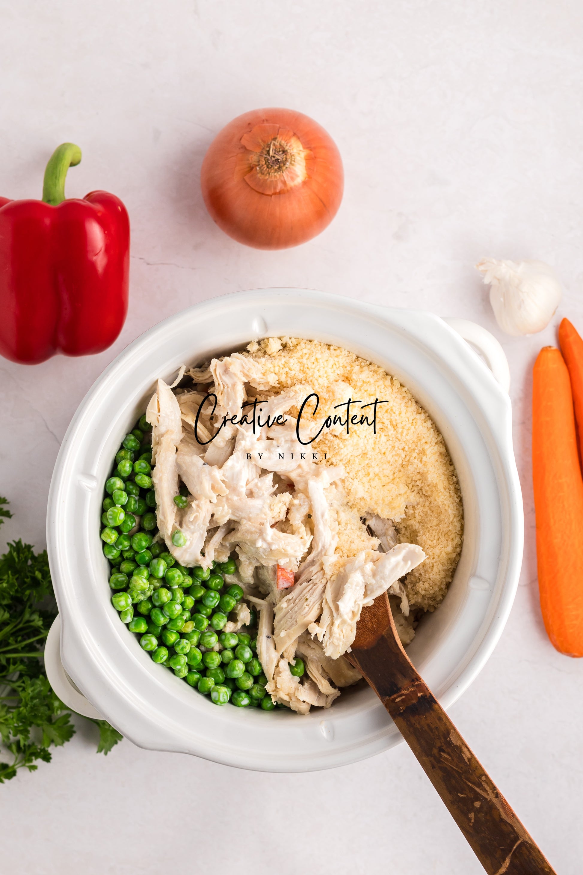 This slow cooker chicken and rice recipe is a hearty dinner when you want something that is full of flavor. The shredded chicken, rice, bell peppers, carrots, and peas make for a great dinner. The parmesan cheese and heavy cream make for a creamy dish that is tasty and delicious.