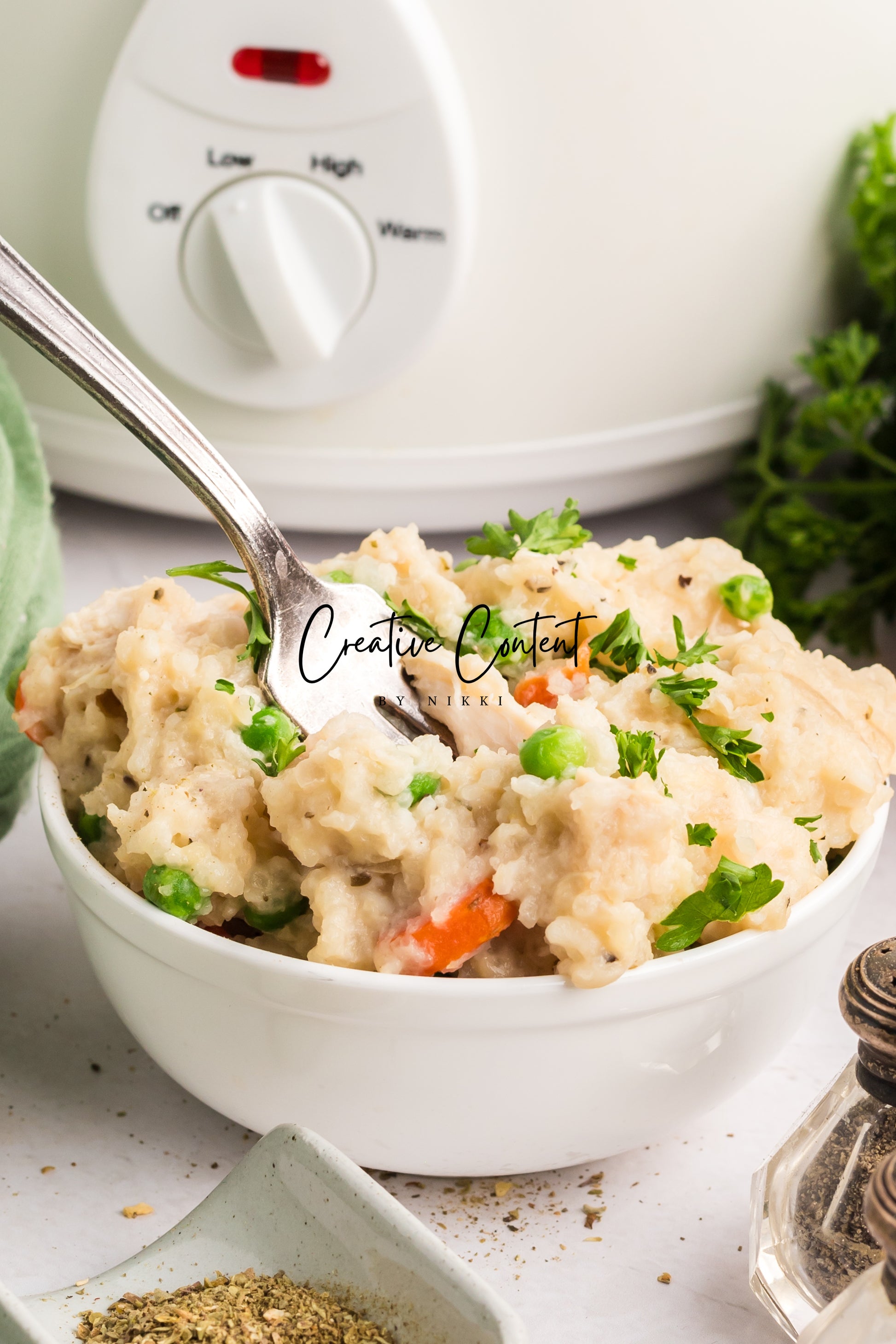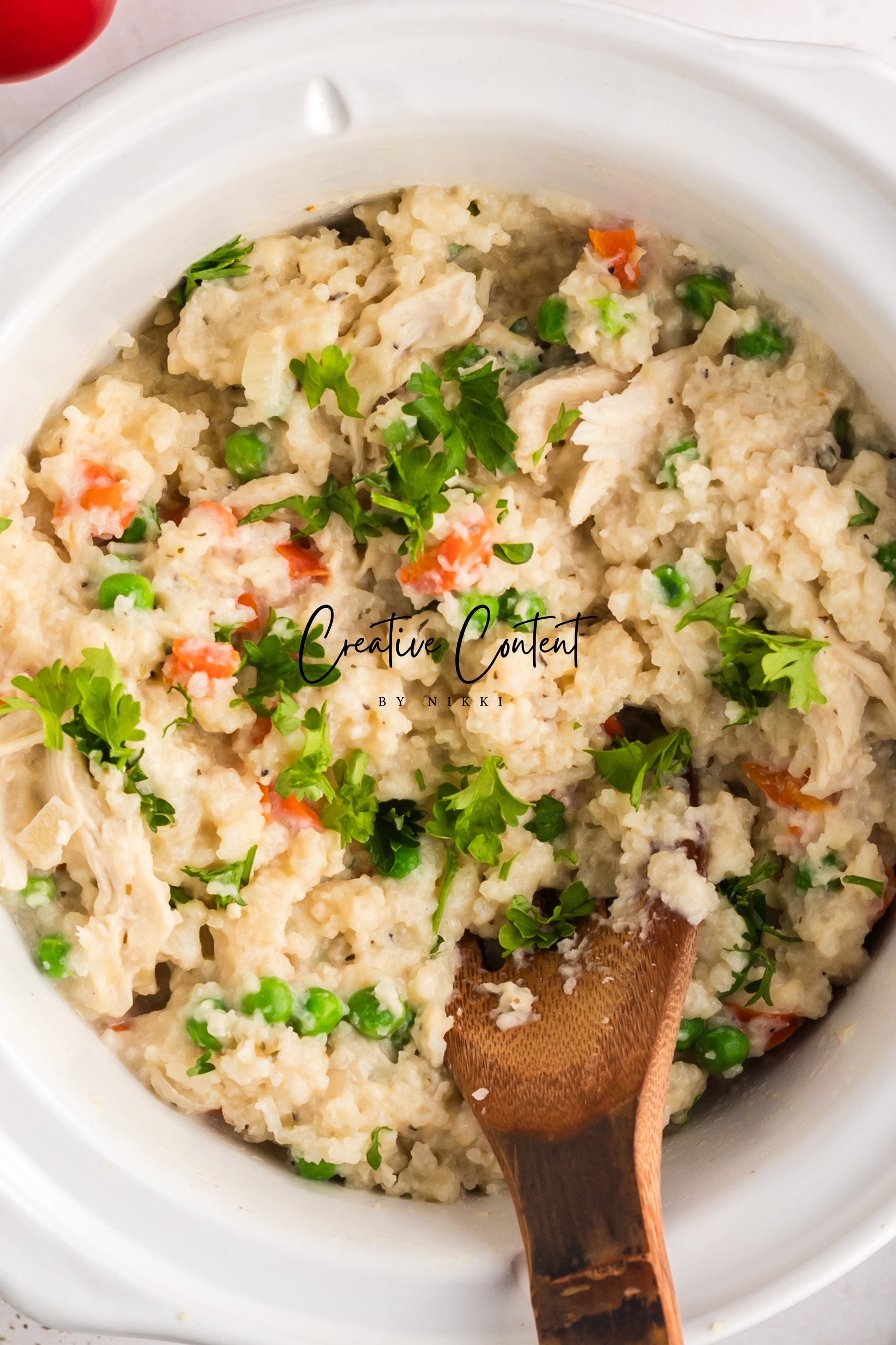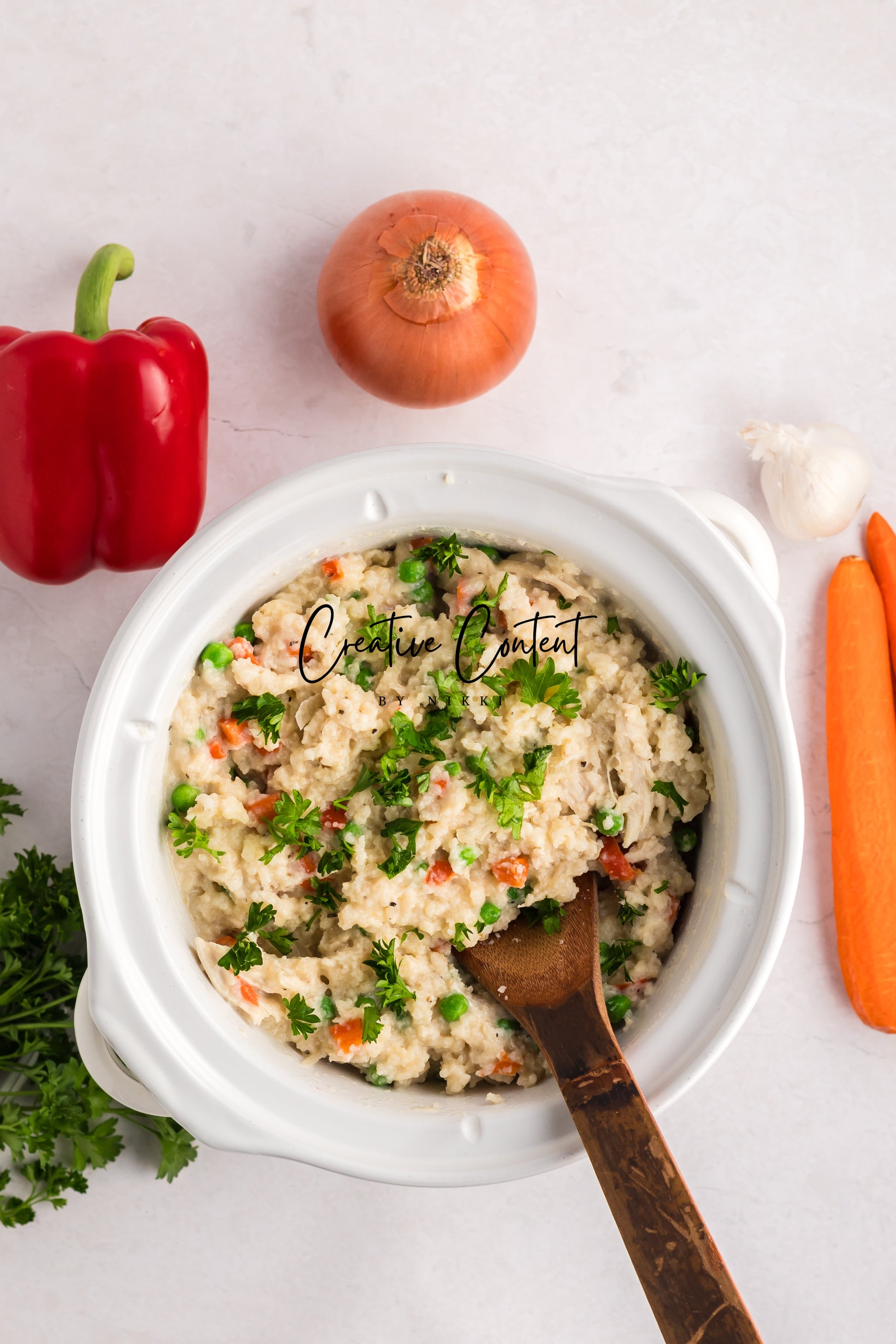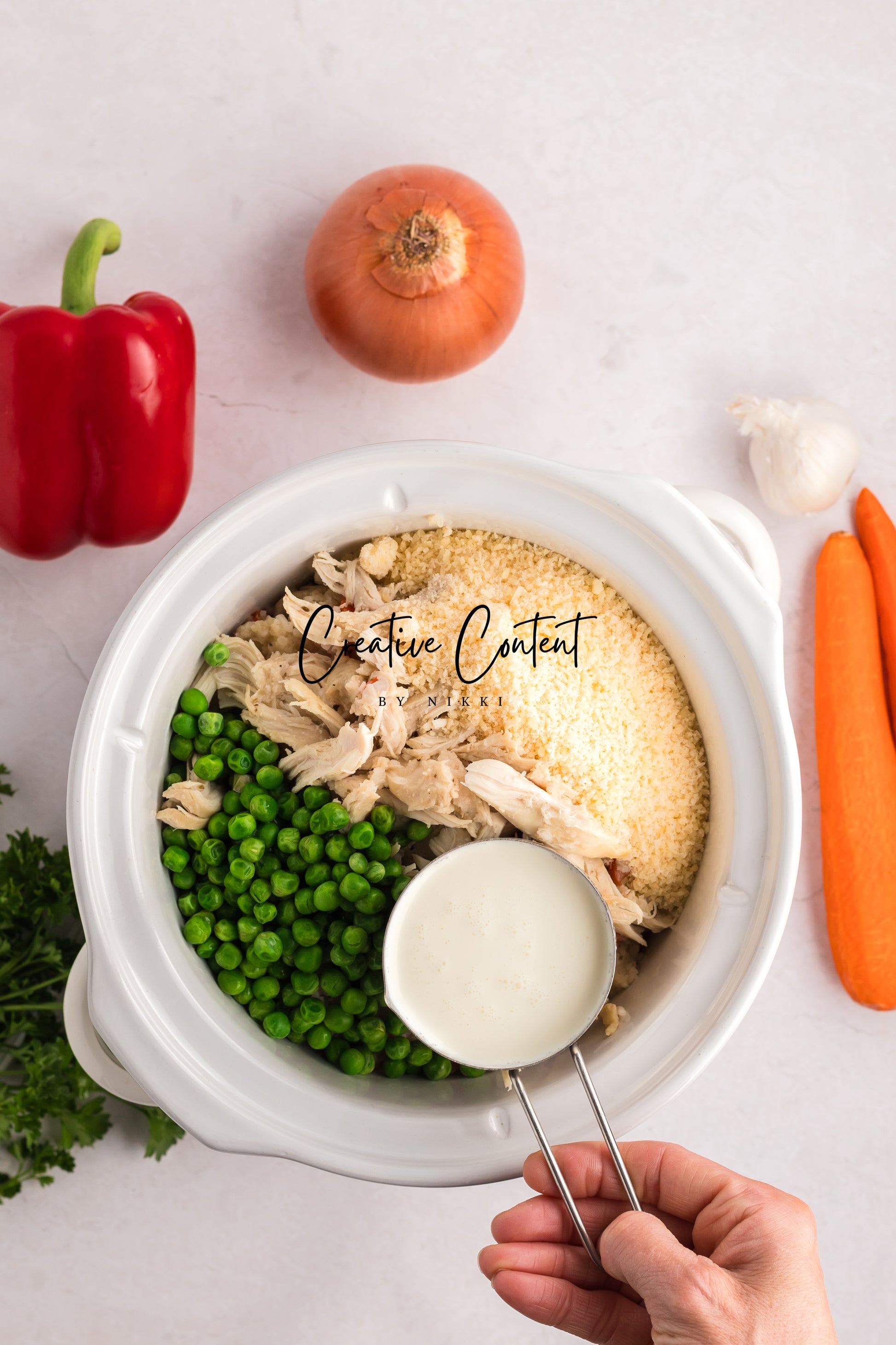 This slow cooker chicken and rice recipe is a hearty dinner when you want something that is full of flavor. The shredded chicken, rice, bell peppers, carrots, and peas make for a great dinner. The parmesan cheese and heavy cream make for a creamy dish that is tasty and delicious.