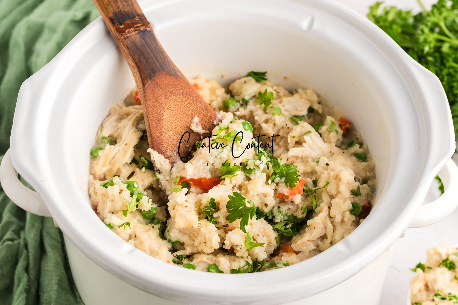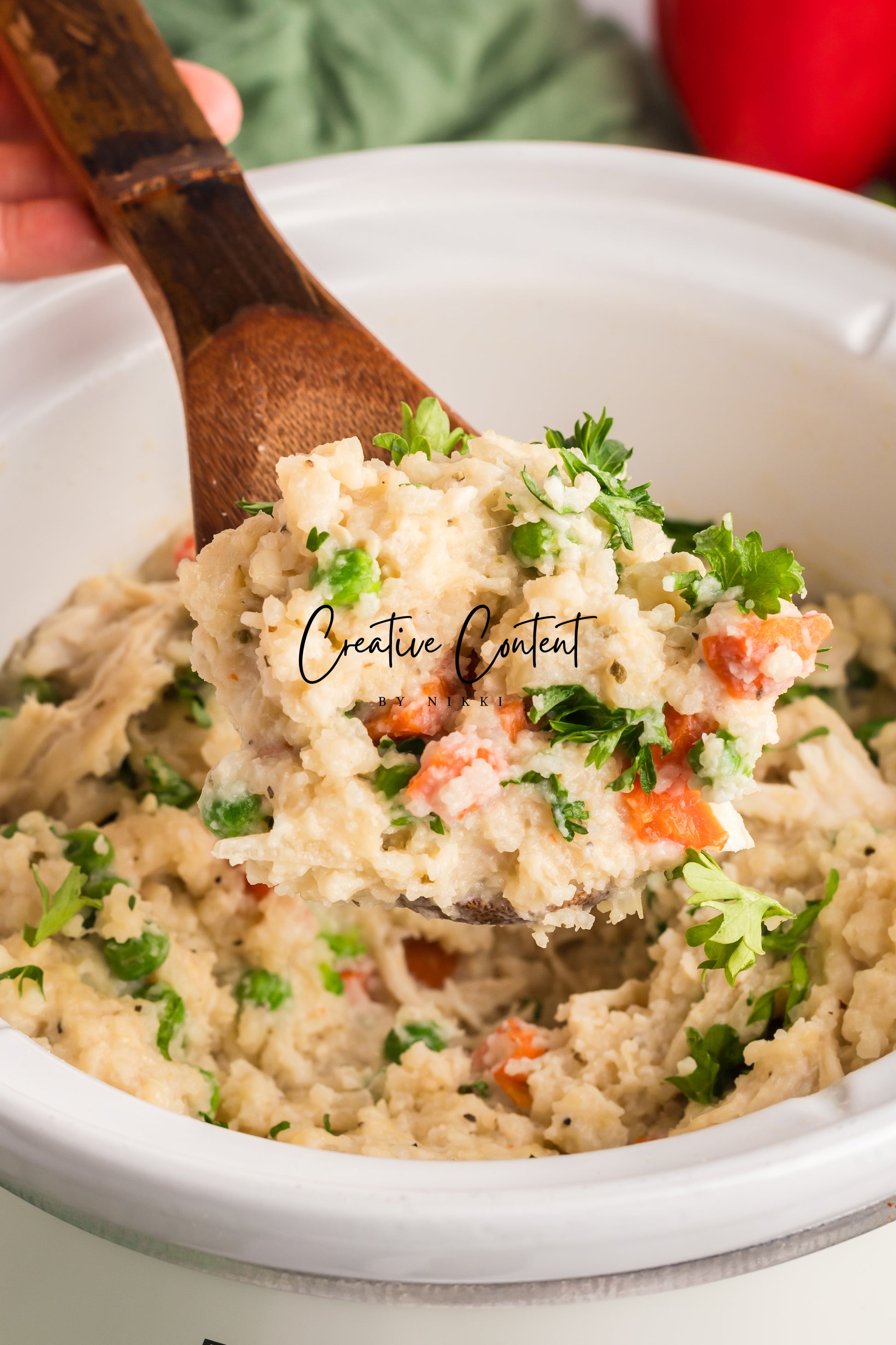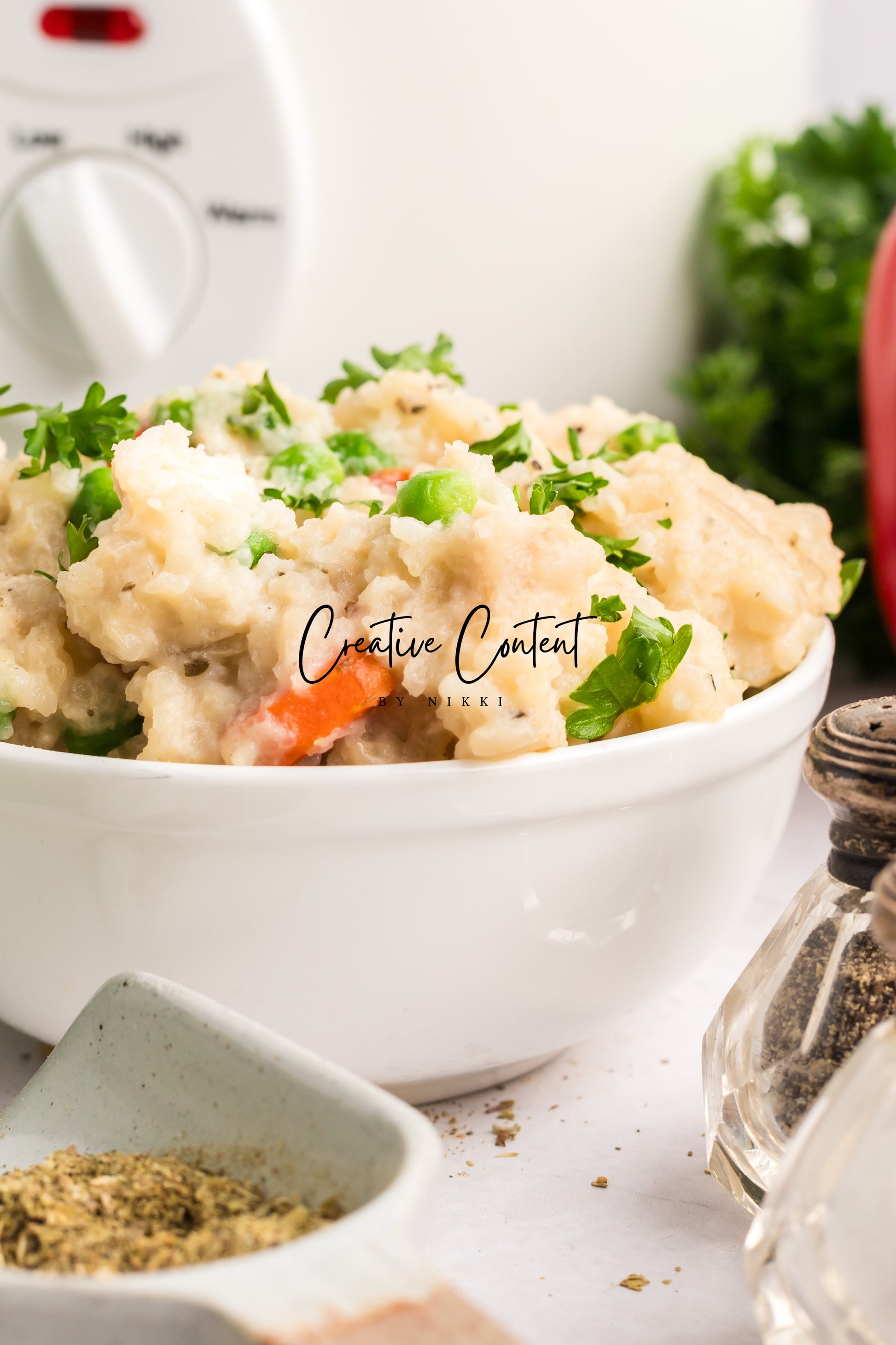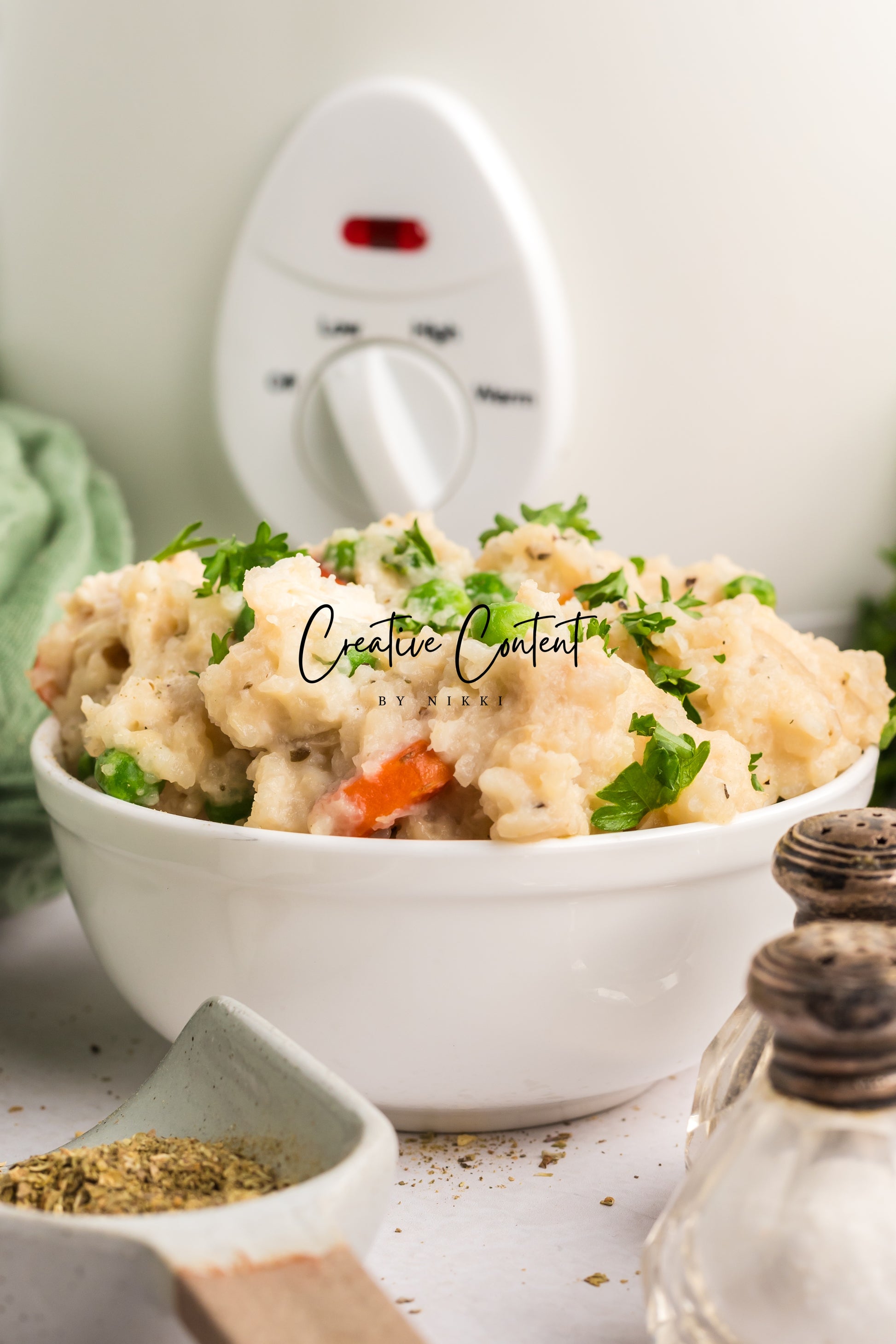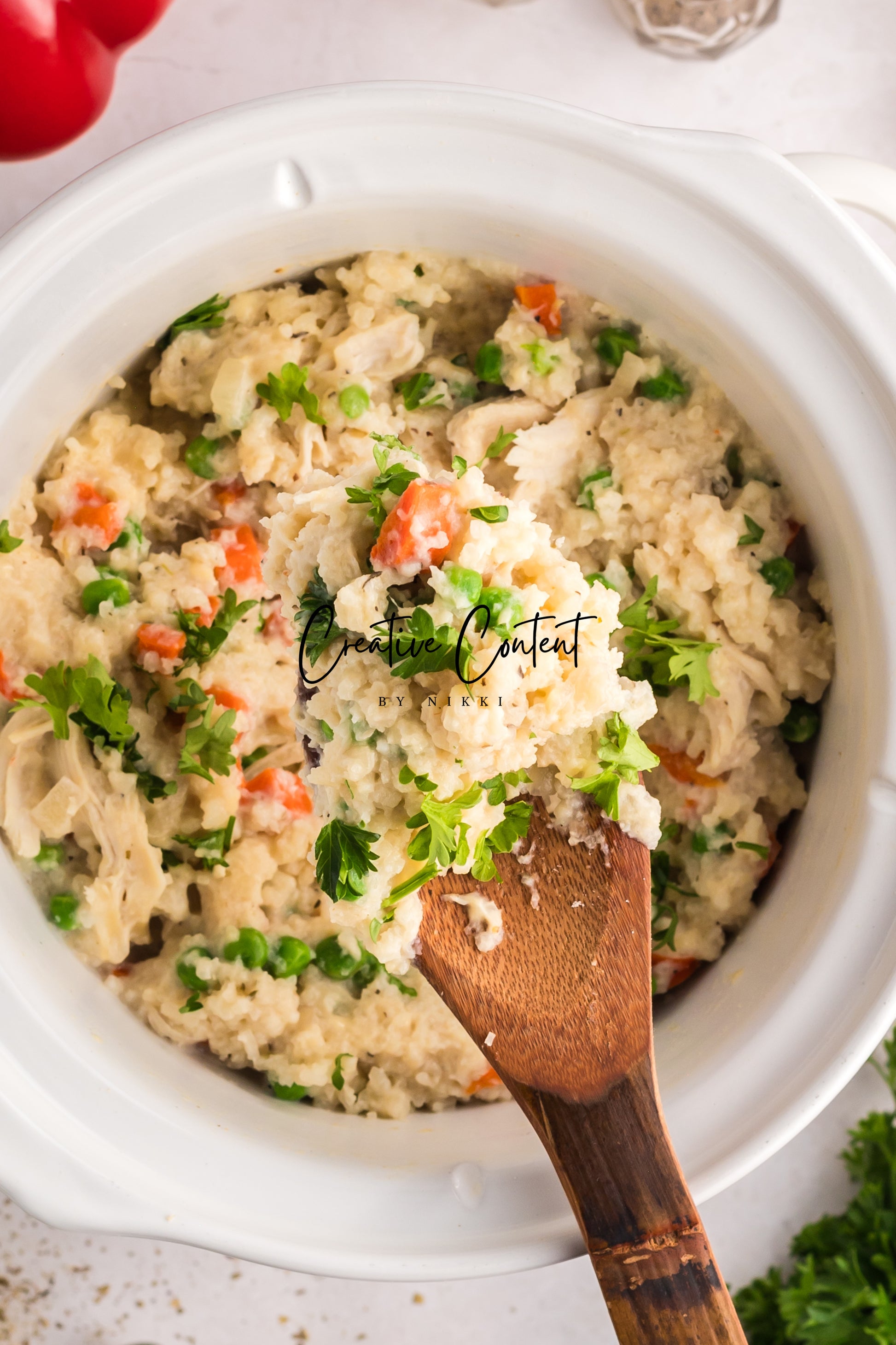 This slow cooker chicken and rice recipe is a hearty dinner when you want something that is full of flavor. The shredded chicken, rice, bell peppers, carrots, and peas make for a great dinner. The parmesan cheese and heavy cream make for a creamy dish that is tasty and delicious.
