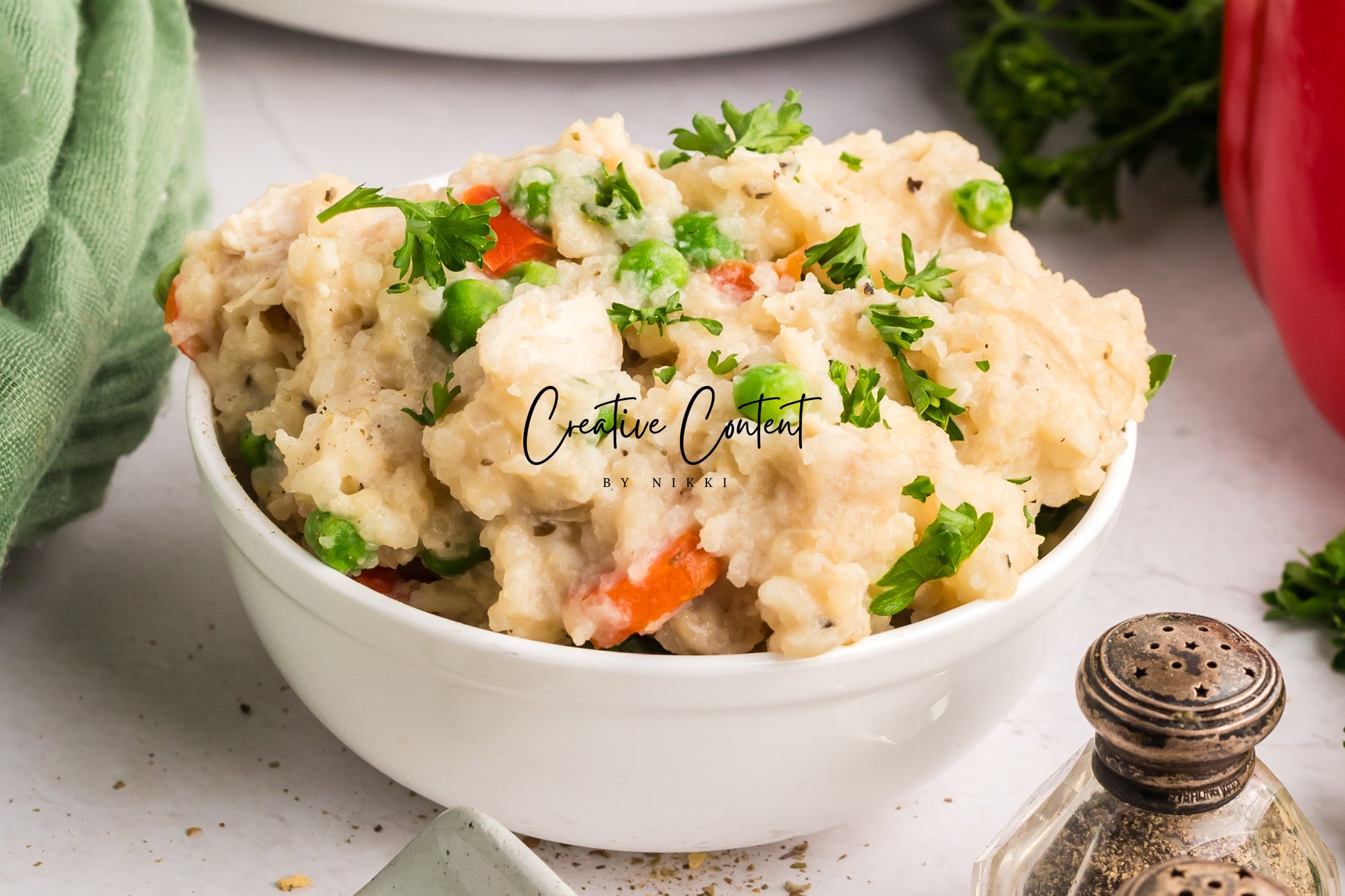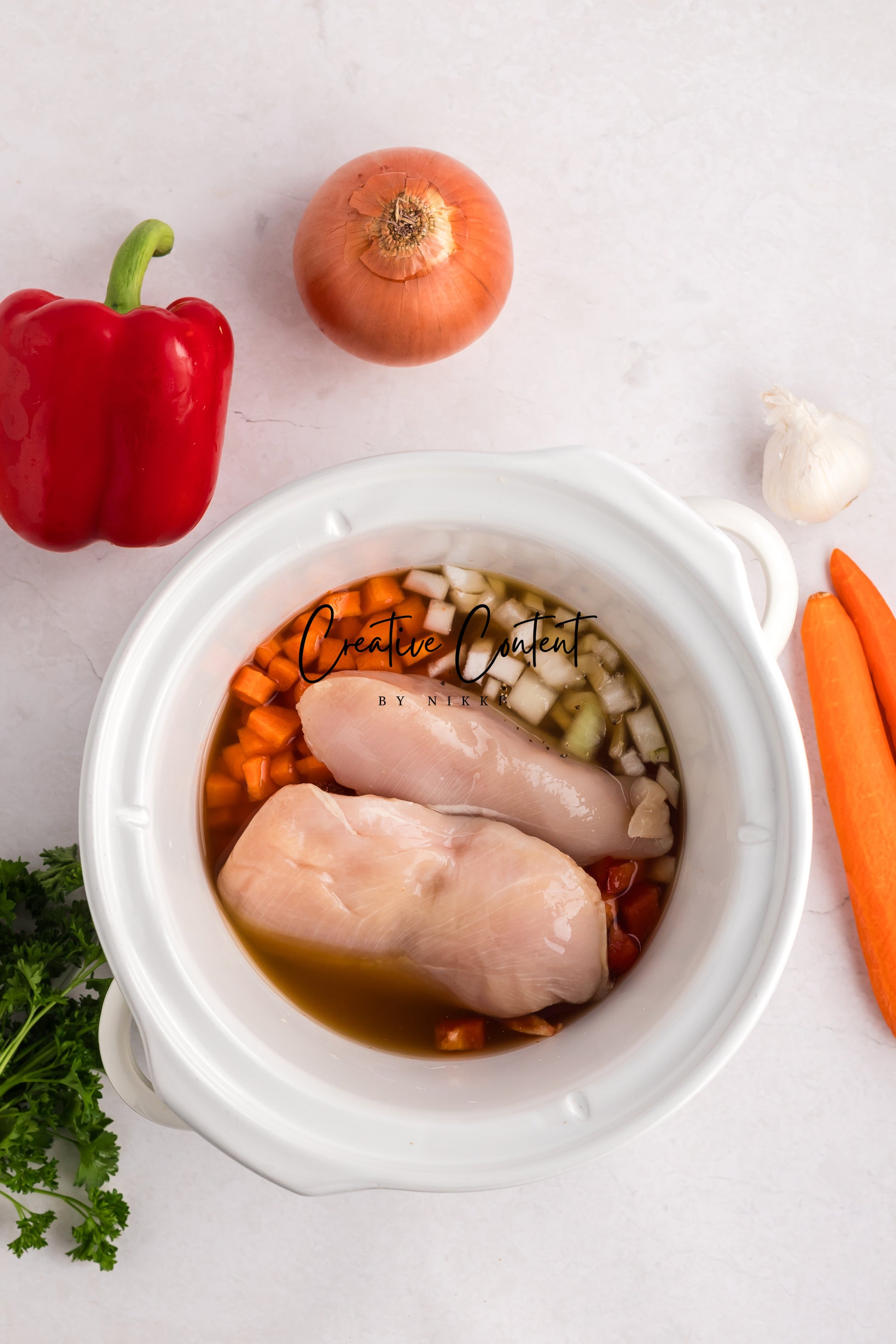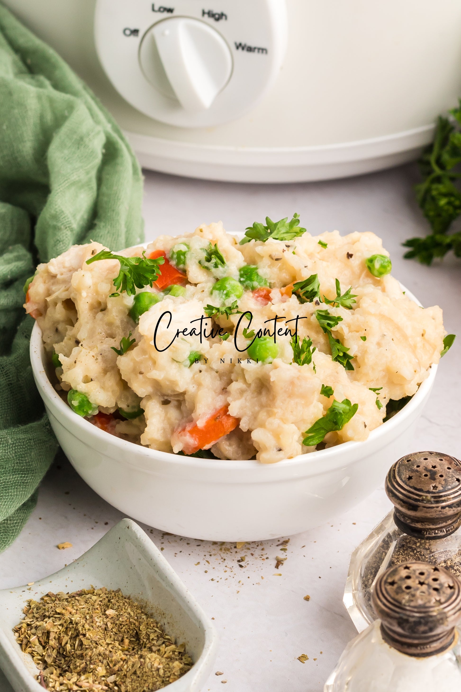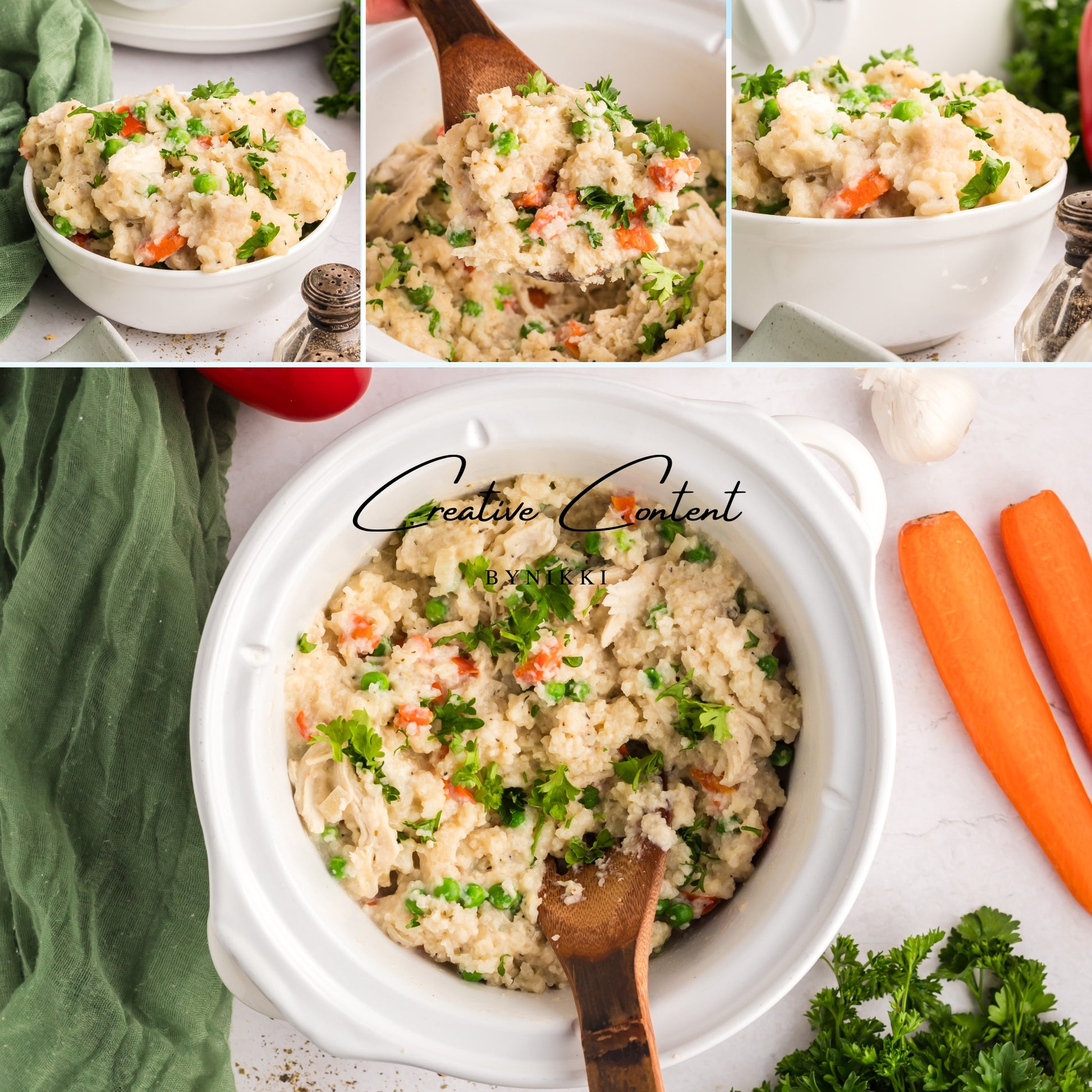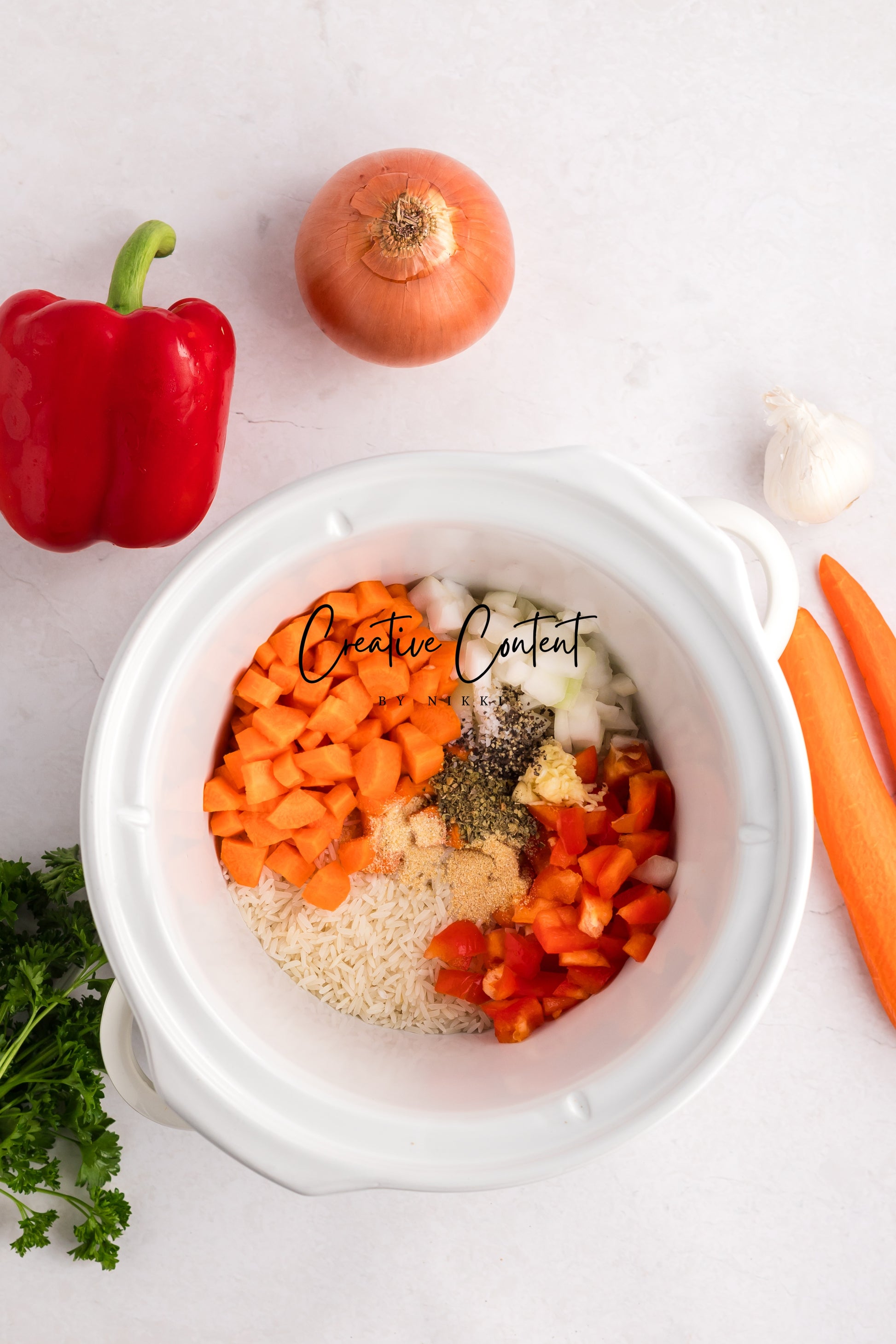 This slow cooker chicken and rice recipe is a hearty dinner when you want something that is full of flavor. The shredded chicken, rice, bell peppers, carrots, and peas make for a great dinner. The parmesan cheese and heavy cream make for a creamy dish that is tasty and delicious.