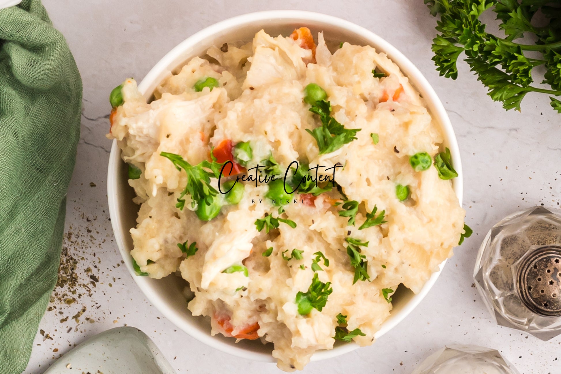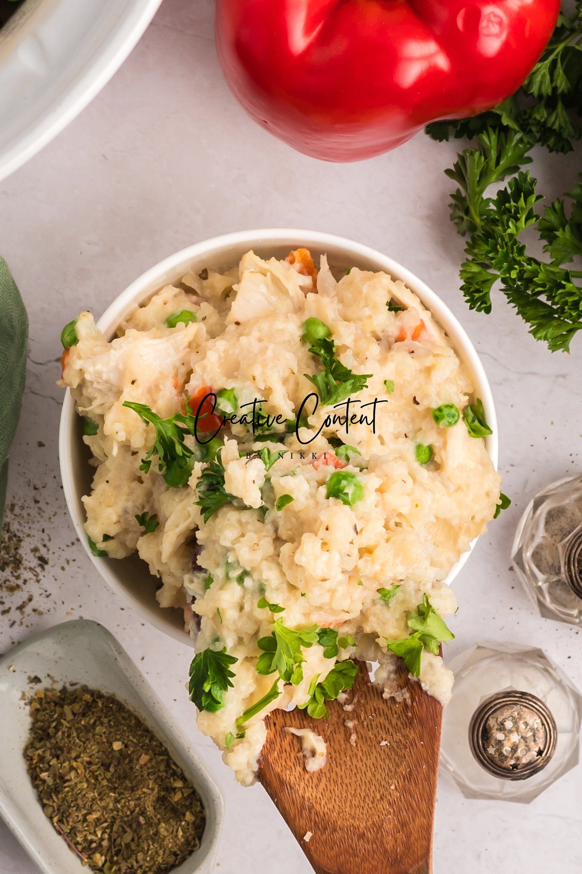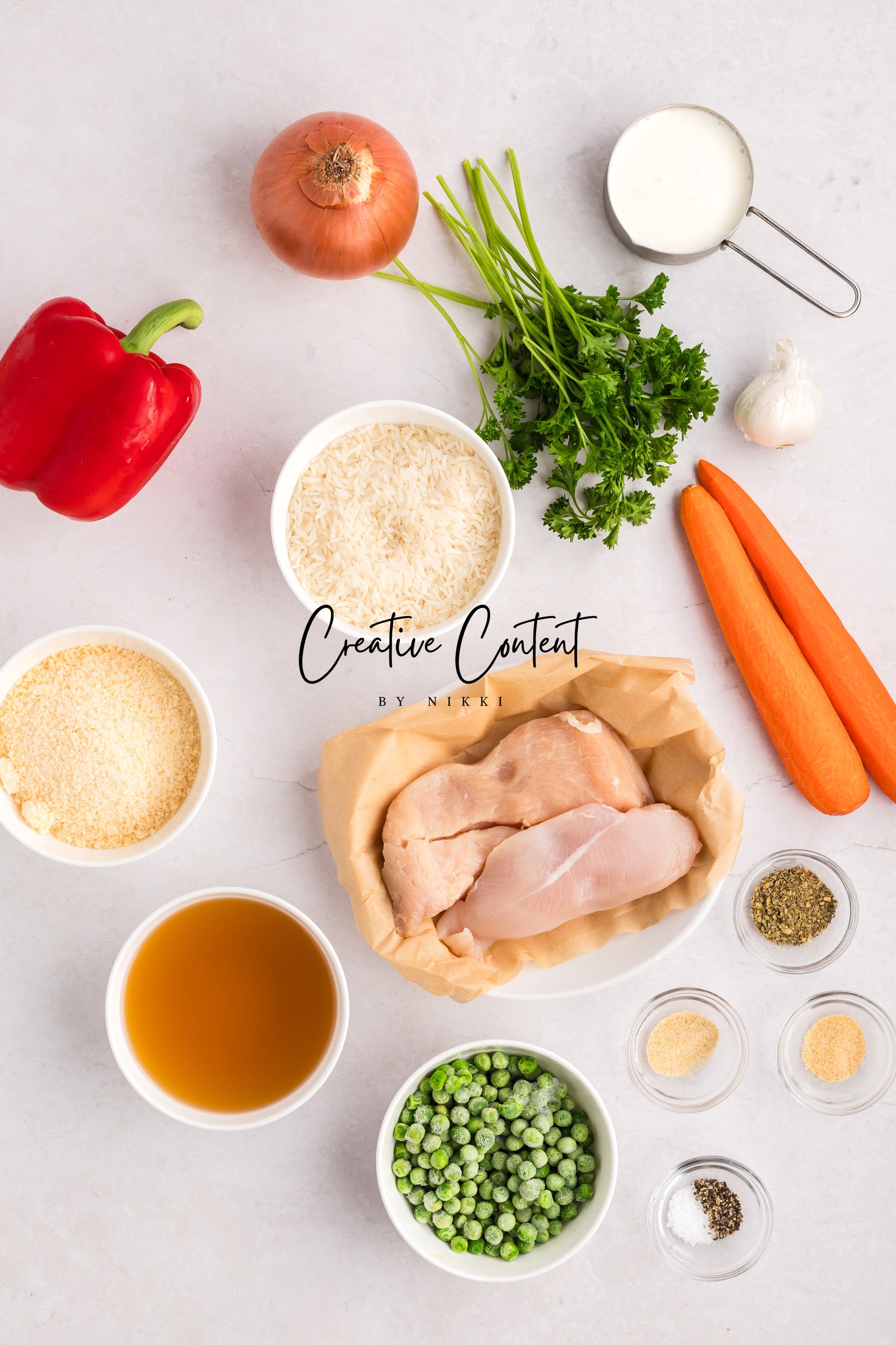 - chicken breasts, chicken broth, rice, yellow onion, red bell pepper, carrots, Italian seasoning, garlic cloves, salt, black pepper, garlic powder, onion powder, parmesan cheese, frozen peas, heavy cream, and parsley.