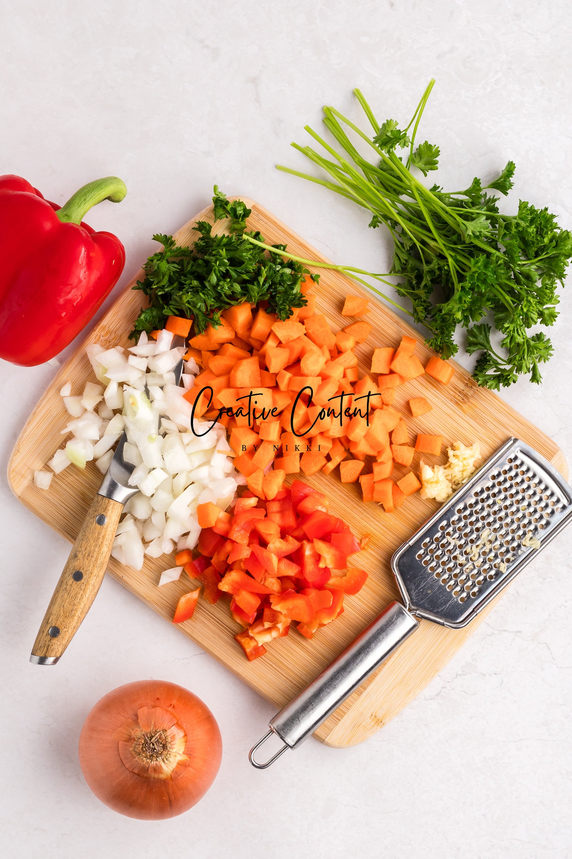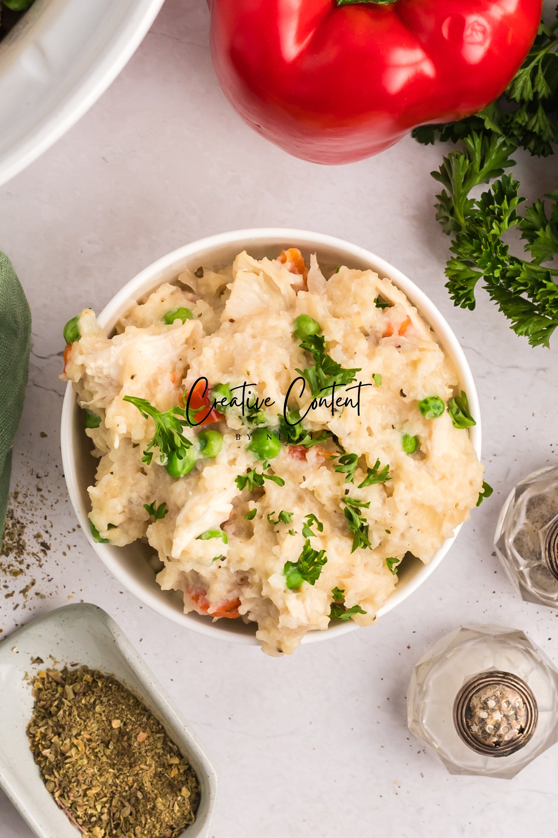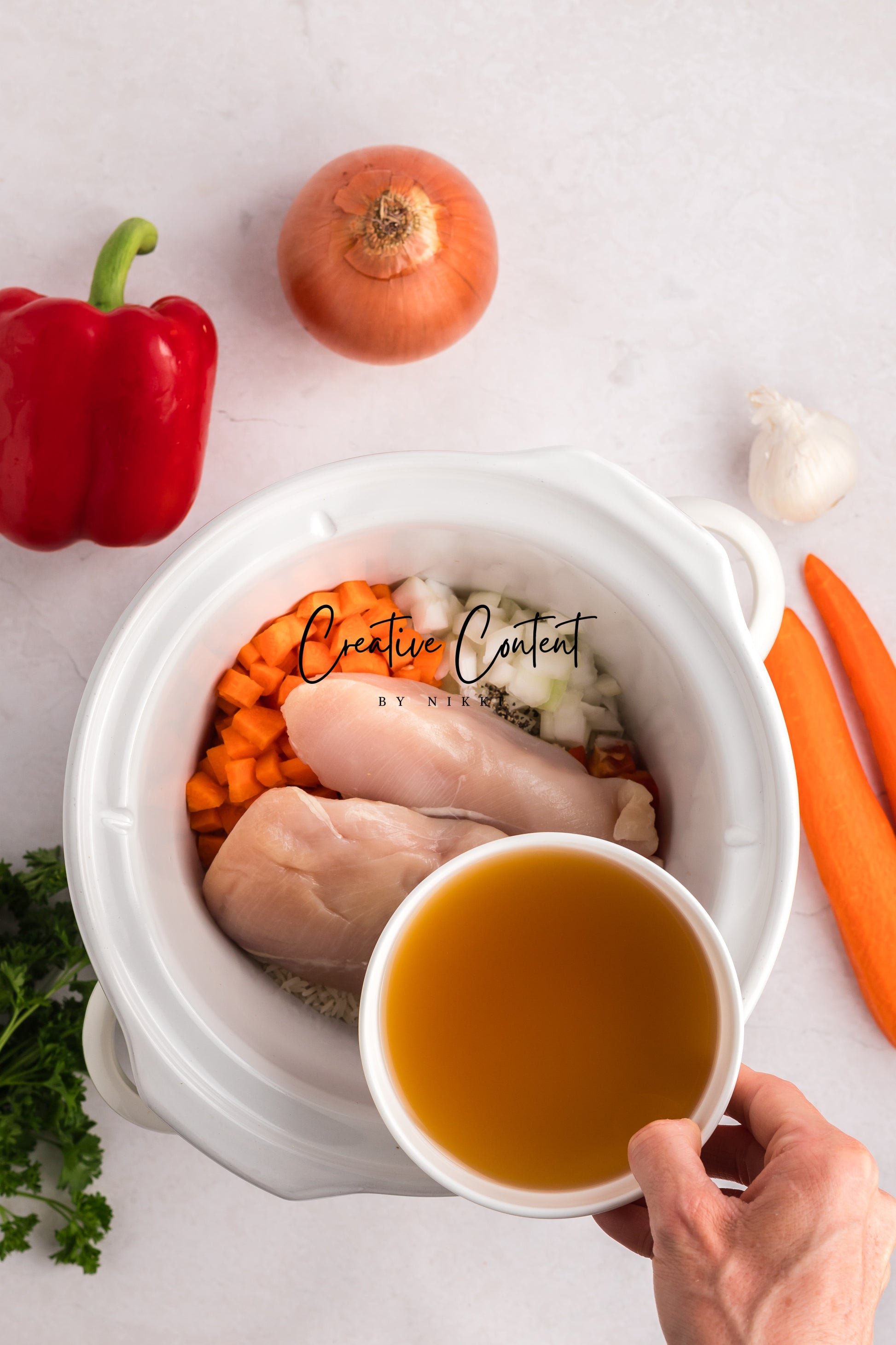 - chicken breasts, chicken broth, rice, yellow onion, red bell pepper, carrots, Italian seasoning, garlic cloves, salt, black pepper, garlic powder, onion powder, parmesan cheese, frozen peas, heavy cream, and parsley.