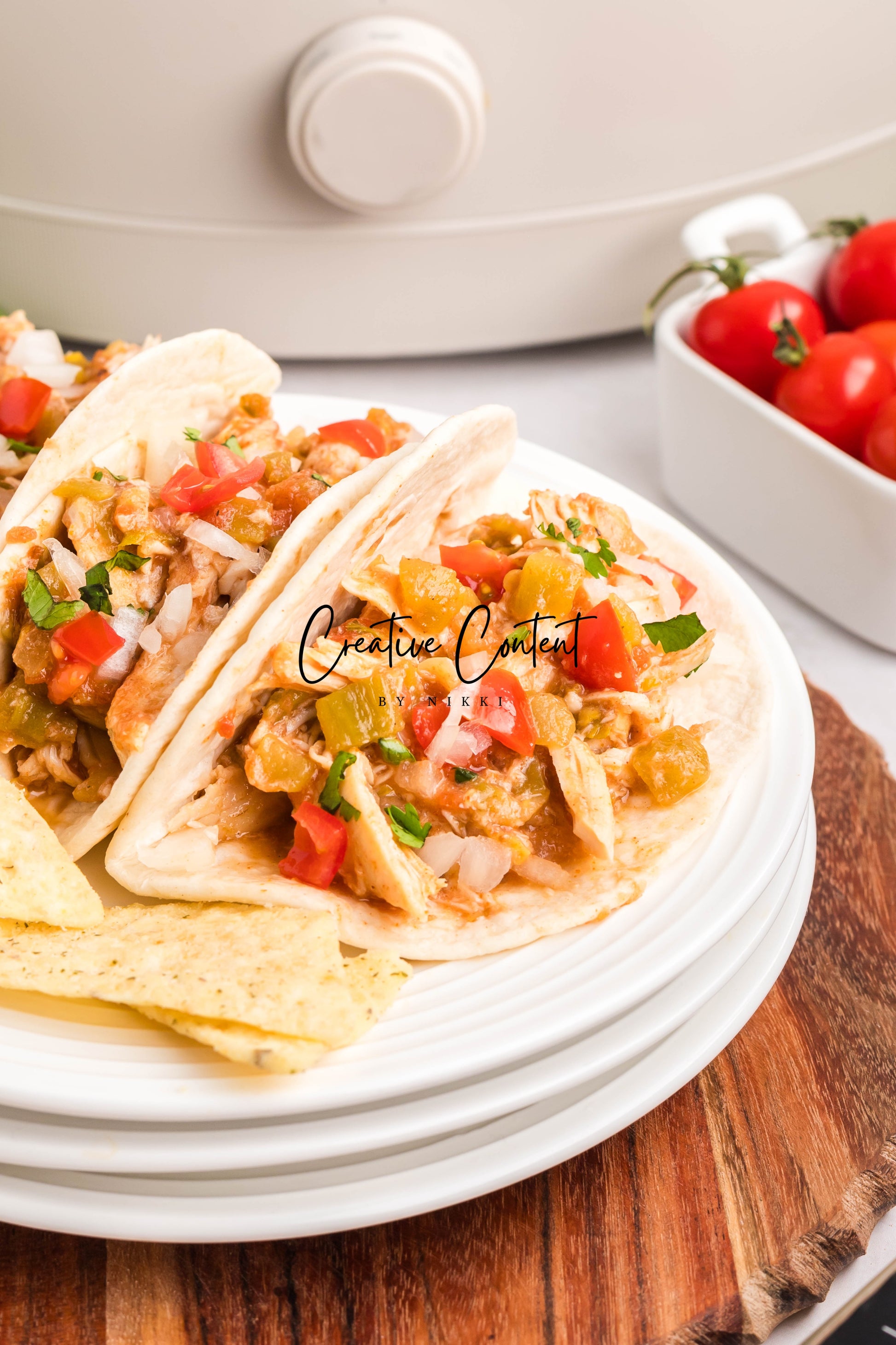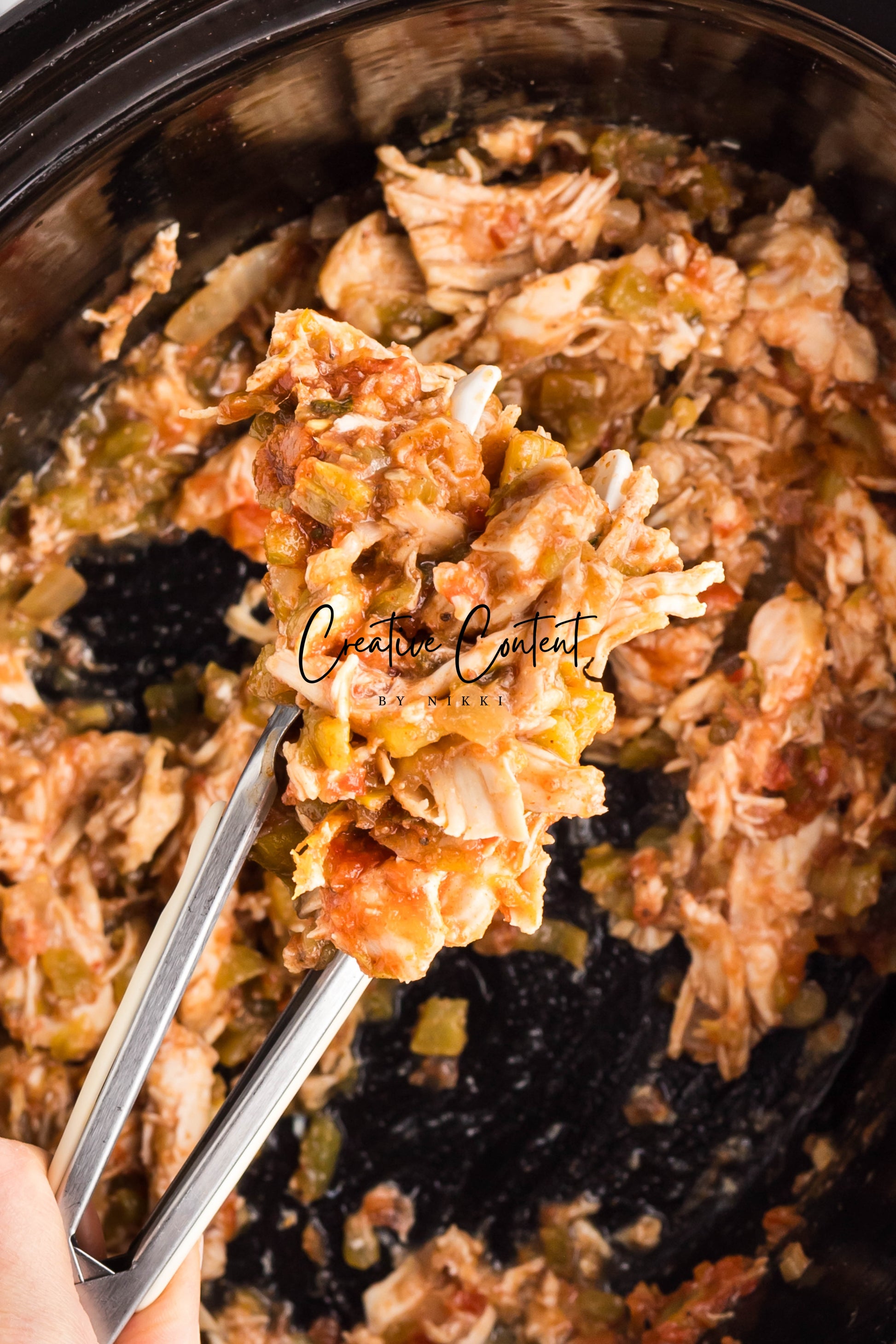 - Ingredients: Chicken breasts, salsa, green chiles, diced onion, taco seasoning