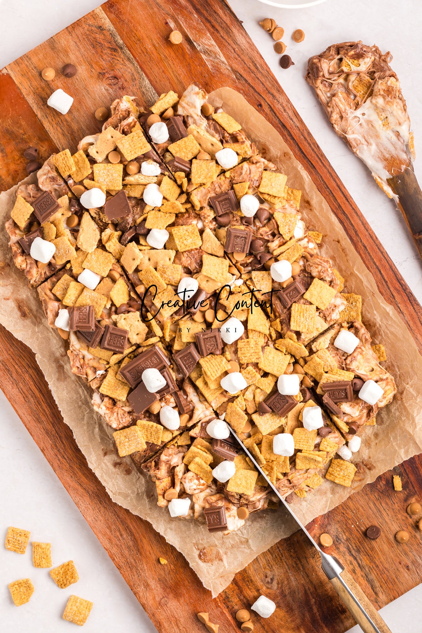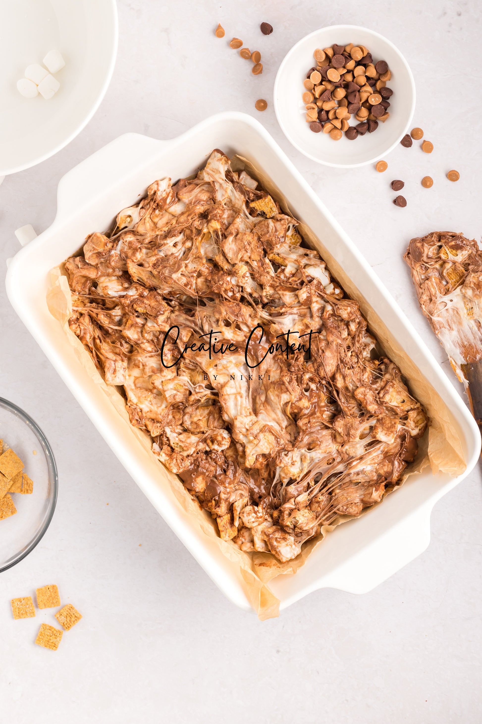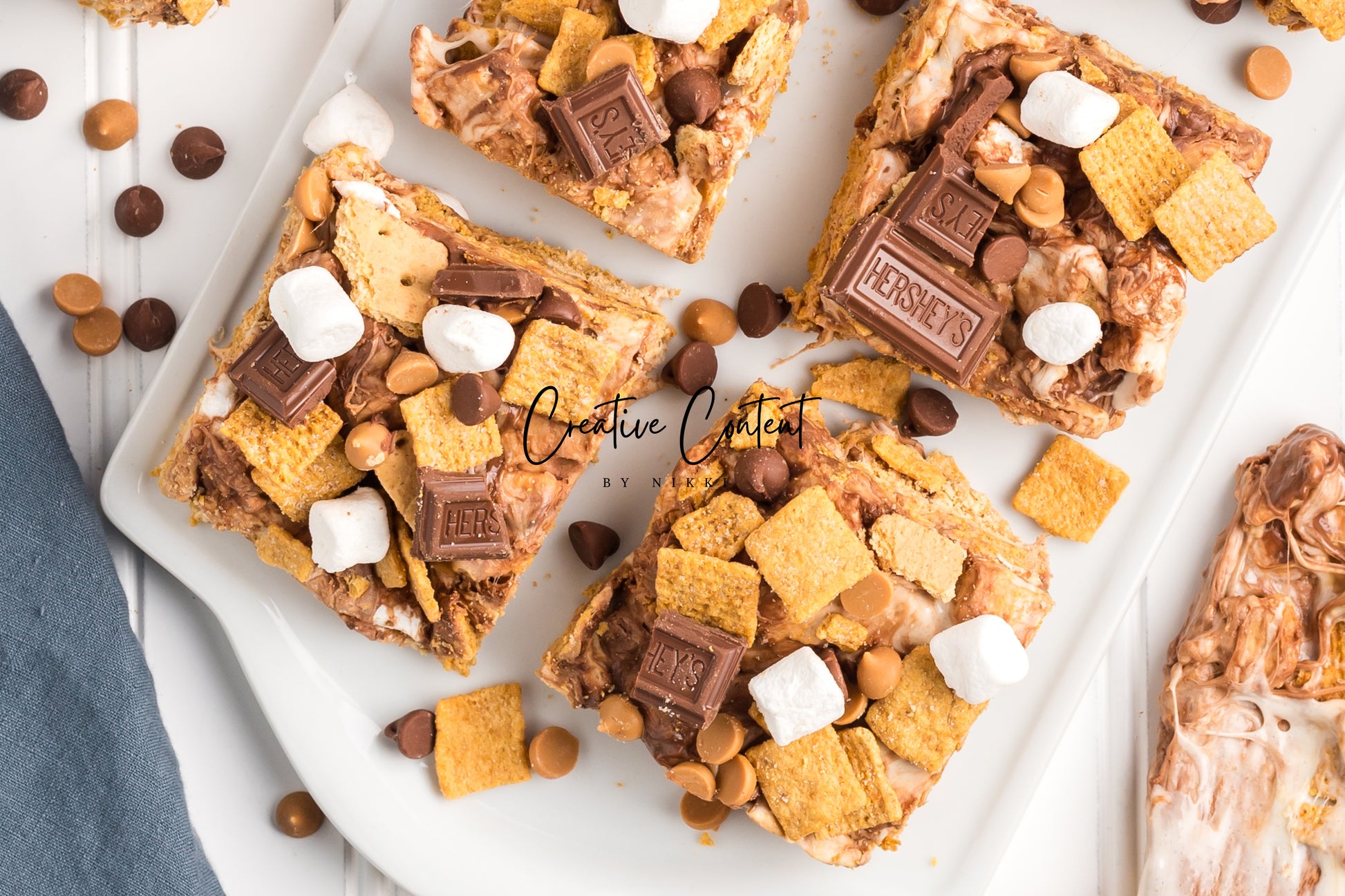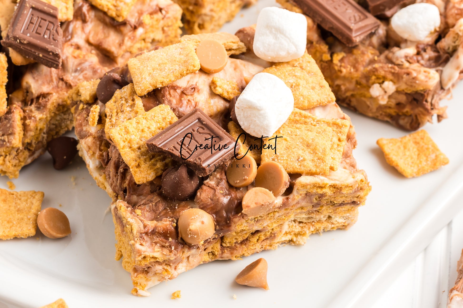 - Featured Ingredients; salted butter, mini marshmallows, Golden Grahams Cereal, graham crackers, Hershey bars, and chocolate and peanut butter chips