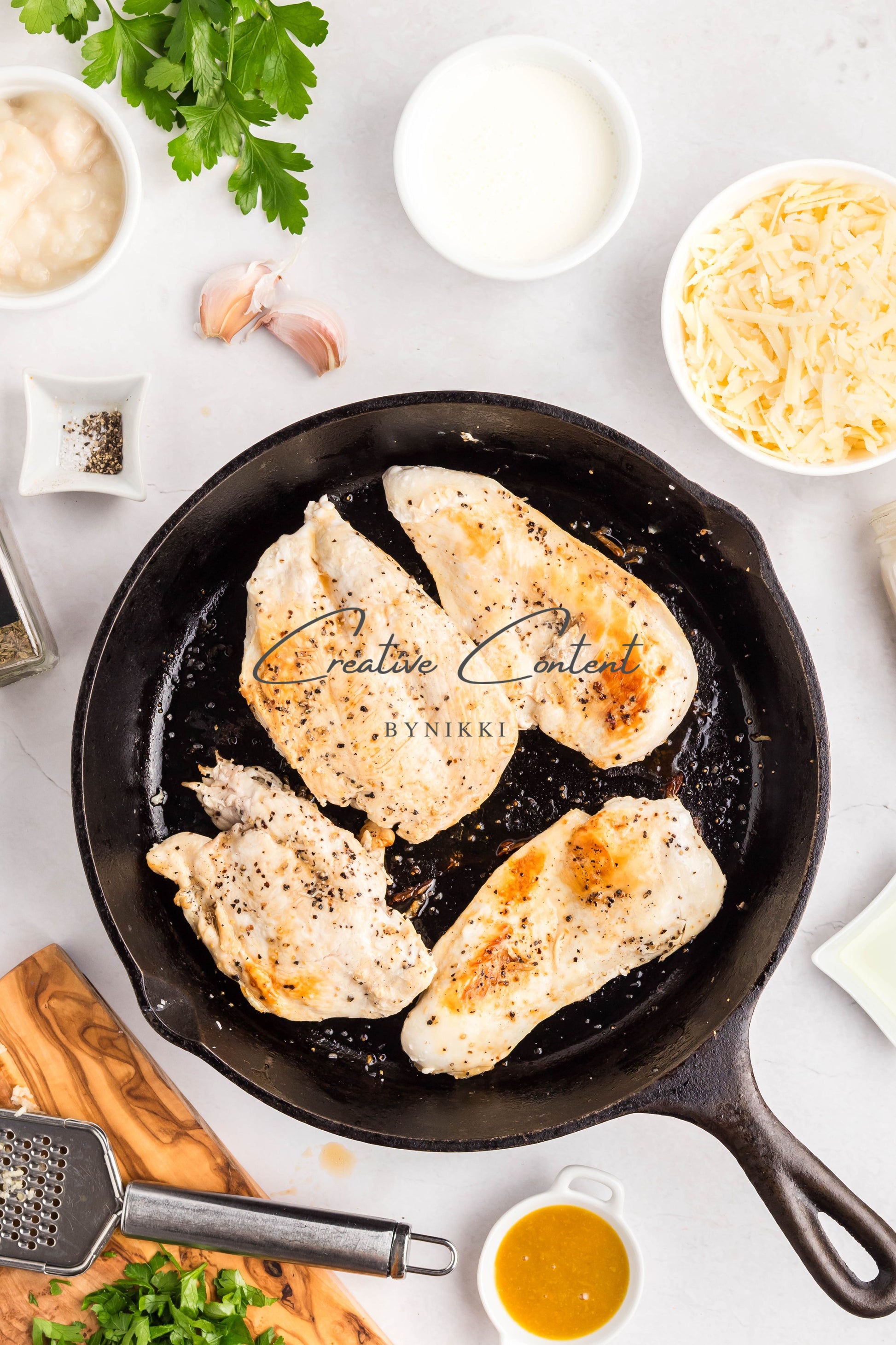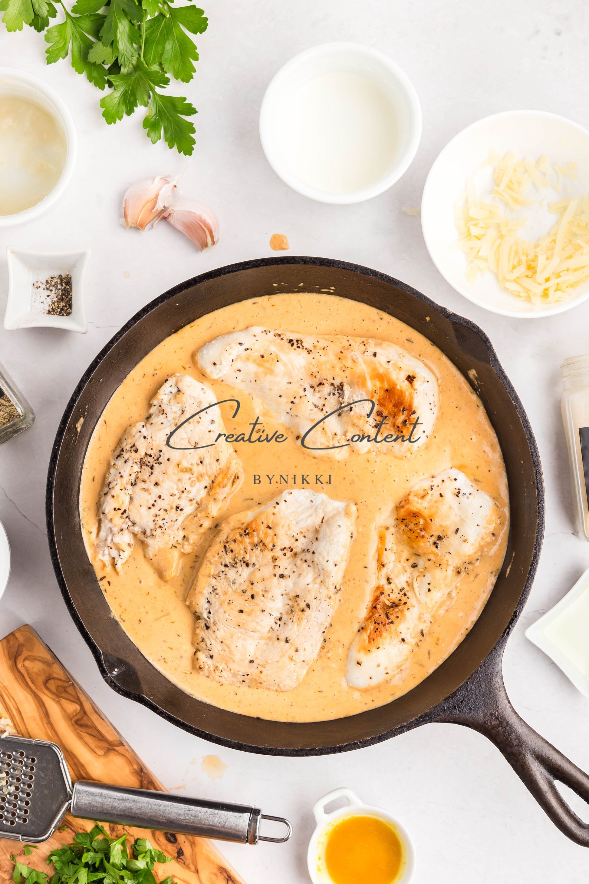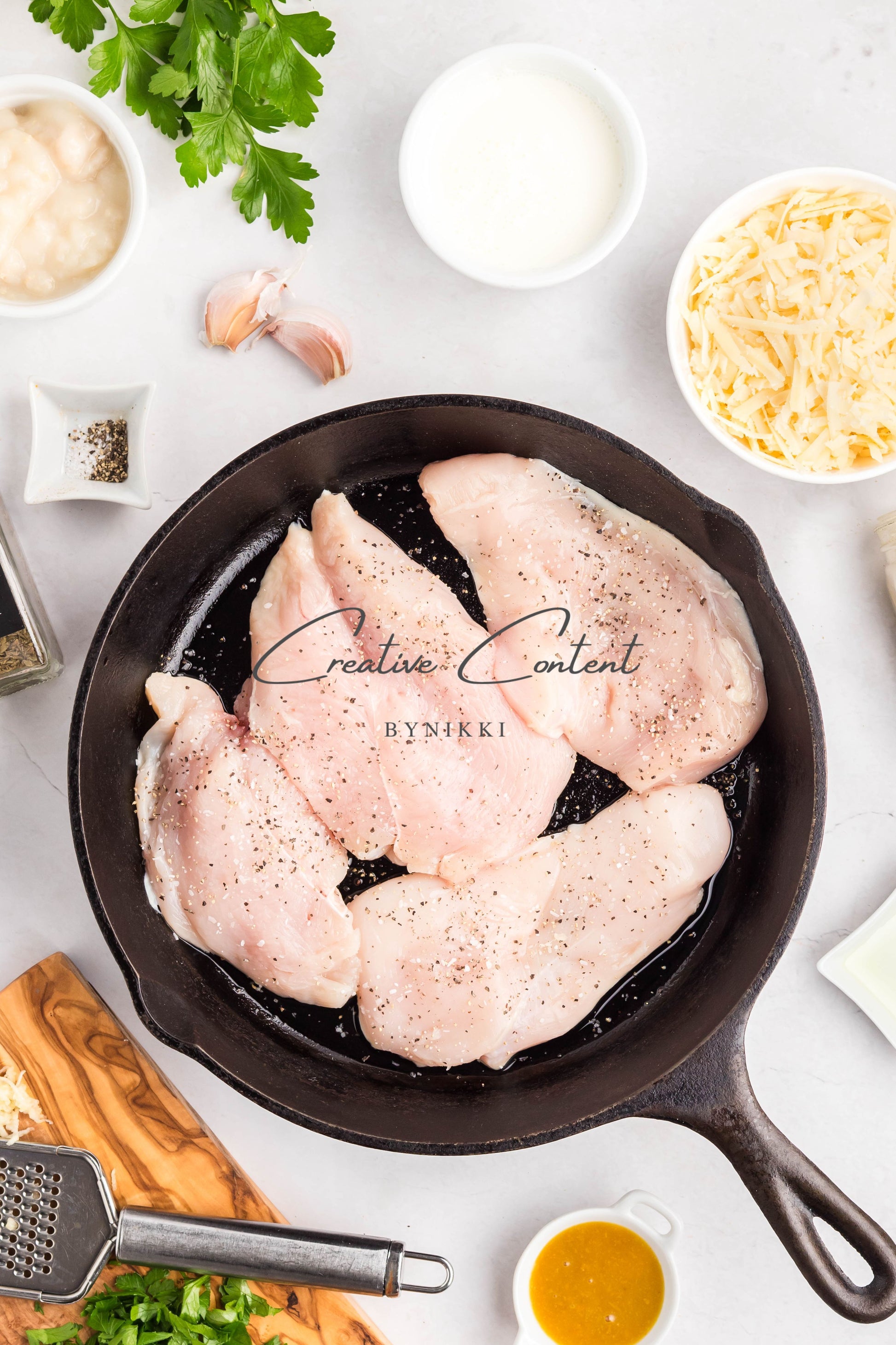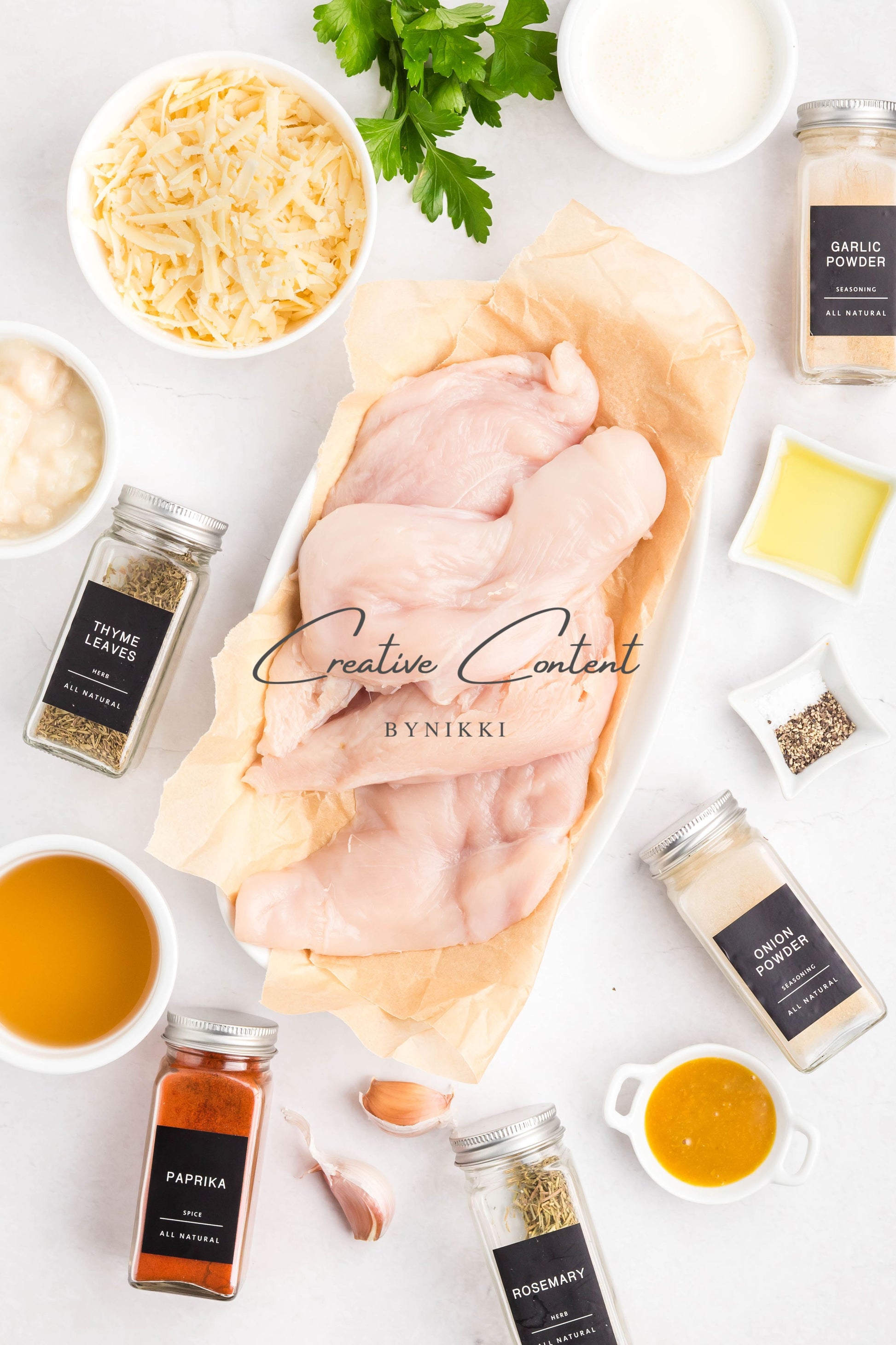 - Ingredients: avocado oil, chicken breasts, black pepper, coarse kosher salt, garlic powder, onion powder, garlic cloves, cream of chicken soup, heavy cream, low-sodium chicken Better Than Bouillon, onion powder, garlic powder, dried thyme, dried rosemary, grated Parmesan cheese, chopped parsley