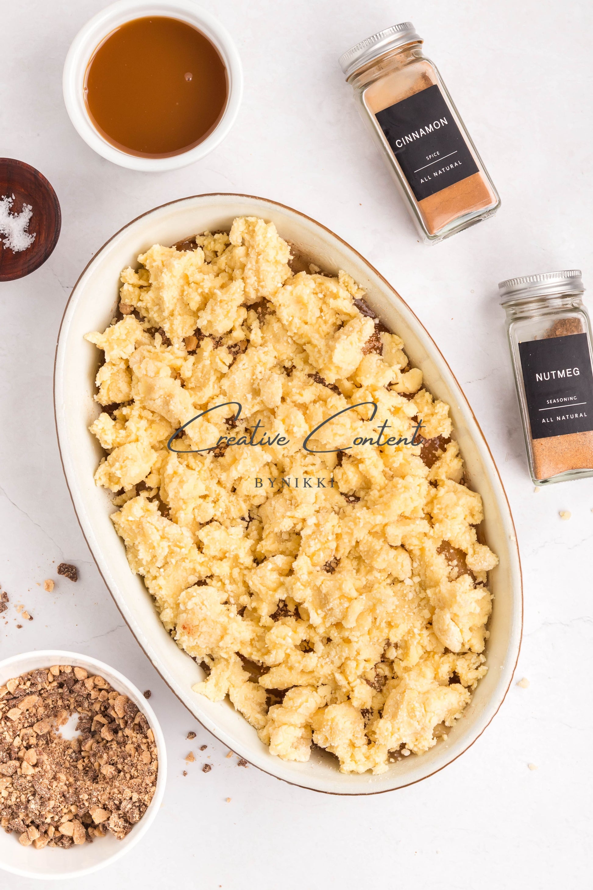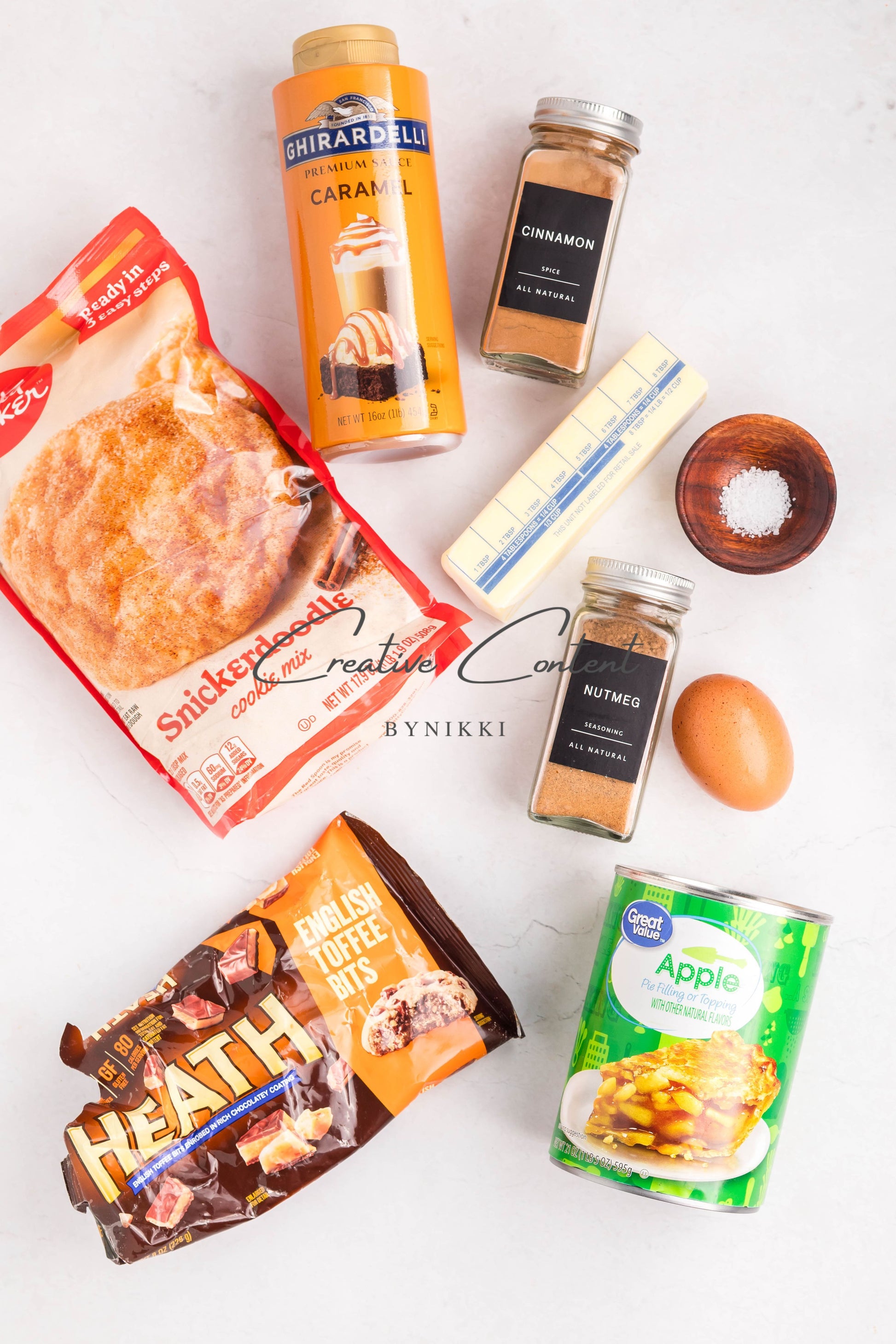 - Ingredients: apple pie filling, cinnamon, nutmeg, coarse kosher salt, snickerdoodle cookie mix, cinnamon sugar packet, butter, egg, toffee bits, caramel topping