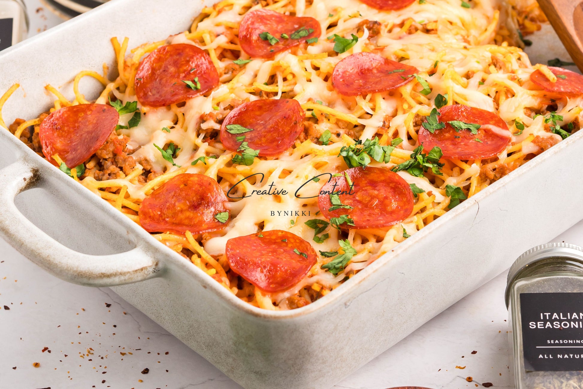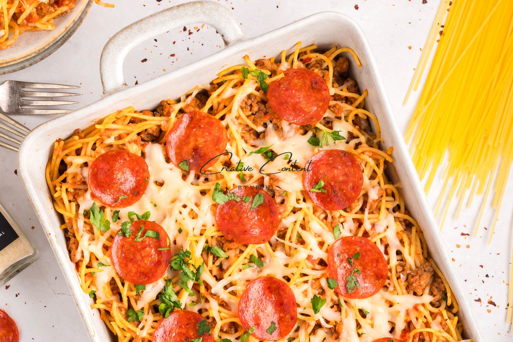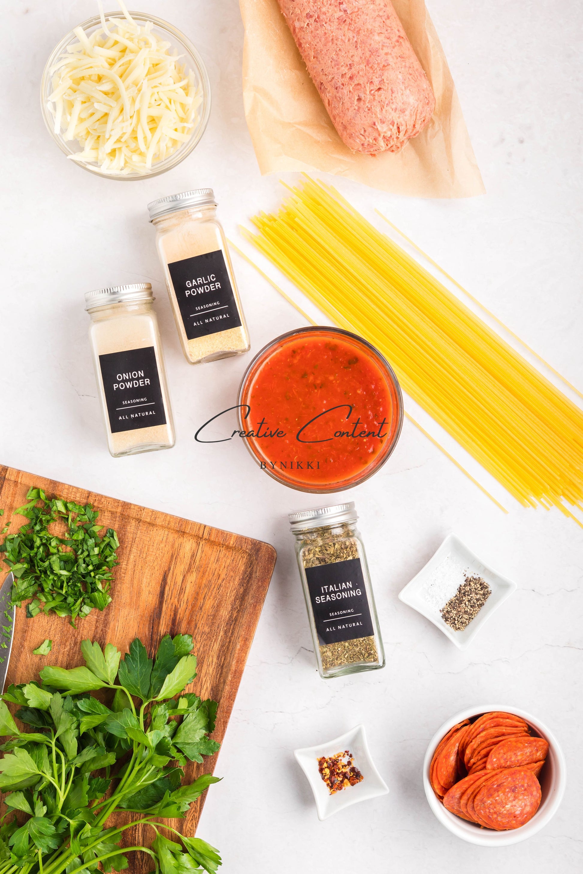 - Ingredients: Spaghetti, Italian sausage, Italian seasoning, garlic powder, onion powder, red pepper flakes, coarse kosher salt, black pepper, spaghetti sauce, shredded mozzarella cheese, sliced pepperoni, and parsley