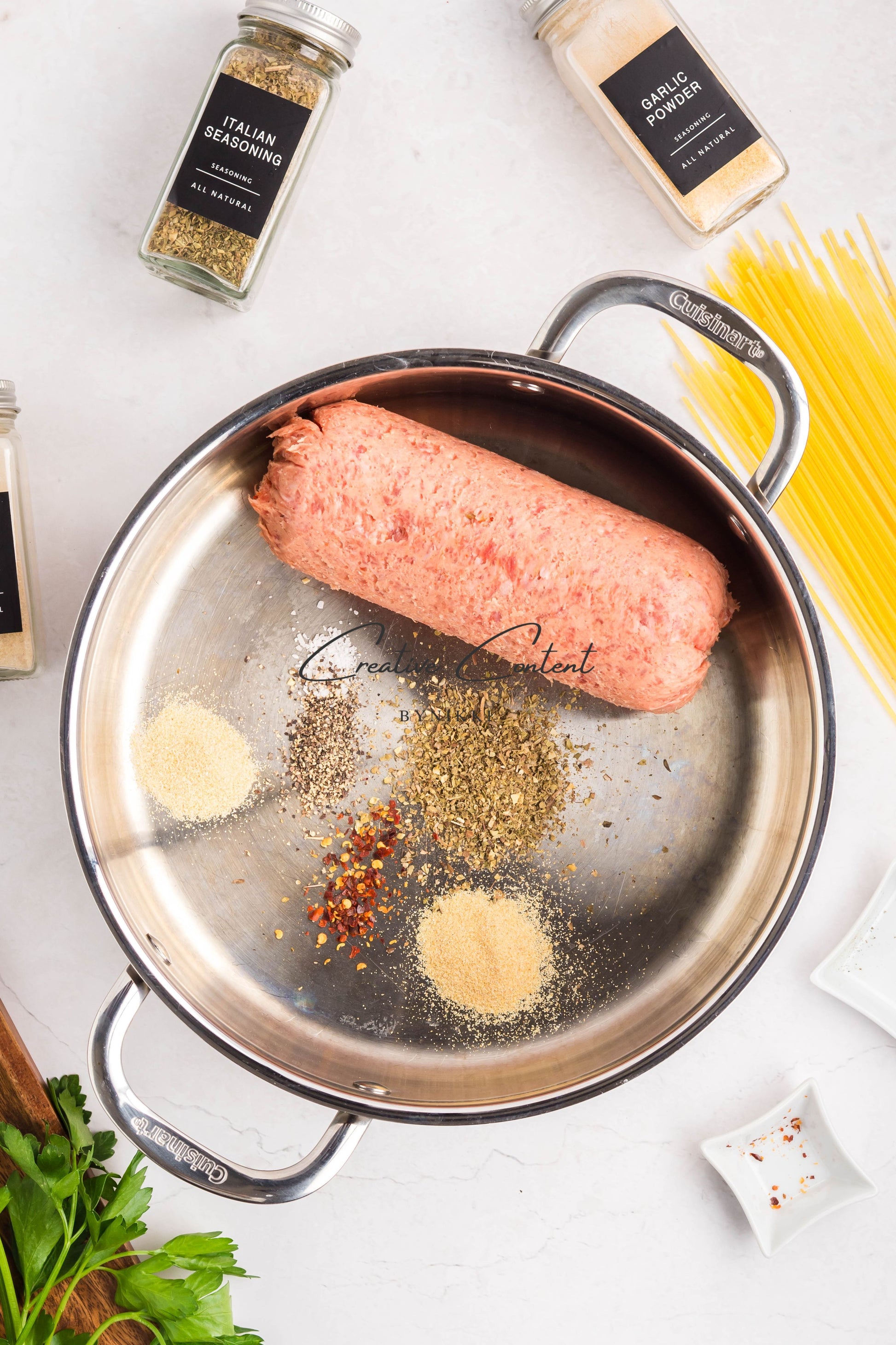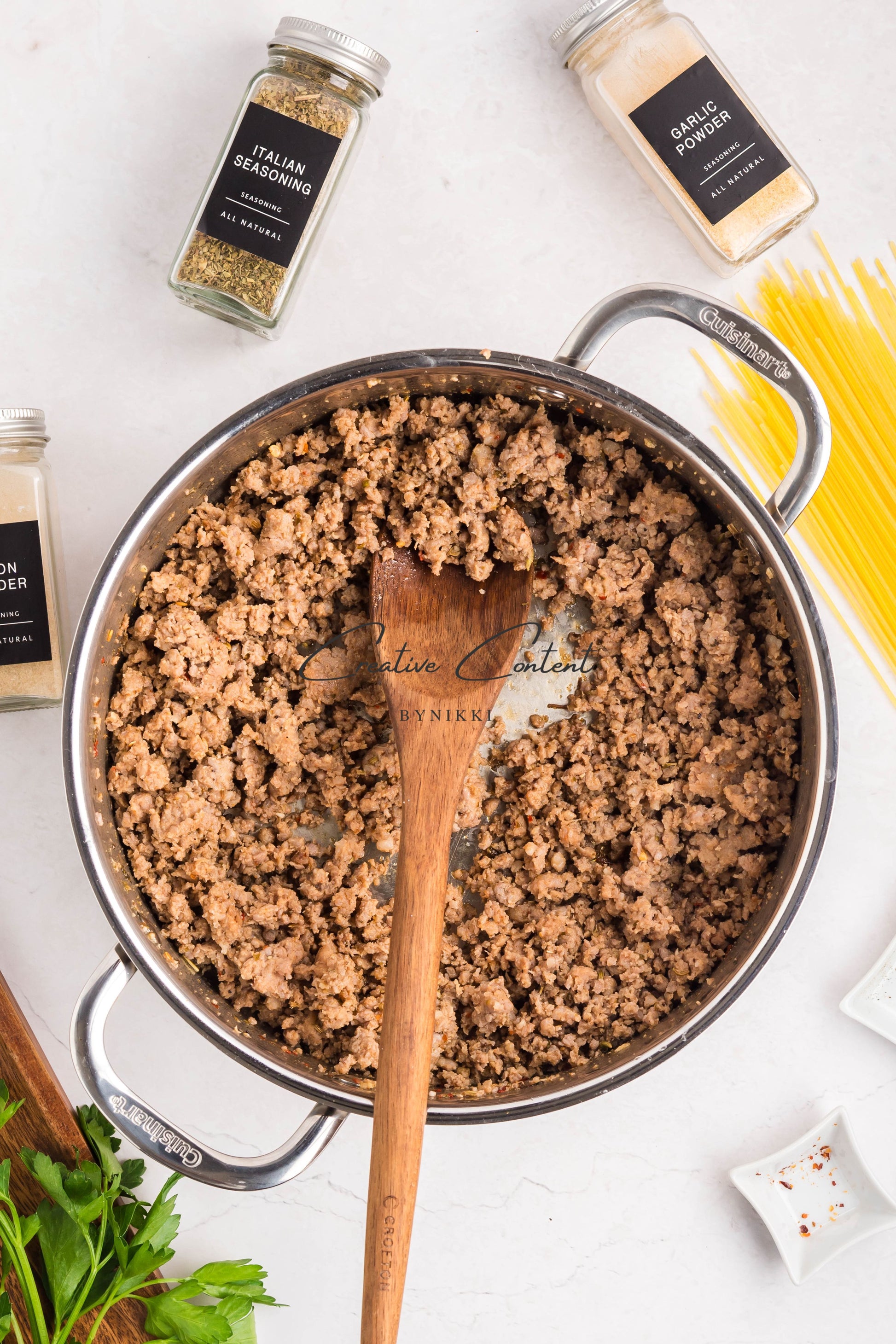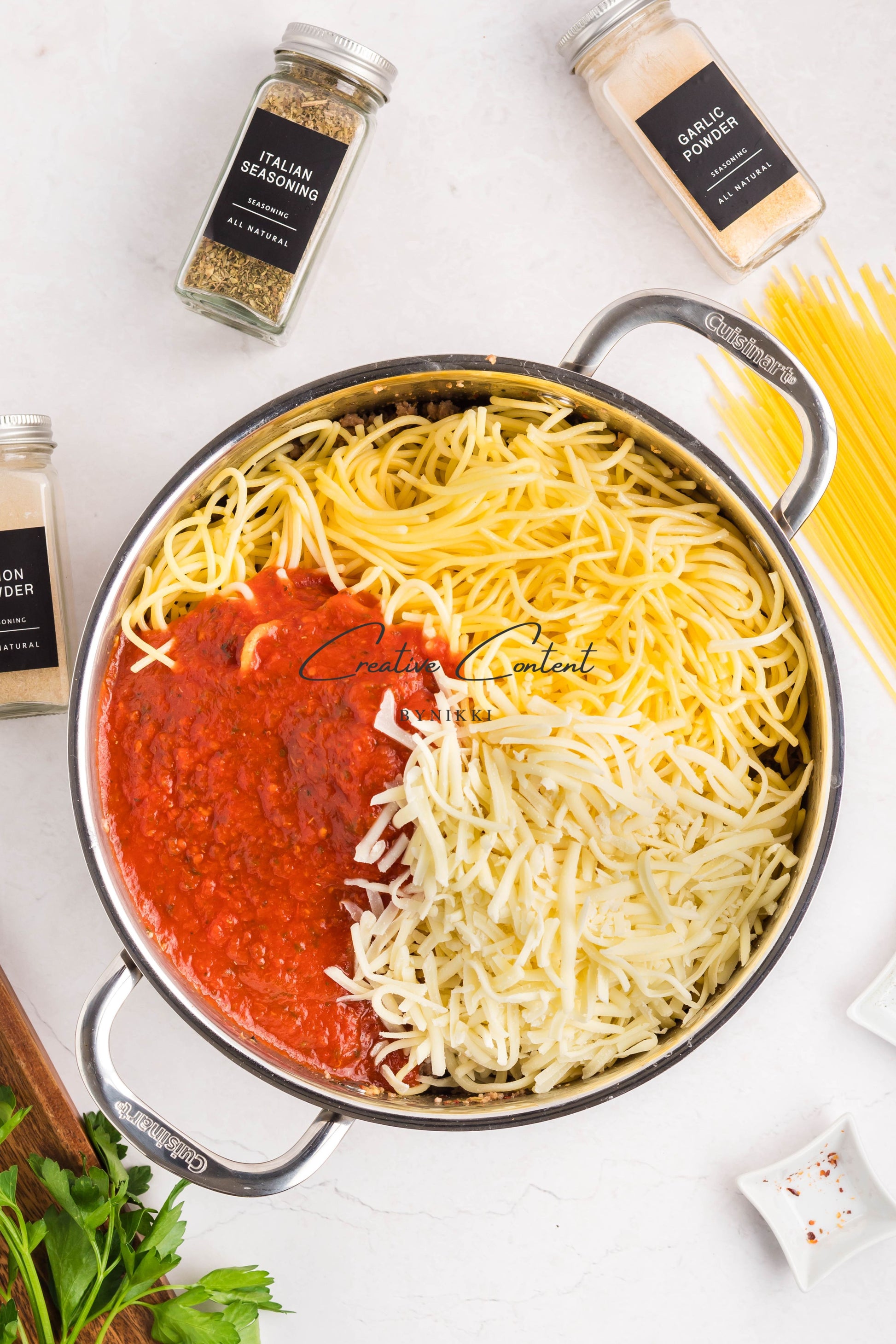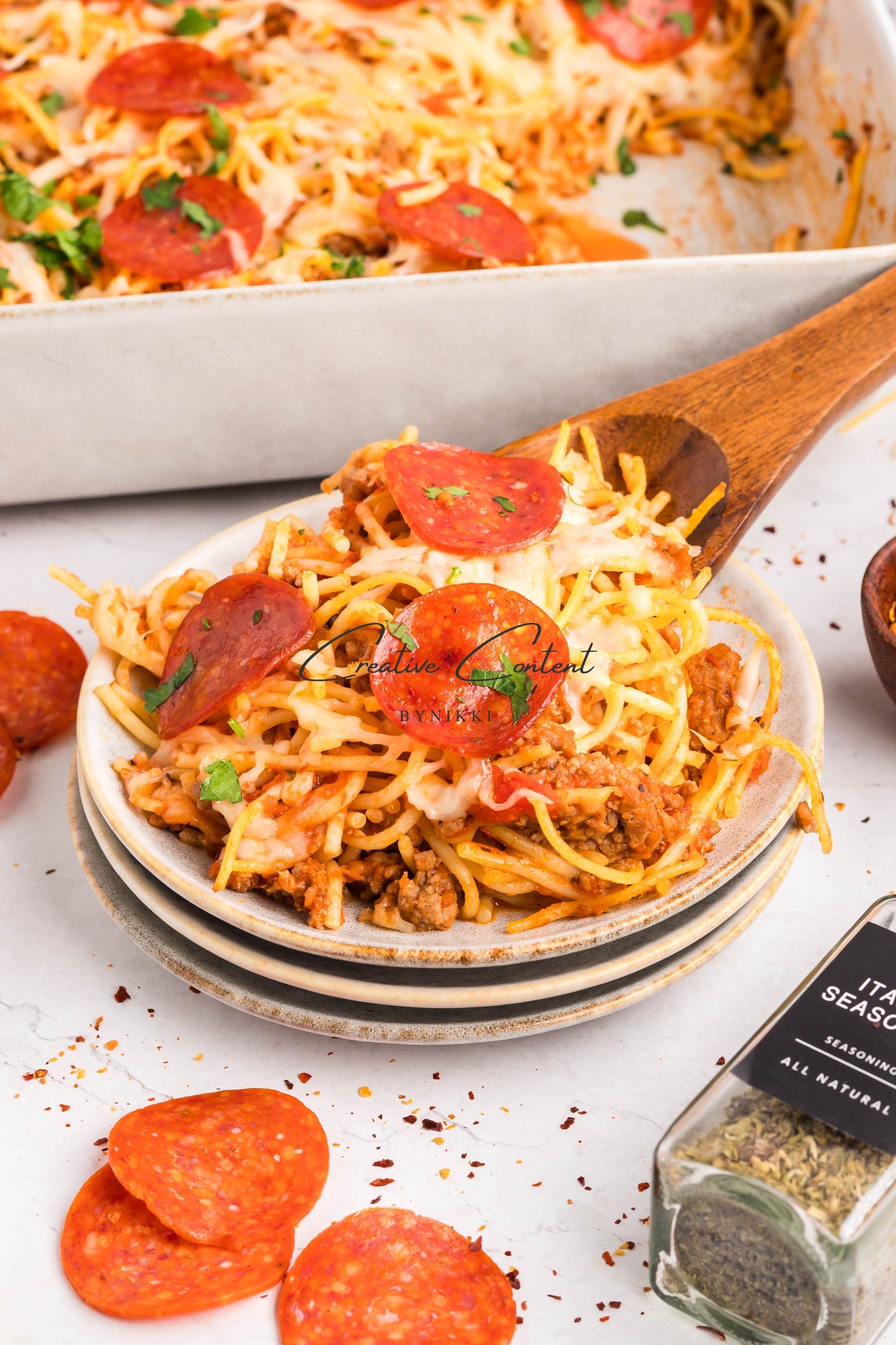 - Ingredients: Spaghetti, Italian sausage, Italian seasoning, garlic powder, onion powder, red pepper flakes, coarse kosher salt, black pepper, spaghetti sauce, shredded mozzarella cheese, sliced pepperoni, and parsley