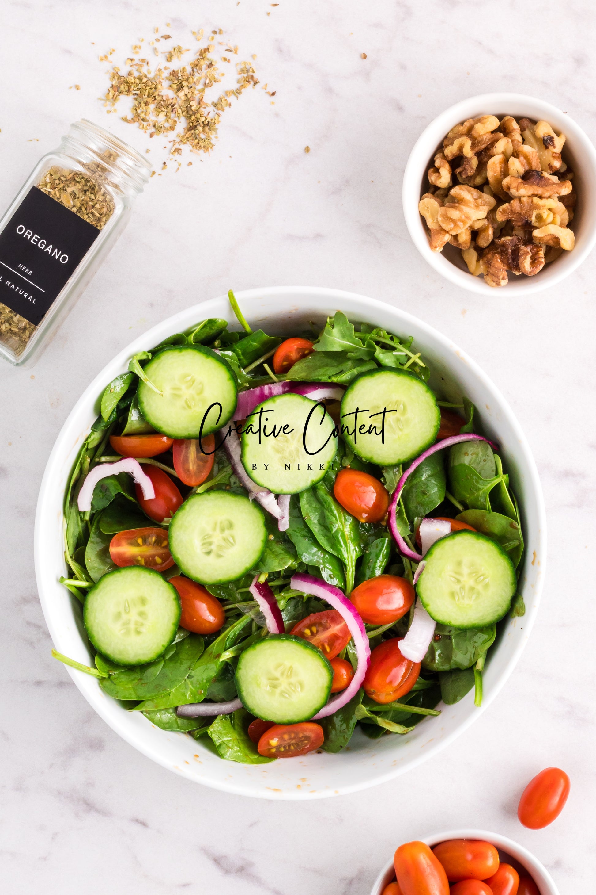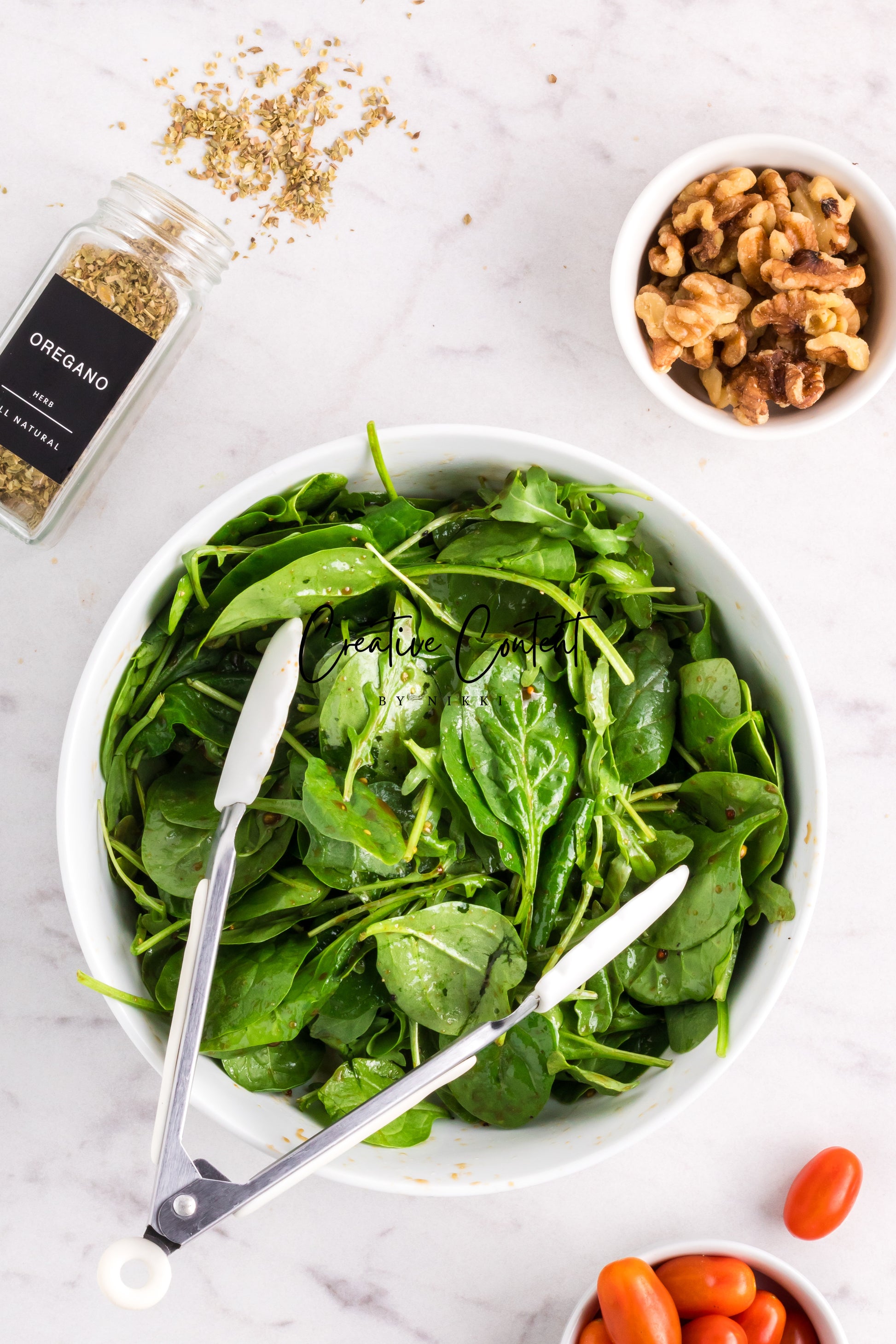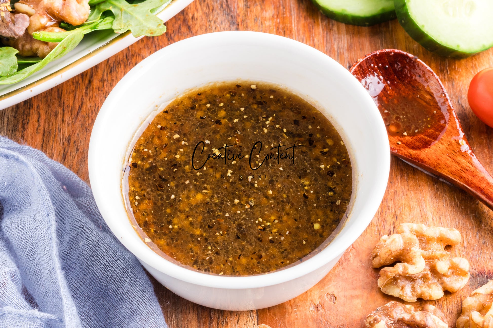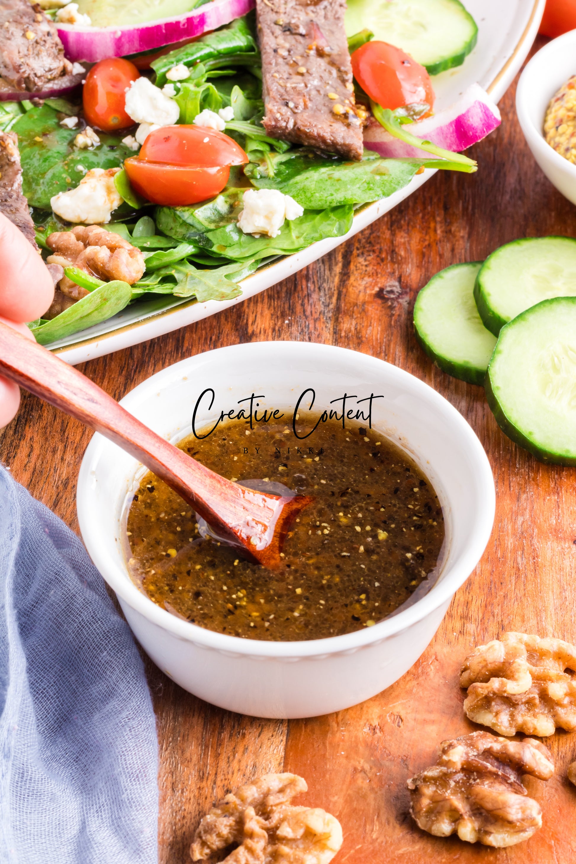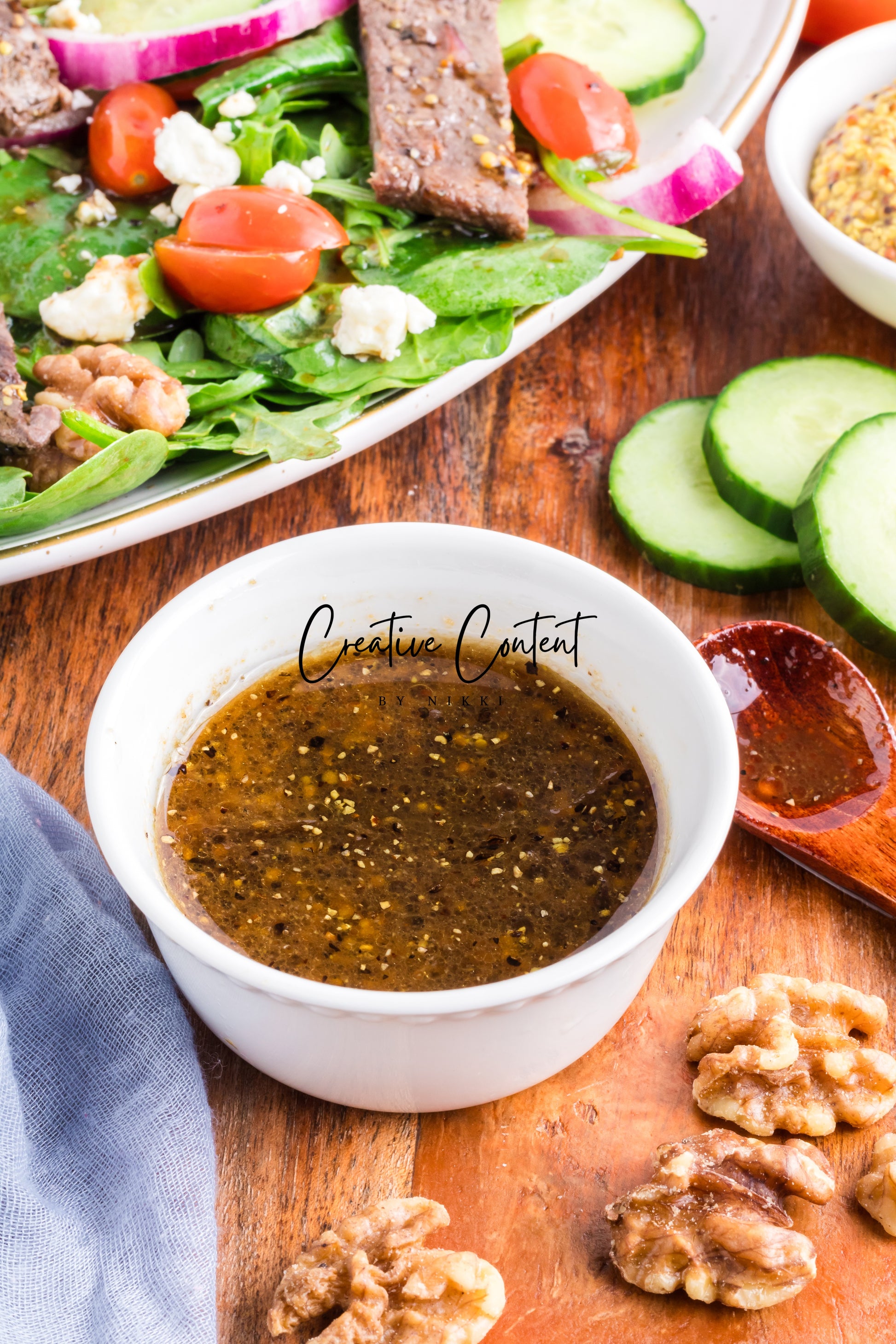 Featured Ingredients; balsamic vinegar, avocado oil, honey, grainy mustard, Dijon mustard, garlic powder, coarse kosher salt, black pepper, garlic cloves, dried oregano, ribeye steak, arugula, spinach, cherry tomatoes, walnuts, red onions, English cucumber, and blue cheese.