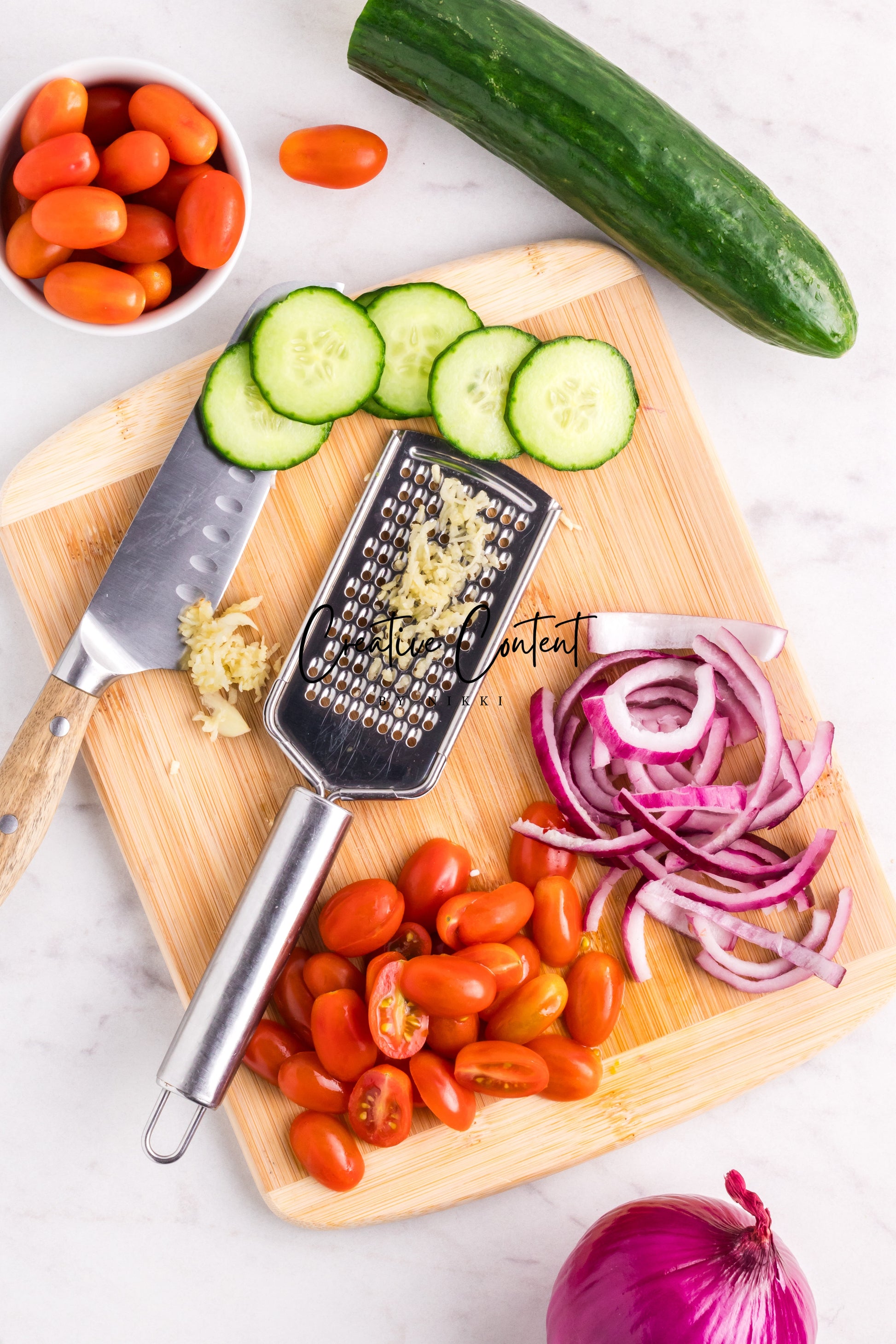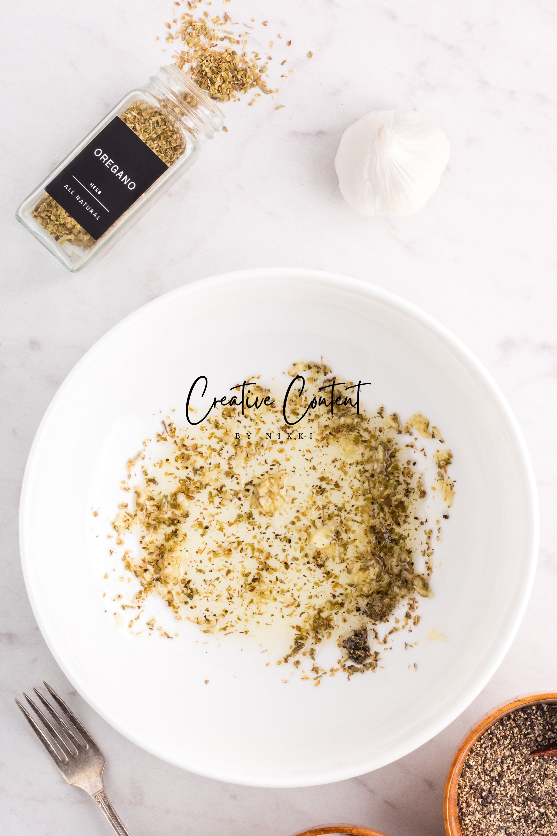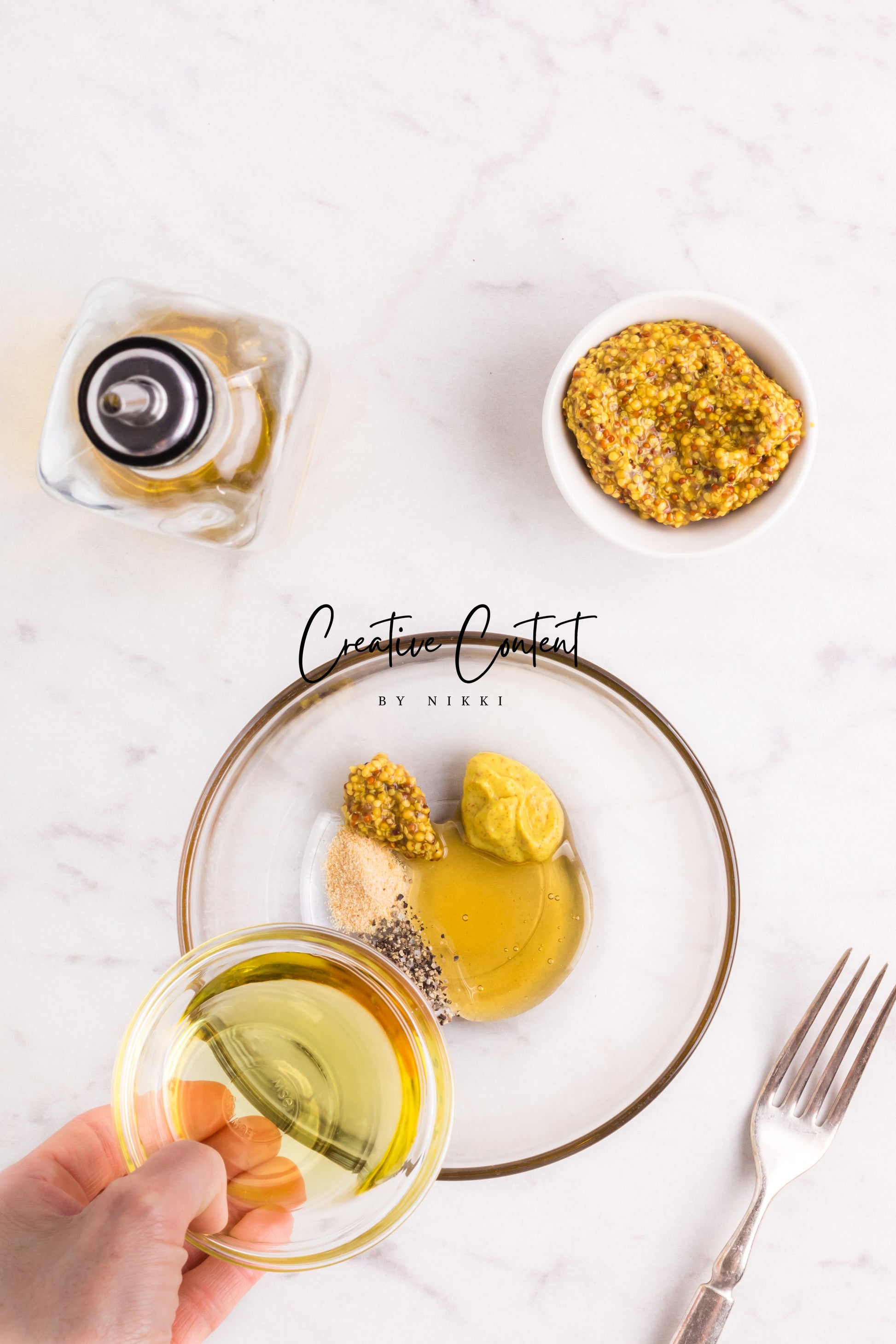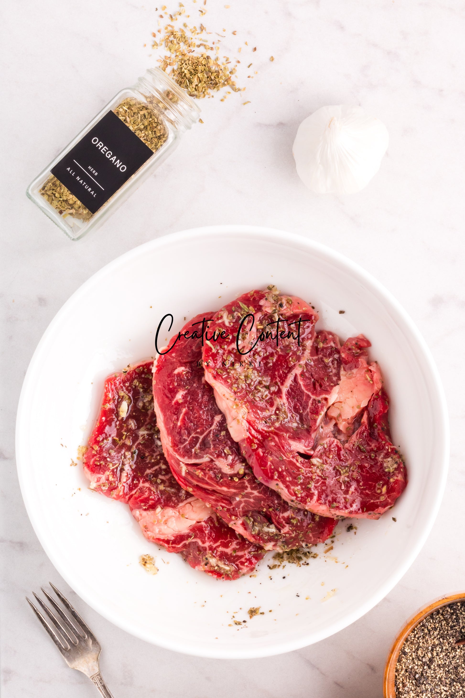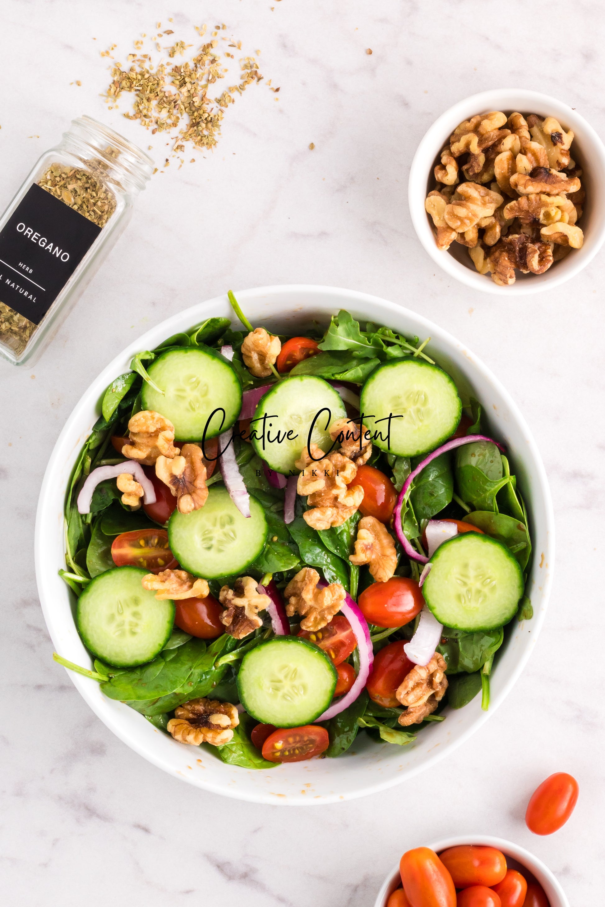 Featured Ingredients; balsamic vinegar, avocado oil, honey, grainy mustard, Dijon mustard, garlic powder, coarse kosher salt, black pepper, garlic cloves, dried oregano, ribeye steak, arugula, spinach, cherry tomatoes, walnuts, red onions, English cucumber, and blue cheese.