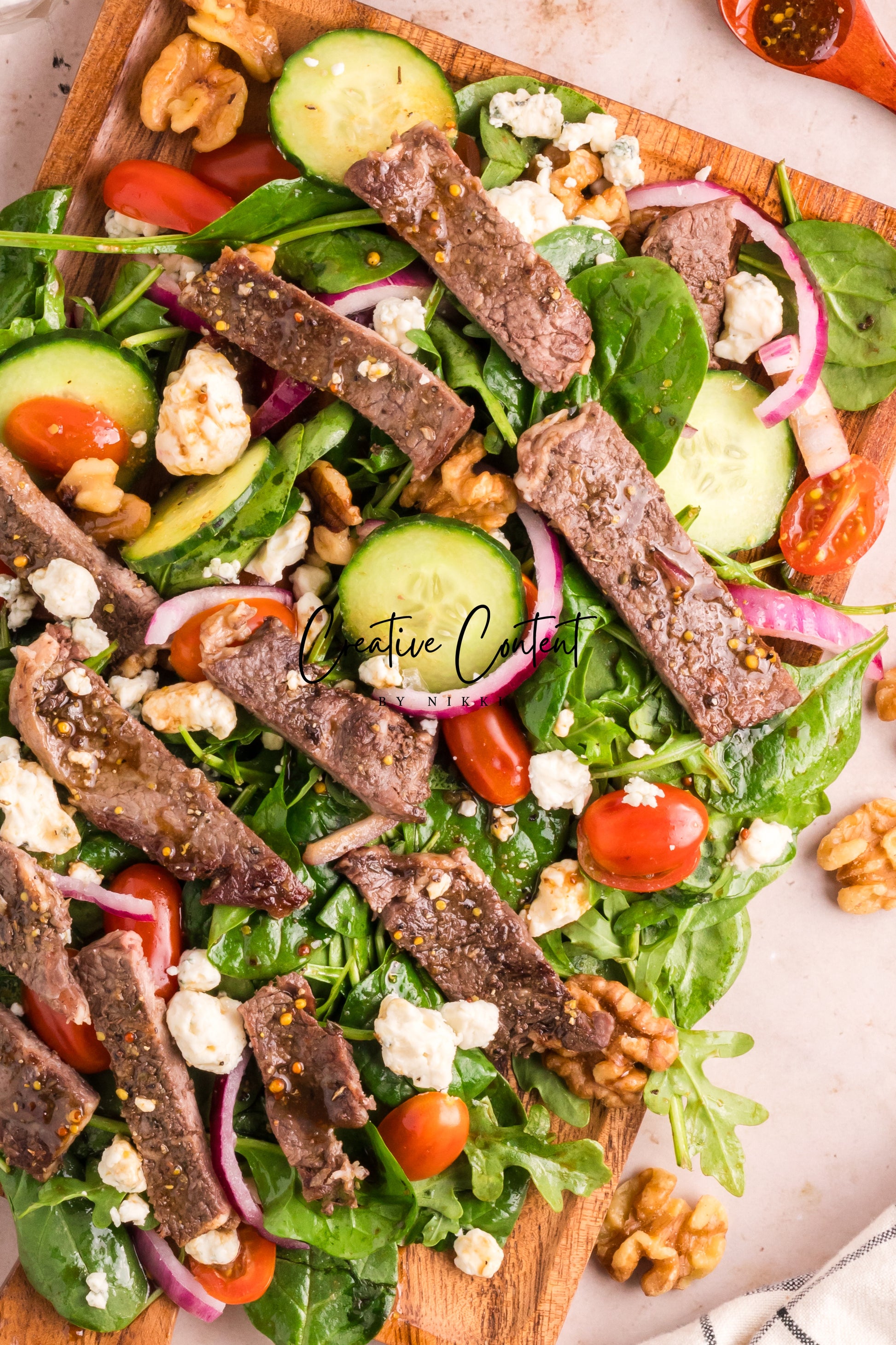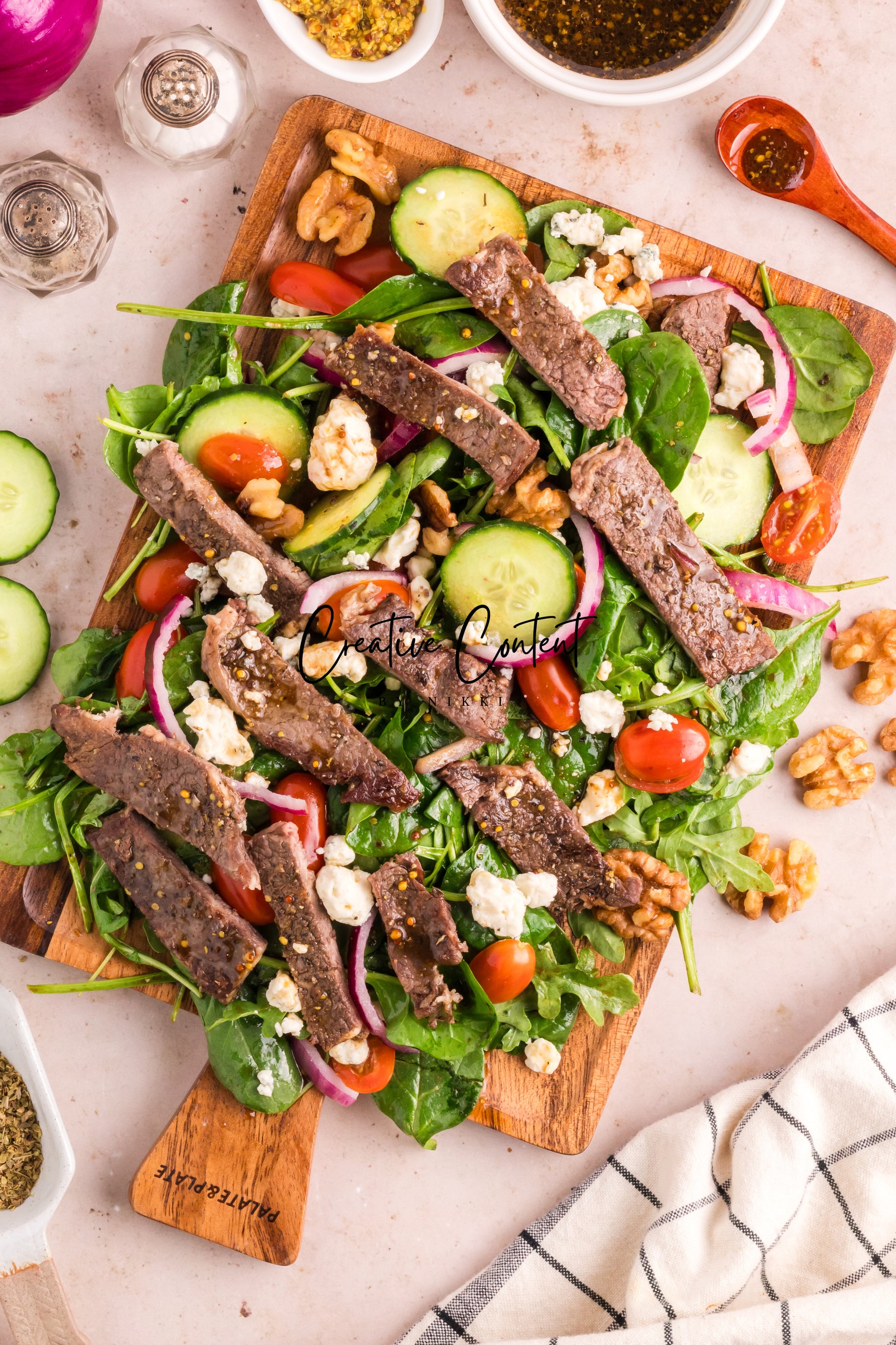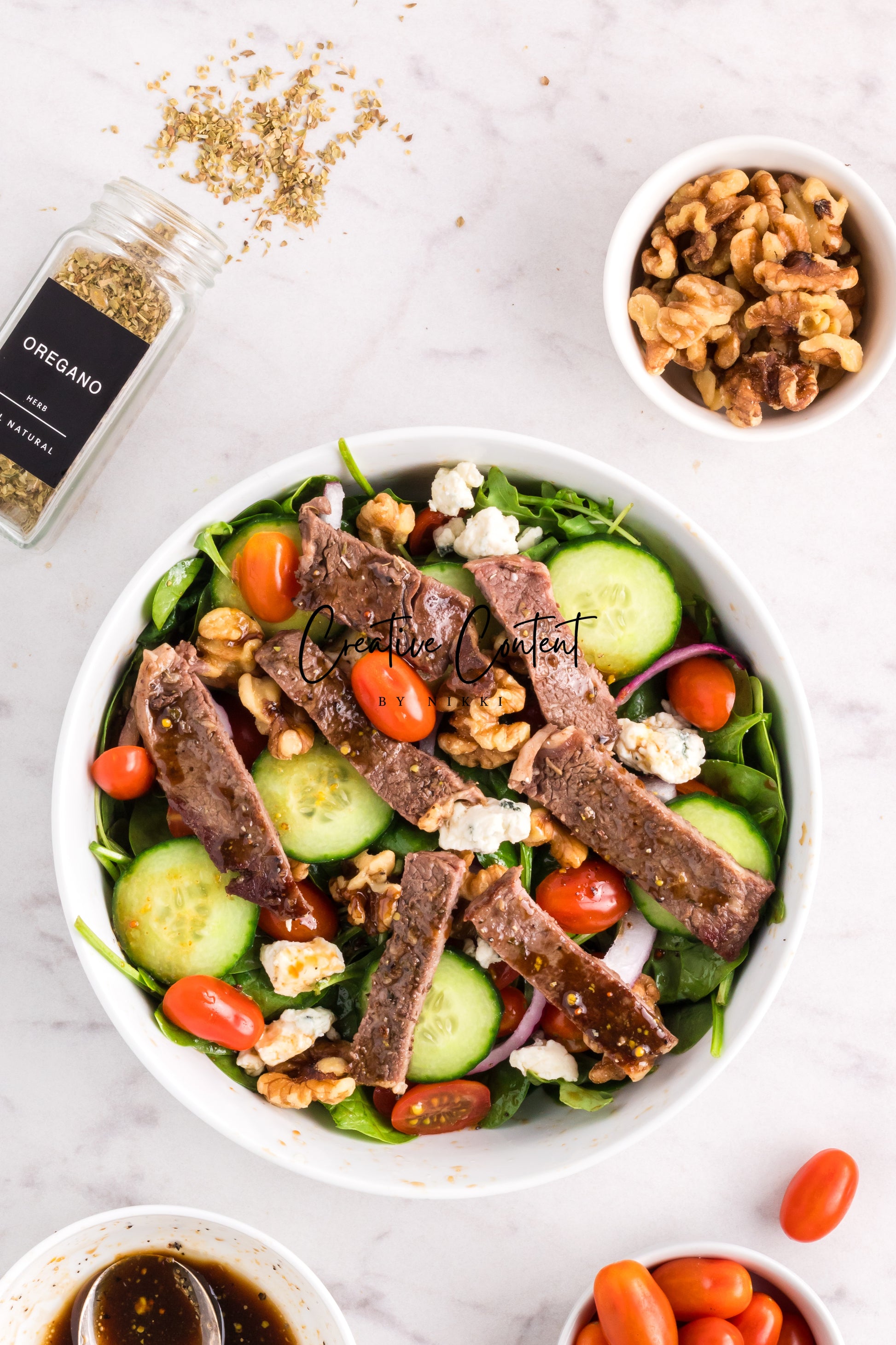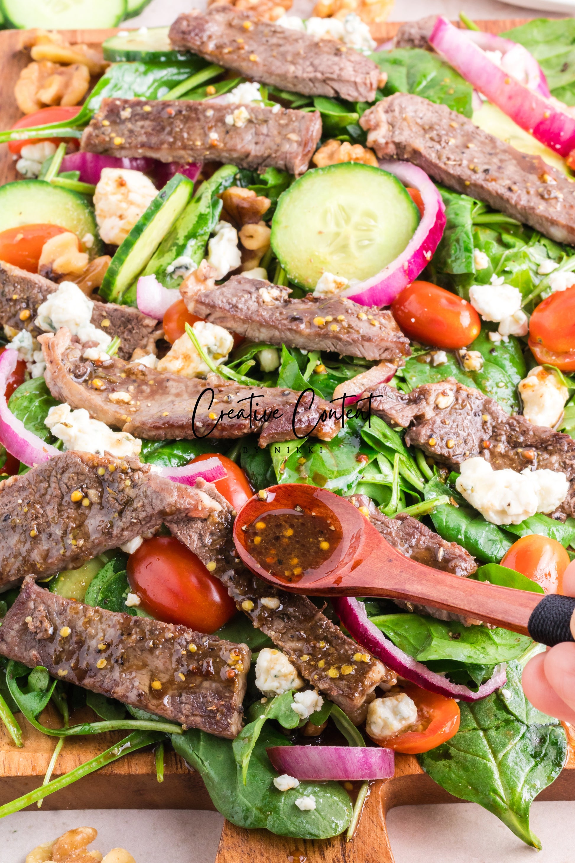 Featured Ingredients; balsamic vinegar, avocado oil, honey, grainy mustard, Dijon mustard, garlic powder, coarse kosher salt, black pepper, garlic cloves, dried oregano, ribeye steak, arugula, spinach, cherry tomatoes, walnuts, red onions, English cucumber, and blue cheese.
