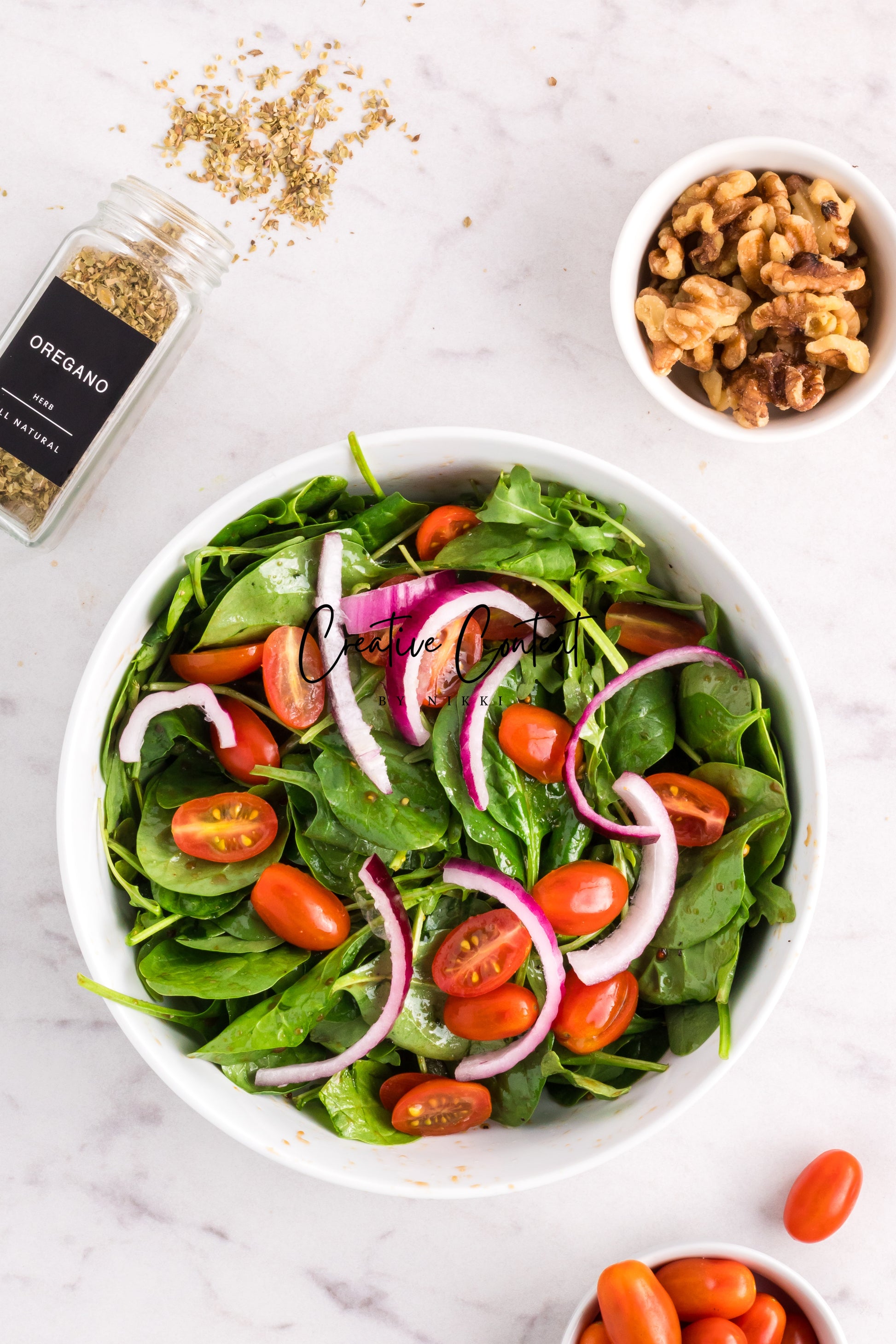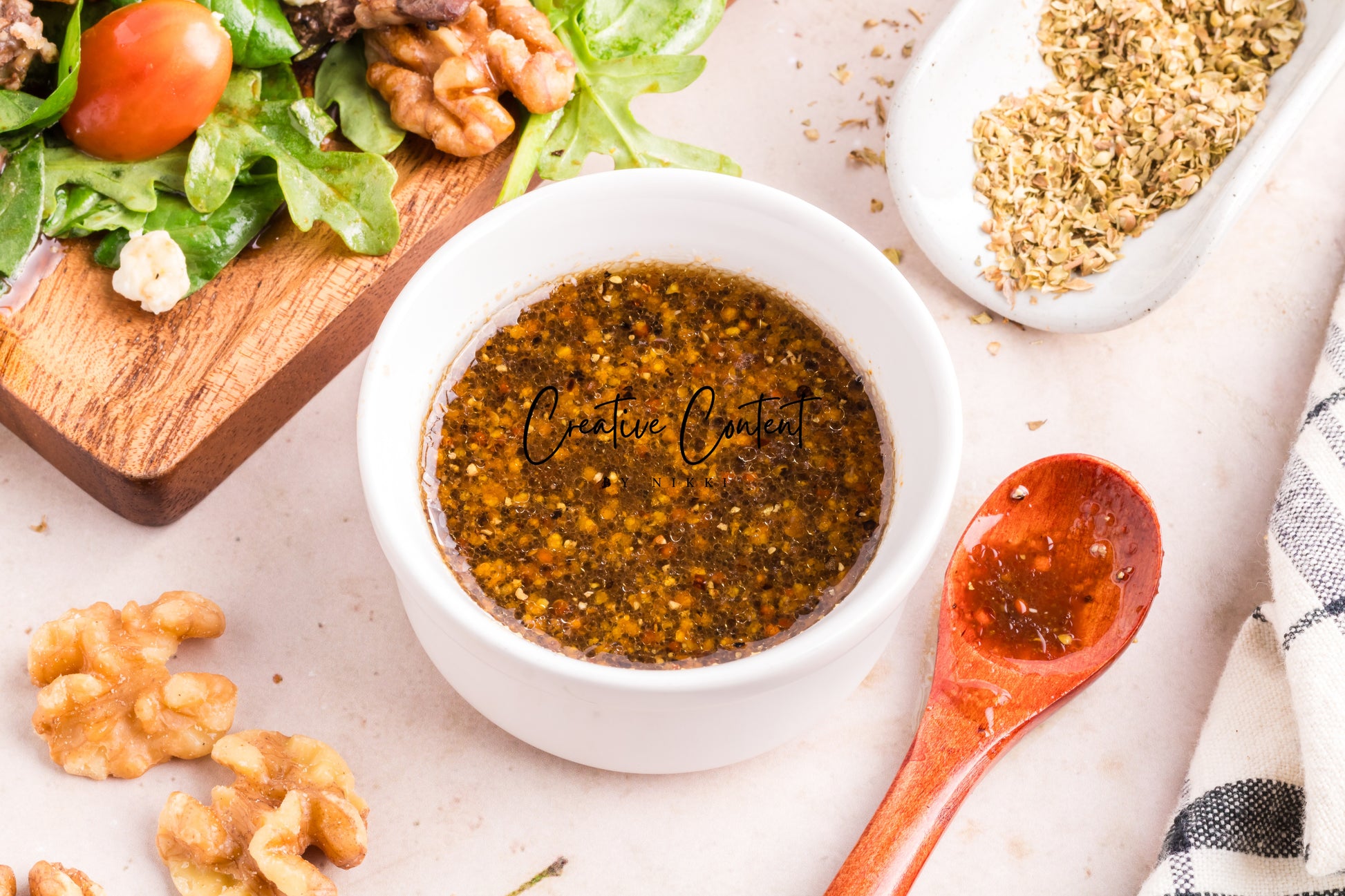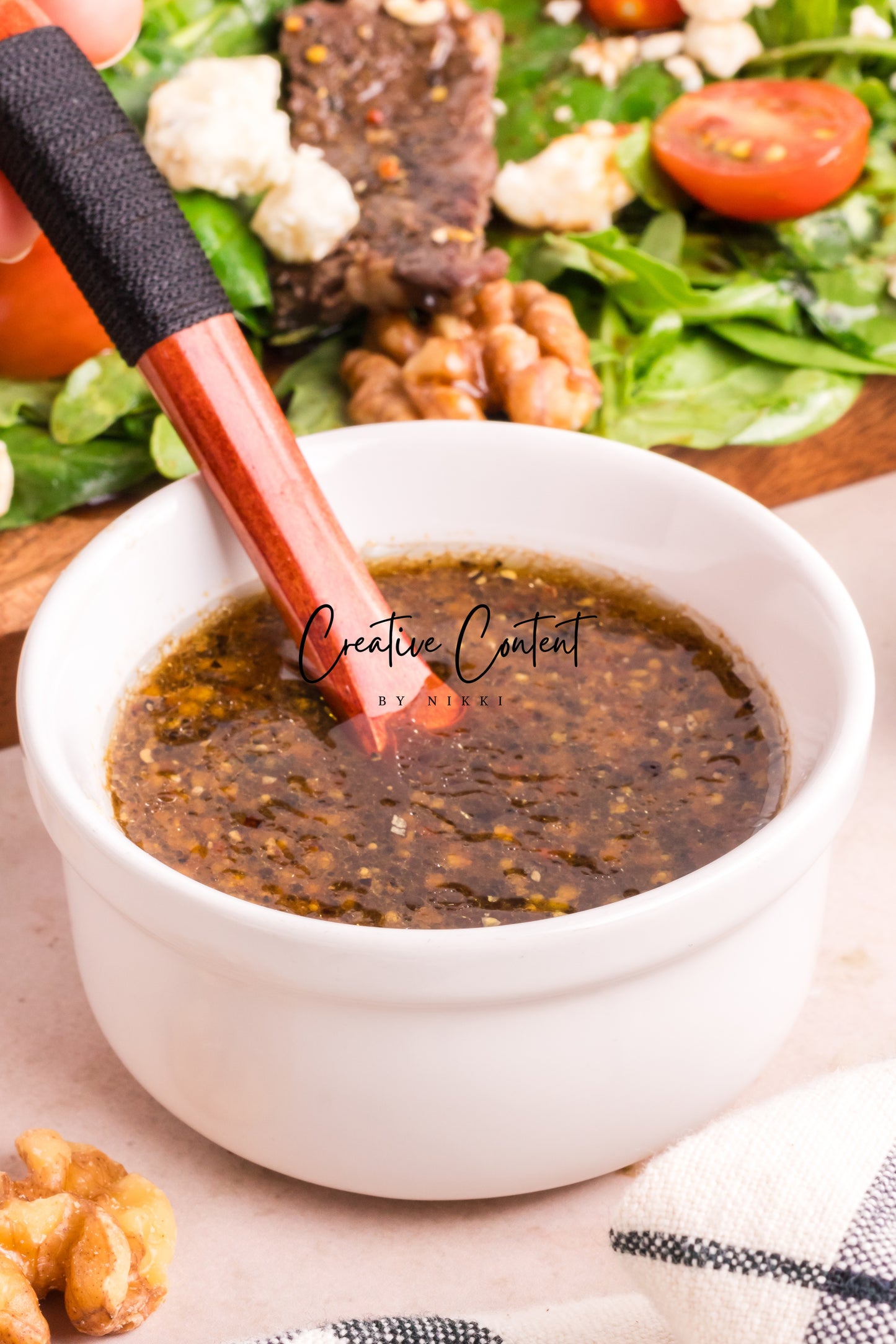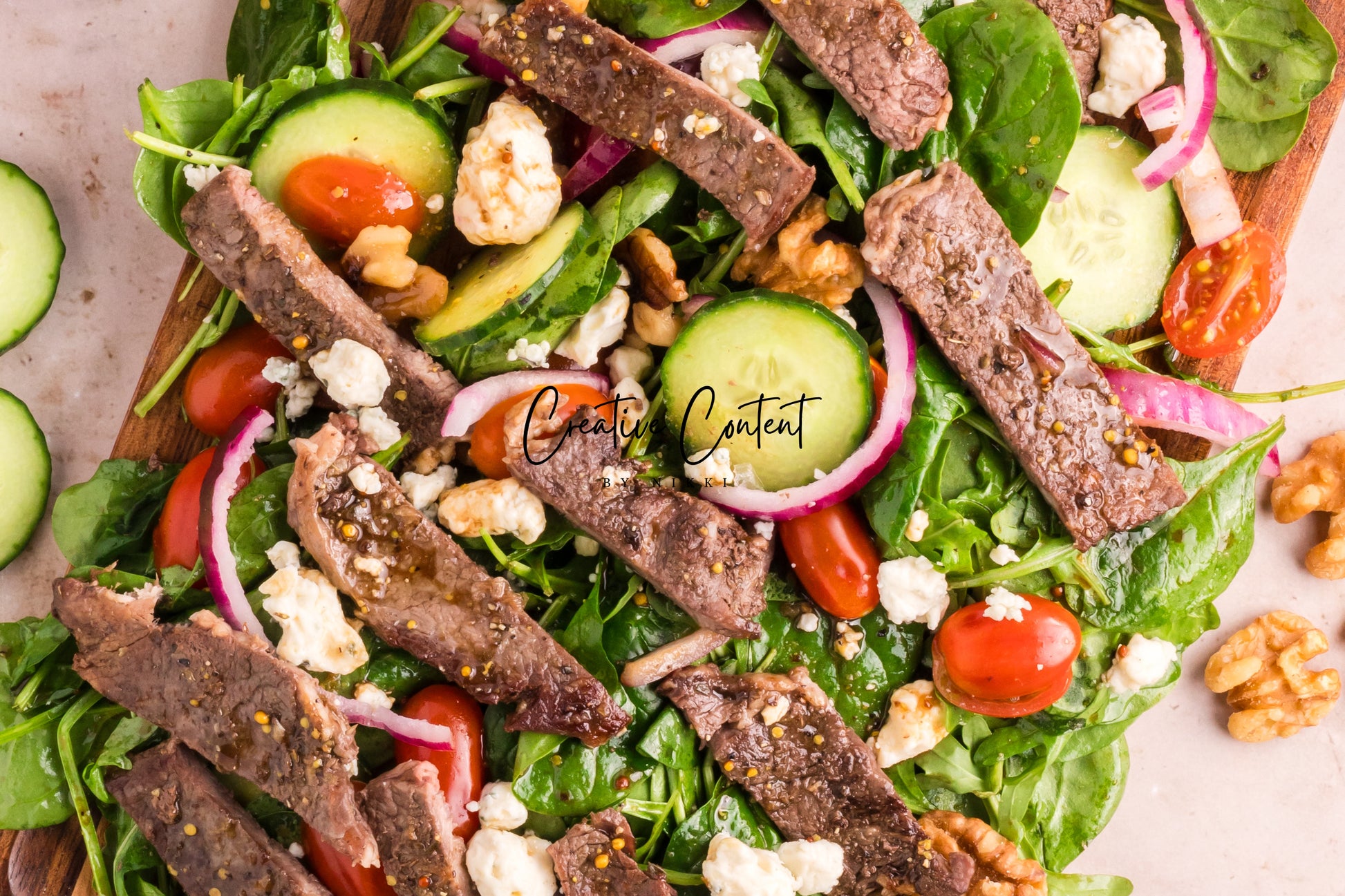 Featured Ingredients; balsamic vinegar, avocado oil, honey, grainy mustard, Dijon mustard, garlic powder, coarse kosher salt, black pepper, garlic cloves, dried oregano, ribeye steak, arugula, spinach, cherry tomatoes, walnuts, red onions, English cucumber, and blue cheese.