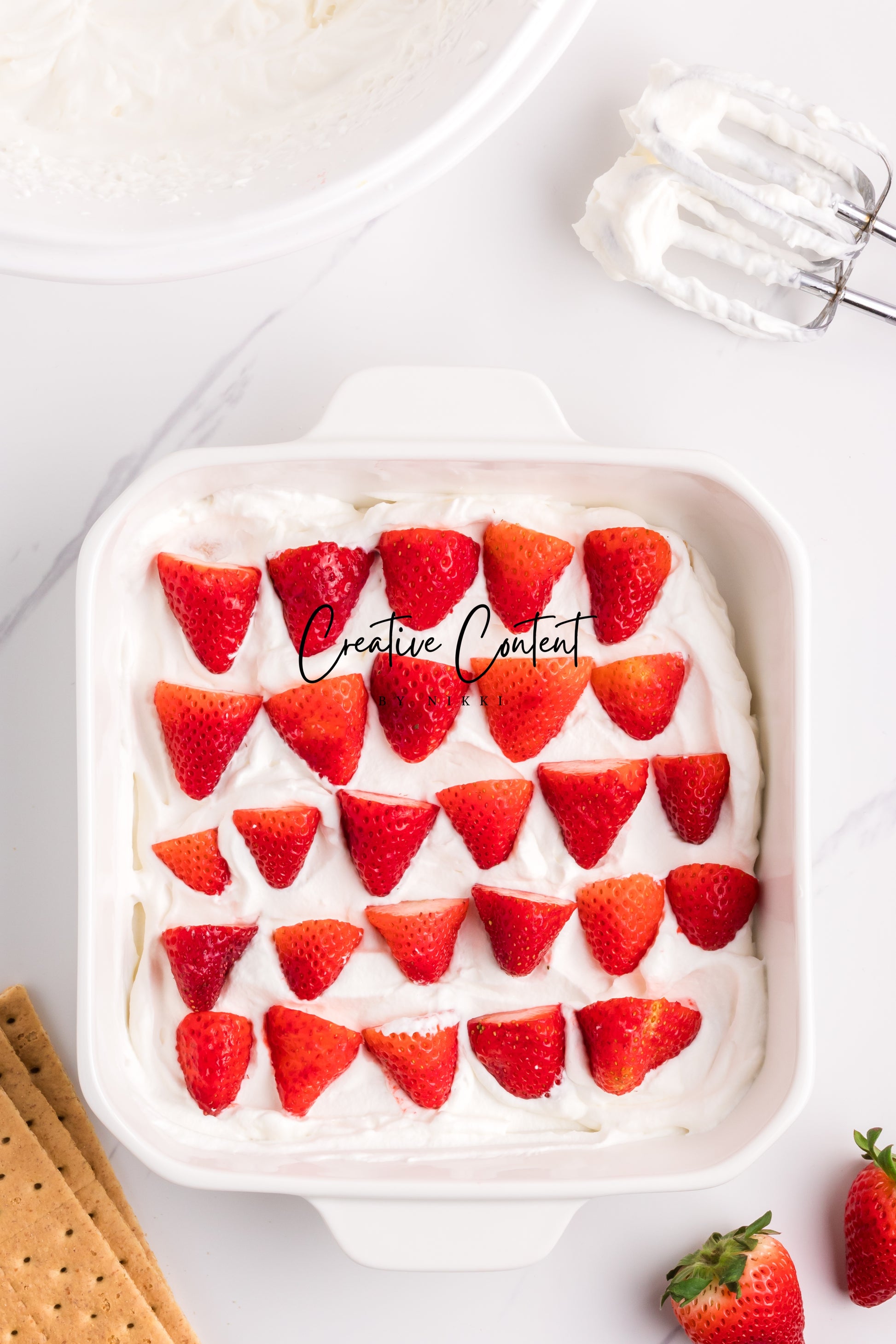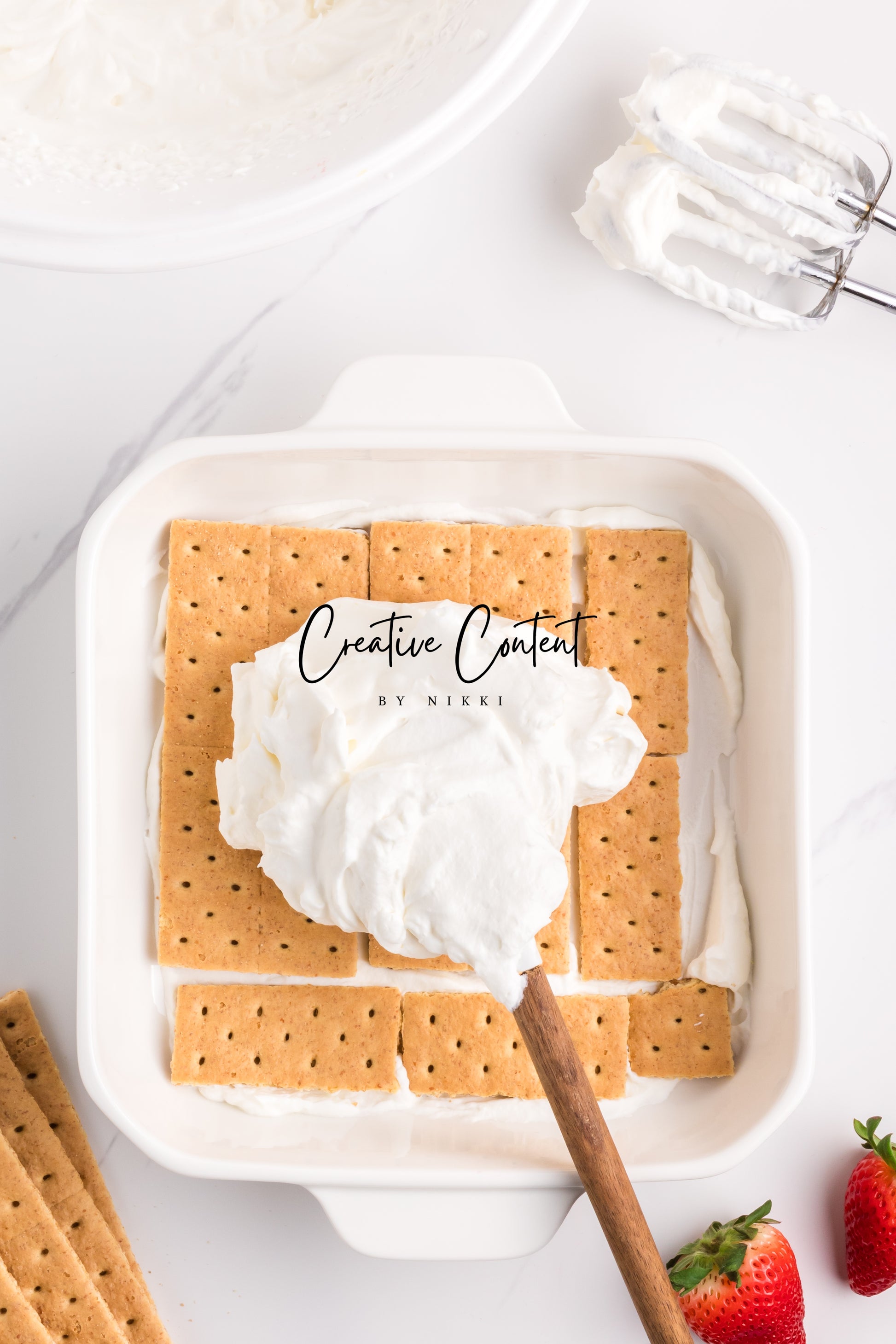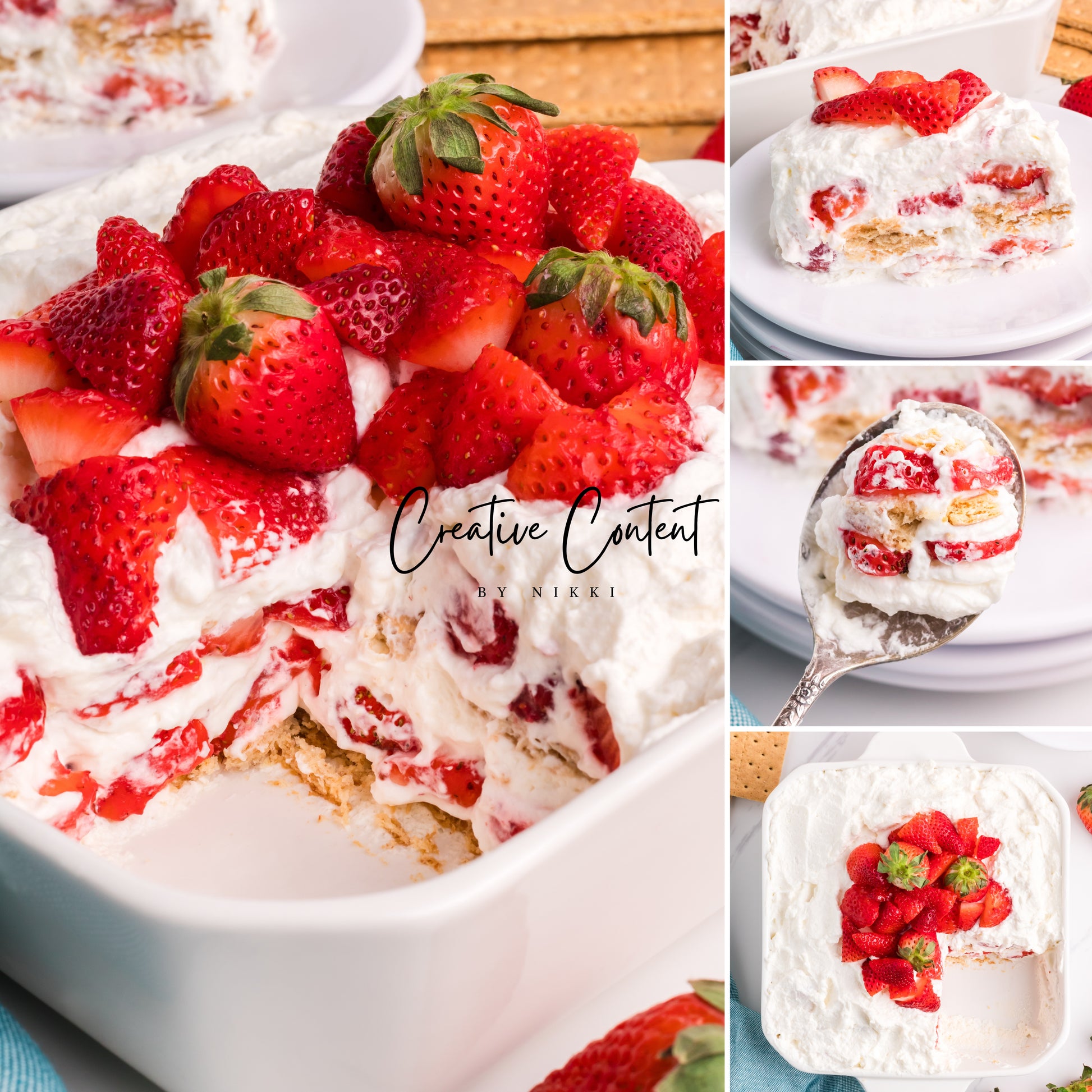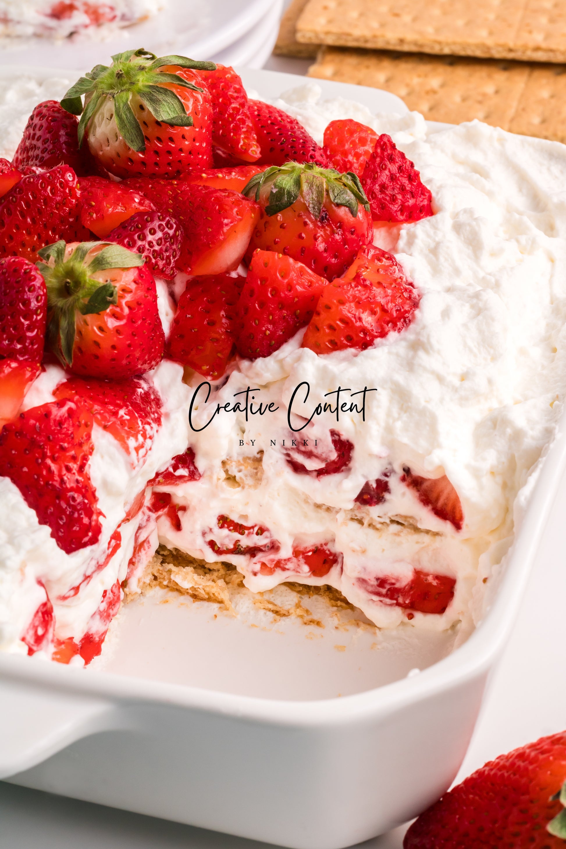 This strawberry icebox cake is the ultimate summertime dessert. The homemade whipped cream, fresh strawberries, and graham crackers that turn into soft cake is a dessert everyone will love. Just 10 minutes is all that is needed to put this beautiful dessert together. You can make it the day before and serve it the next day.