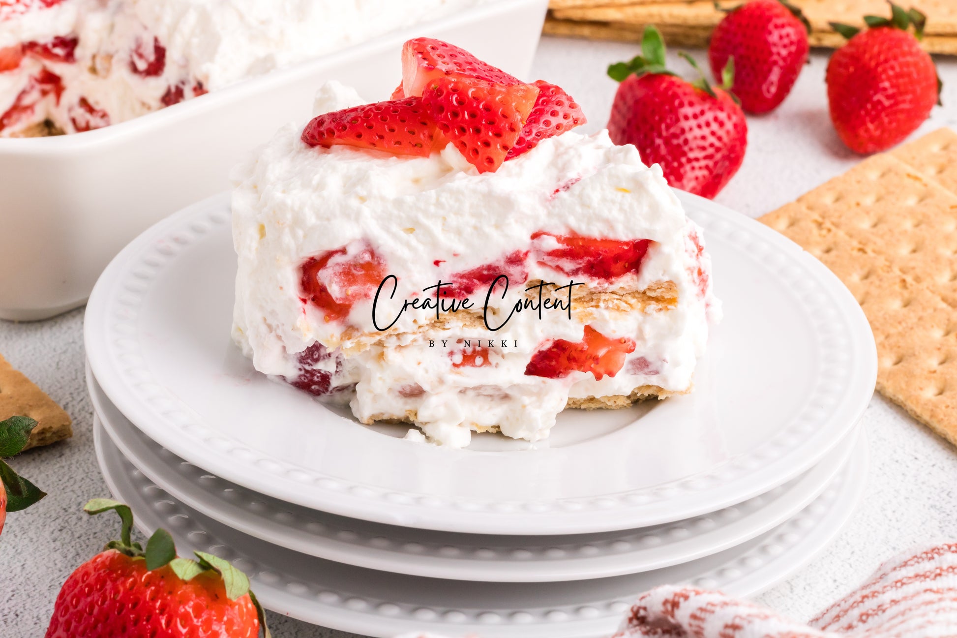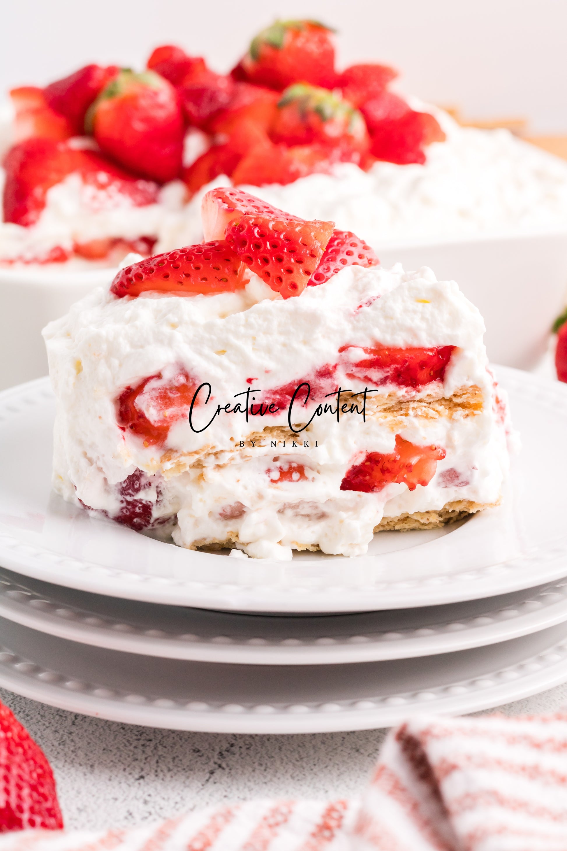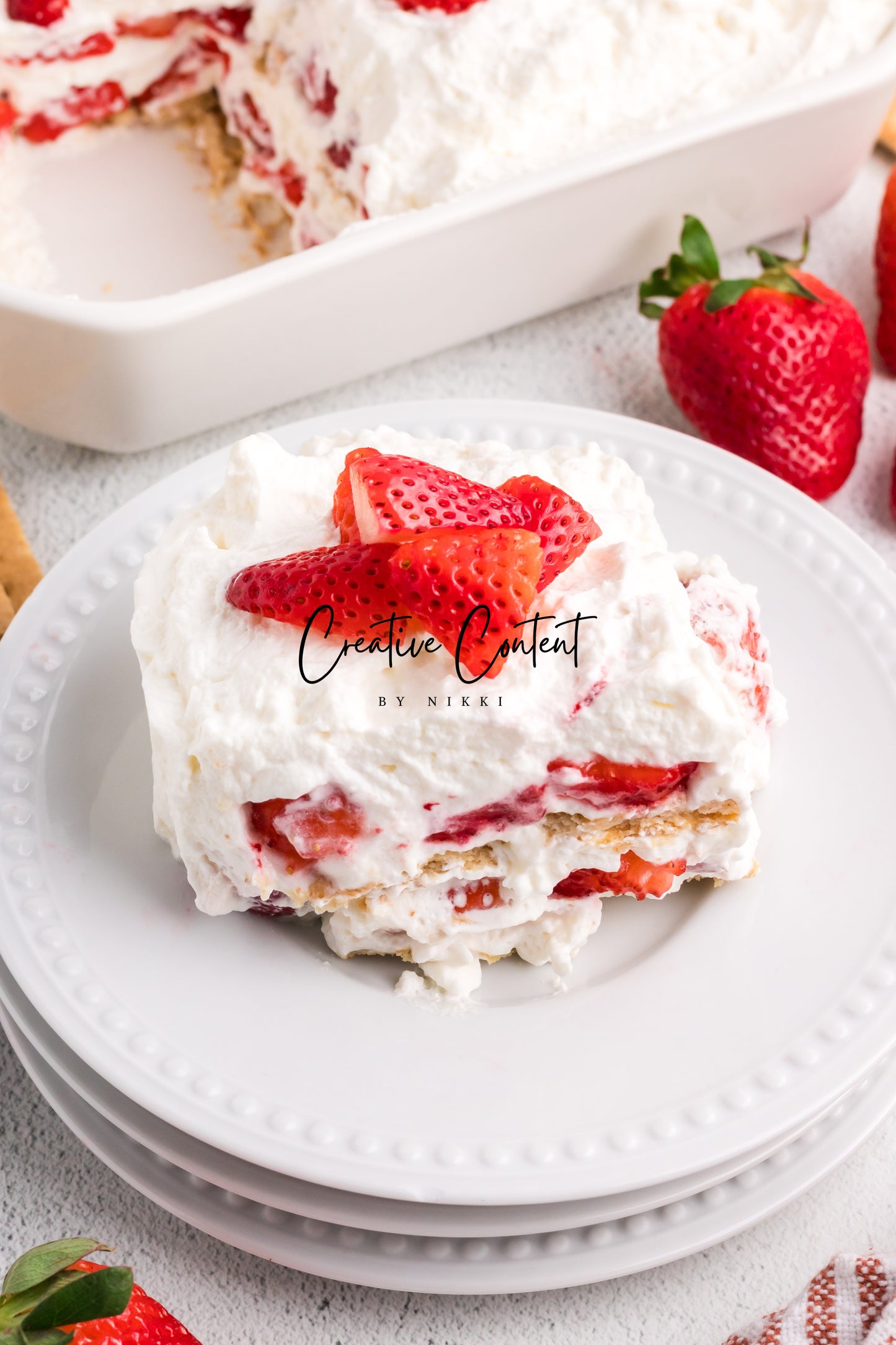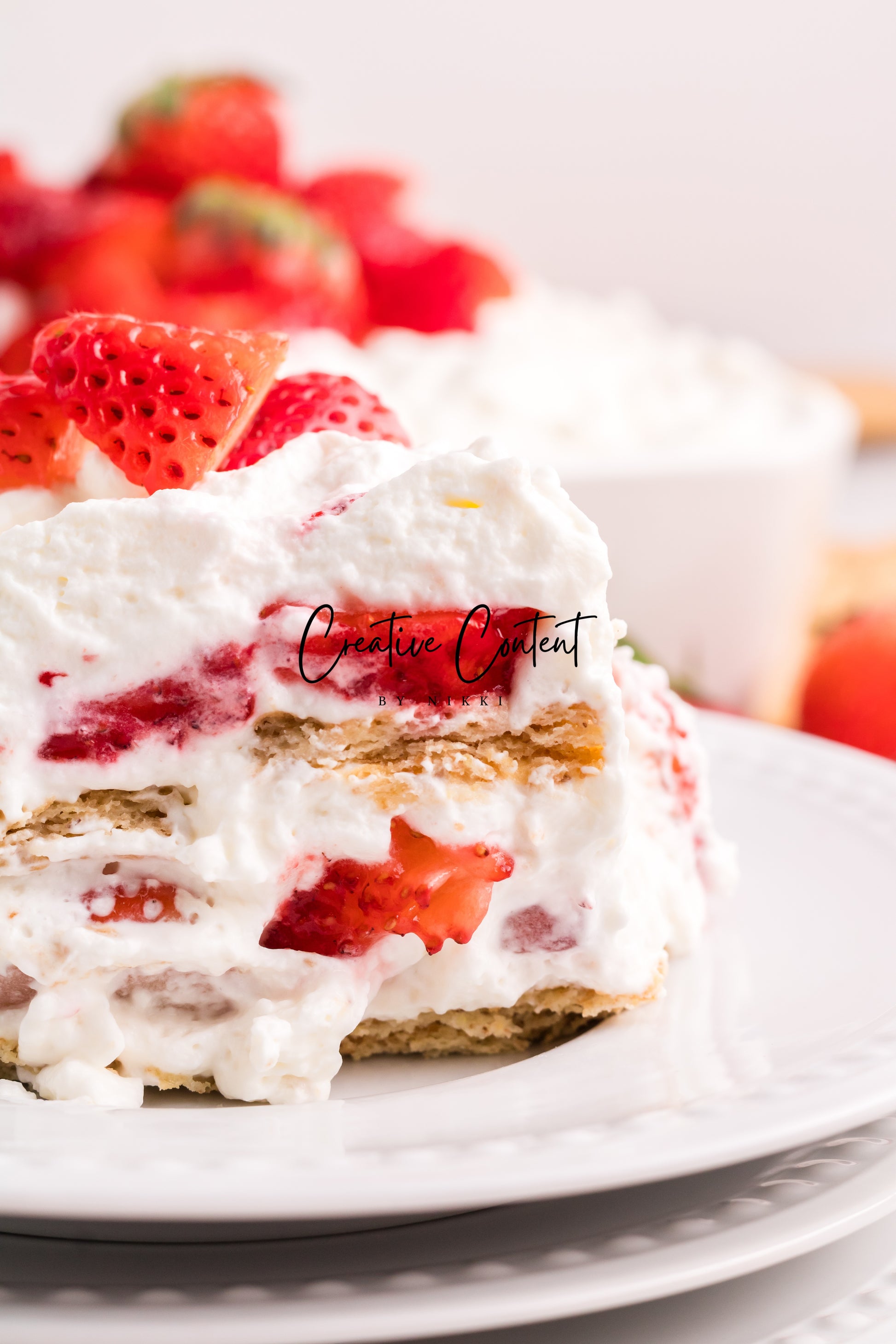 This strawberry icebox cake is the ultimate summertime dessert. The homemade whipped cream, fresh strawberries, and graham crackers that turn into soft cake is a dessert everyone will love. Just 10 minutes is all that is needed to put this beautiful dessert together. You can make it the day before and serve it the next day.