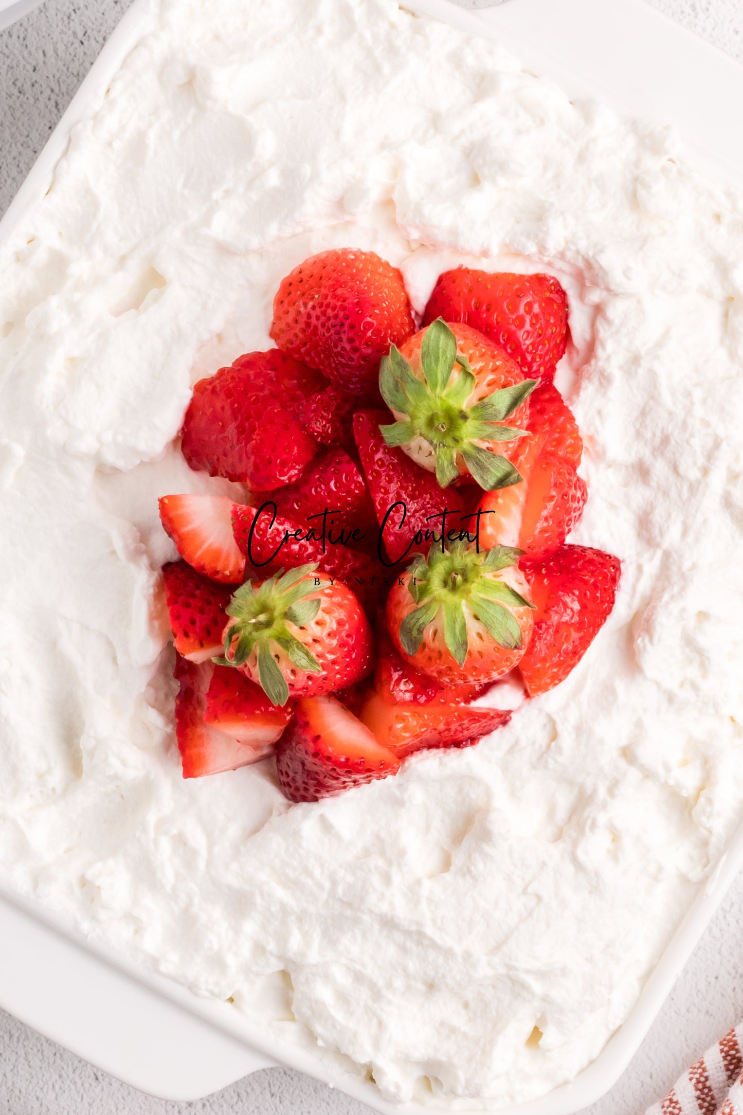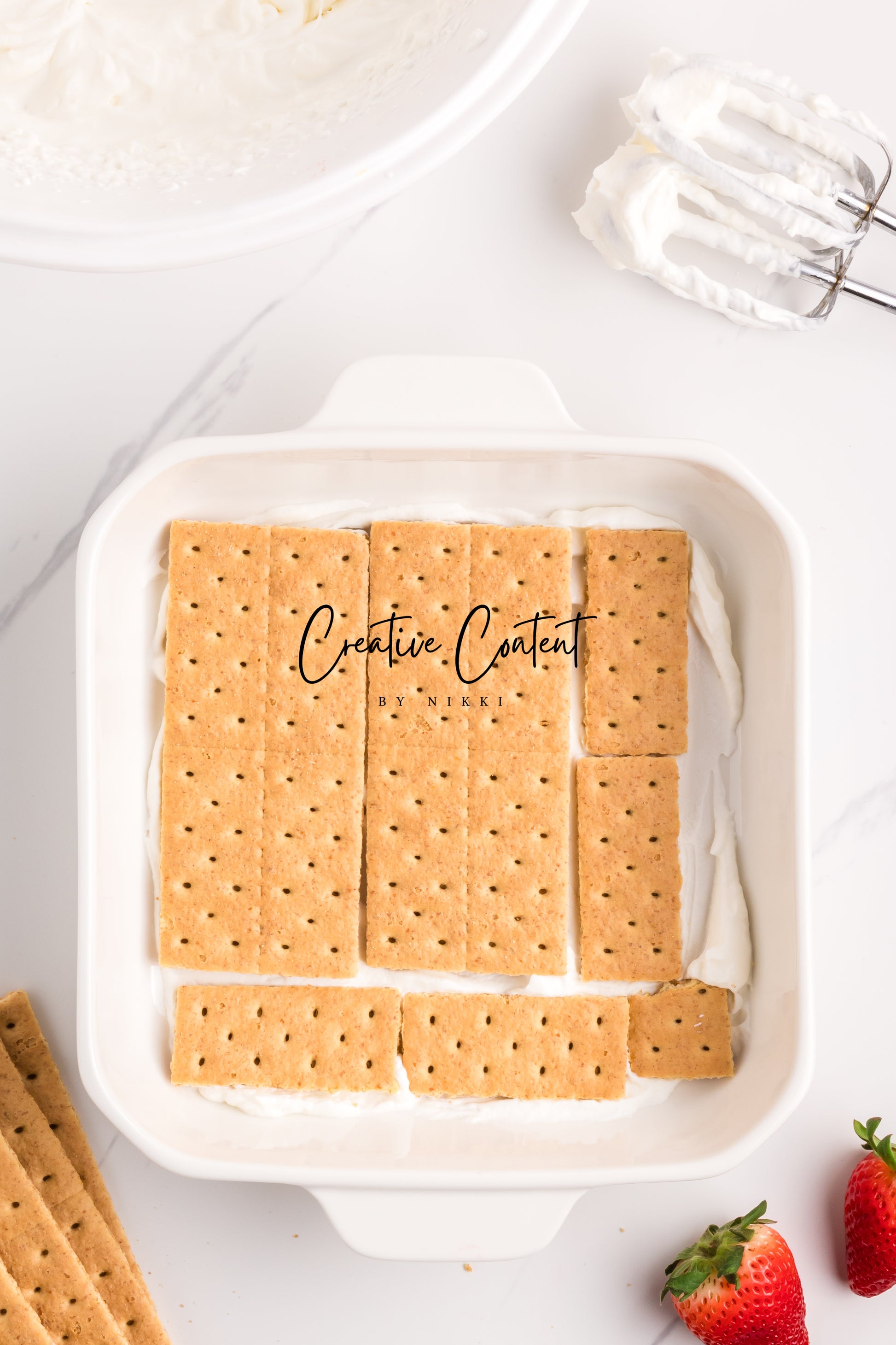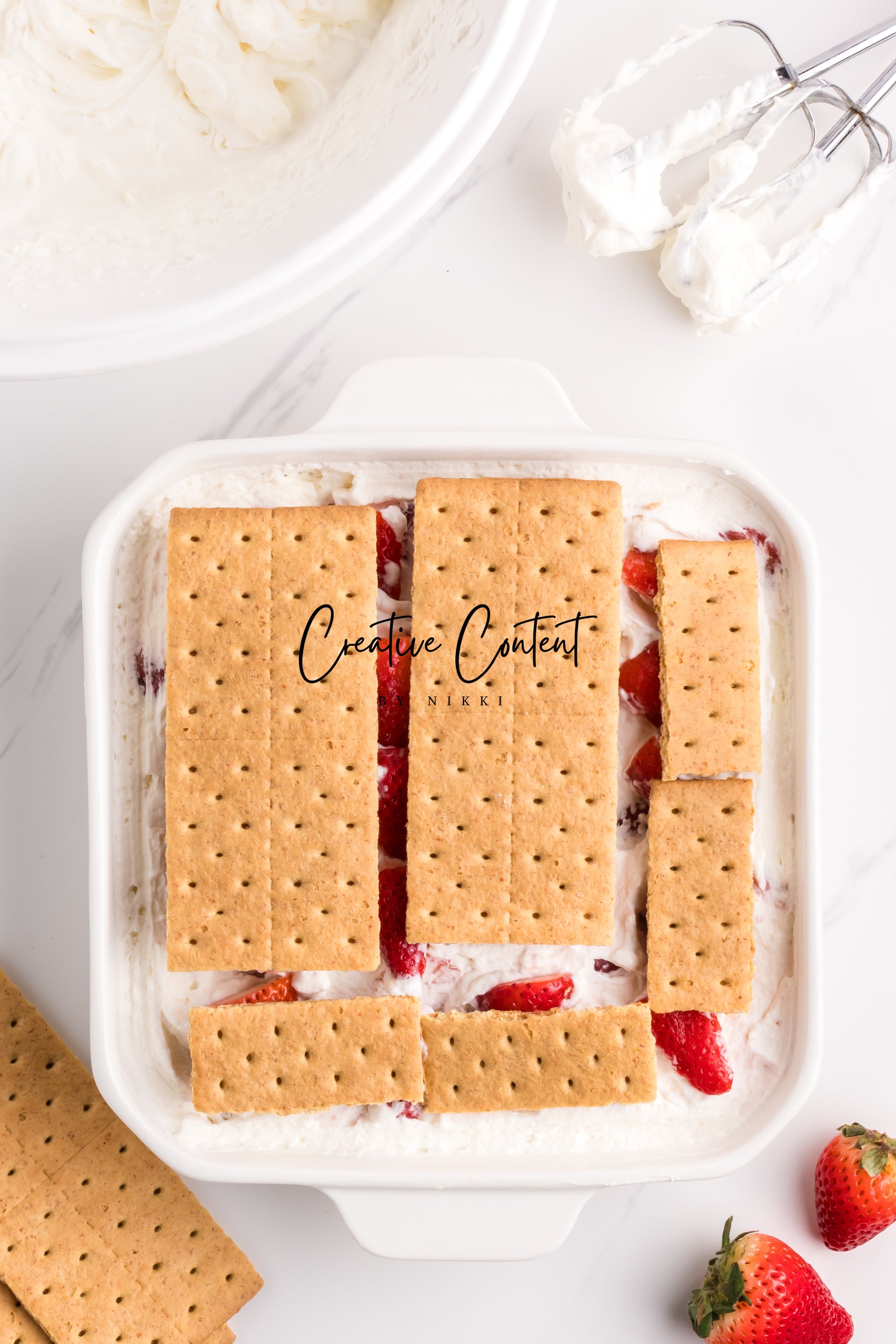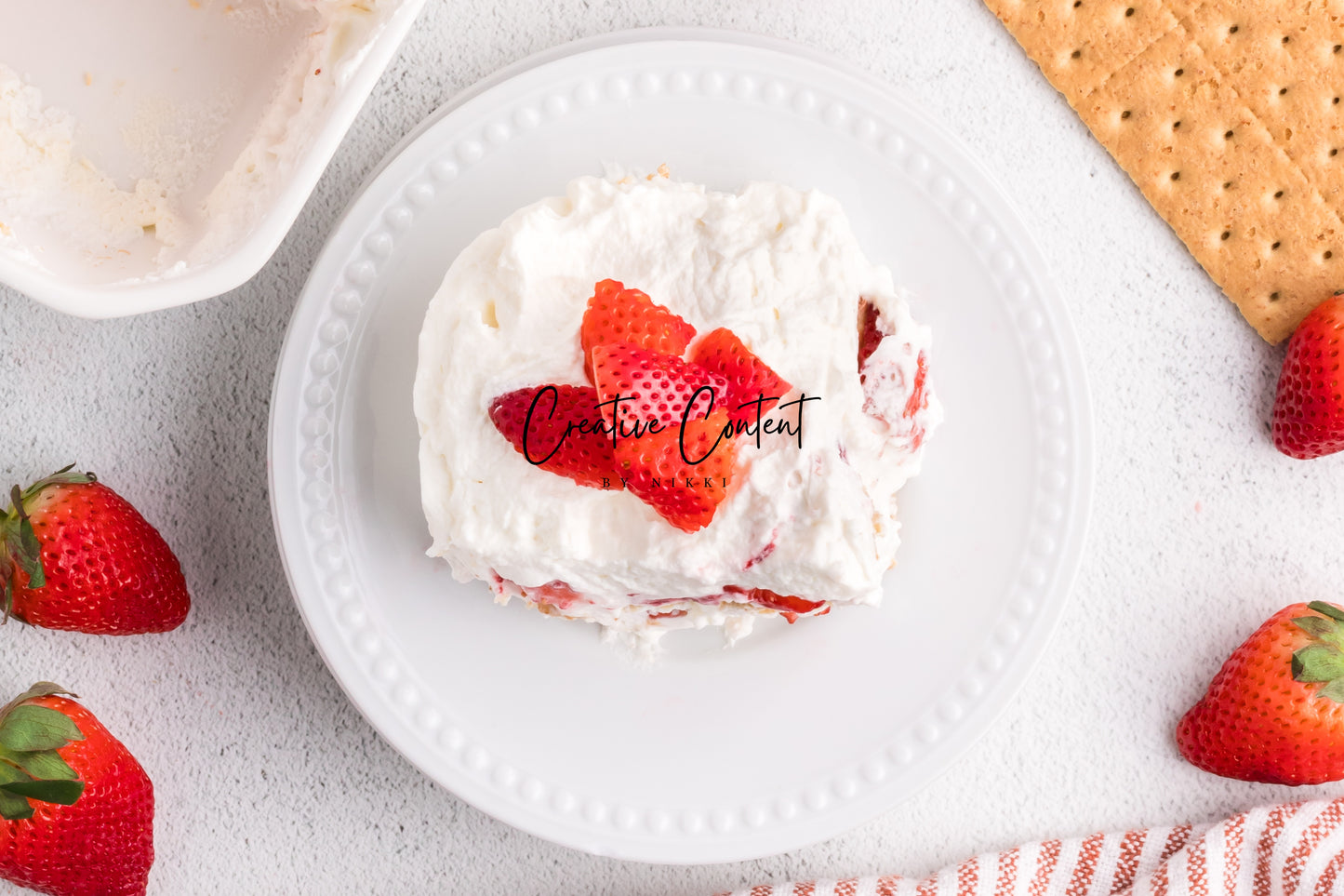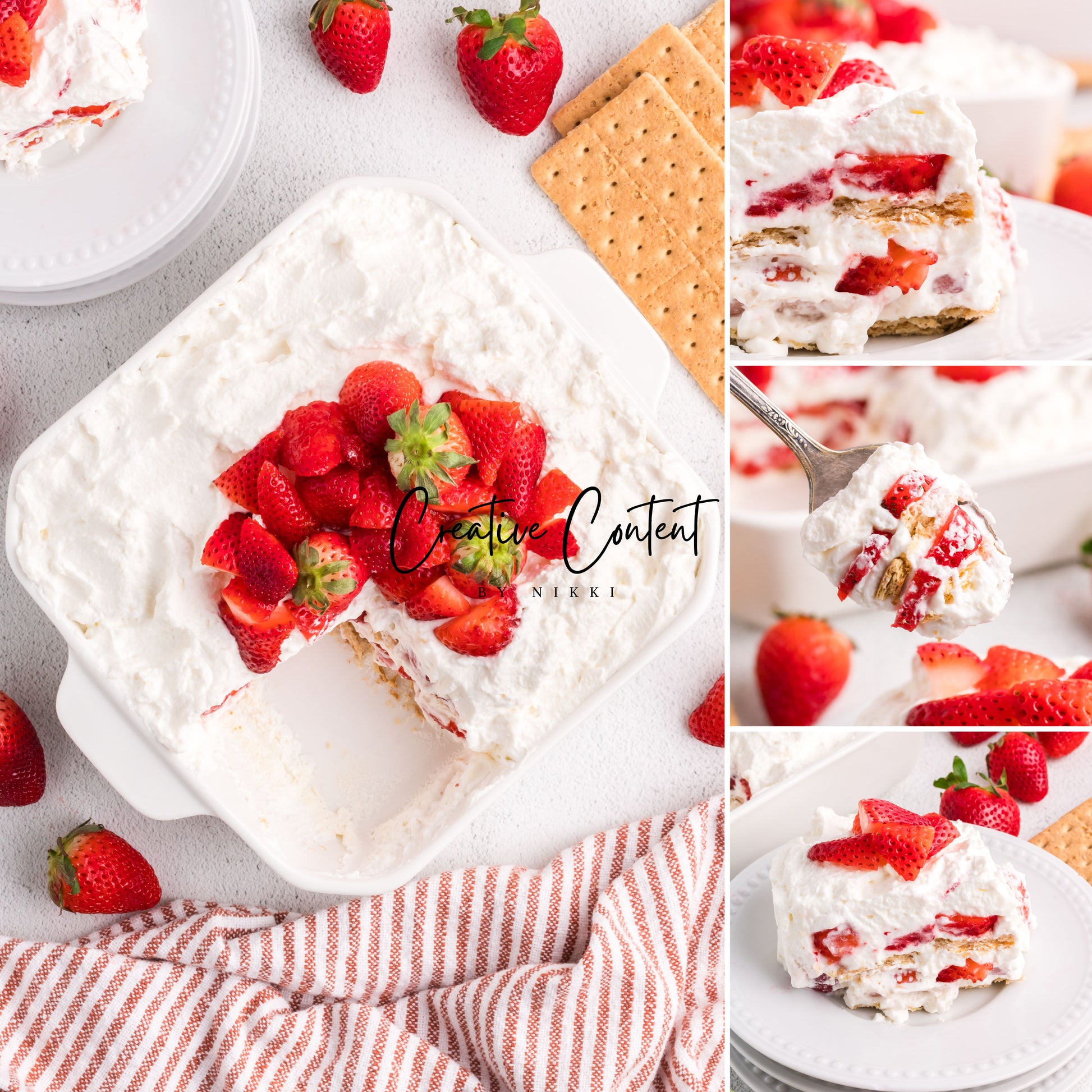 This strawberry icebox cake is the ultimate summertime dessert. The homemade whipped cream, fresh strawberries, and graham crackers that turn into soft cake is a dessert everyone will love. Just 10 minutes is all that is needed to put this beautiful dessert together. You can make it the day before and serve it the next day.