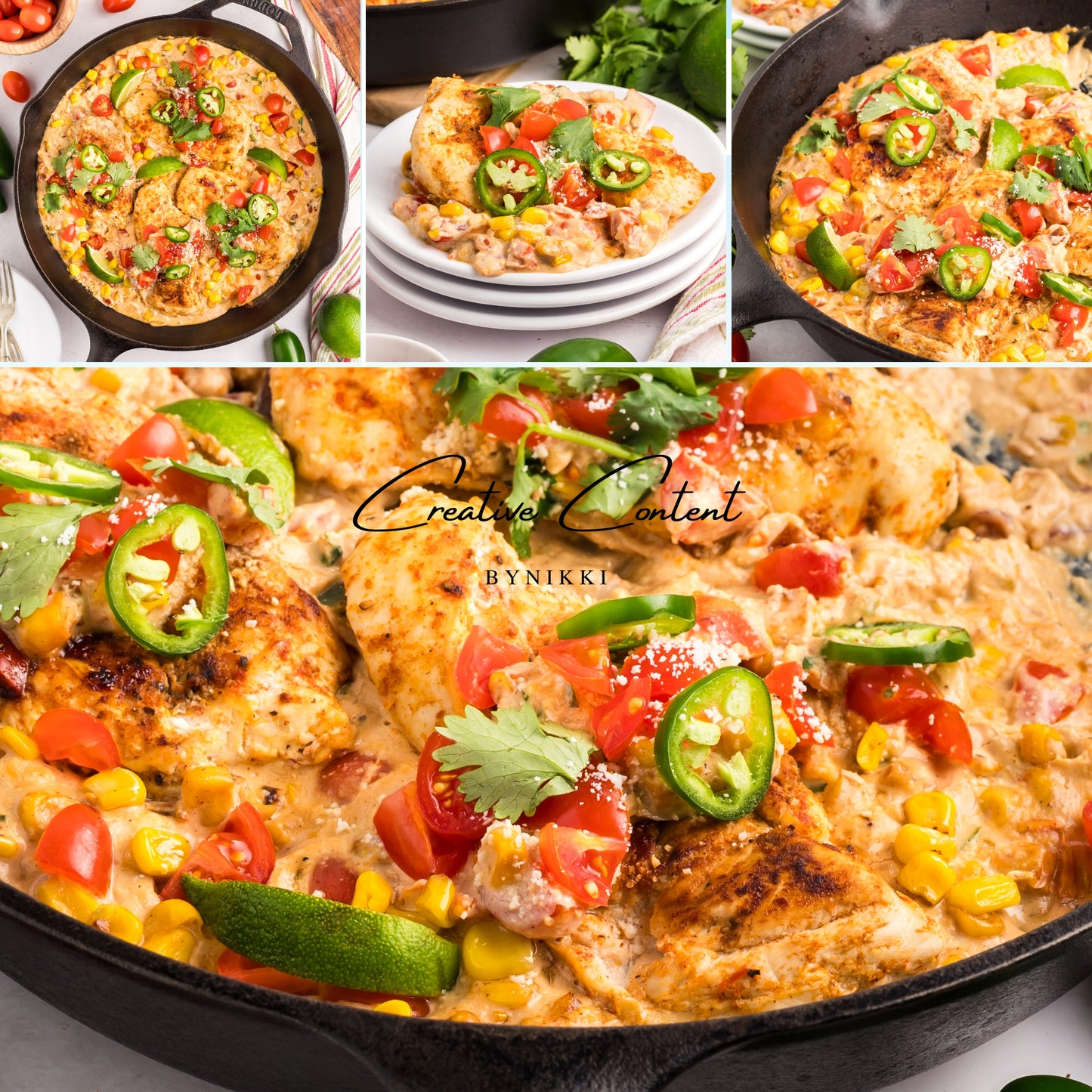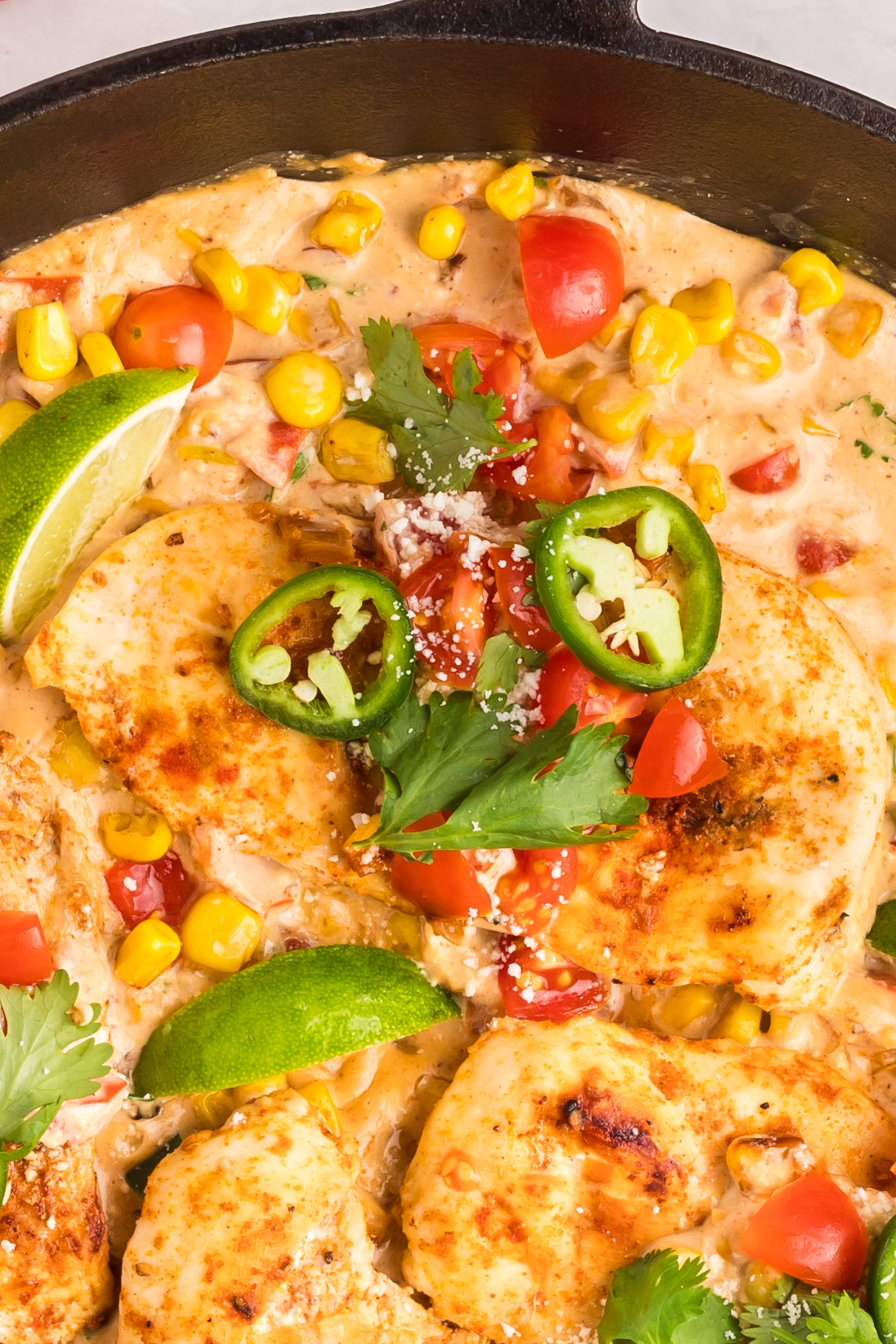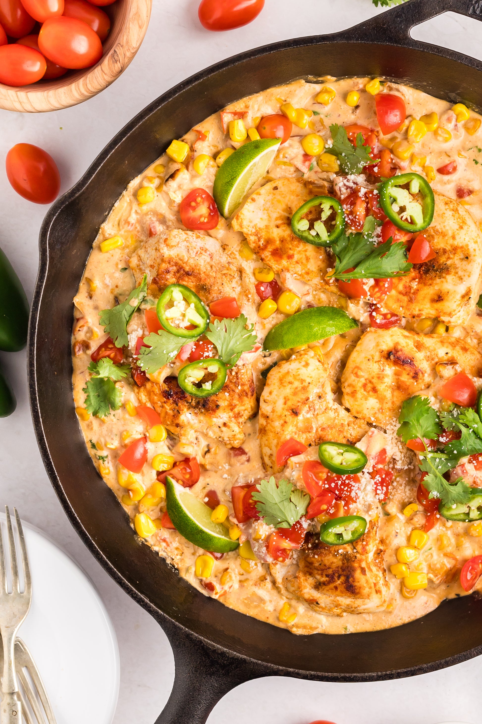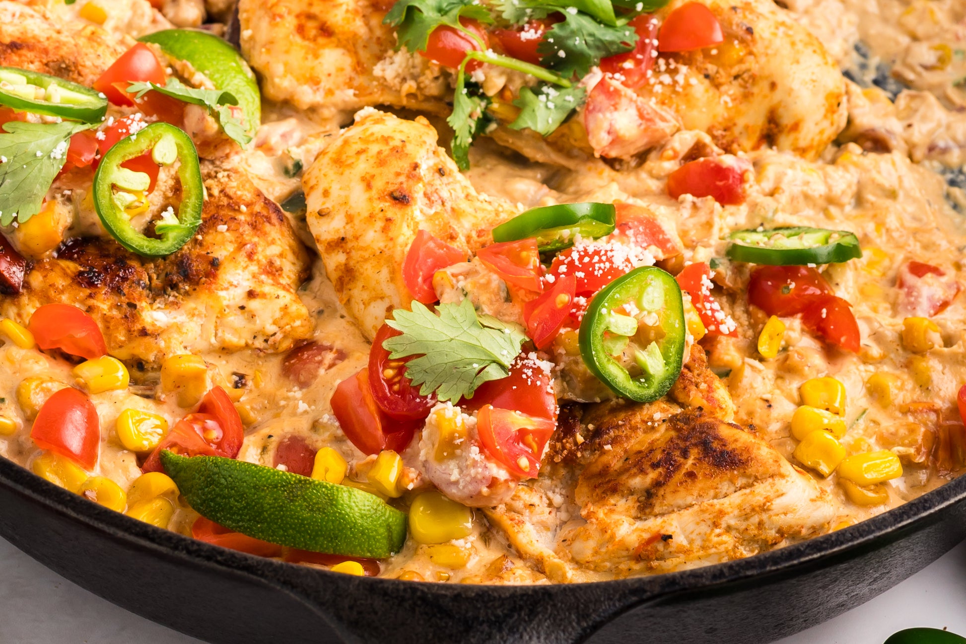 This street corn chicken skillet offers a vibrant burst of flavors with zesty lime juice, sweet roasted corn, fragrant minced garlic, fresh cilantro, and rich cotija cheese. The seasoned chicken absorbs all the delicious nuances of the creamy corn sauce, creating a dish that's both family-friendly and impressive enough to entertain guests.